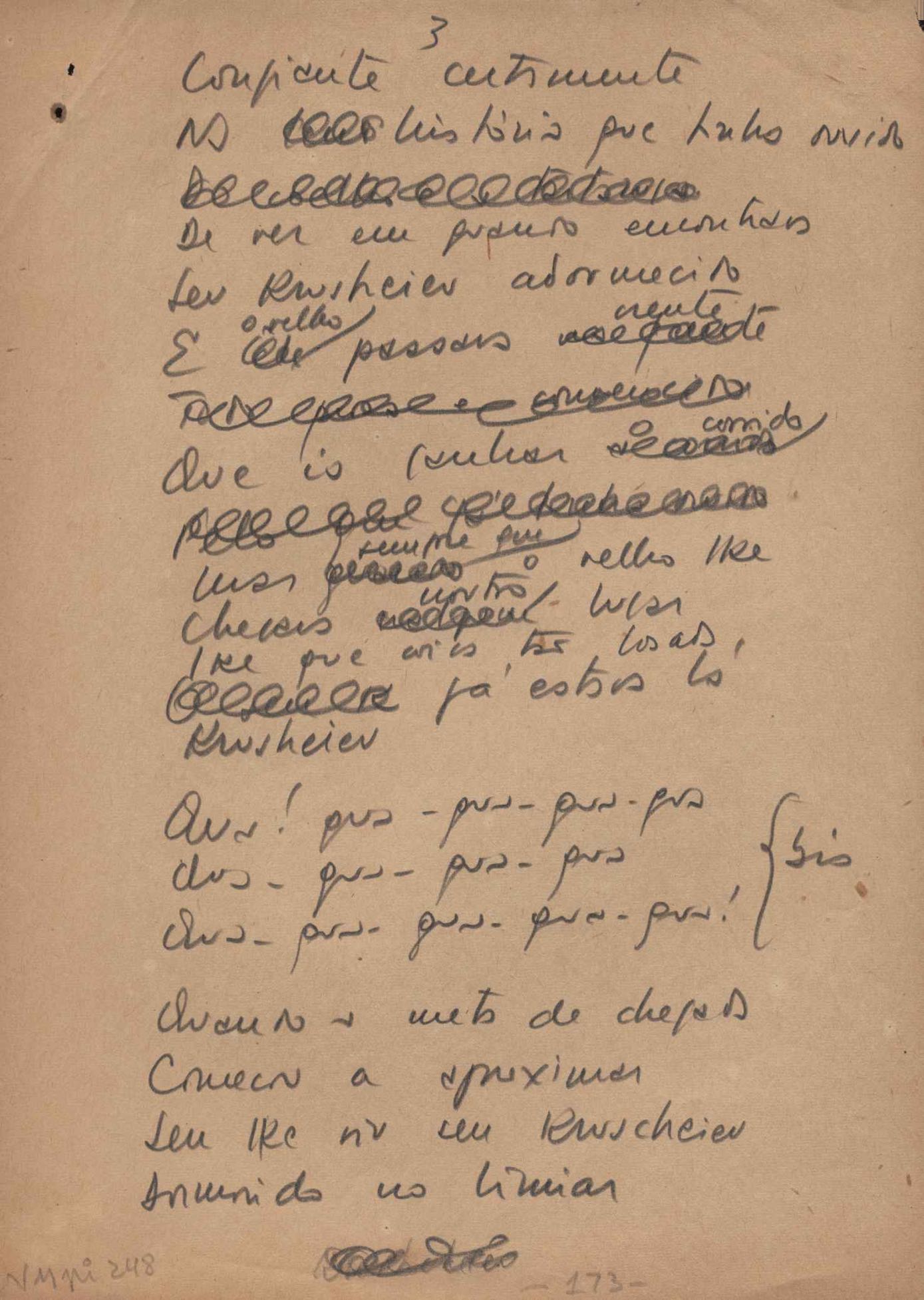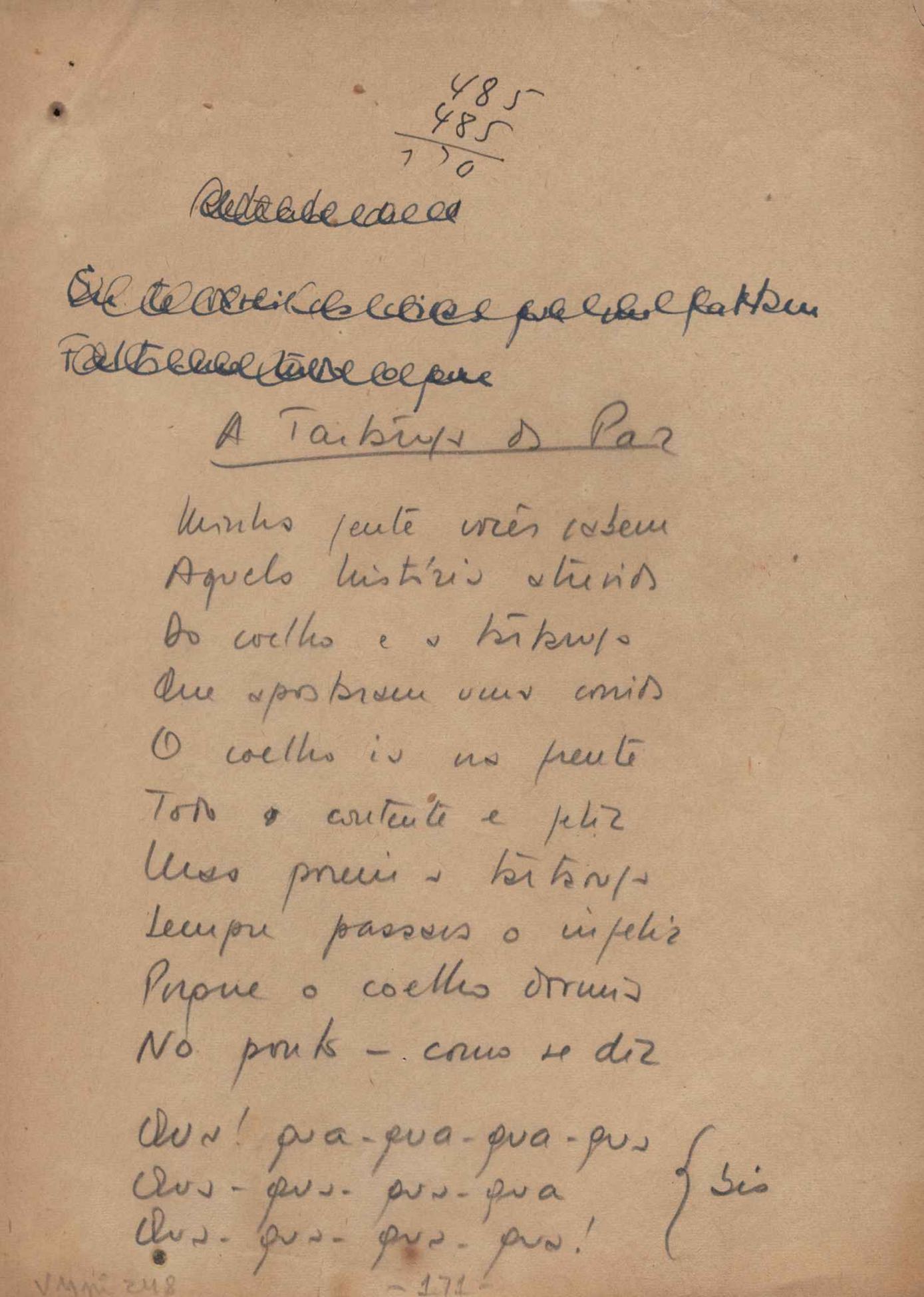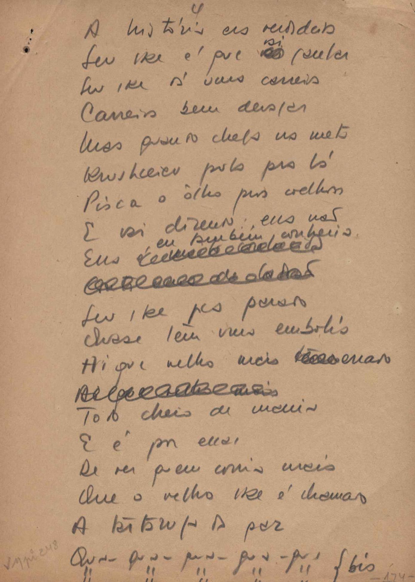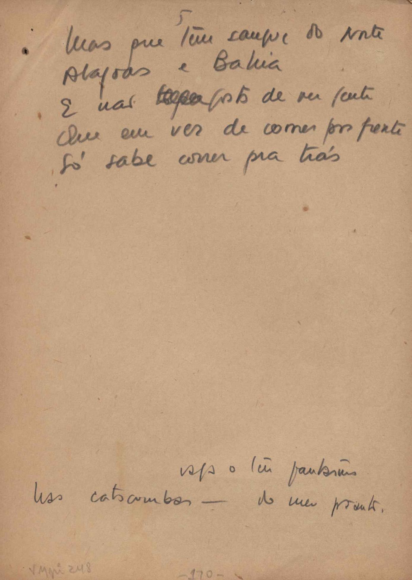 Este documento faz parte do dossiê VMPI248, "Poemas esparsos", que contempla poemas datados entre 21 ago. 1927 e 8 dez. 1971. Destes poemas, 401 são esboços e não possuem título (cf. registro VM0PI248_1_232). Estes originais não podem ser tomados como obra inédita. Ideias, tentativas, escritos inacabados, abandonados ou aproveitados posteriormente com outra forma compõem o dossiê.