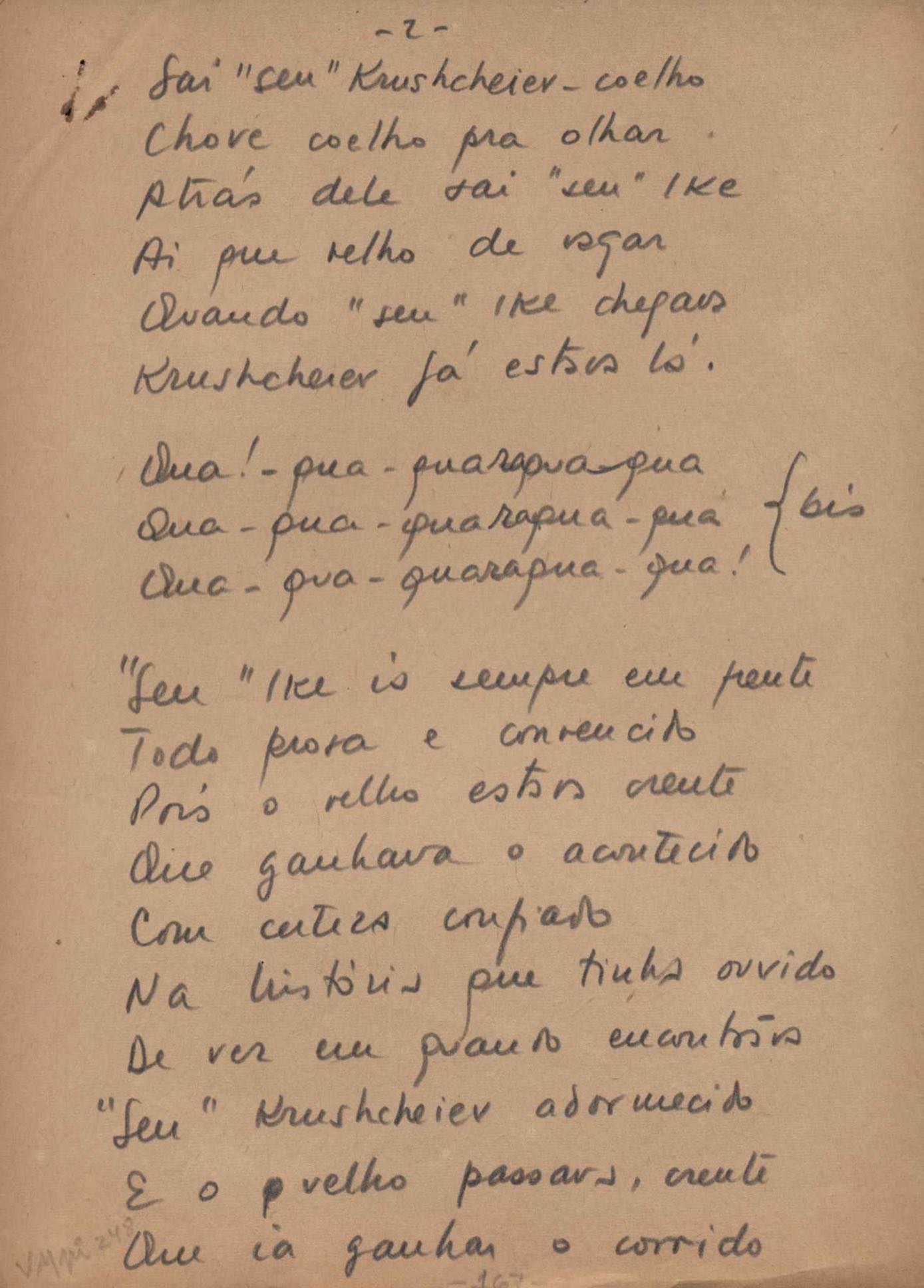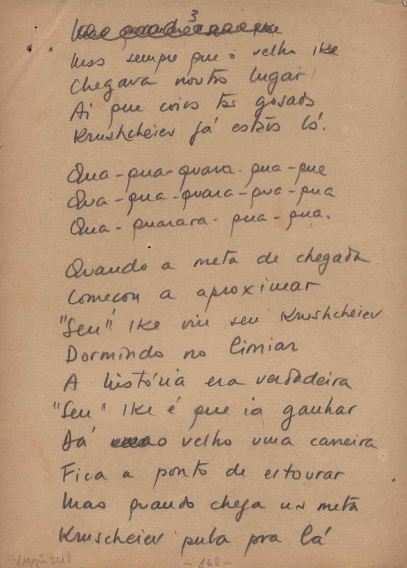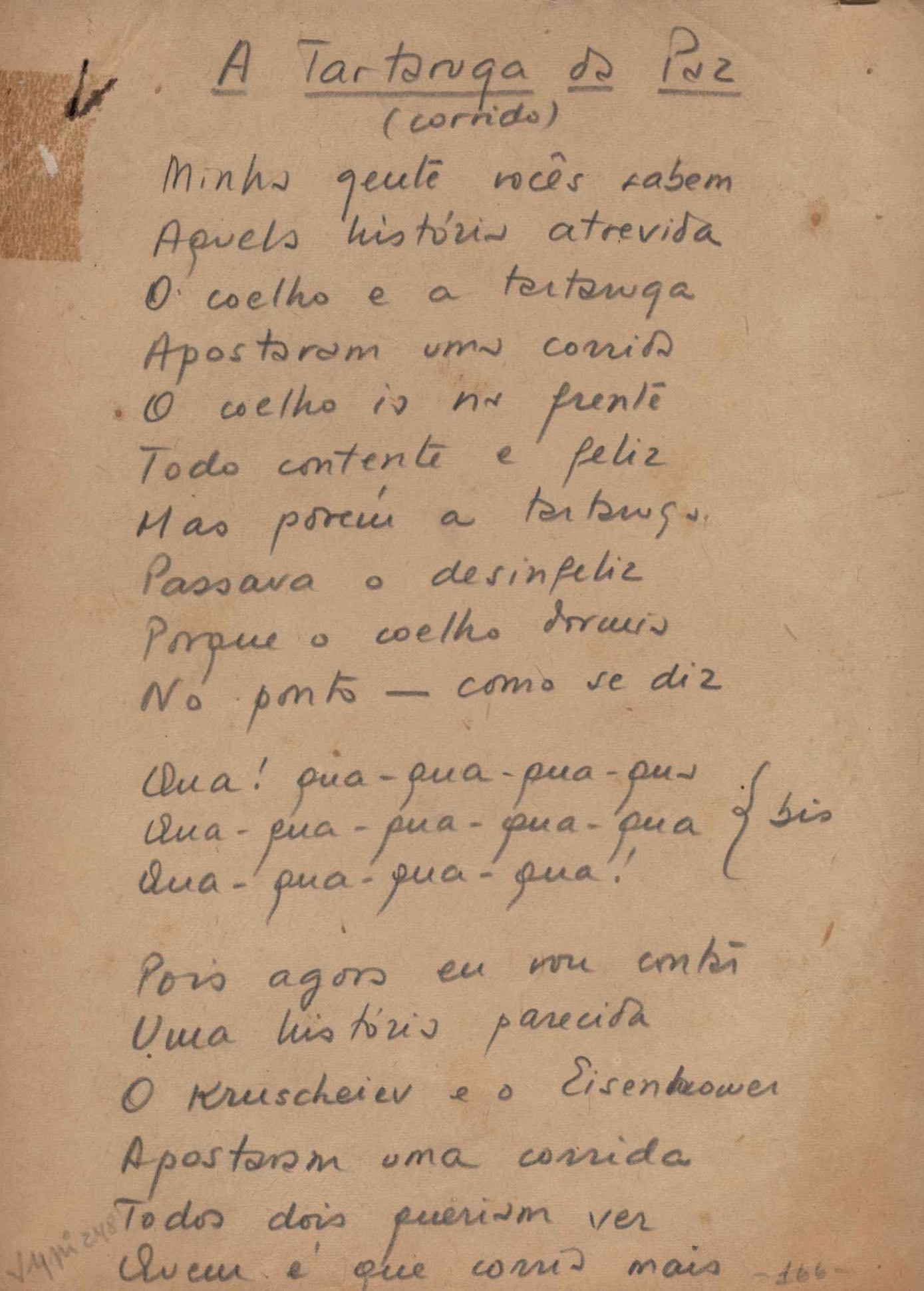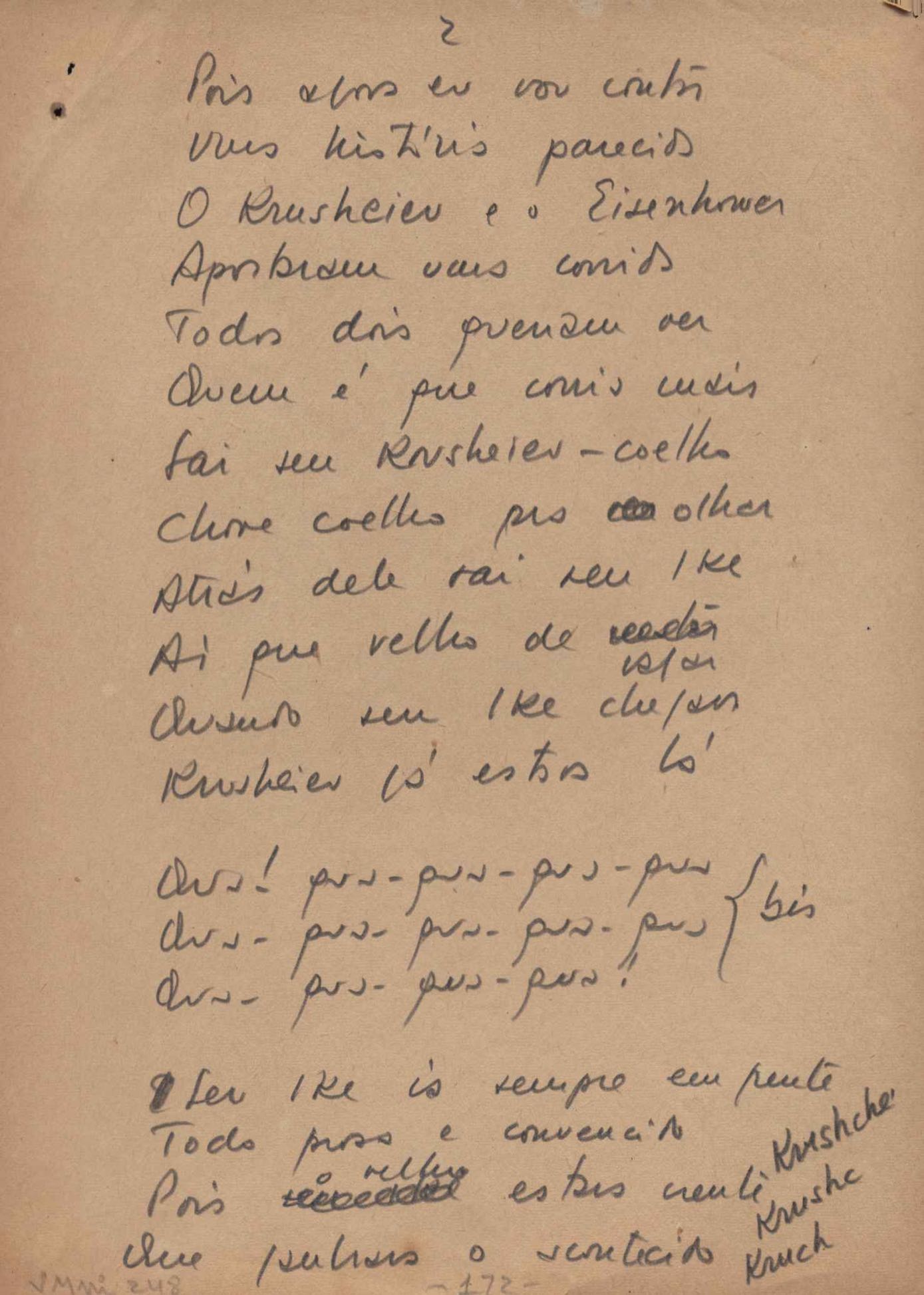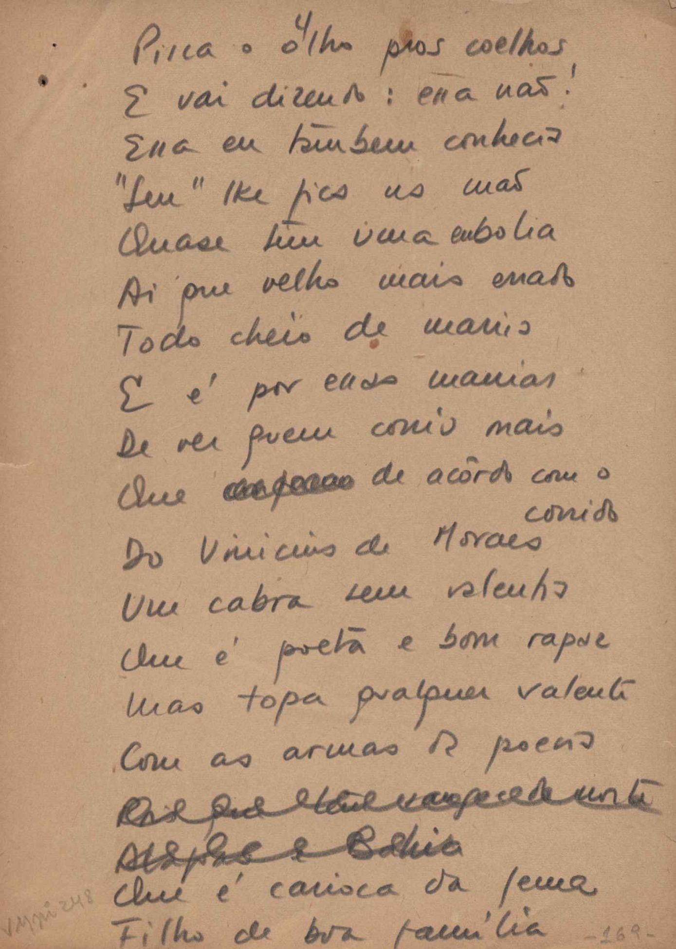 Este documento faz parte do dossiê VMPI248, "Poemas esparsos", que contempla poemas datados entre 21 ago. 1927 e 8 dez. 1971. Destes poemas, 401 são esboços e não possuem título (cf. registro VM0PI248_1_232). Estes originais não podem ser tomados como obra inédita. Ideias, tentativas, escritos inacabados, abandonados ou aproveitados posteriormente com outra forma compõem o dossiê.