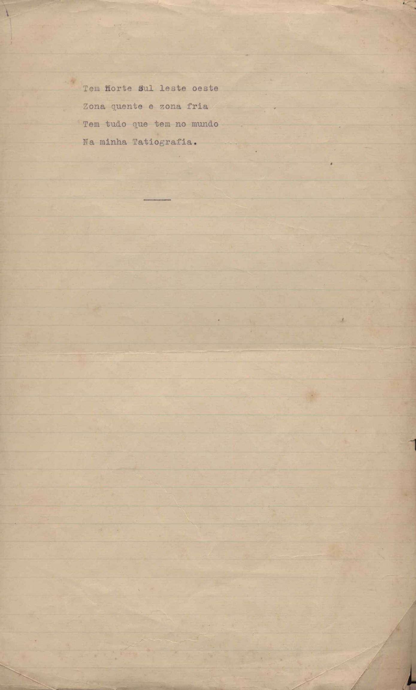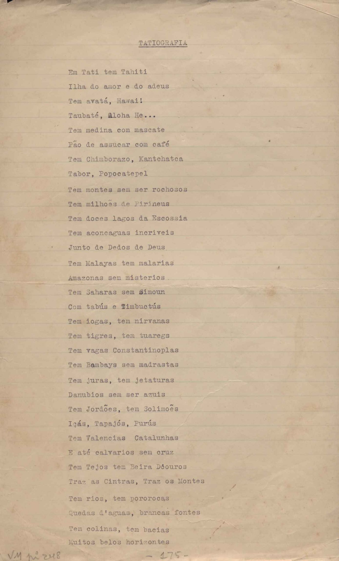 Este documento faz parte do dossiê VMPI248, "Poemas esparsos", que contempla poemas datados entre 21 ago. 1927 e 8 dez. 1971. Destes poemas, 401 são esboços e não possuem título (cf. registro VM0PI248_1_232). Estes originais não podem ser tomados como obra inédita. Ideias, tentativas, escritos inacabados, abandonados ou aproveitados posteriormente com outra forma compõem o dossiê.
