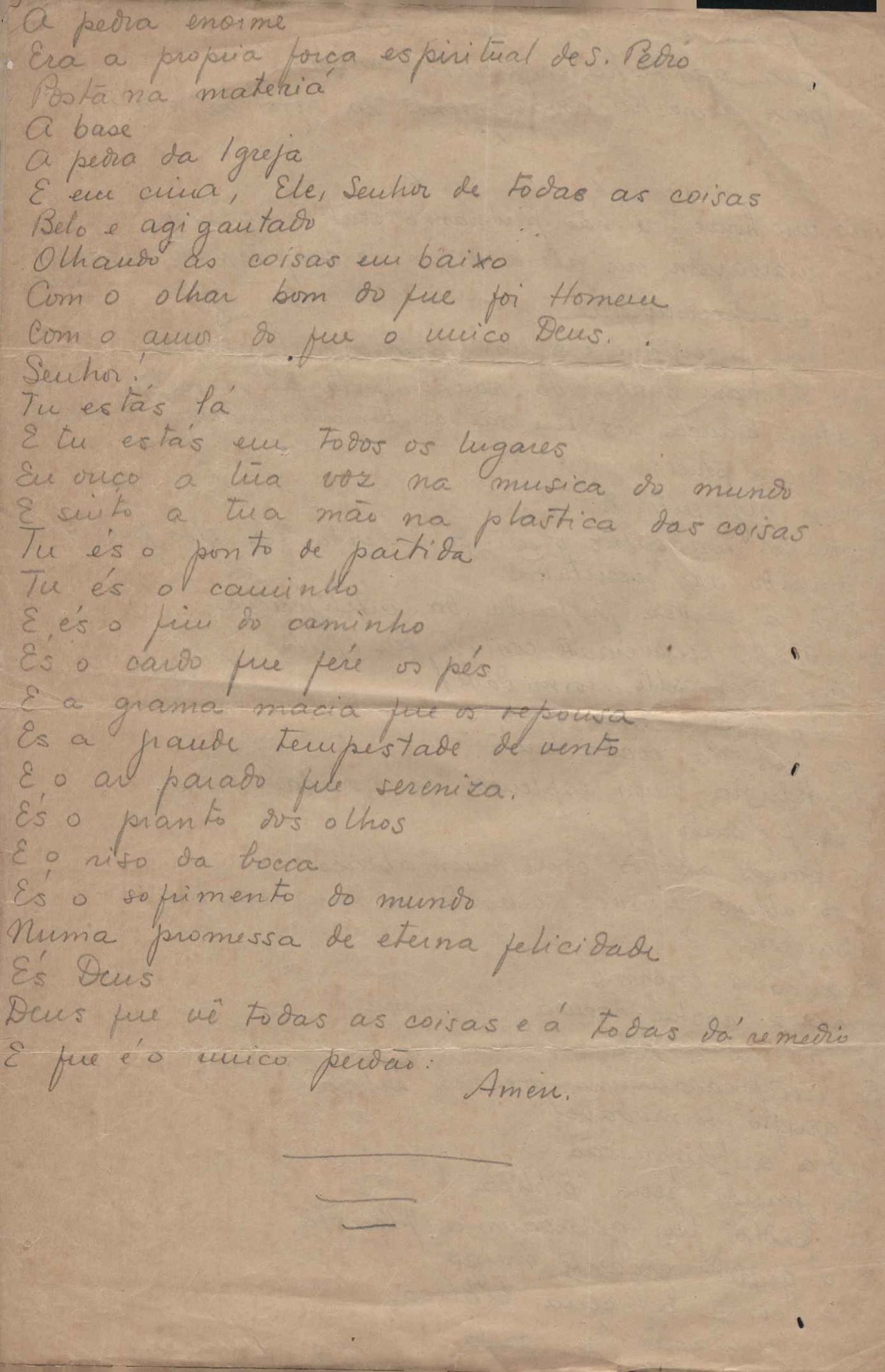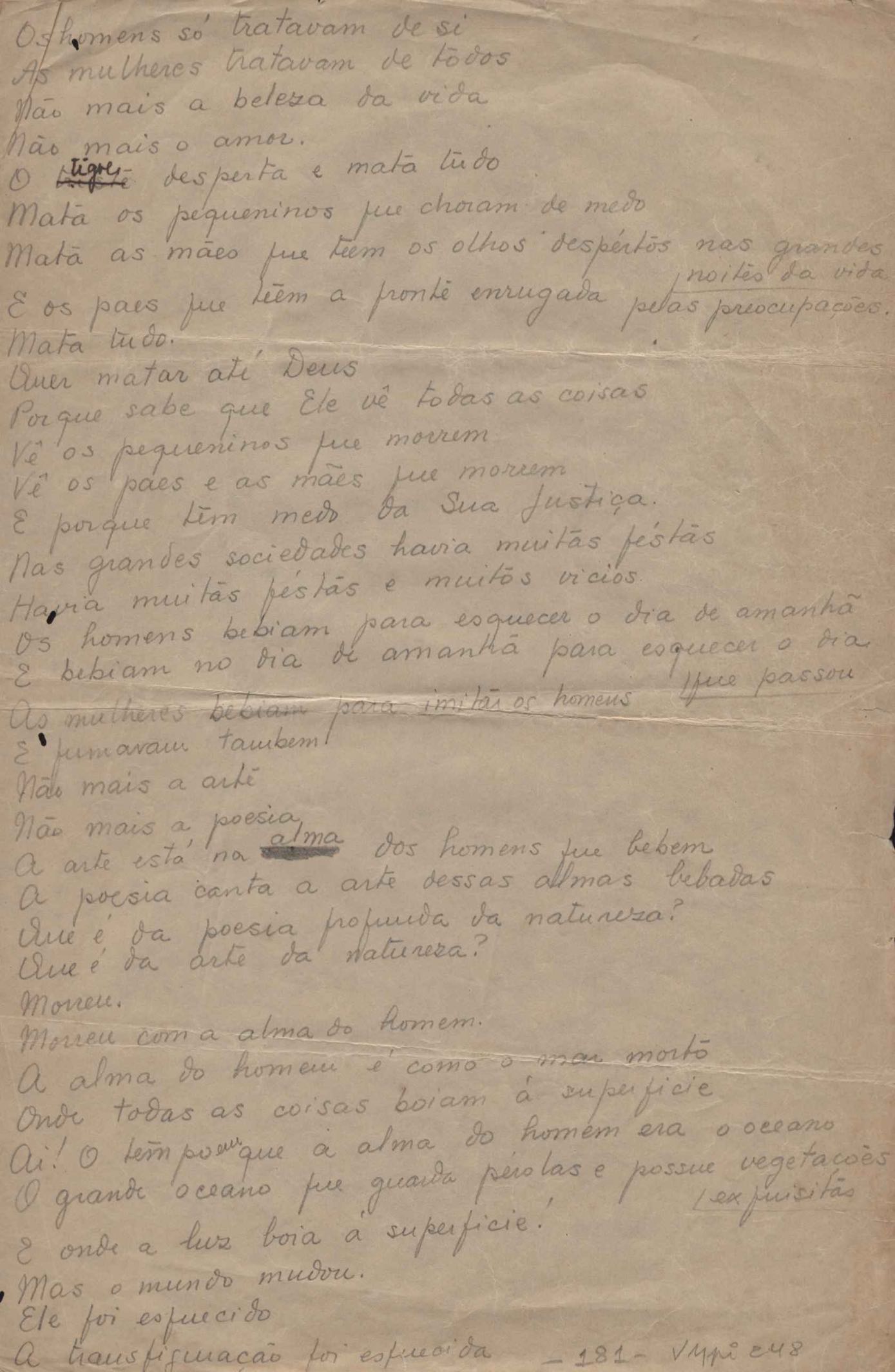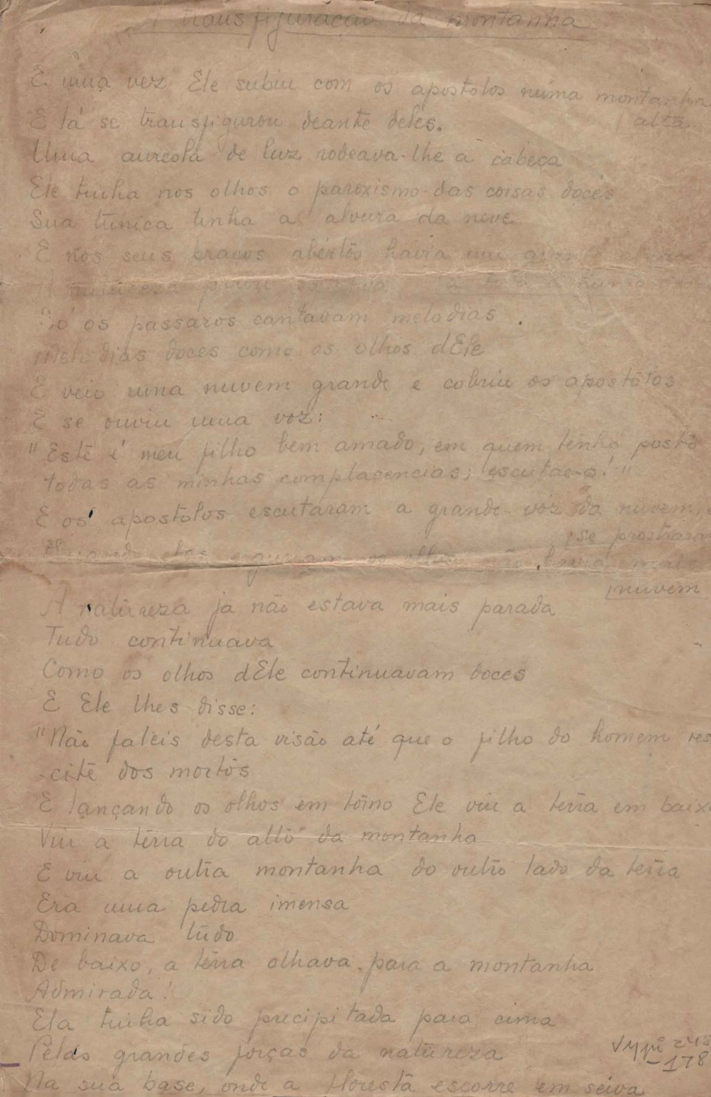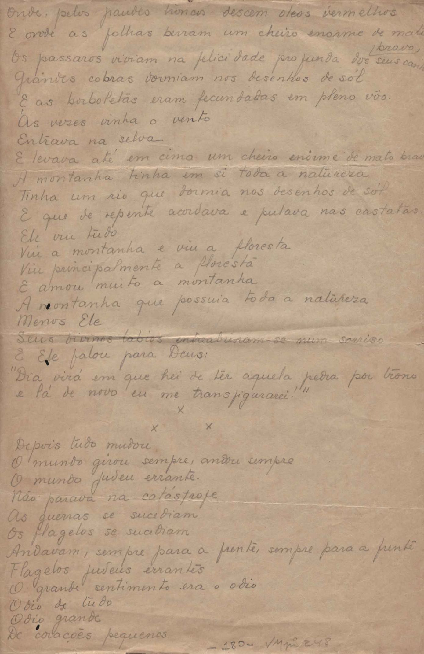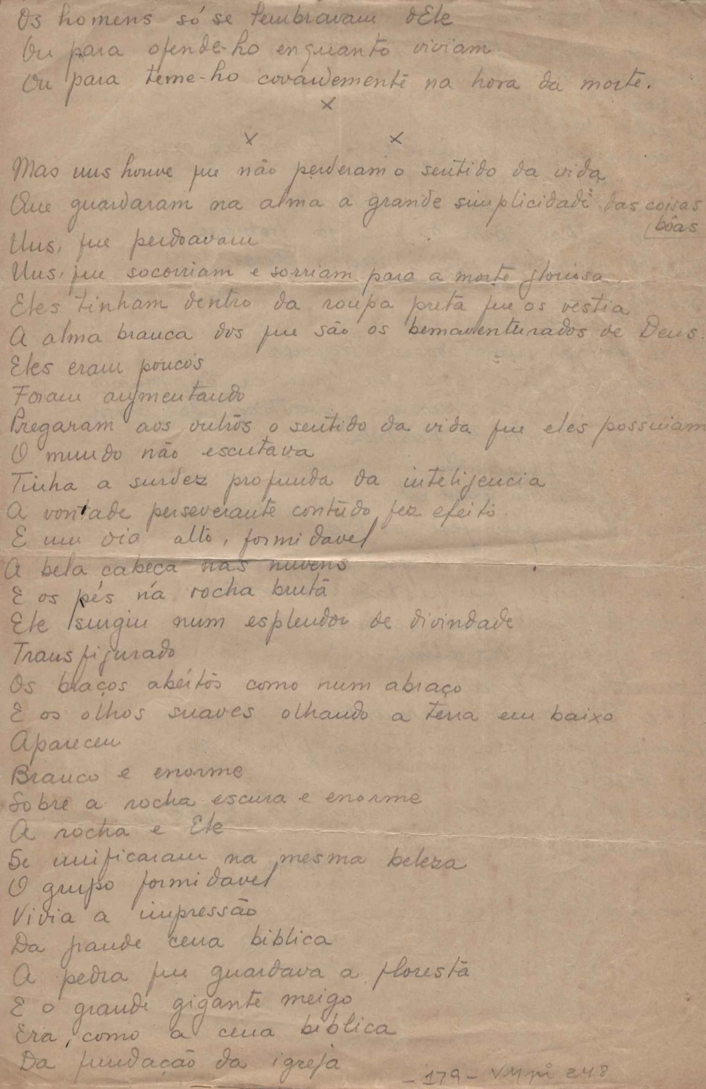 Este documento faz parte do dossiê VMPI248, "Poemas esparsos", que contempla poemas datados entre 21 ago. 1927 e 8 dez. 1971. Destes poemas, 401 são esboços e não possuem título (cf. registro VM0PI248_1_232). Estes originais não podem ser tomados como obra inédita. Ideias, tentativas, escritos inacabados, abandonados ou aproveitados posteriormente com outra forma compõem o dossiê.
