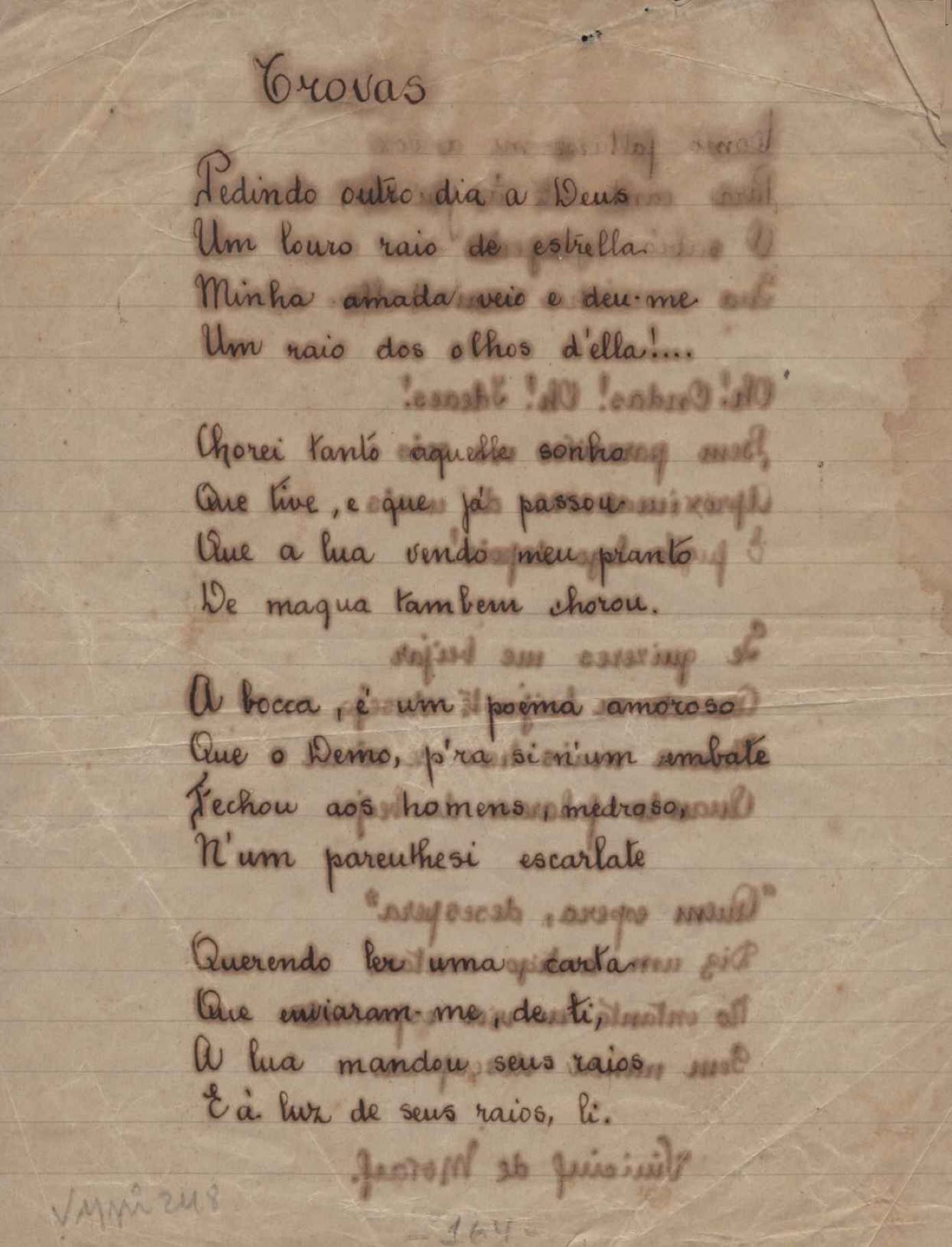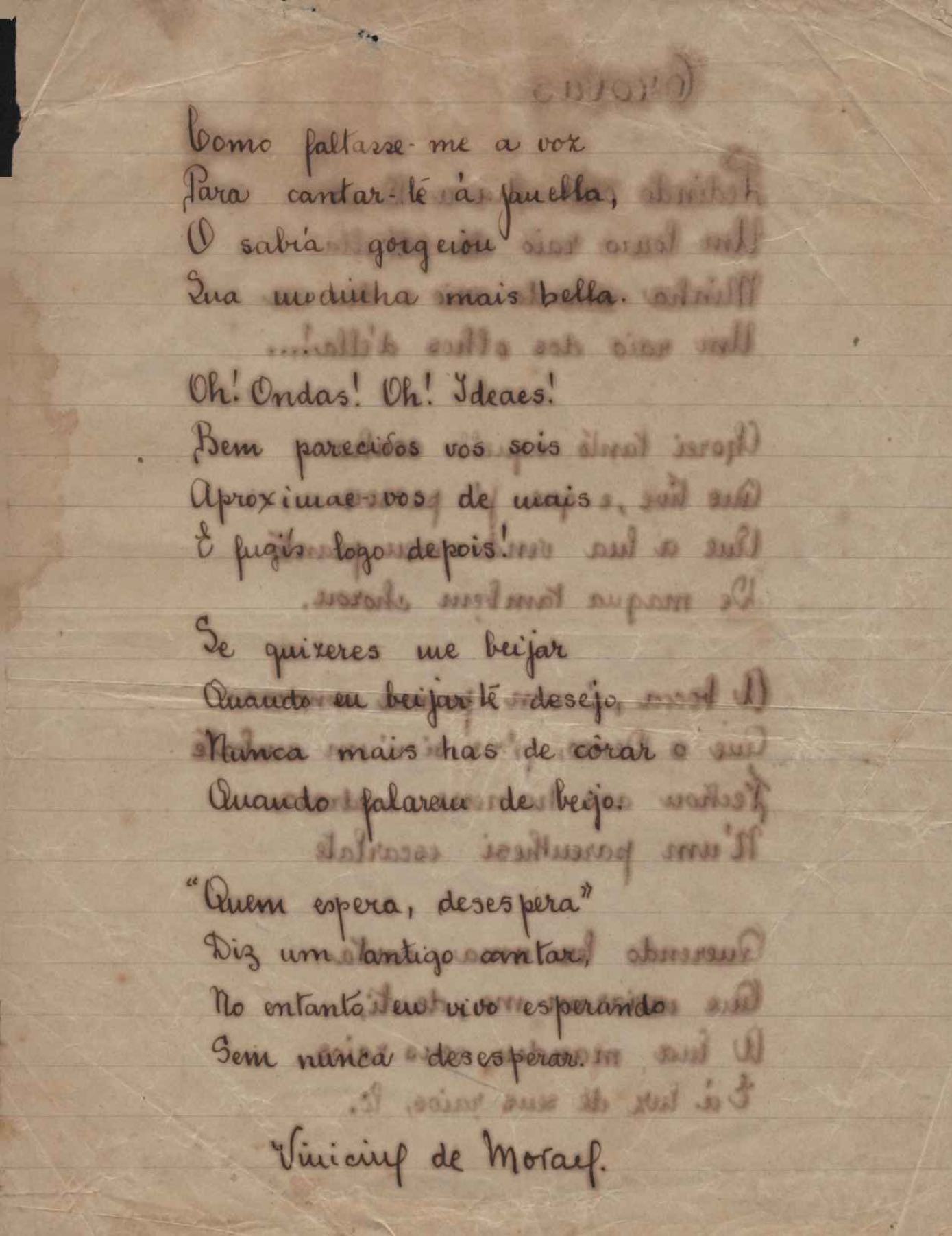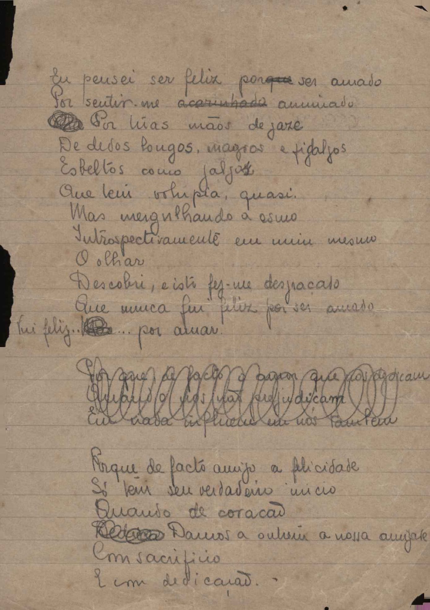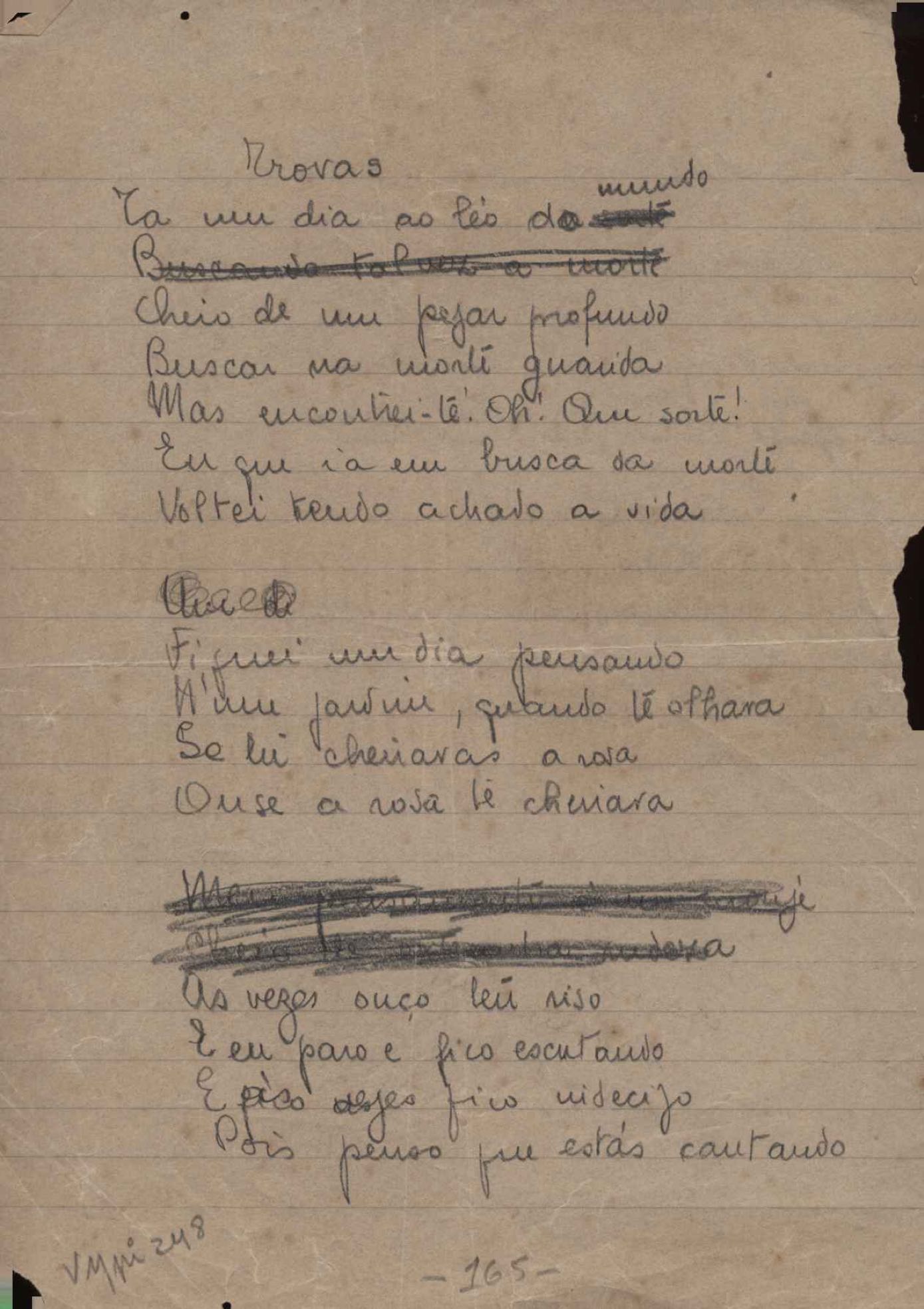 Este documento faz parte do dossiê VMPI248, "Poemas esparsos", que contempla poemas datados entre 21 ago. 1927 e 8 dez. 1971. Destes poemas, 401 são esboços e não possuem título (cf. registro VM0PI248_1_232). Estes originais não podem ser tomados como obra inédita. Ideias, tentativas, escritos inacabados, abandonados ou aproveitados posteriormente com outra forma compõem o dossiê.