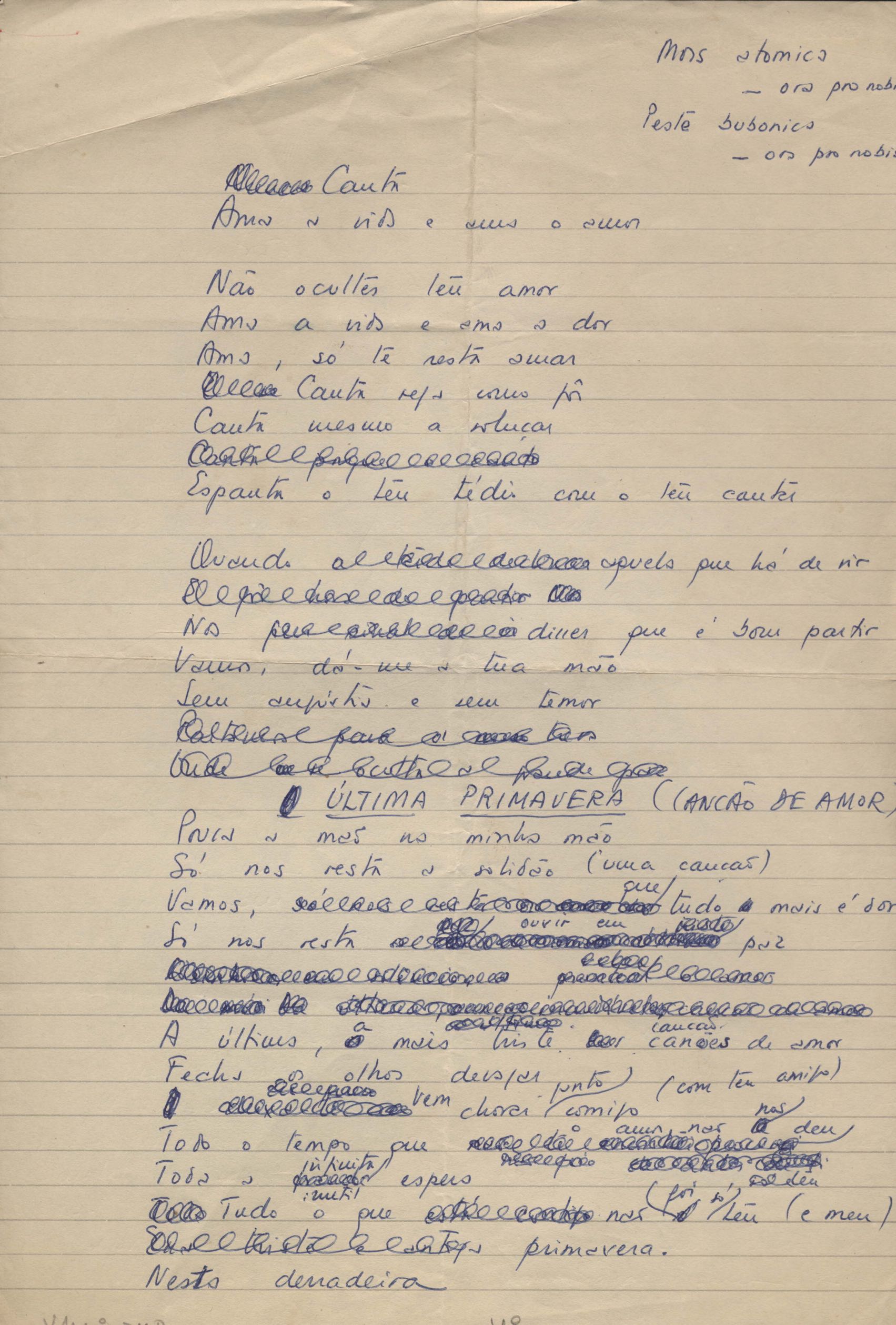 Este documento faz parte do dossiê VMPI248, "Poemas esparsos", que contempla poemas datados entre 21 ago. 1927 e 8 dez. 1971. Destes poemas, 401 são esboços e não possuem título (cf. registro VM0PI248_1_232). Estes originais não podem ser tomados como obra inédita. Ideias, tentativas, escritos inacabados, abandonados ou aproveitados posteriormente com outra forma compõem o dossiê.