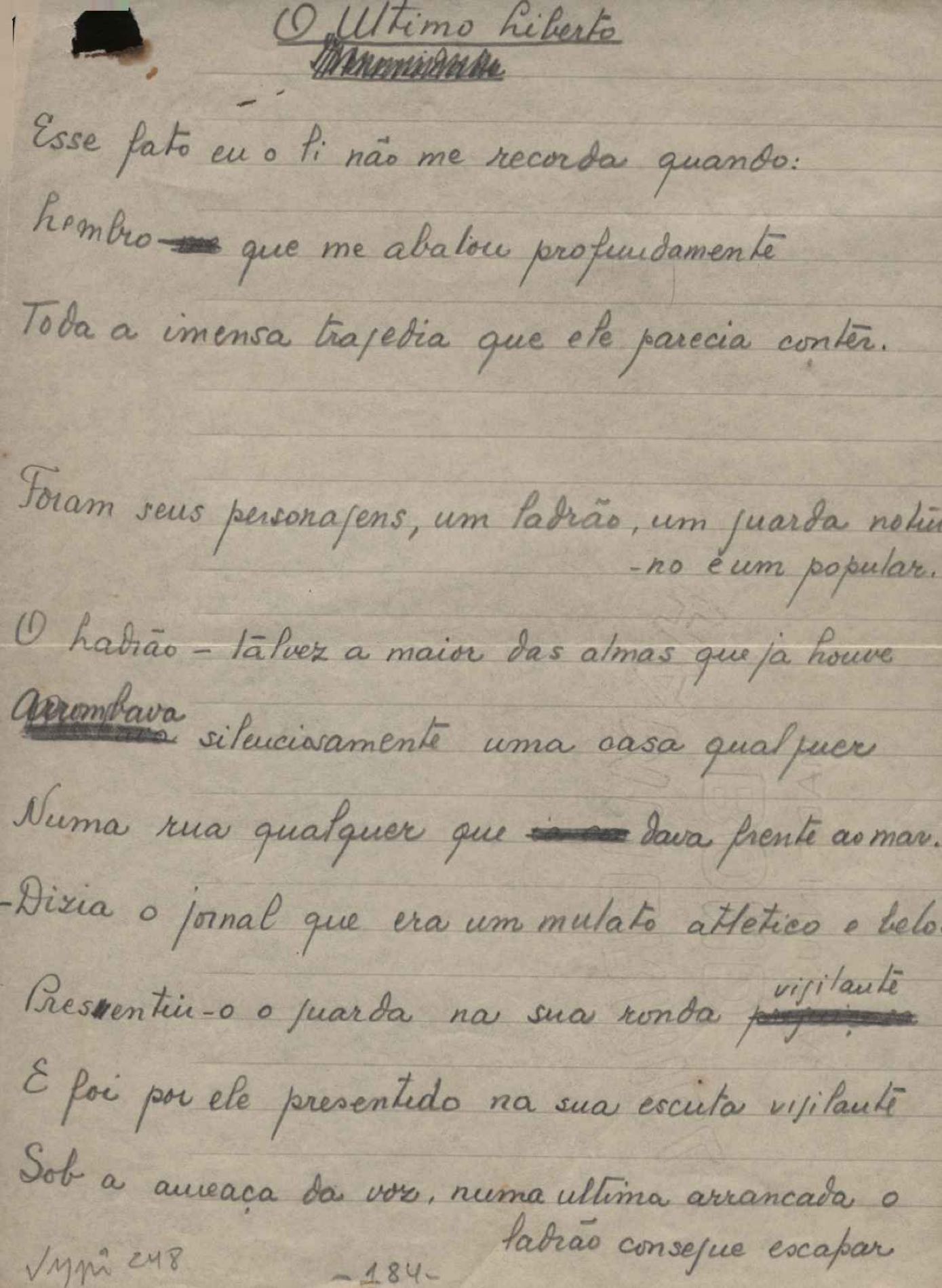 Este documento faz parte do dossiê VMPI248, "Poemas esparsos", que contempla poemas datados entre 21 ago. 1927 e 8 dez. 1971. Destes poemas, 401 são esboços e não possuem título (cf. registro VM0PI248_1_232). Estes originais não podem ser tomados como obra inédita. Ideias, tentativas, escritos inacabados, abandonados ou aproveitados posteriormente com outra forma compõem o dossiê.