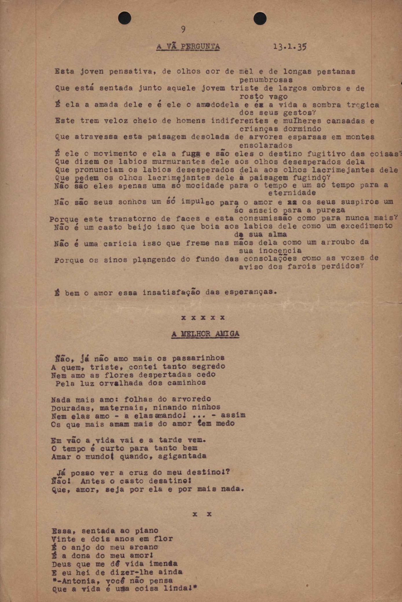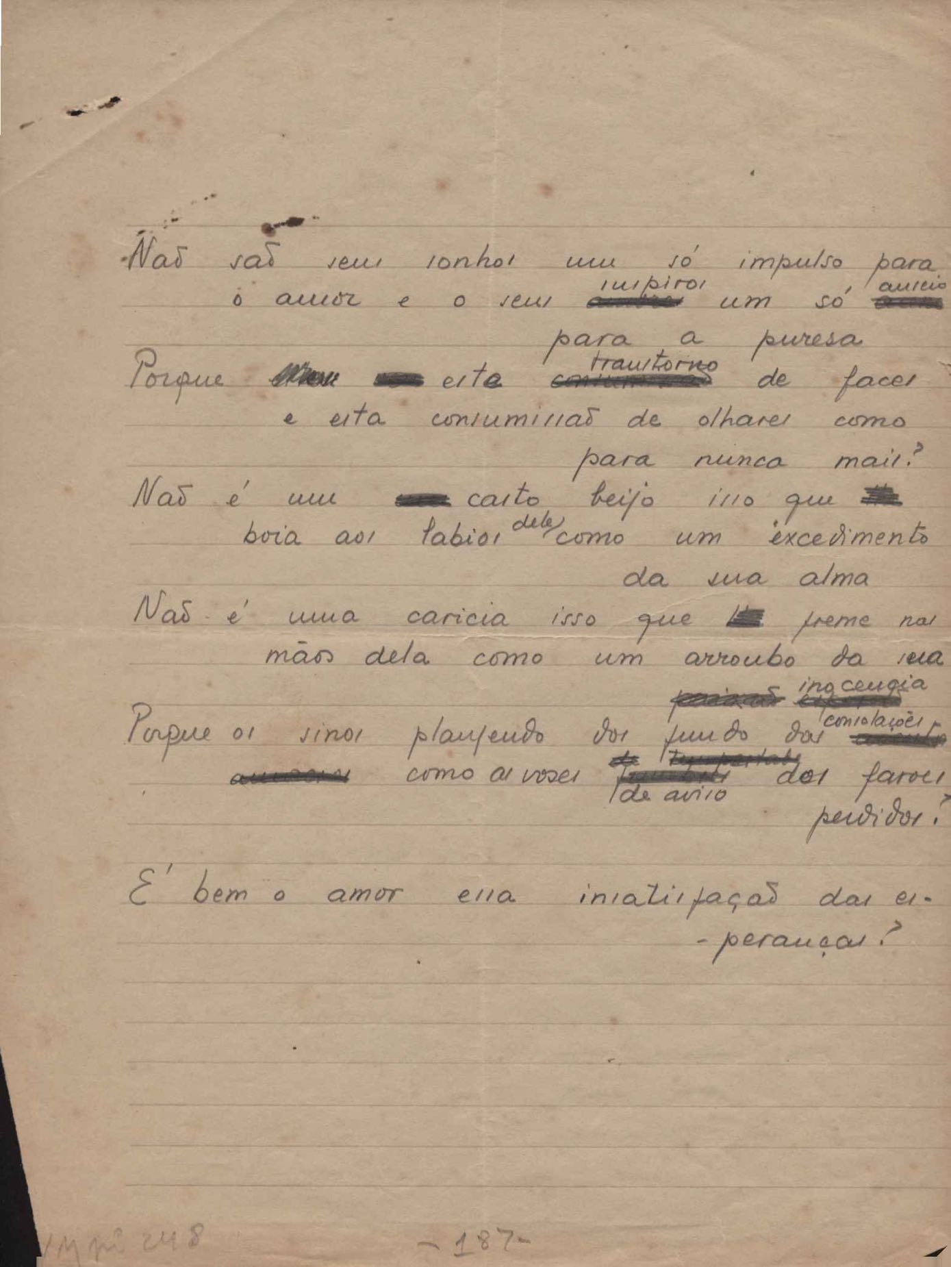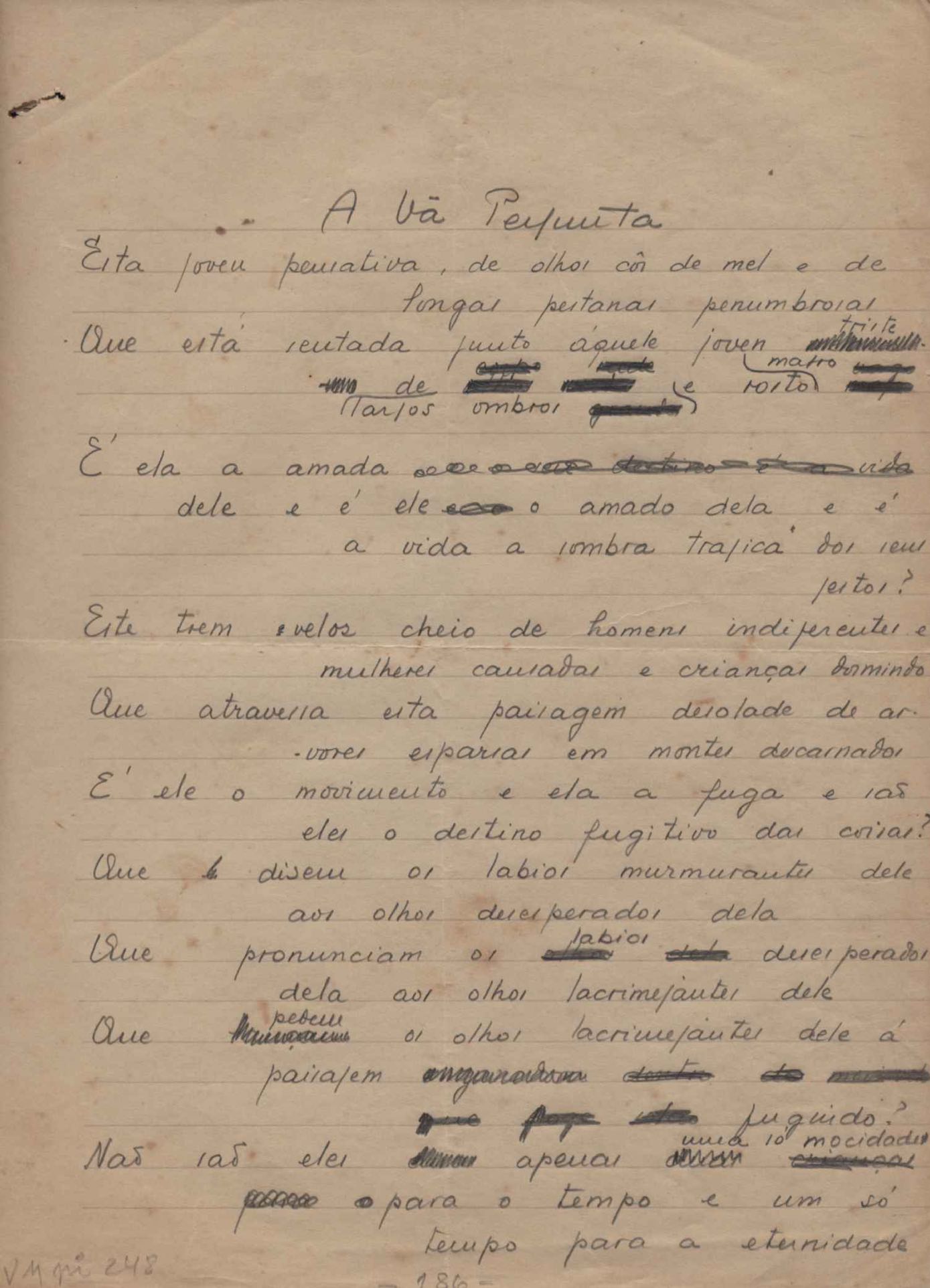 Este documento faz parte do dossiê VMPI248, "Poemas esparsos", que contempla poemas datados entre 21 ago. 1927 e 8 dez. 1971. Destes poemas, 401 são esboços e não possuem título (cf. registro VM0PI248_1_232). Estes originais não podem ser tomados como obra inédita. Ideias, tentativas, escritos inacabados, abandonados ou aproveitados posteriormente com outra forma compõem o dossiê.