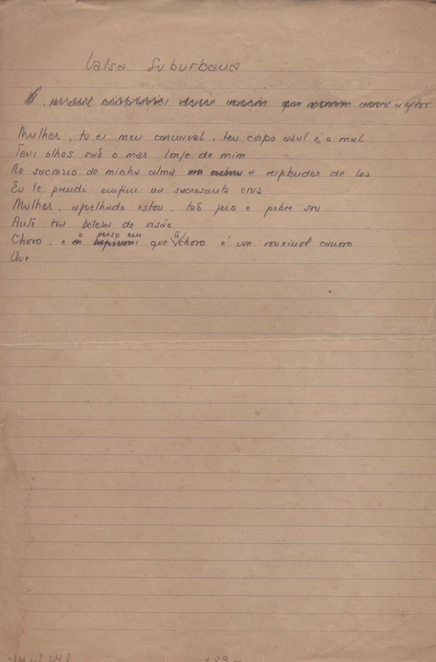 Este documento faz parte do dossiê VMPI248, "Poemas esparsos", que contempla poemas datados entre 21 ago. 1927 e 8 dez. 1971. Destes poemas, 401 são esboços e não possuem título (cf. registro VM0PI248_1_232). Estes originais não podem ser tomados como obra inédita. Ideias, tentativas, escritos inacabados, abandonados ou aproveitados posteriormente com outra forma compõem o dossiê.