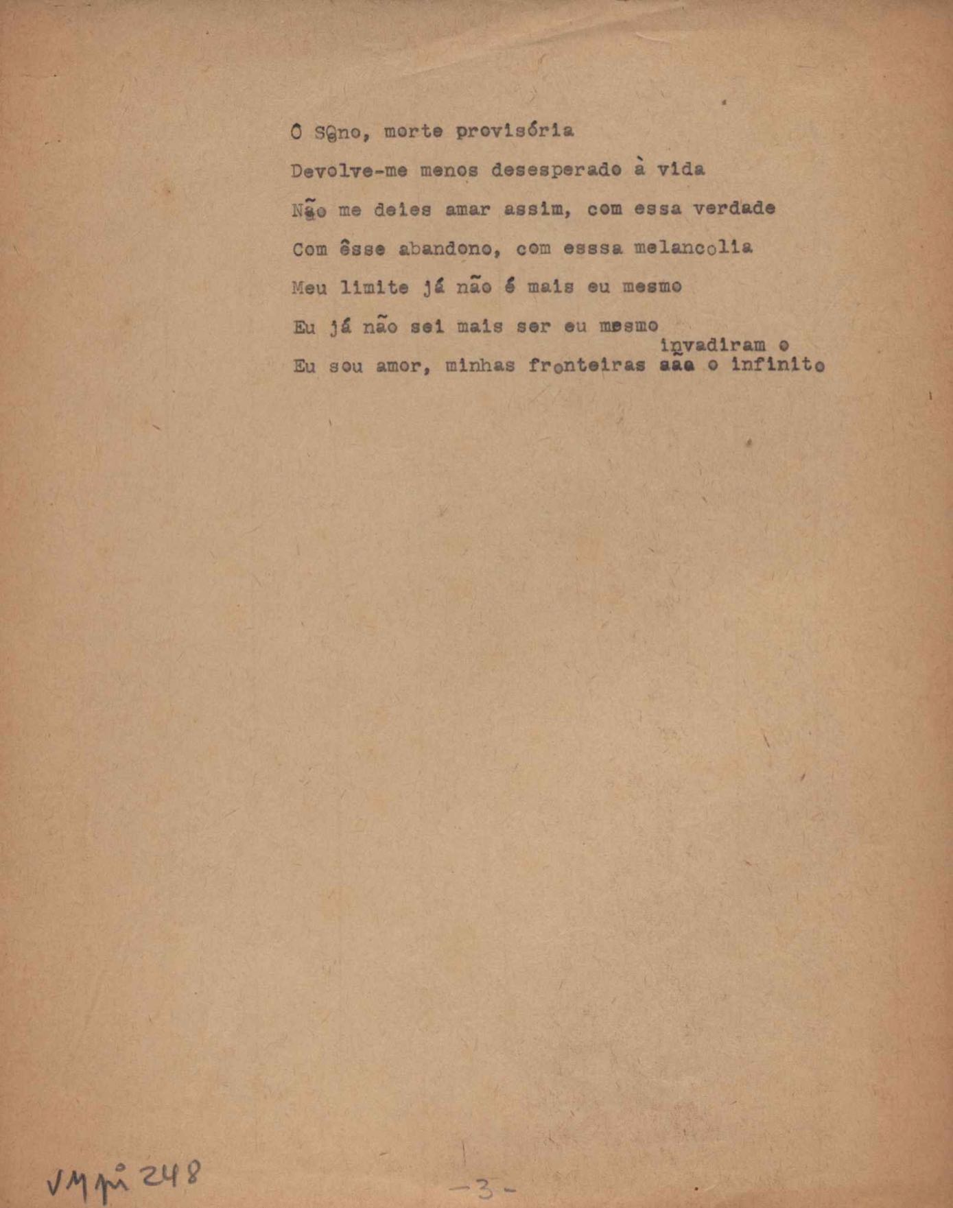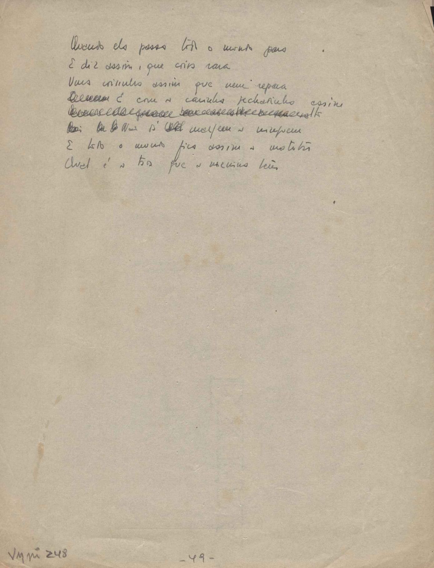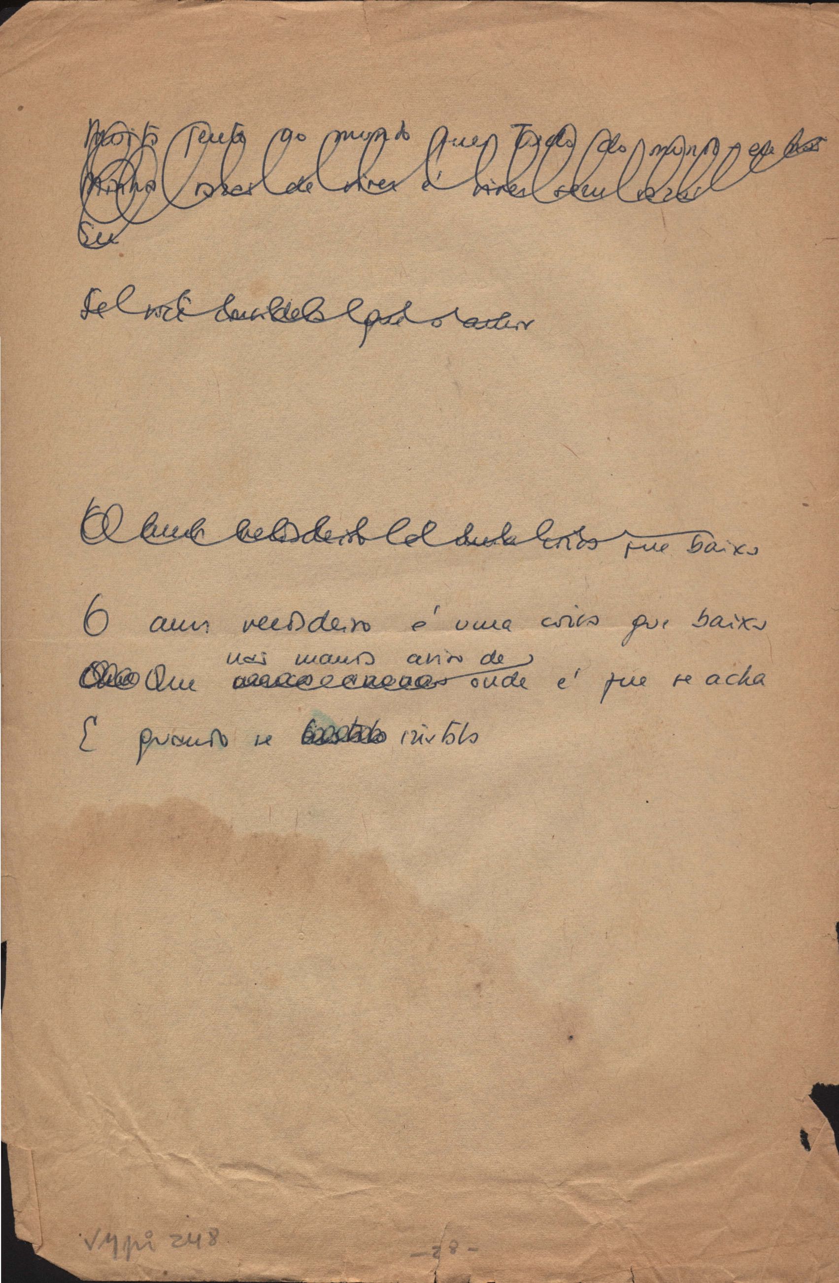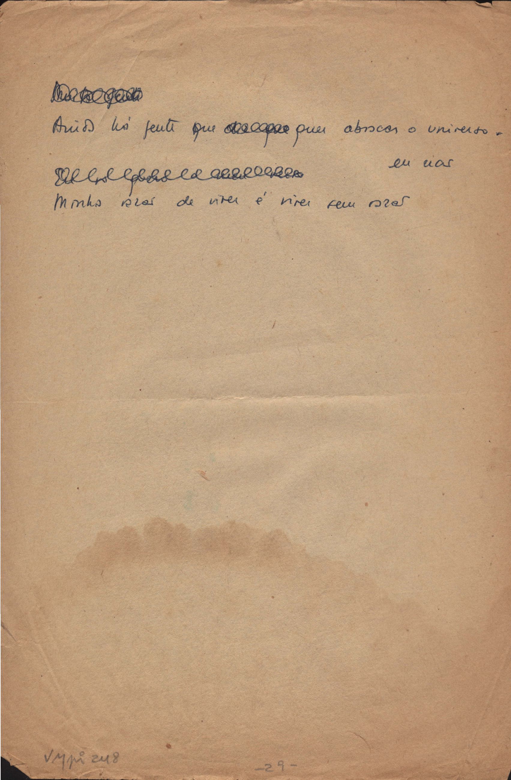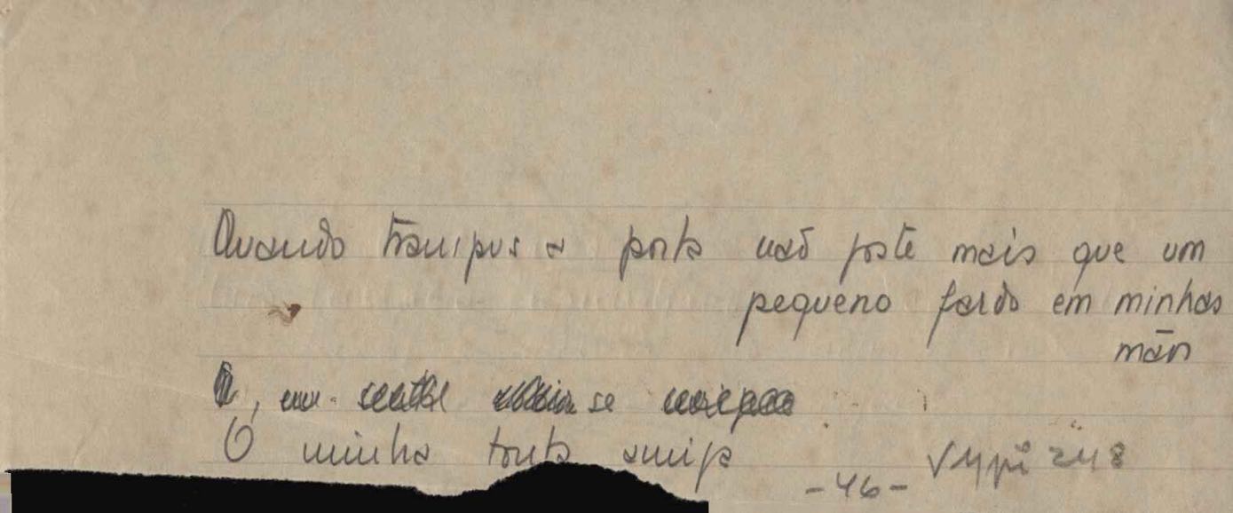 Este documento faz parte do dossiê VMPI248, "Poemas esparsos", que contempla poemas datados entre 21 ago. 1927 e 8 dez. 1971. Destes poemas, 401 são esboços e não possuem título (cf. registro VM0PI248_1_232). Estes originais não podem ser tomados como obra inédita. Ideias, tentativas, escritos inacabados, abandonados ou aproveitados posteriormente com outra forma compõem o dossiê.