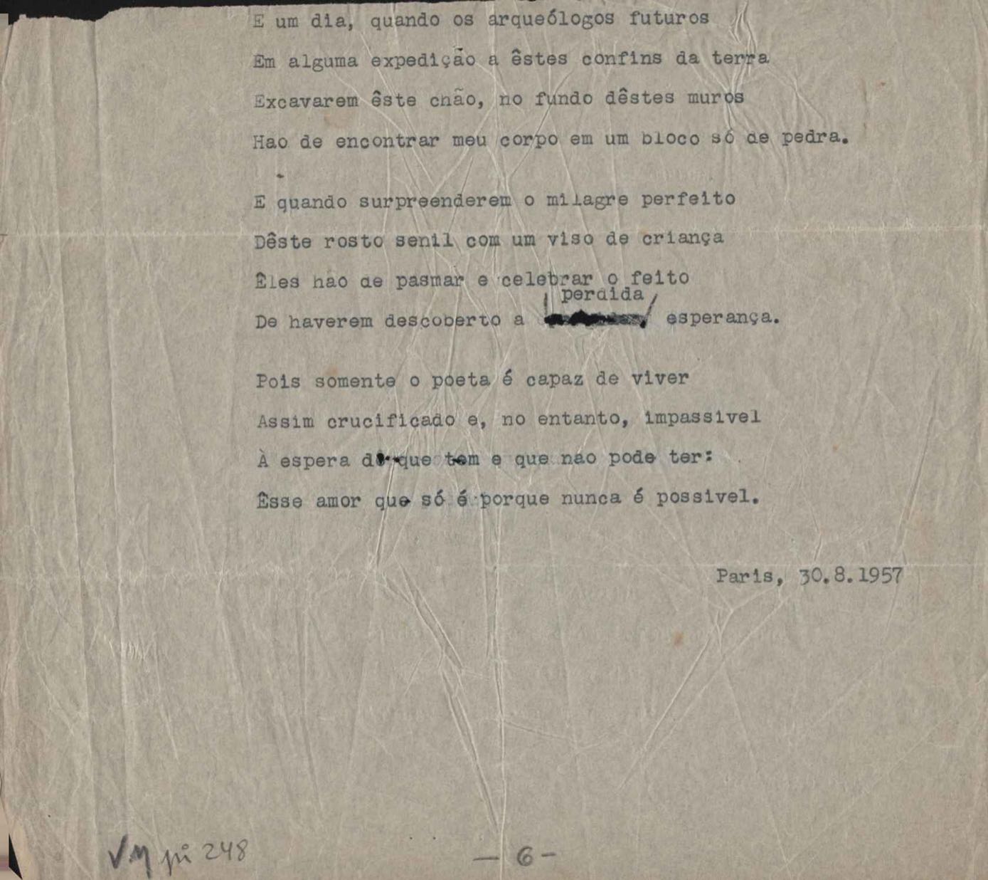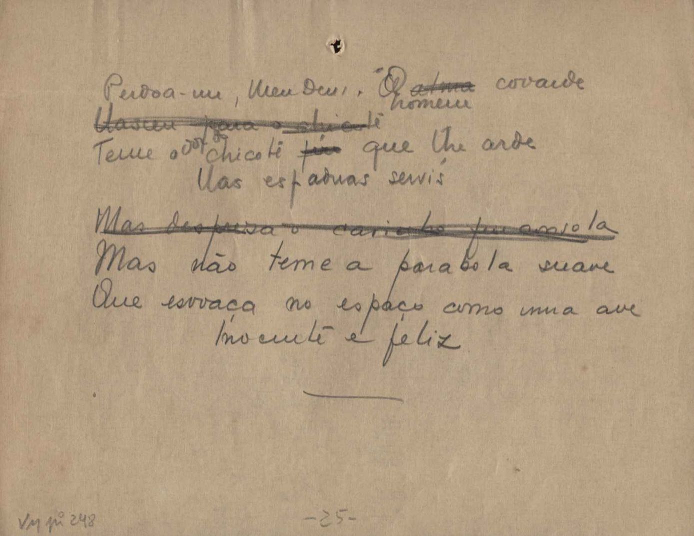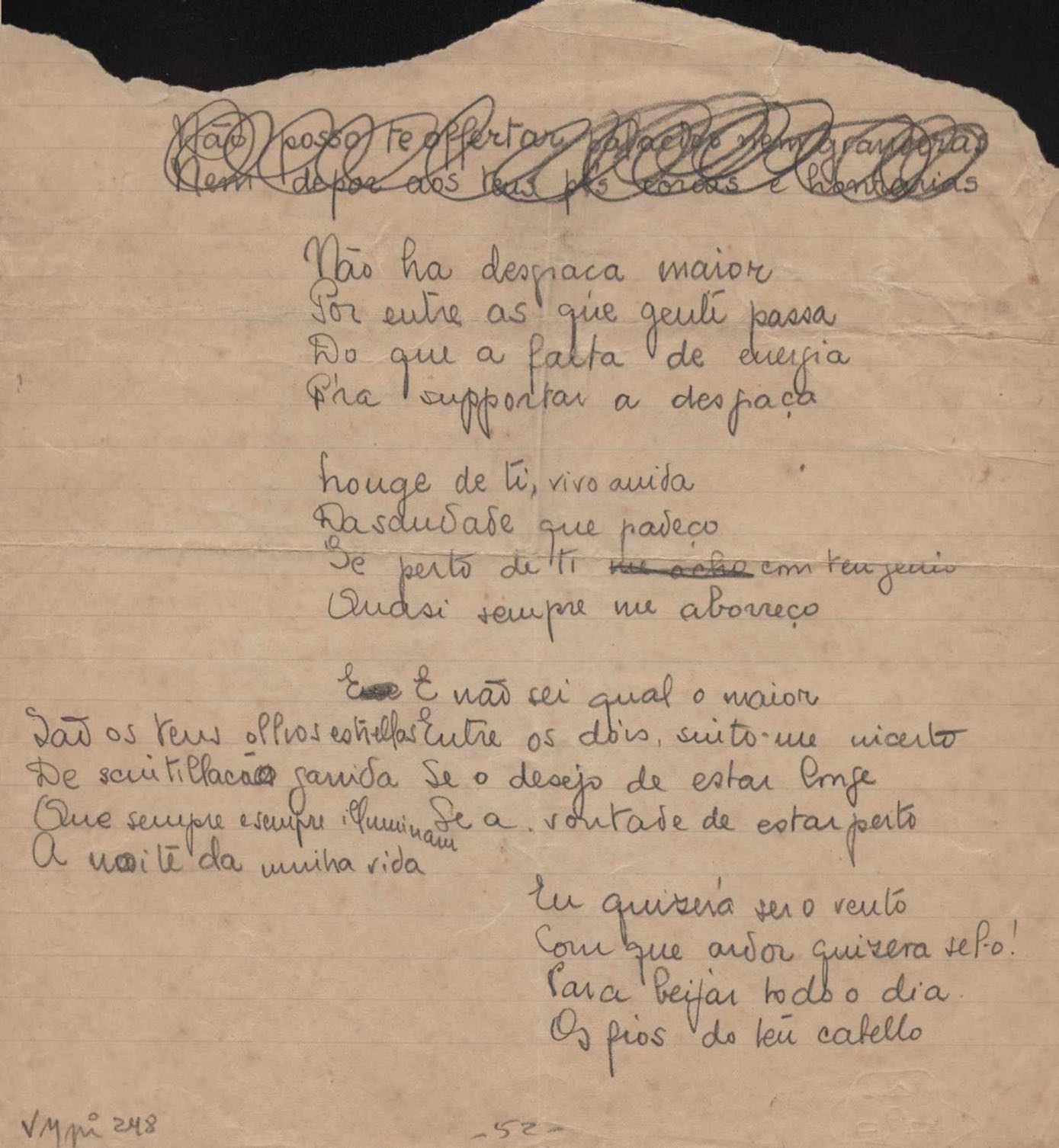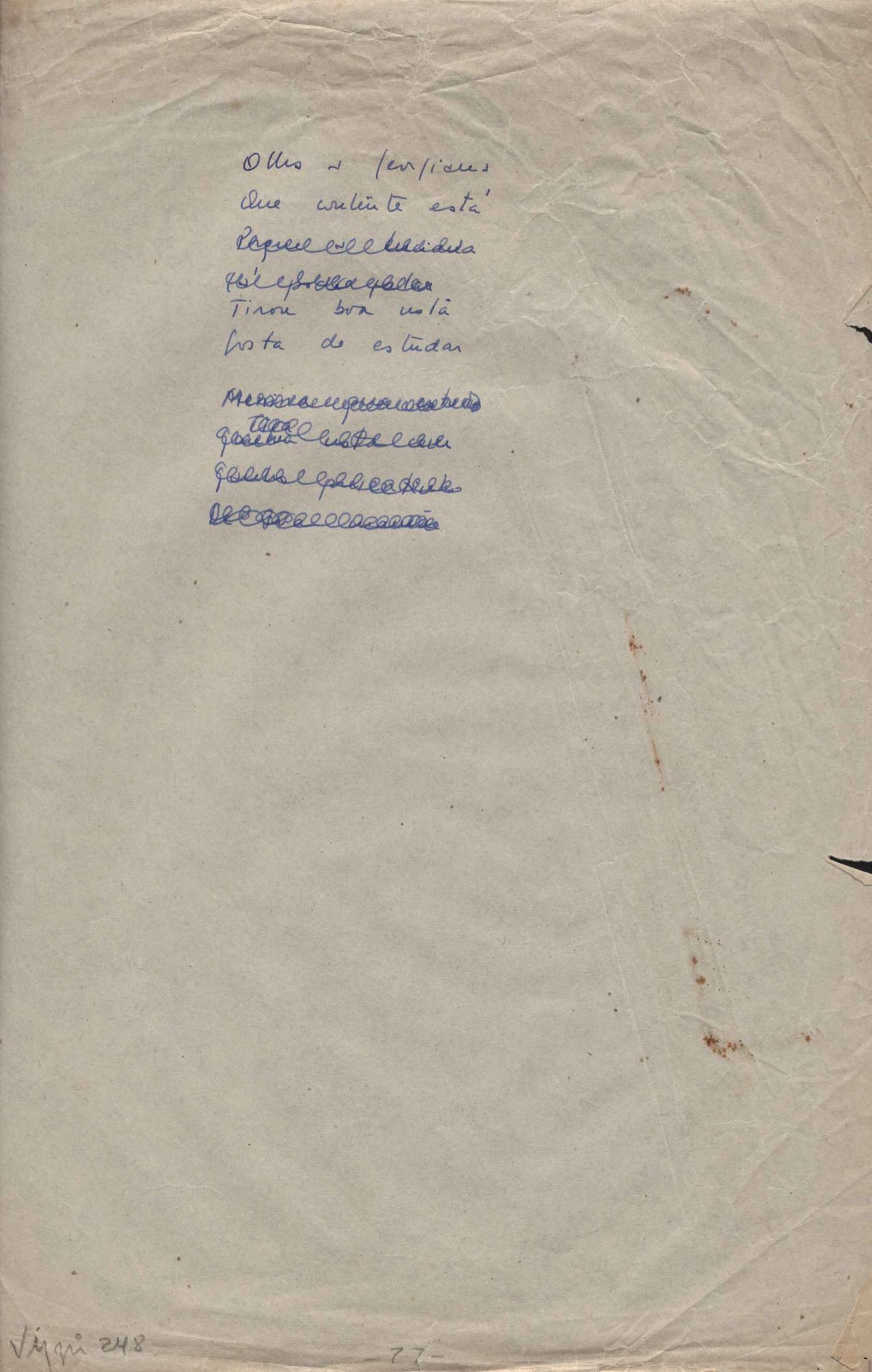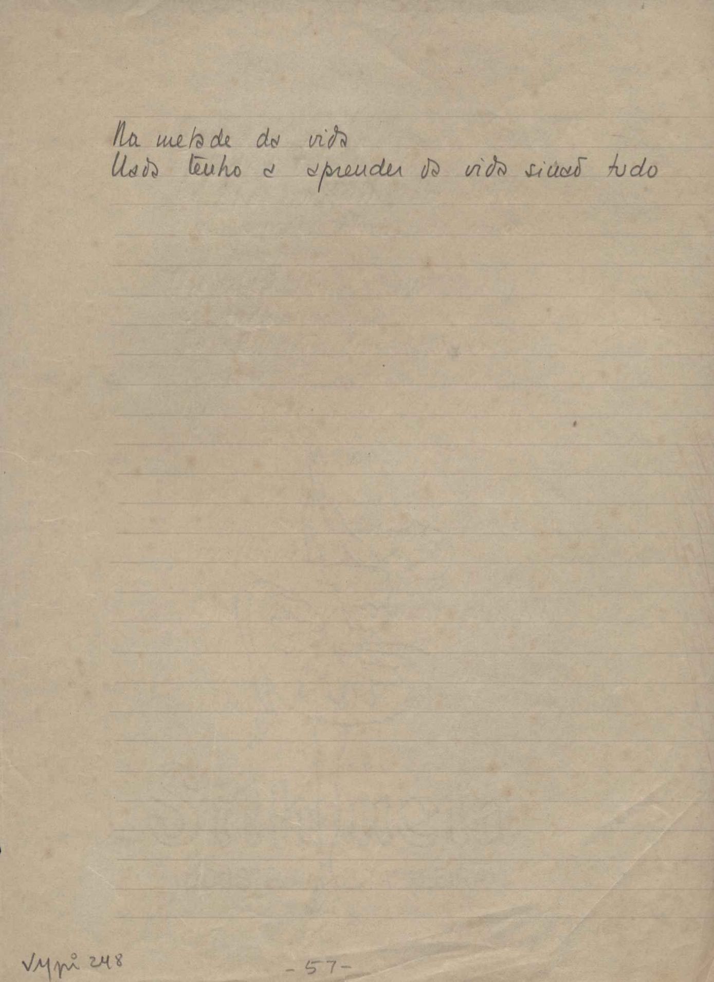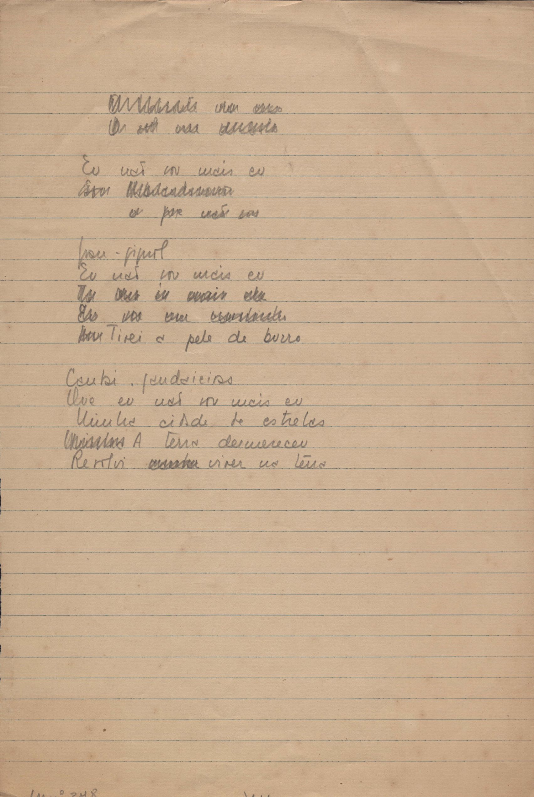 Este documento faz parte do dossiê VMPI248, "Poemas esparsos", que contempla poemas datados entre 21 ago. 1927 e 8 dez. 1971. Destes poemas, 401 são esboços e não possuem título (cf. registro VM0PI248_1_232). Estes originais não podem ser tomados como obra inédita. Ideias, tentativas, escritos inacabados, abandonados ou aproveitados posteriormente com outra forma compõem o dossiê.