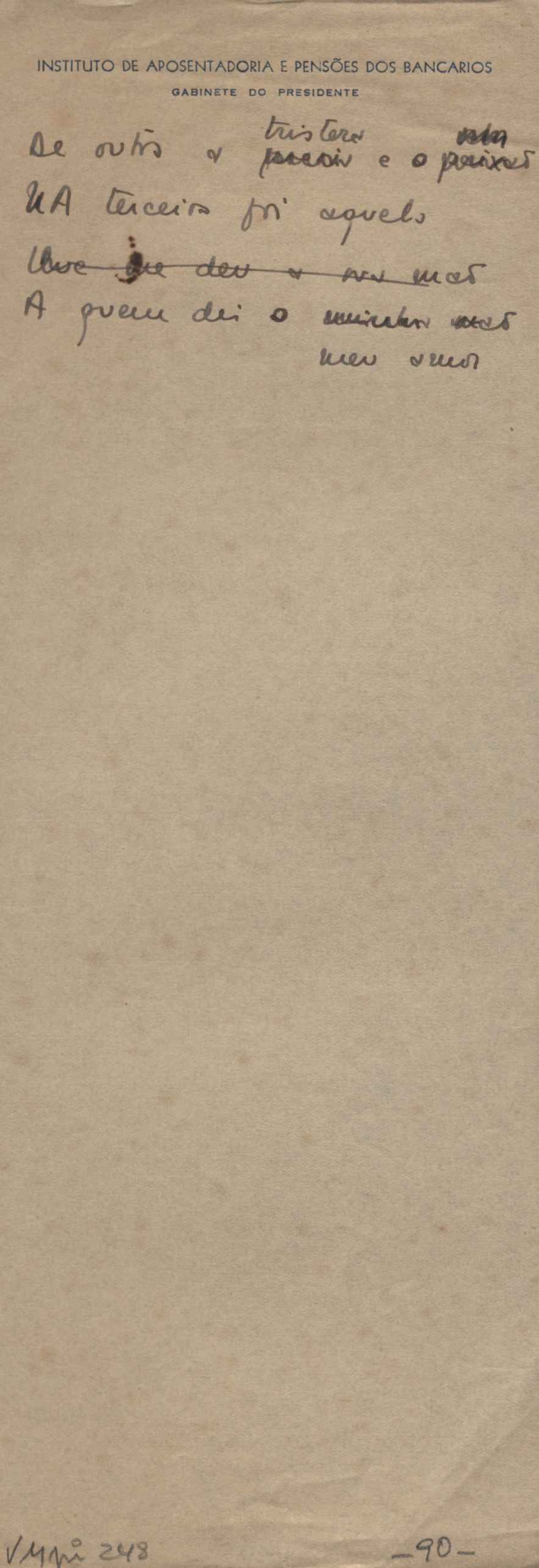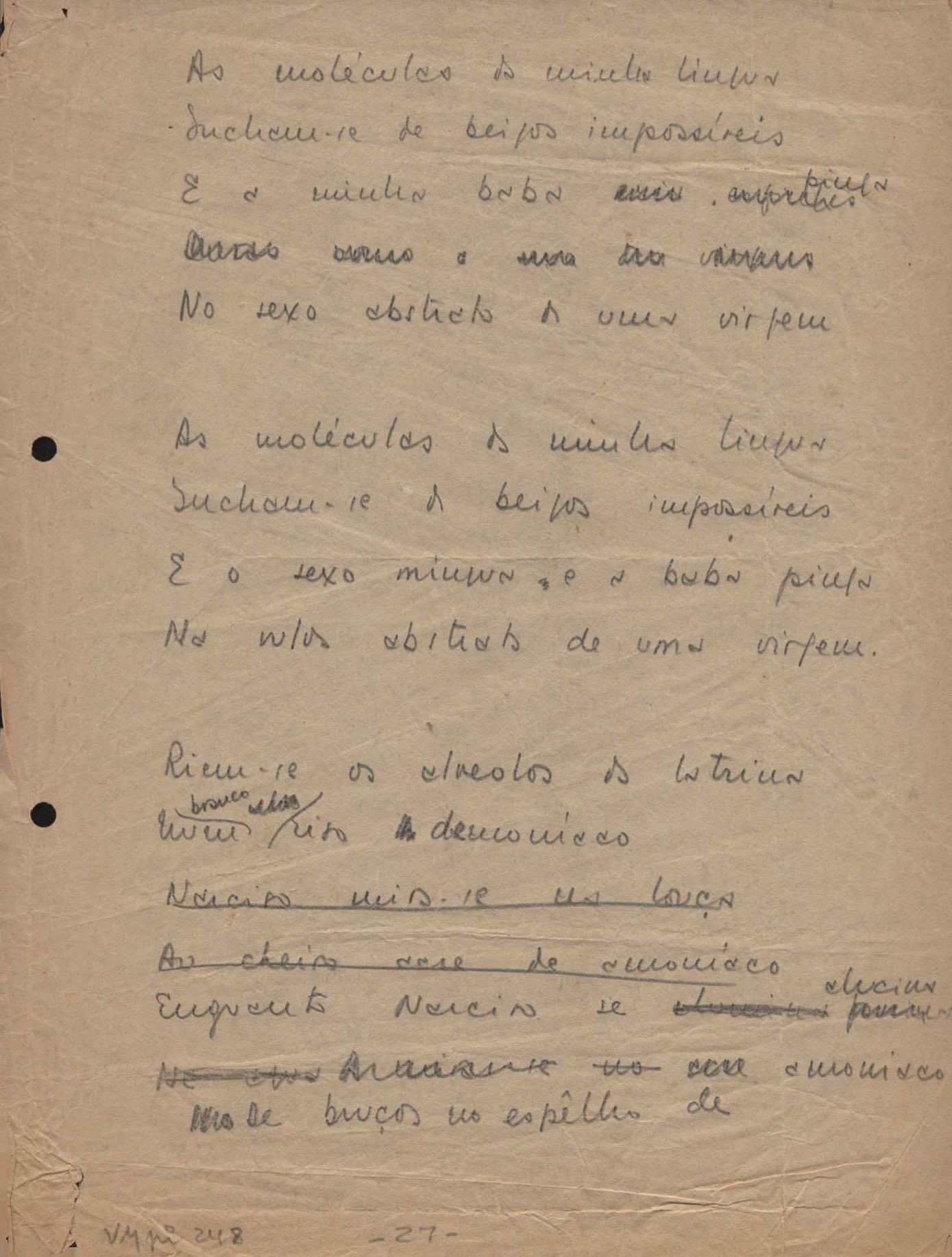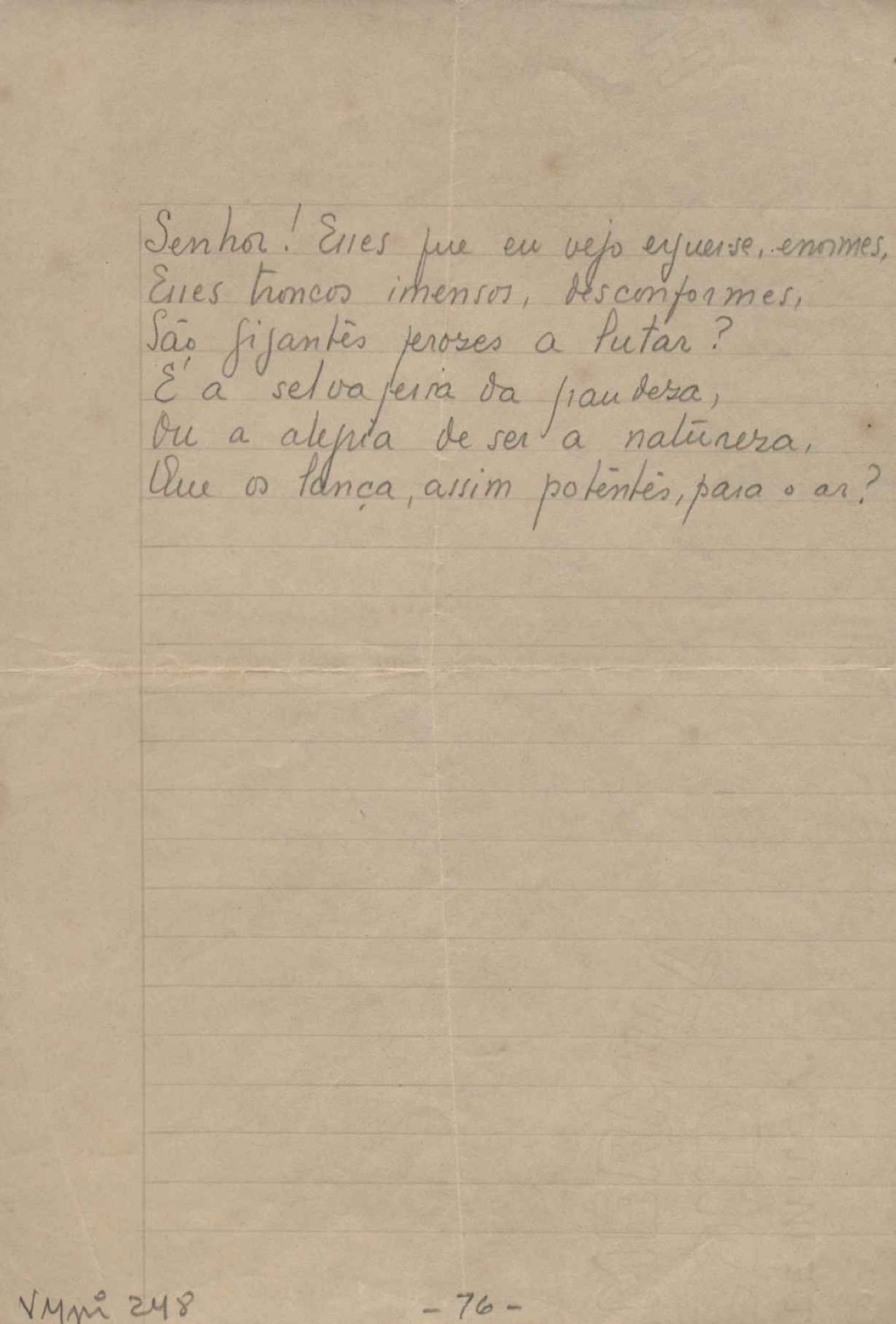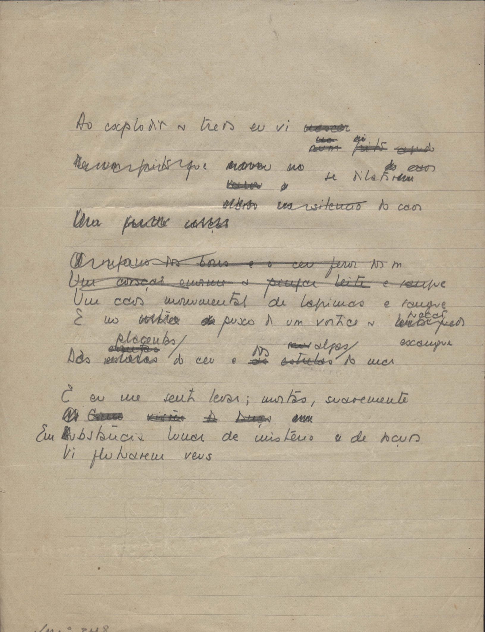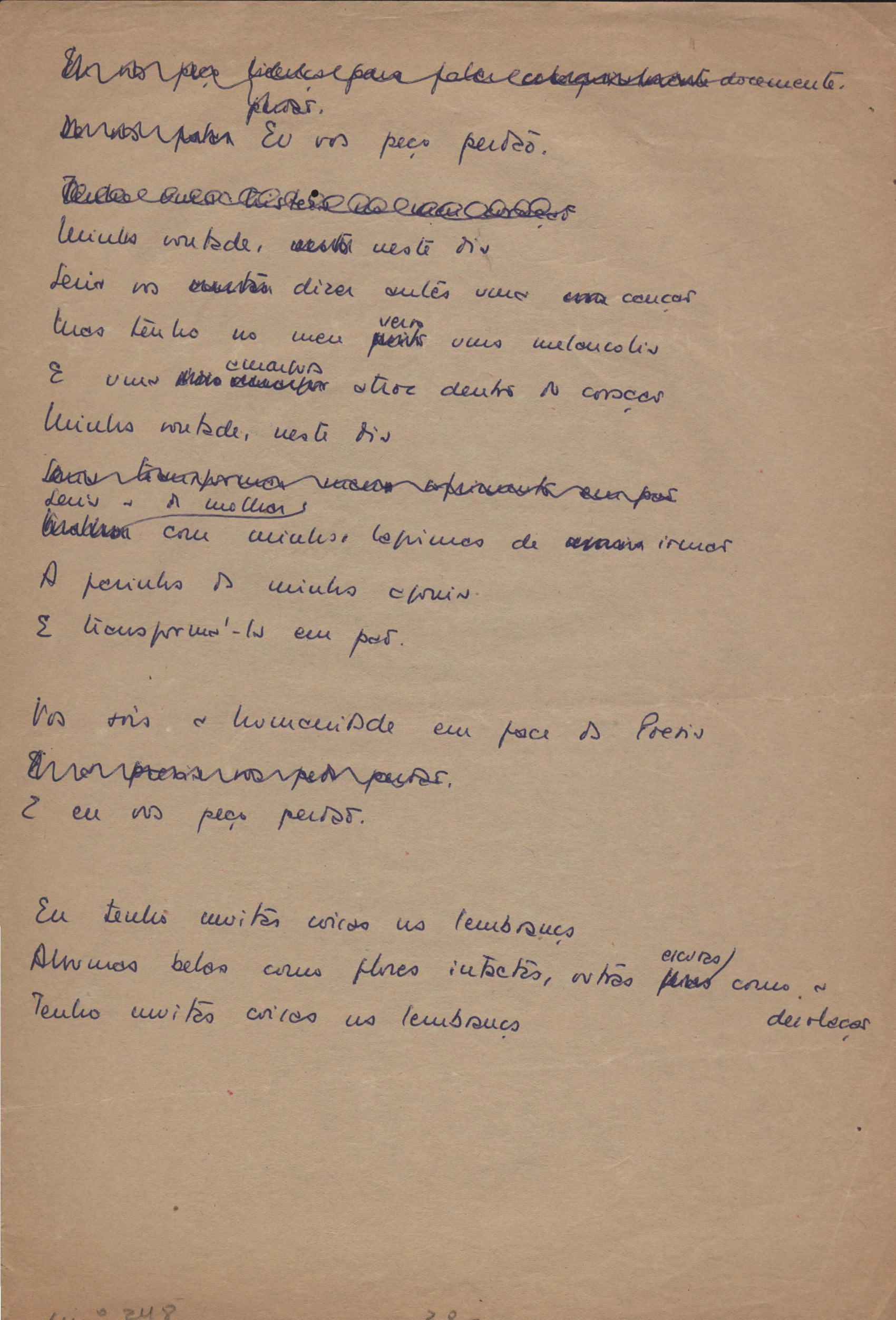 Este documento faz parte do dossiê VMPI248, "Poemas esparsos", que contempla poemas datados entre 21 ago. 1927 e 8 dez. 1971. Destes poemas, 401 são esboços e não possuem título (cf. registro VM0PI248_1_232). Estes originais não podem ser tomados como obra inédita. Ideias, tentativas, escritos inacabados, abandonados ou aproveitados posteriormente com outra forma compõem o dossiê.