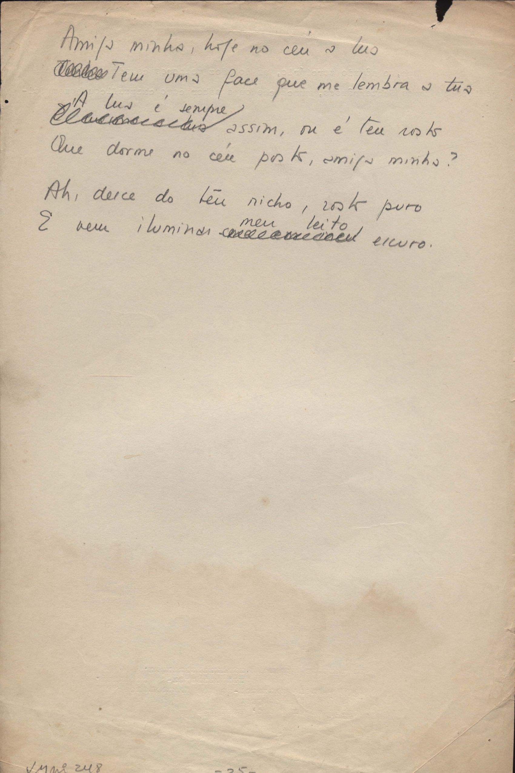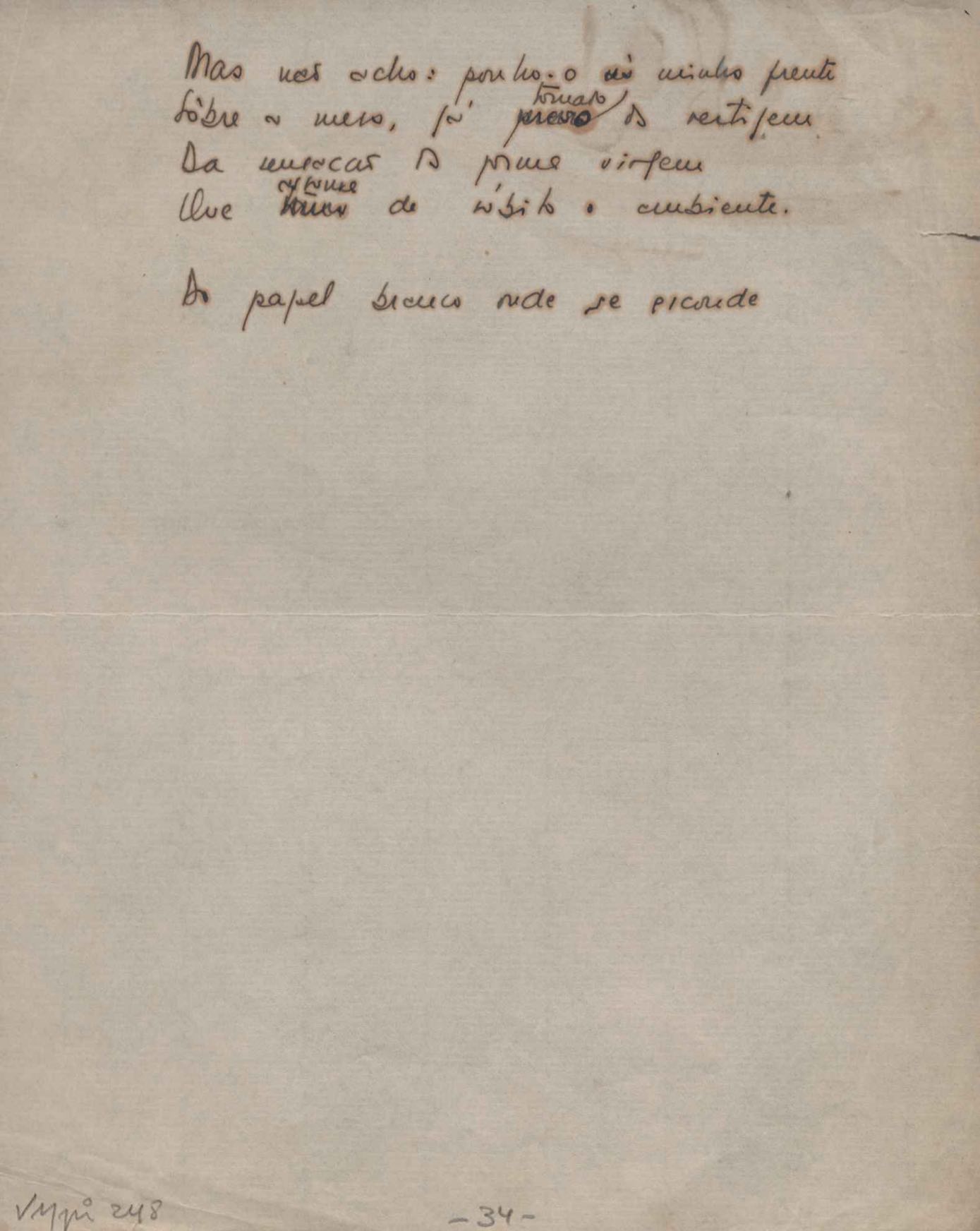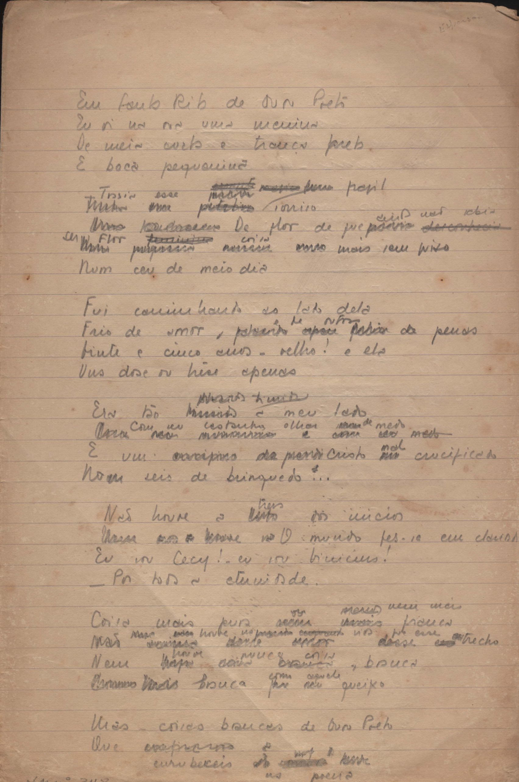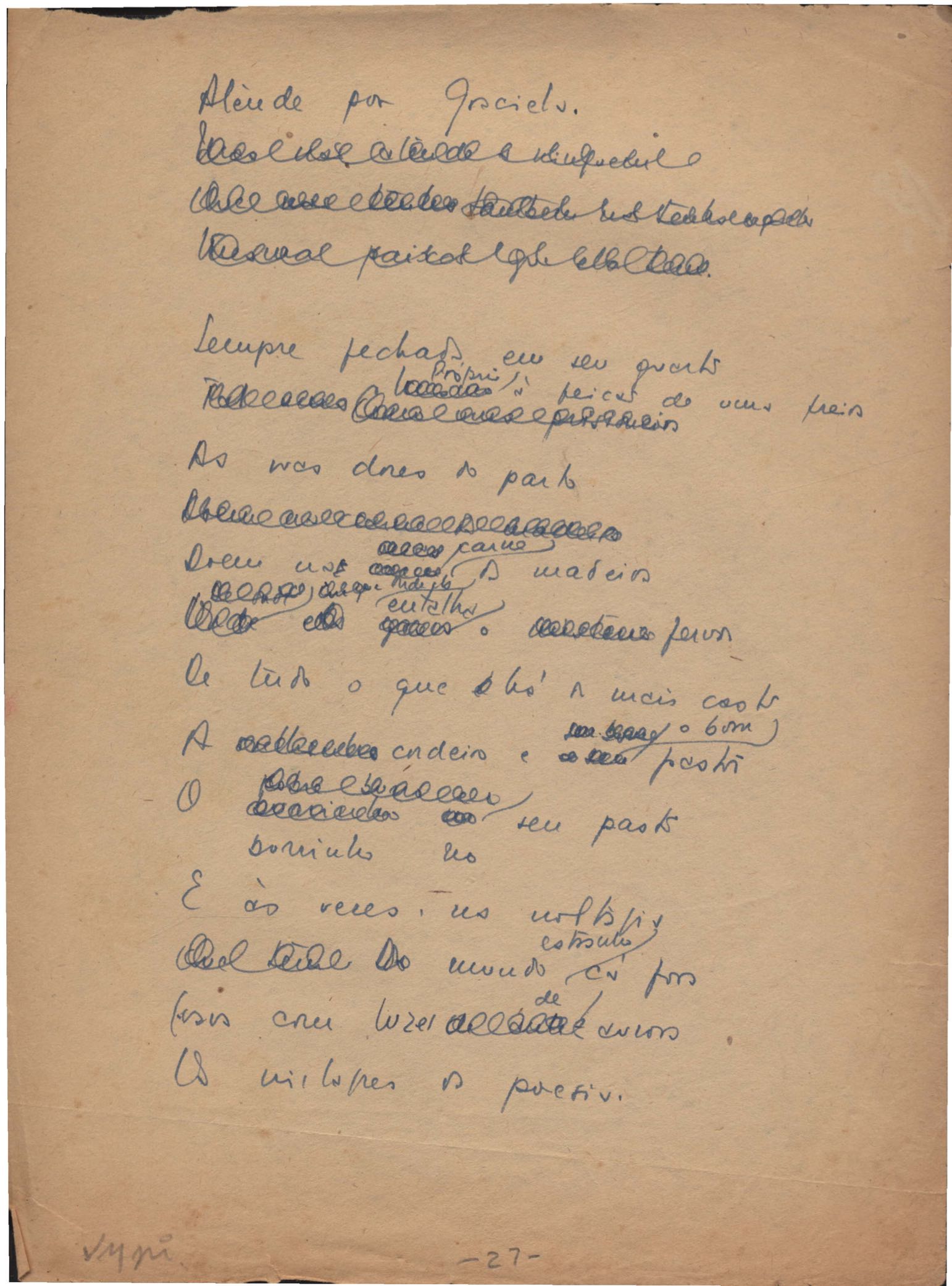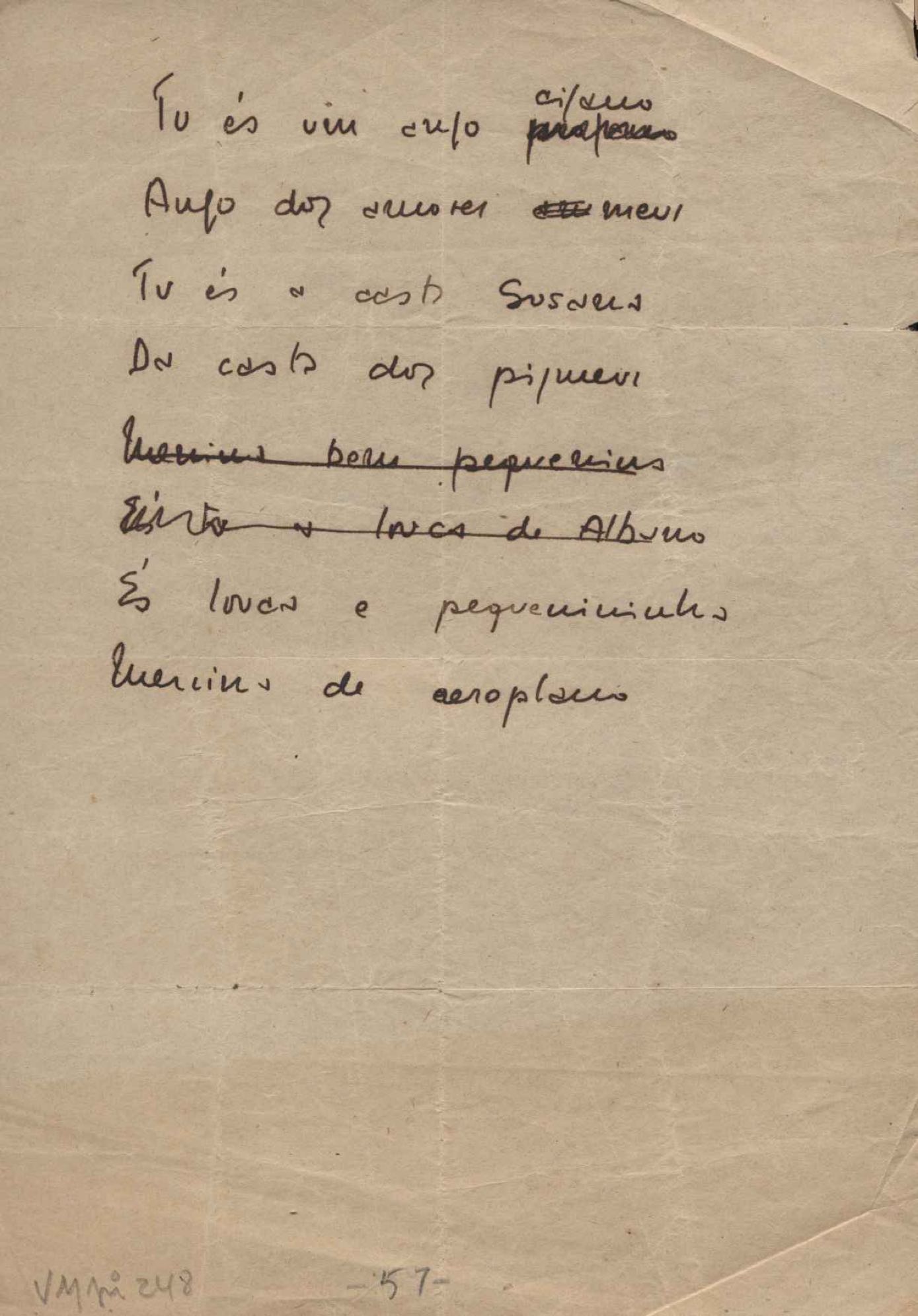 Este documento faz parte do dossiê VMPI248, "Poemas esparsos", que contempla poemas datados entre 21 ago. 1927 e 8 dez. 1971. Destes poemas, 401 são esboços e não possuem título (cf. registro VM0PI248_1_232). Estes originais não podem ser tomados como obra inédita. Ideias, tentativas, escritos inacabados, abandonados ou aproveitados posteriormente com outra forma compõem o dossiê.