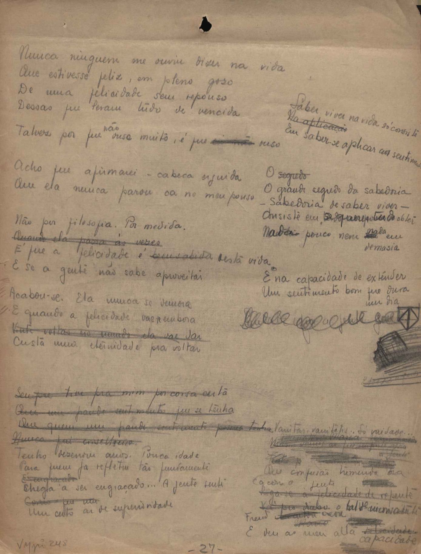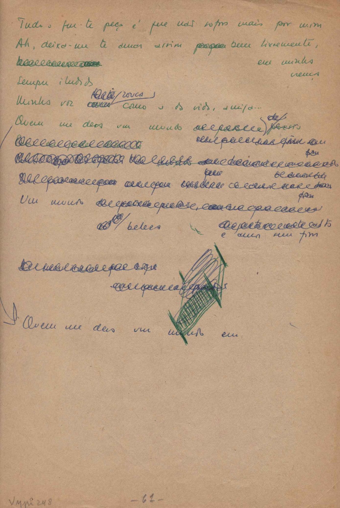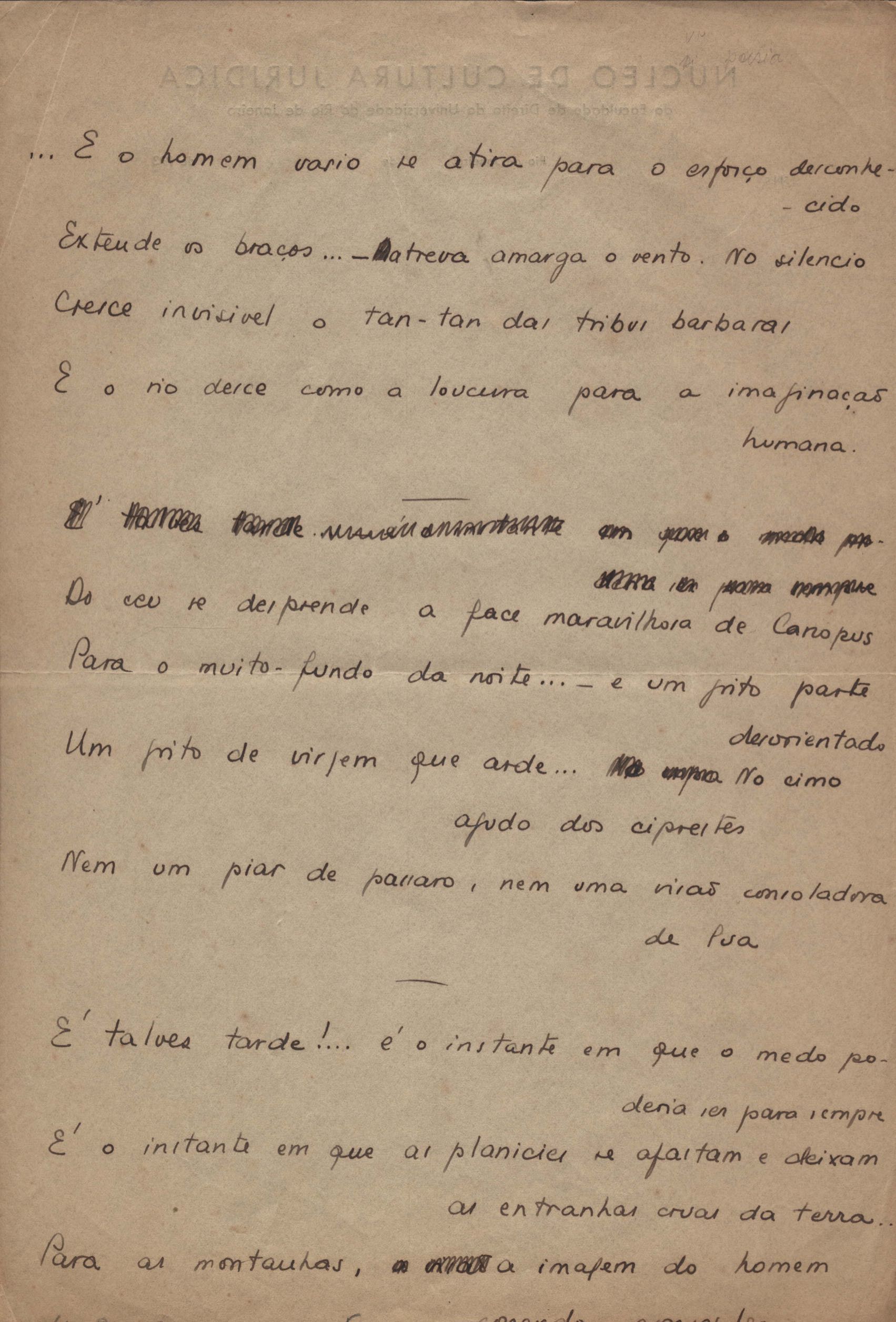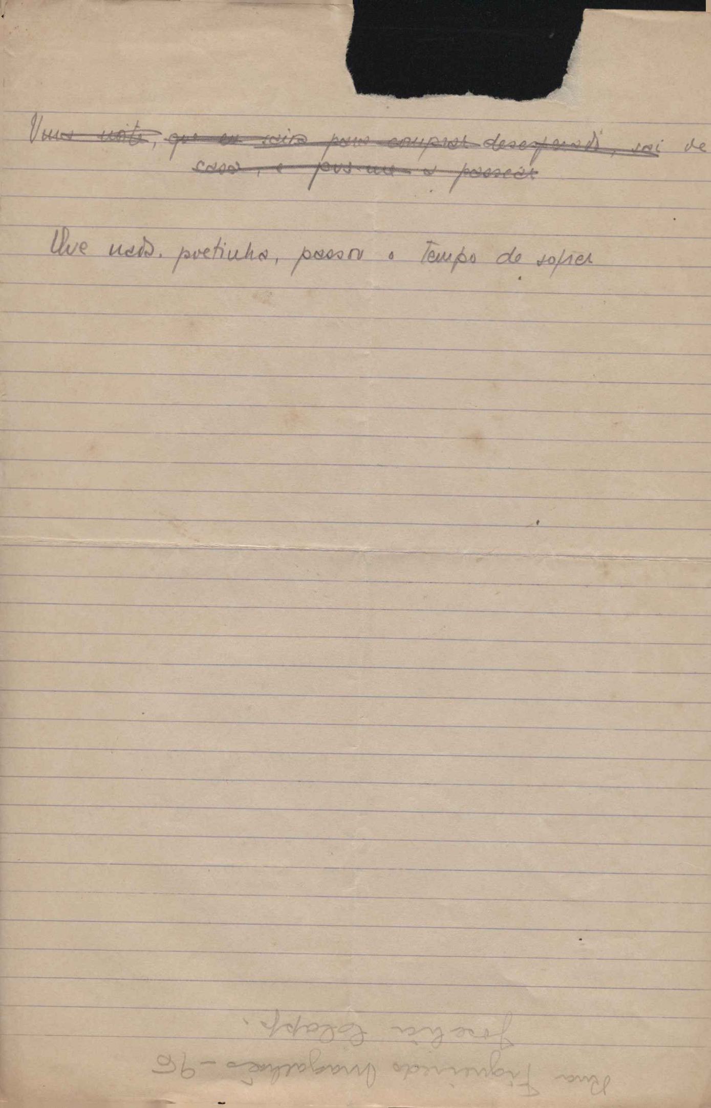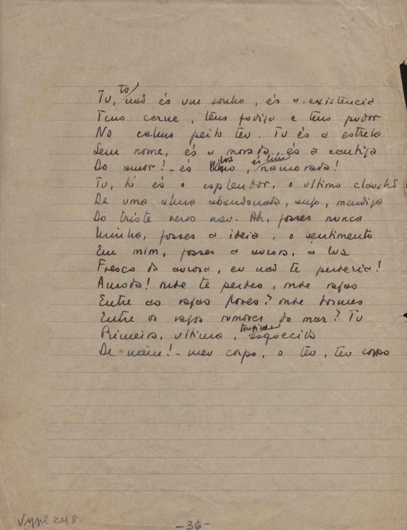Este documento faz parte do dossiê VMPI248, "Poemas esparsos", que contempla poemas datados entre 21 ago. 1927 e 8 dez. 1971. Destes poemas, 401 são esboços e não possuem título (cf. registro VM0PI248_1_232). Estes originais não podem ser tomados como obra inédita. Ideias, tentativas, escritos inacabados, abandonados ou aproveitados posteriormente com outra forma compõem o dossiê.