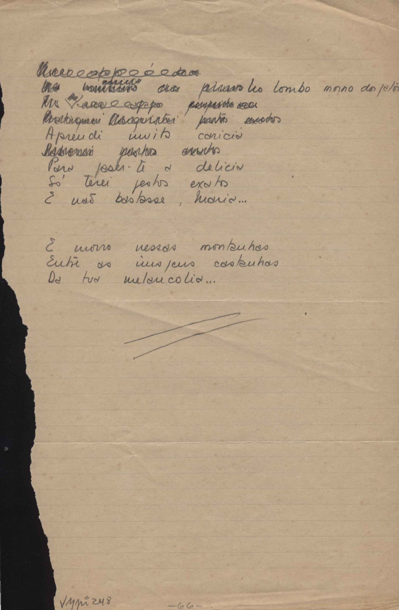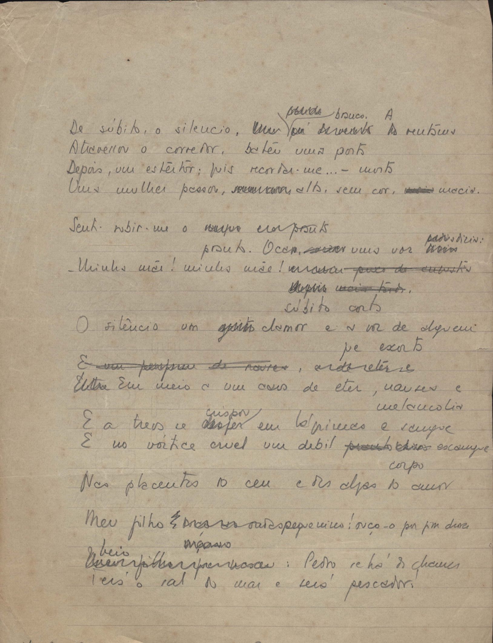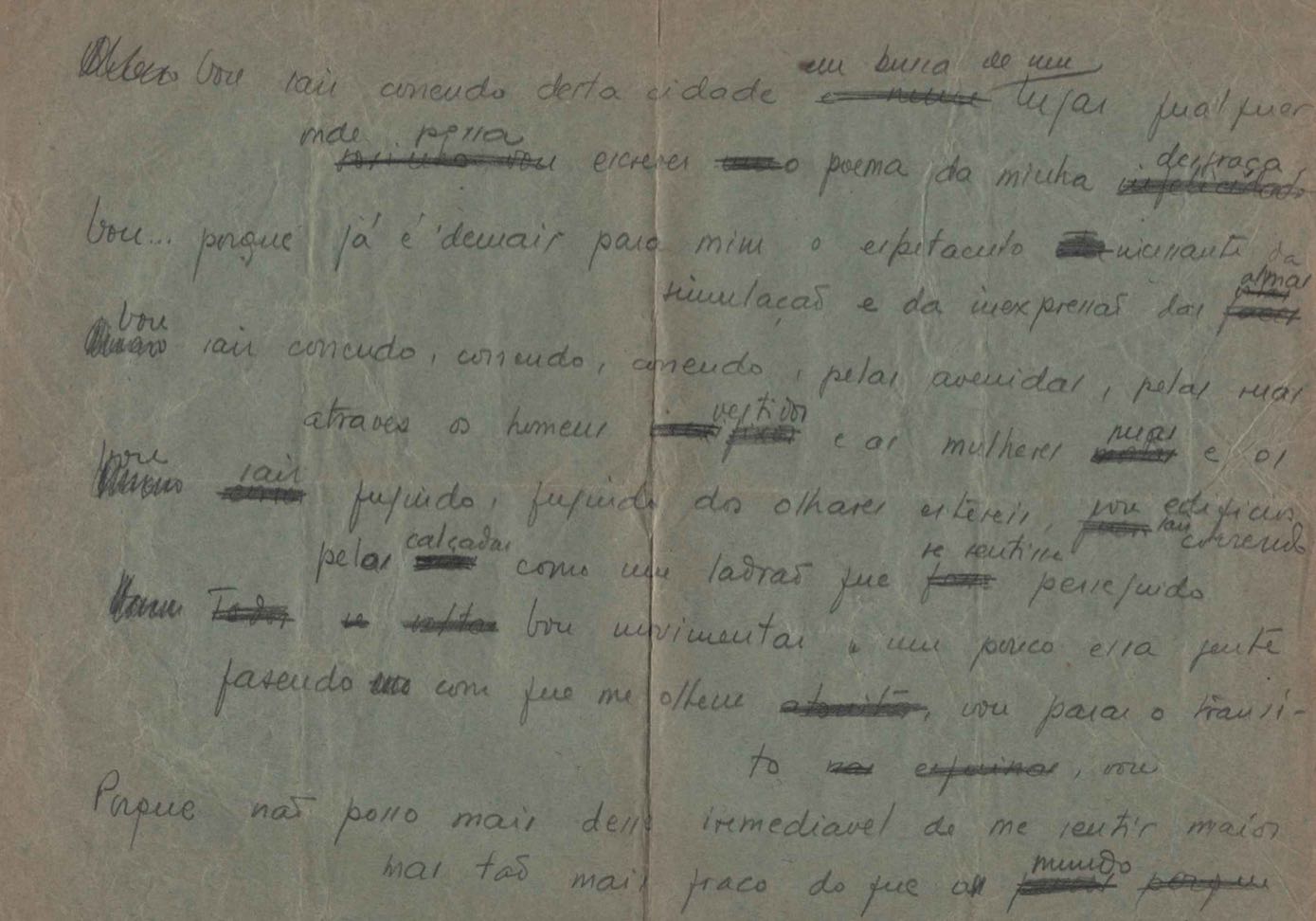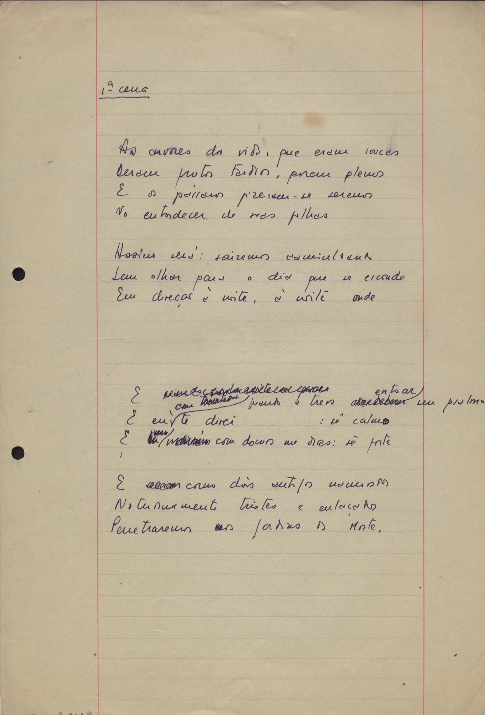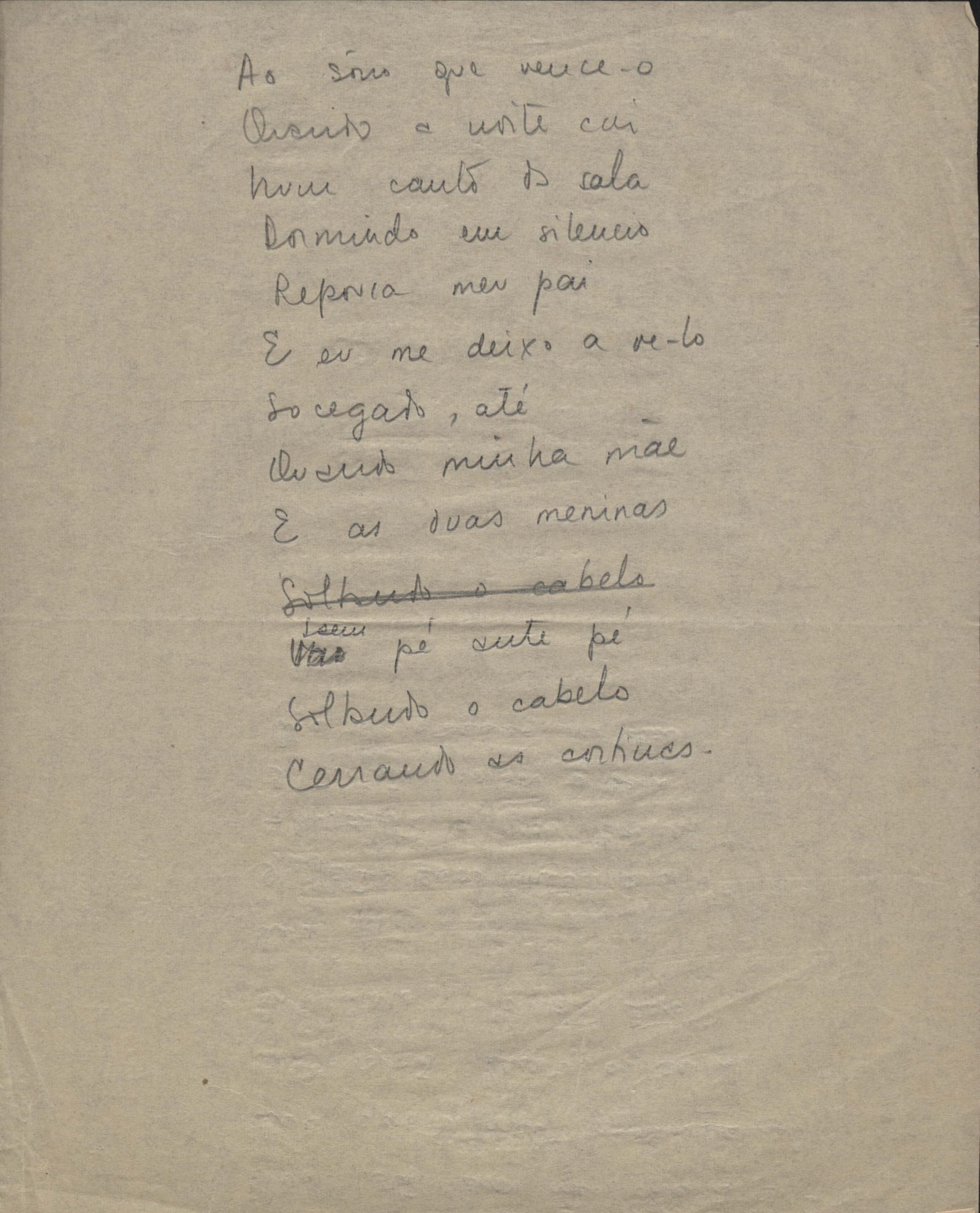 Este documento faz parte do dossiê VMPI248, "Poemas esparsos", que contempla poemas datados entre 21 ago. 1927 e 8 dez. 1971. Destes poemas, 401 são esboços e não possuem título (cf. registro VM0PI248_1_232). Estes originais não podem ser tomados como obra inédita. Ideias, tentativas, escritos inacabados, abandonados ou aproveitados posteriormente com outra forma compõem o dossiê.