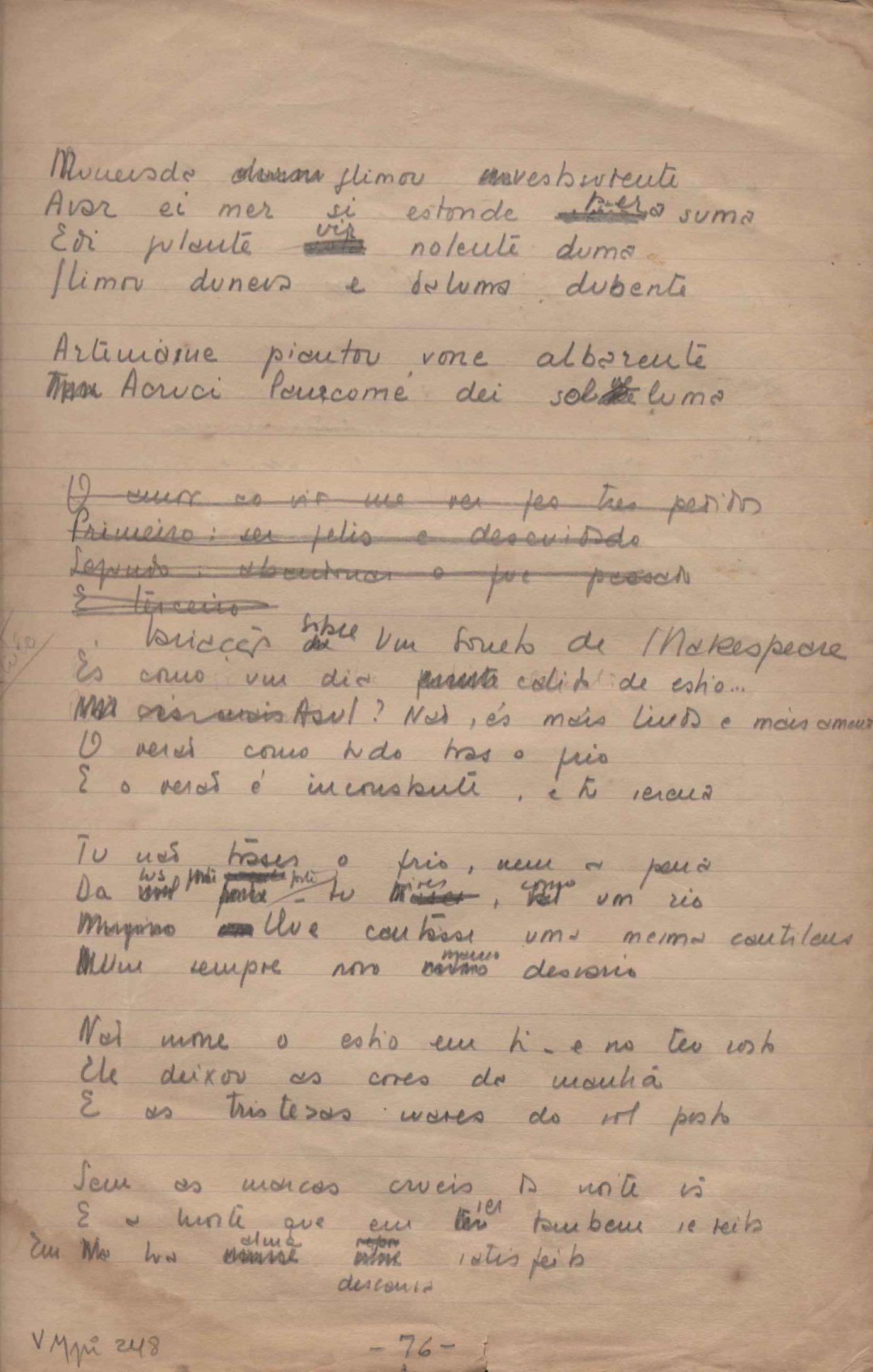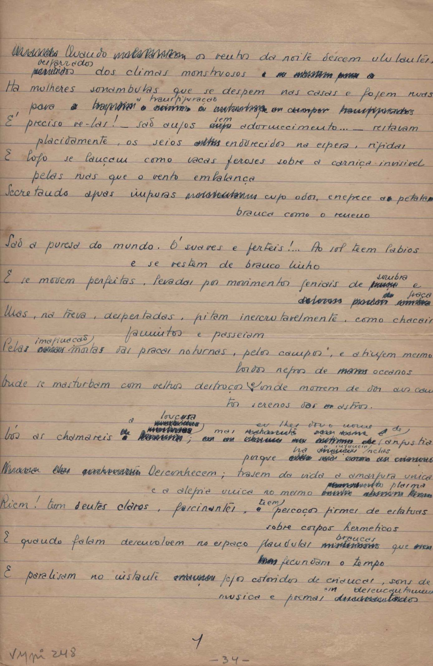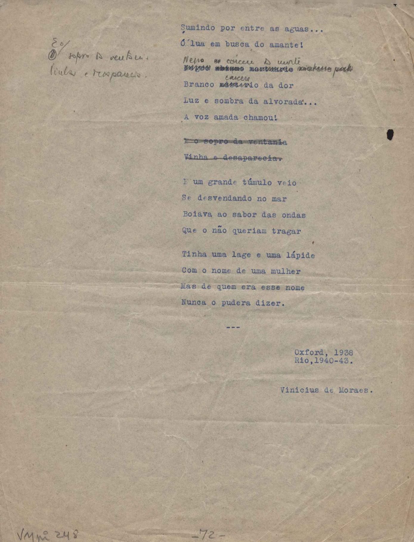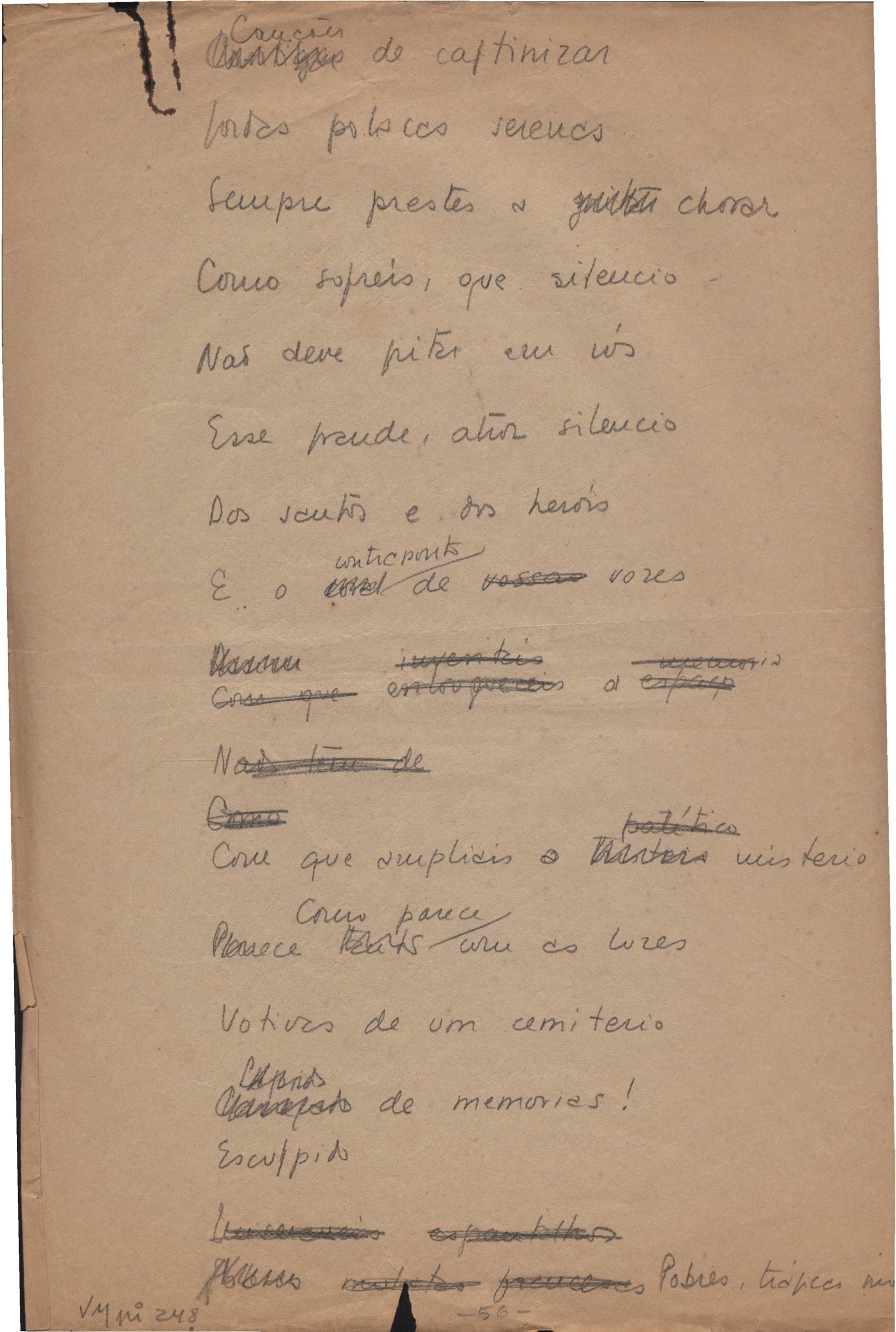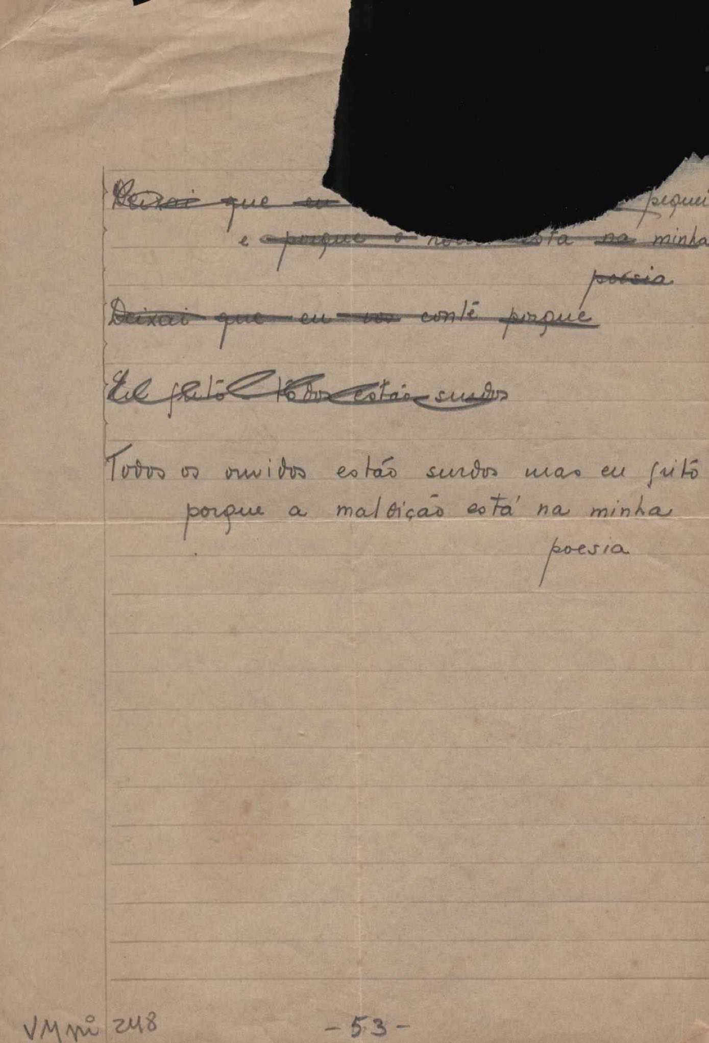 Este documento faz parte do dossiê VMPI248, "Poemas esparsos", que contempla poemas datados entre 21 ago. 1927 e 8 dez. 1971. Destes poemas, 401 são esboços e não possuem título (cf. registro VM0PI248_1_232). Estes originais não podem ser tomados como obra inédita. Ideias, tentativas, escritos inacabados, abandonados ou aproveitados posteriormente com outra forma compõem o dossiê.