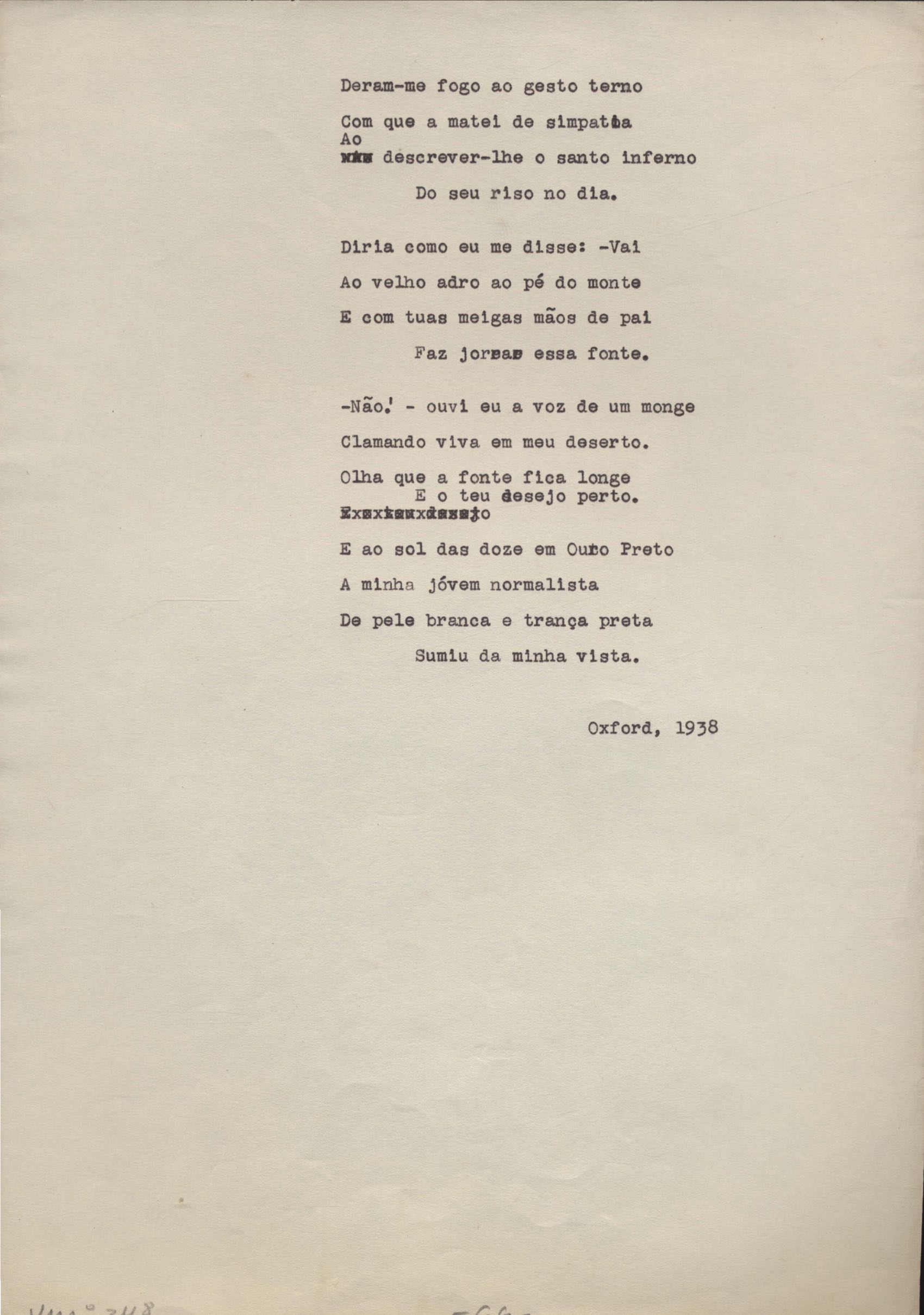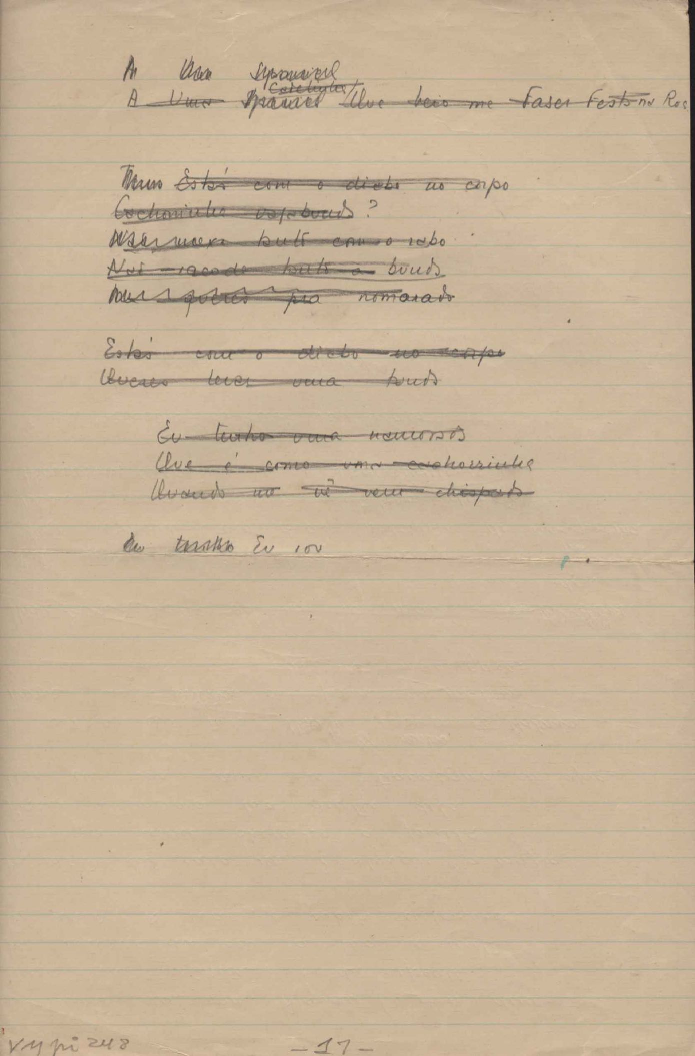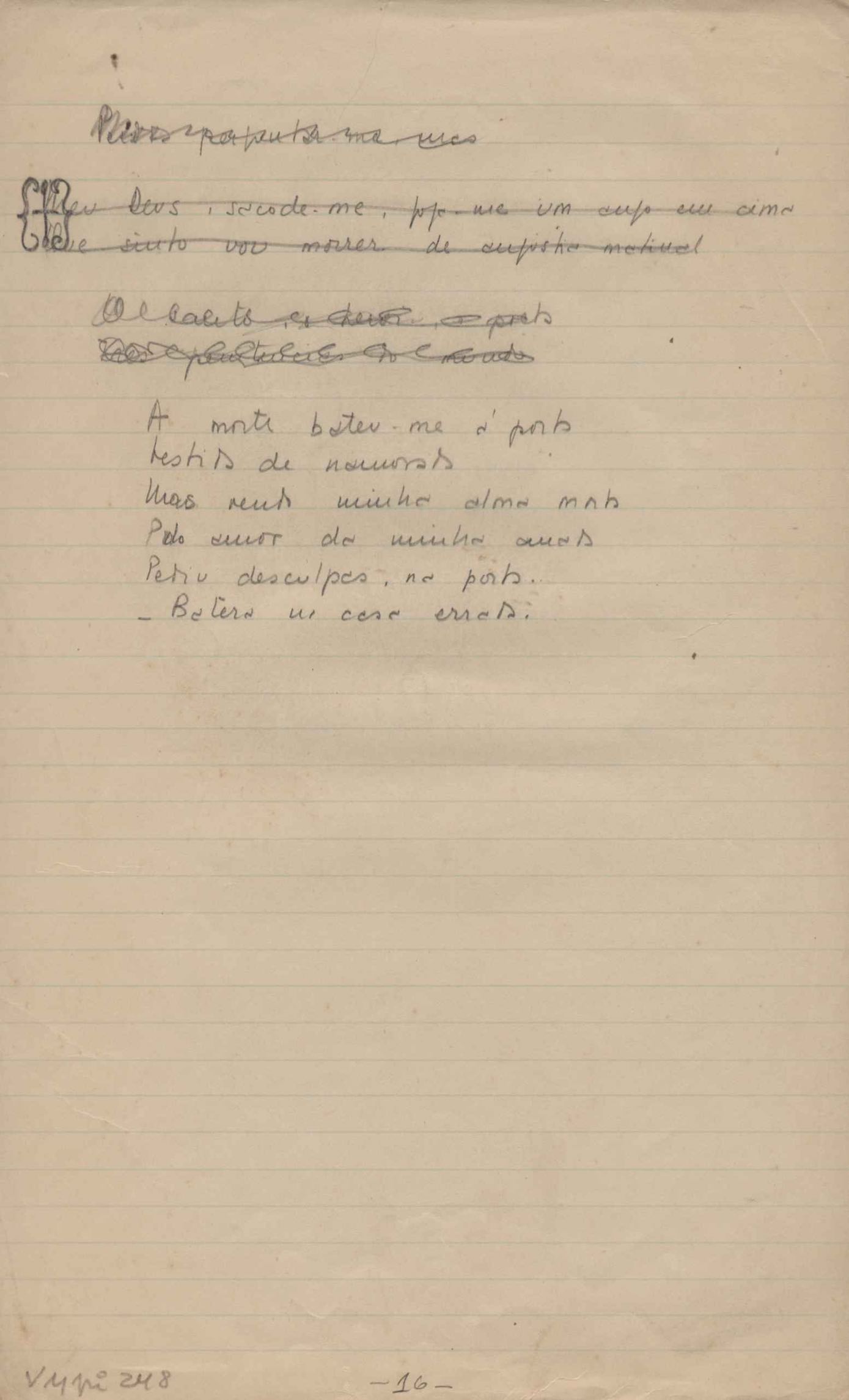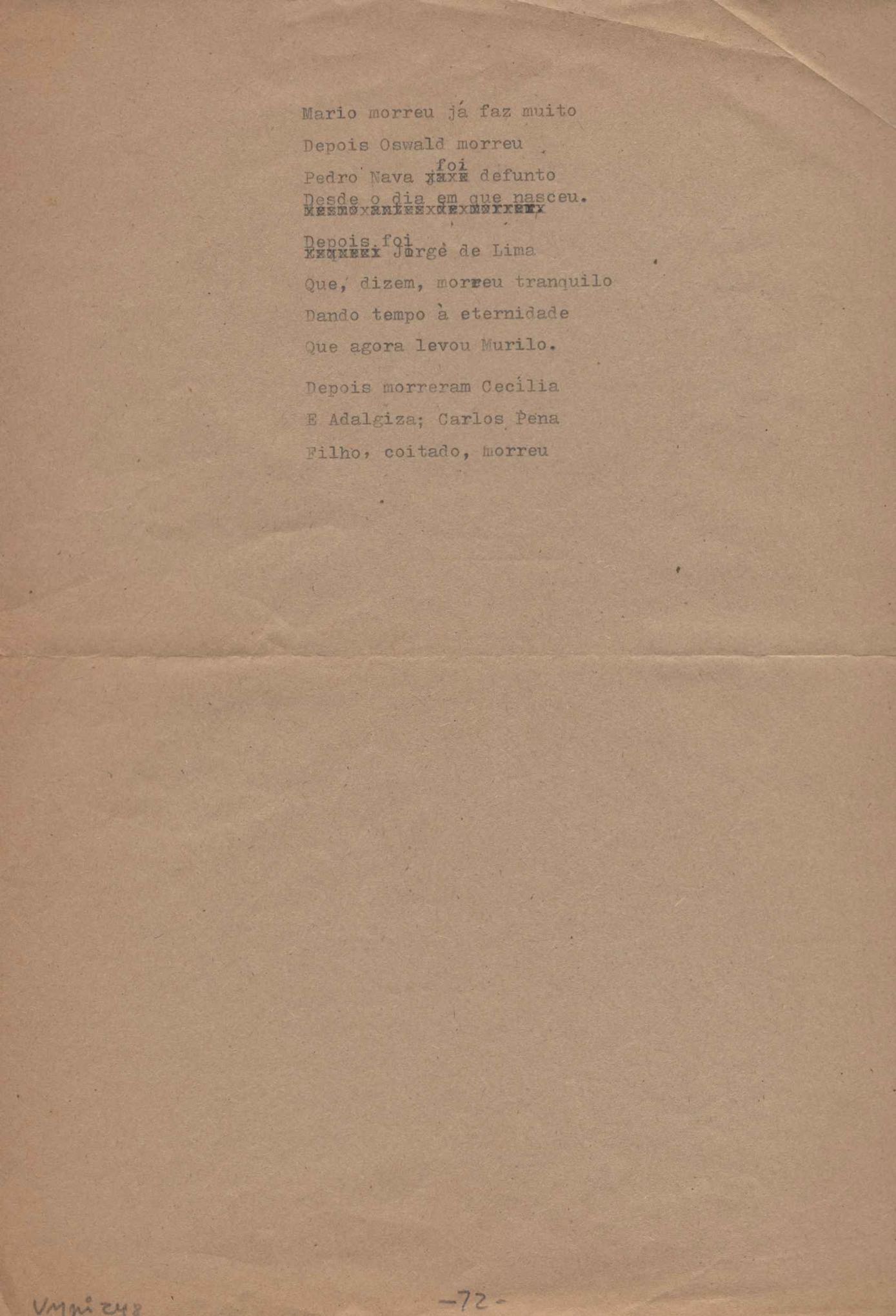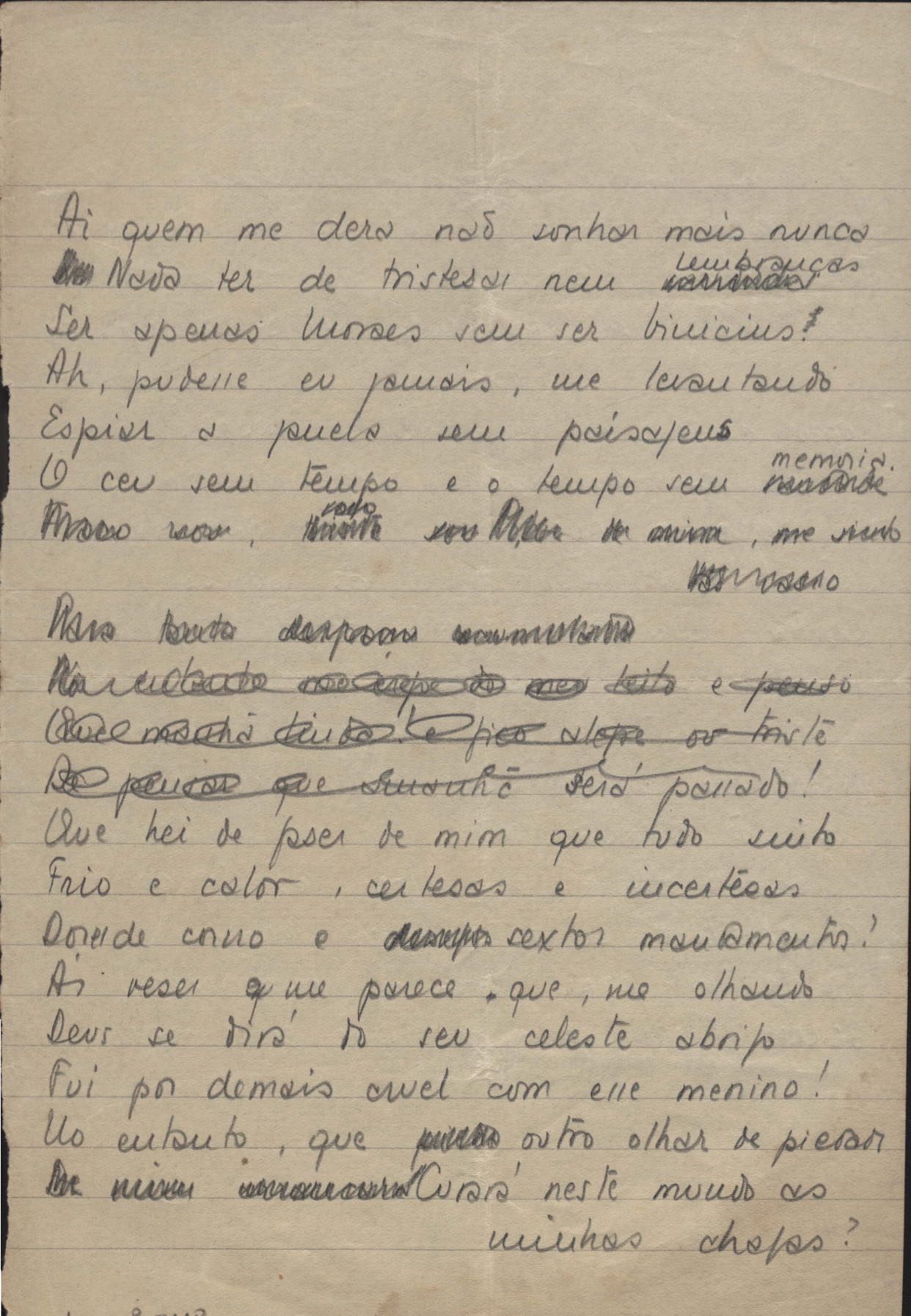 Este documento faz parte do dossiê VMPI248, "Poemas esparsos", que contempla poemas datados entre 21 ago. 1927 e 8 dez. 1971. Destes poemas, 401 são esboços e não possuem título (cf. registro VM0PI248_1_232). Estes originais não podem ser tomados como obra inédita. Ideias, tentativas, escritos inacabados, abandonados ou aproveitados posteriormente com outra forma compõem o dossiê.