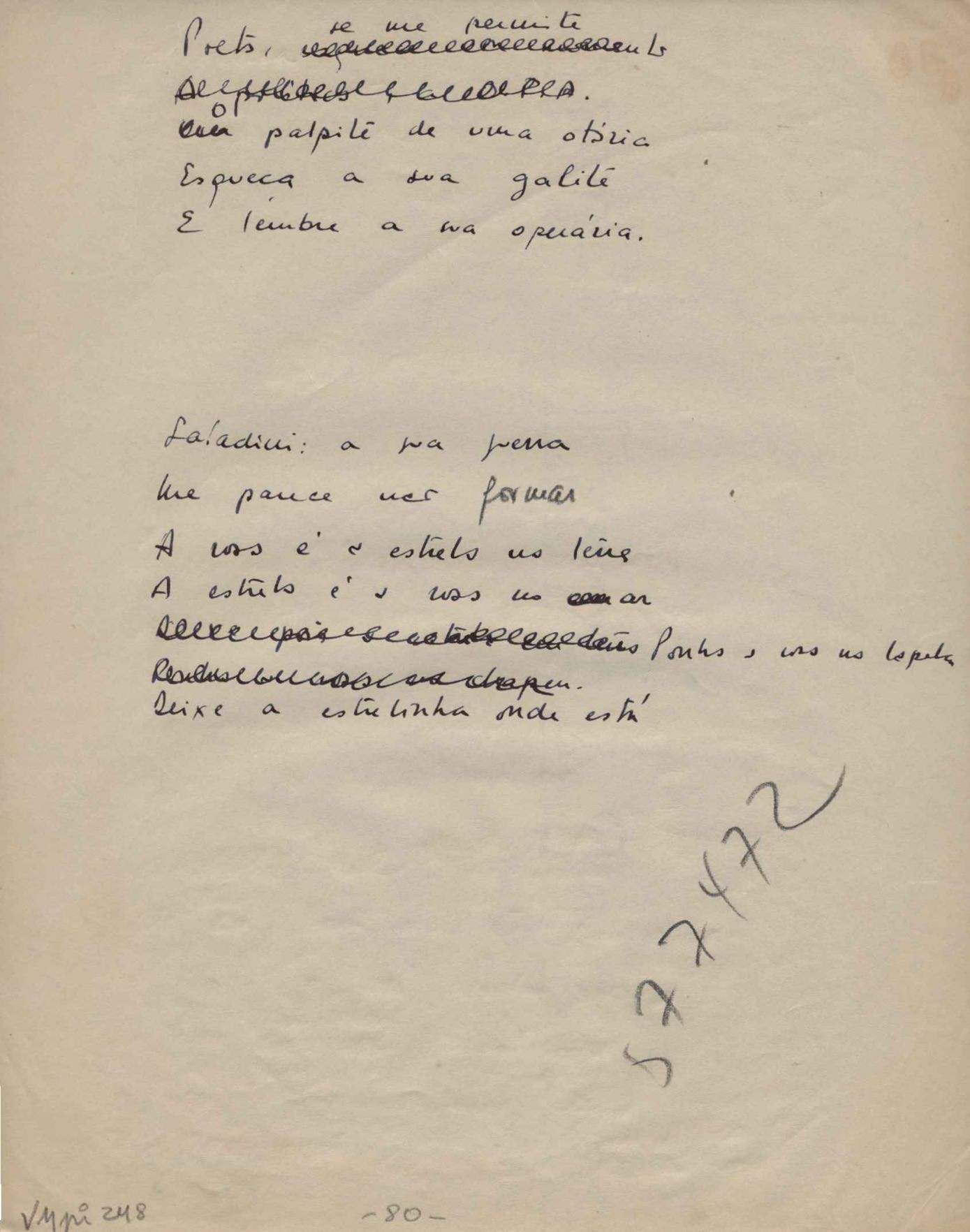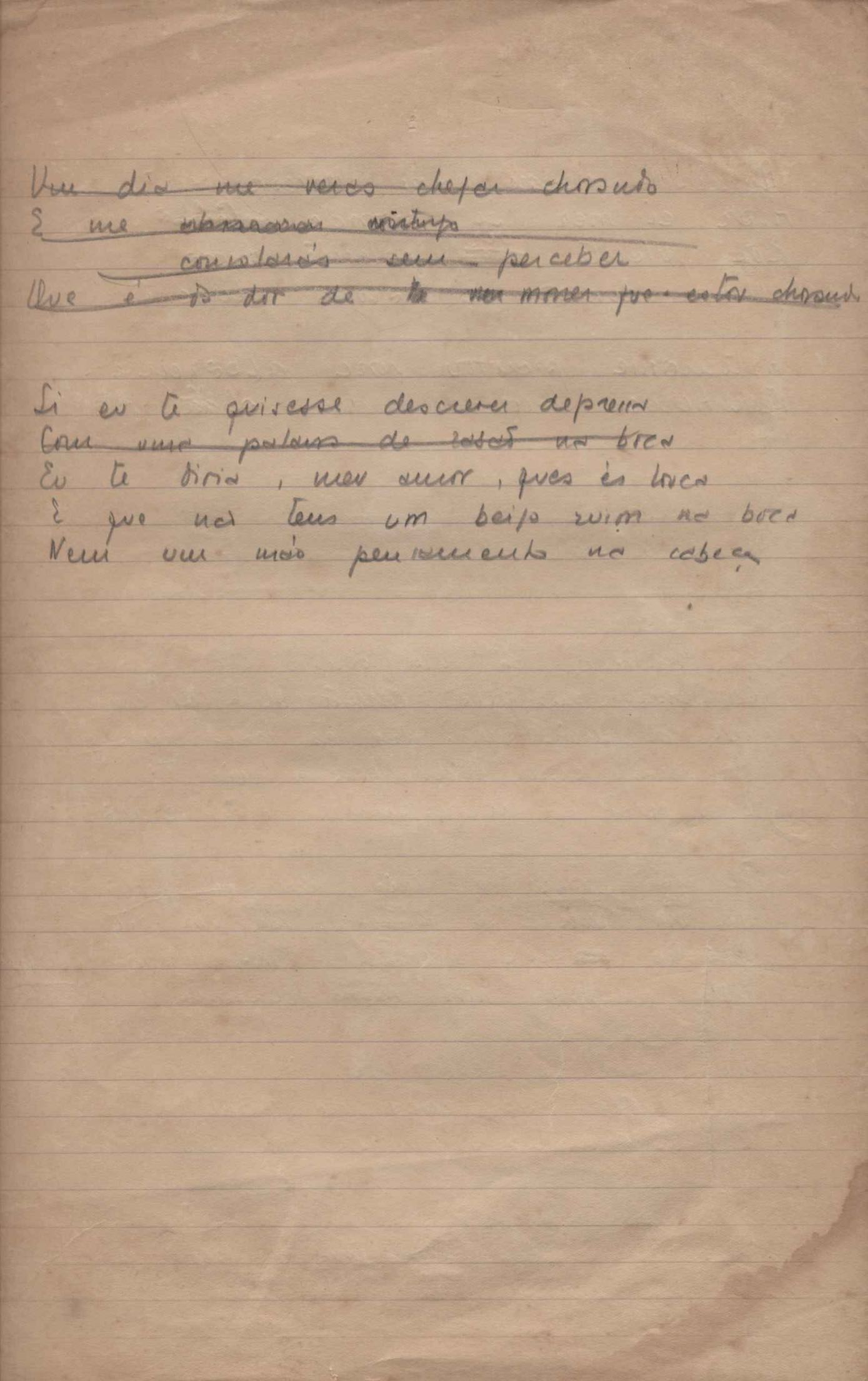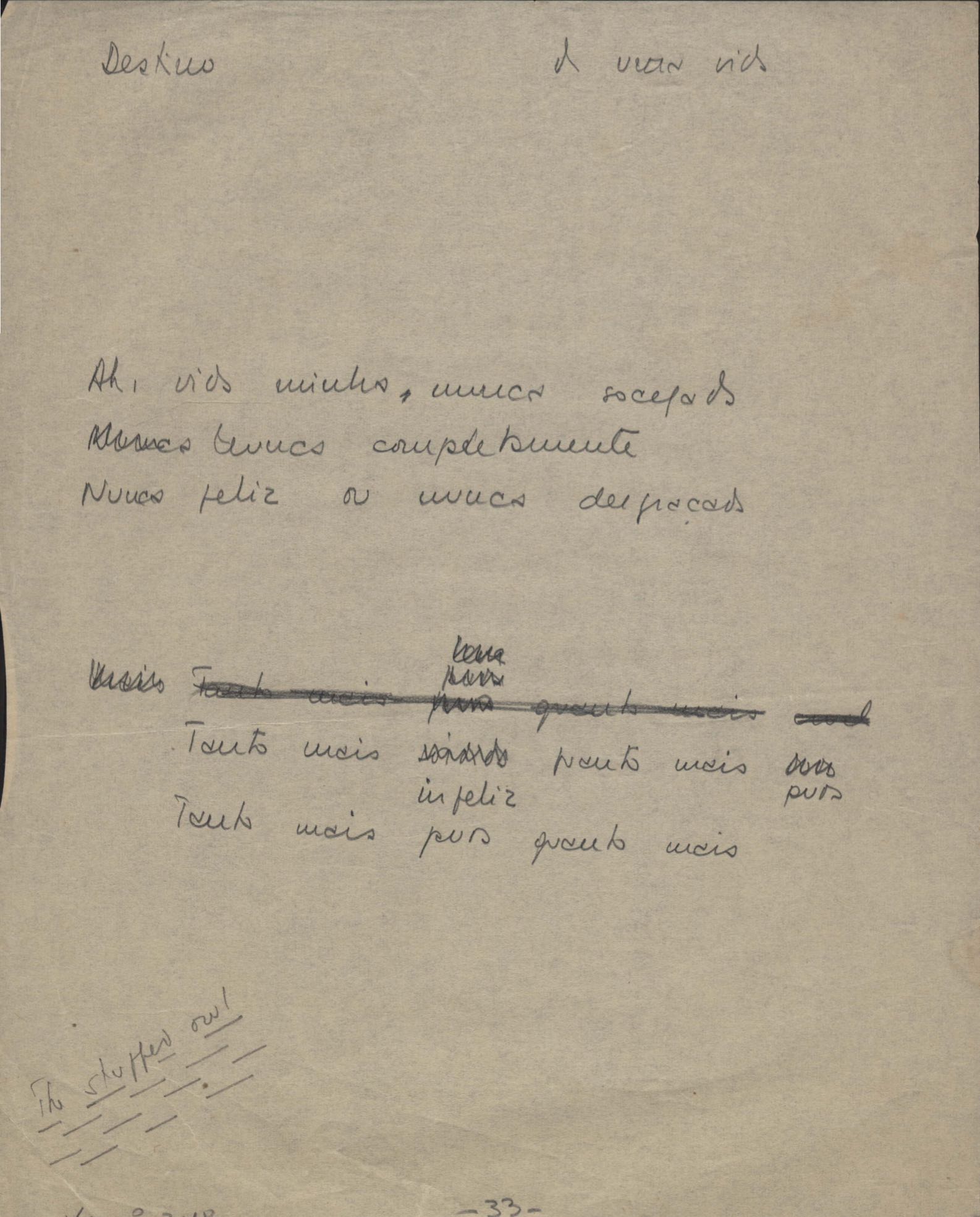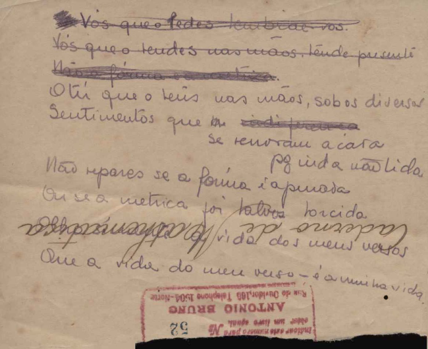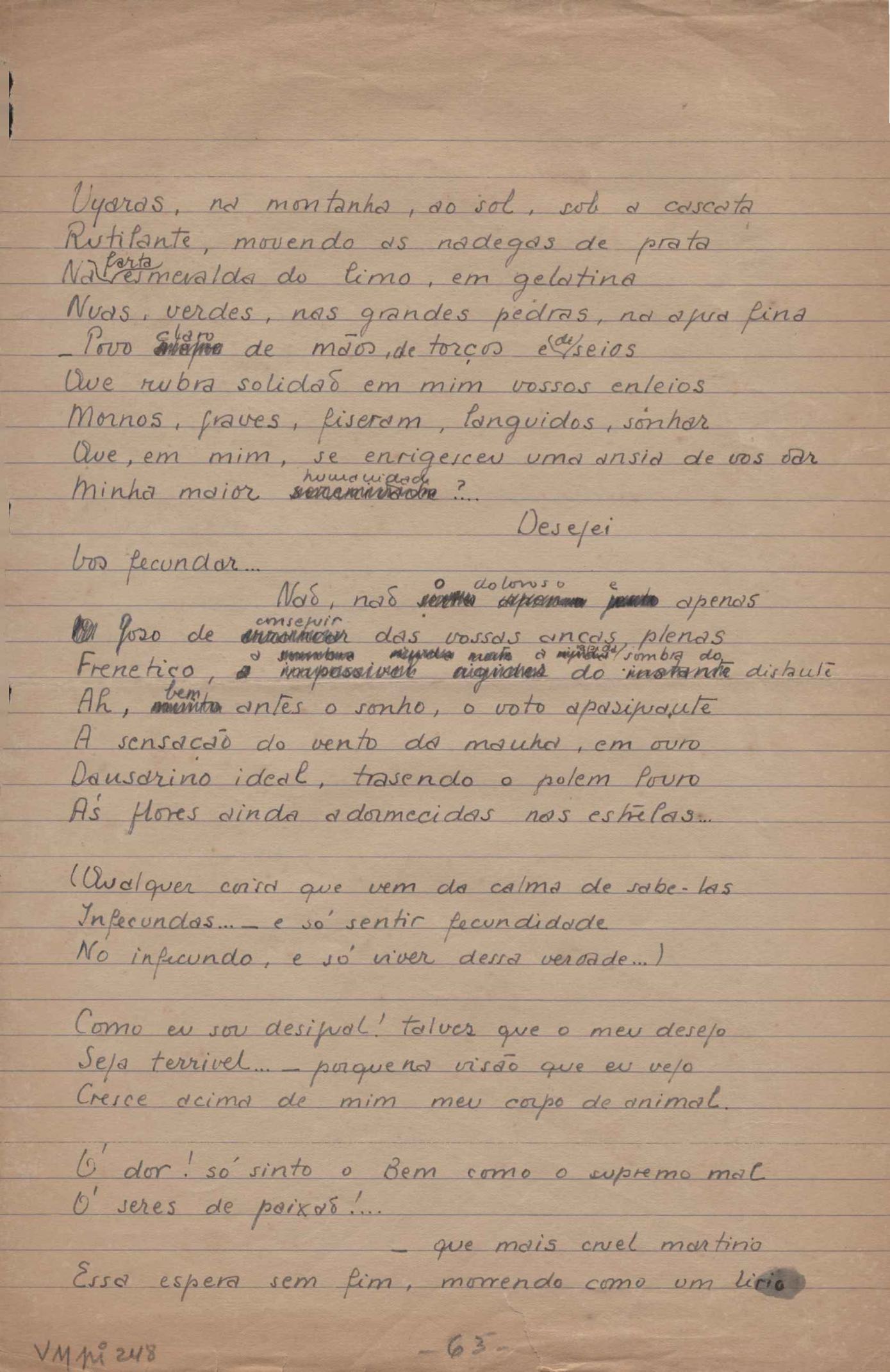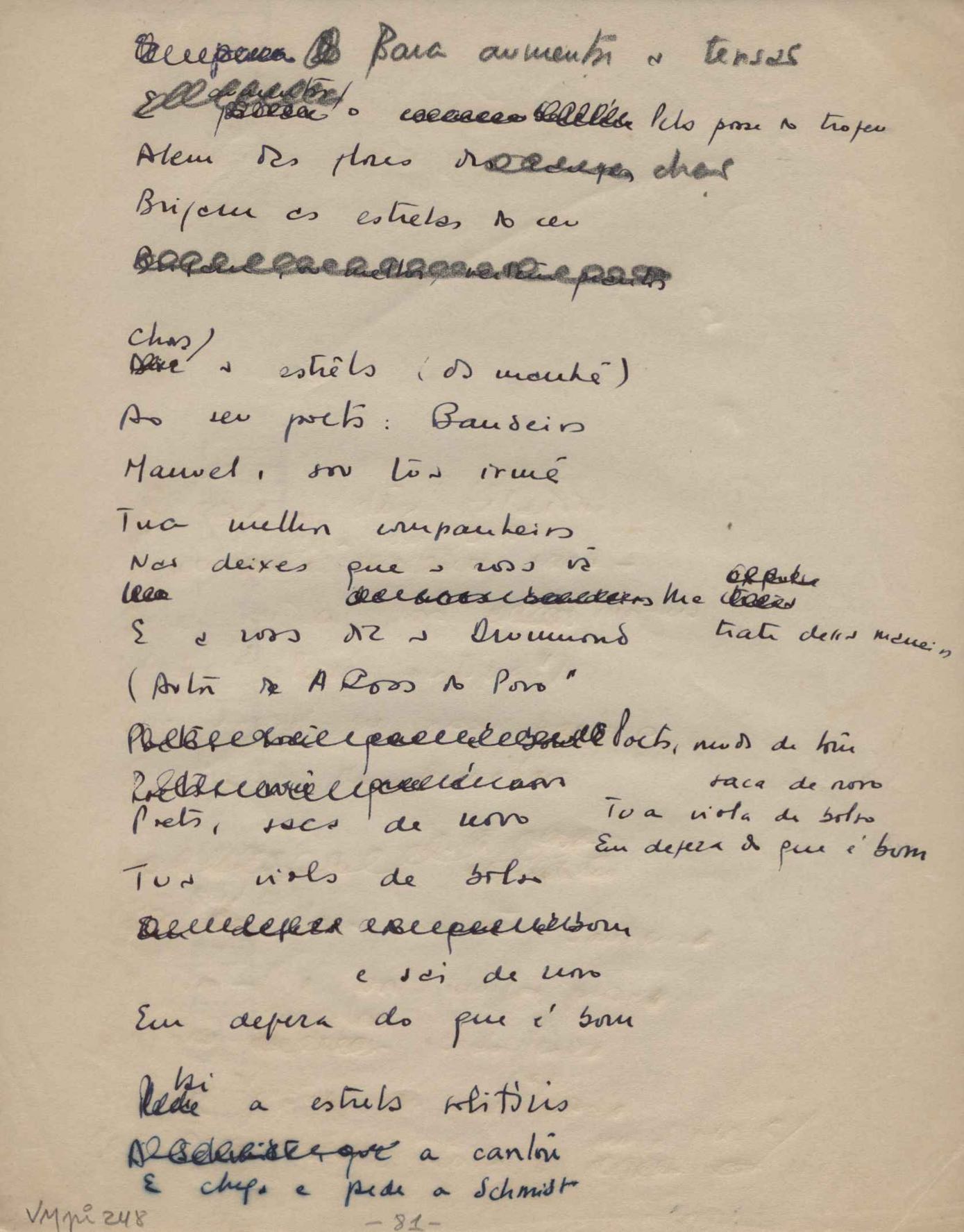 Este documento faz parte do dossiê VMPI248, "Poemas esparsos", que contempla poemas datados entre 21 ago. 1927 e 8 dez. 1971. Destes poemas, 401 são esboços e não possuem título (cf. registro VM0PI248_1_232). Estes originais não podem ser tomados como obra inédita. Ideias, tentativas, escritos inacabados, abandonados ou aproveitados posteriormente com outra forma compõem o dossiê.