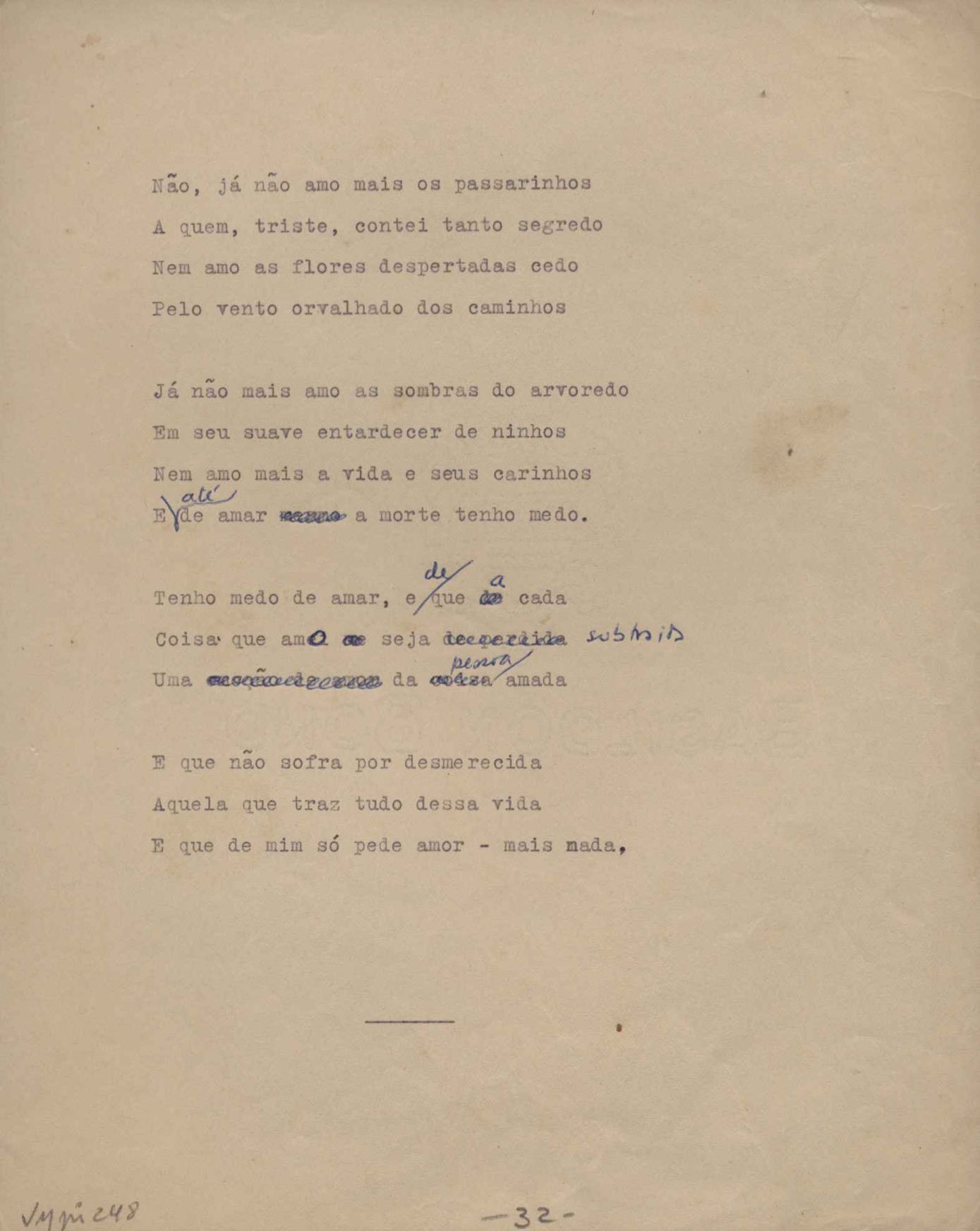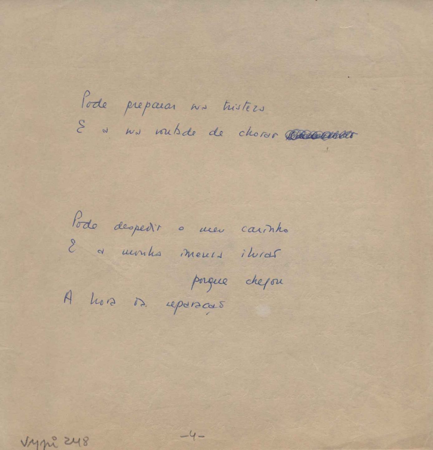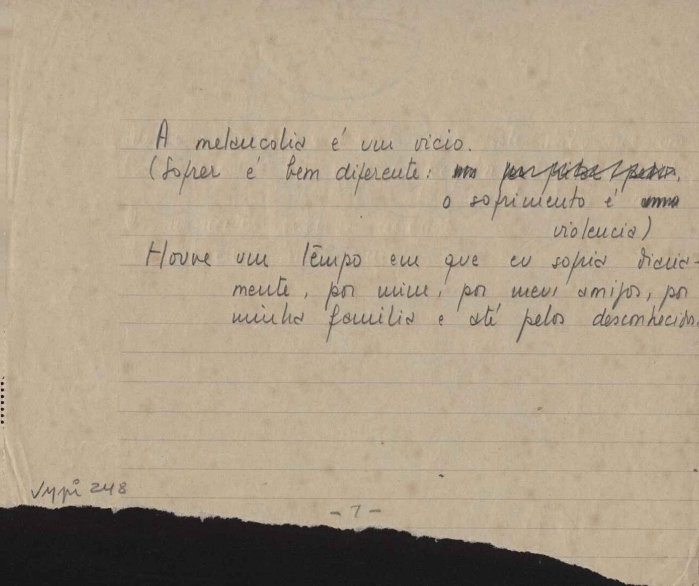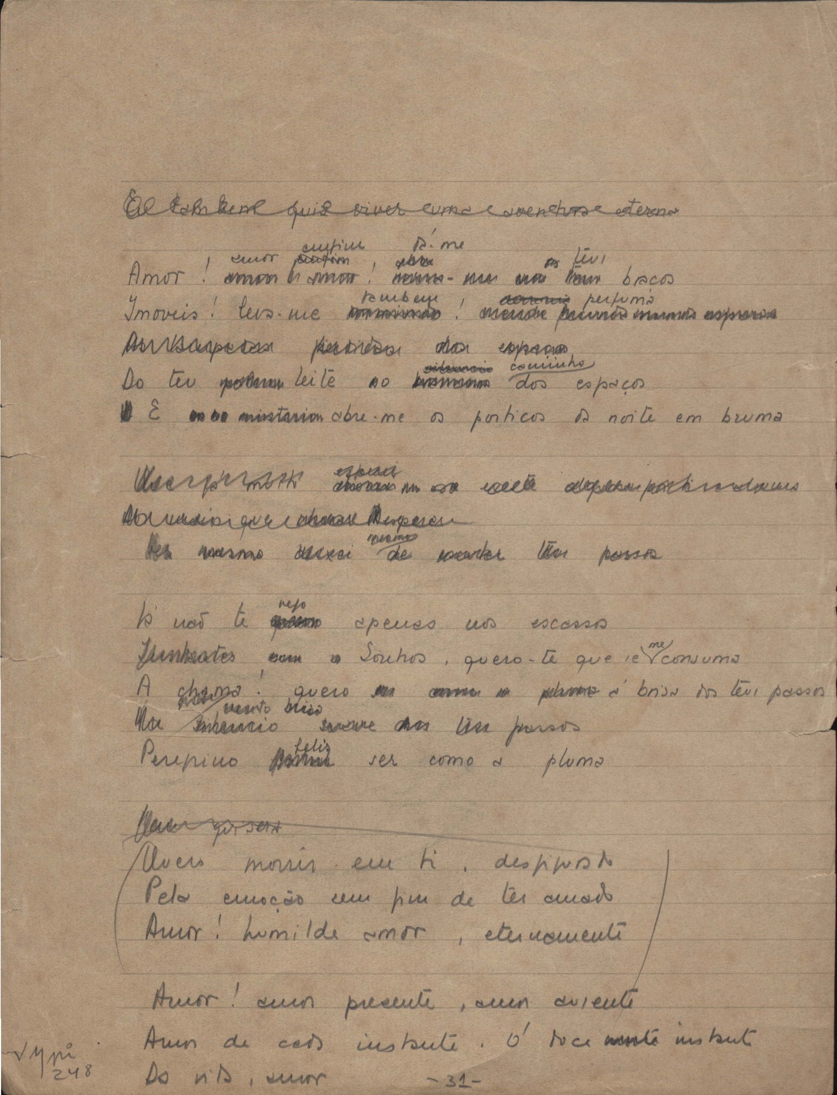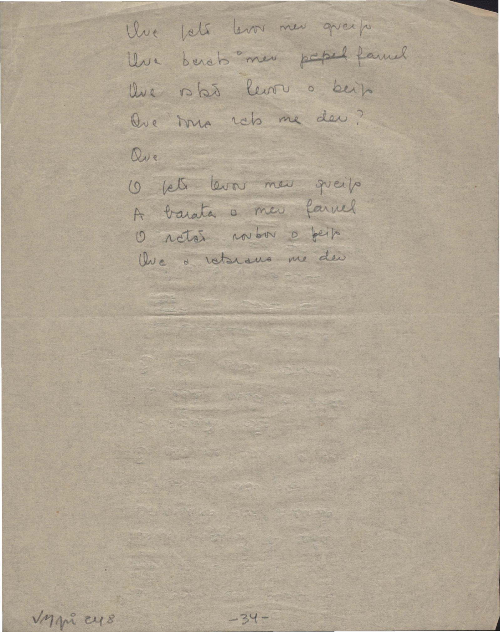 Este documento faz parte do dossiê VMPI248, "Poemas esparsos", que contempla poemas datados entre 21 ago. 1927 e 8 dez. 1971. Destes poemas, 401 são esboços e não possuem título (cf. registro VM0PI248_1_232). Estes originais não podem ser tomados como obra inédita. Ideias, tentativas, escritos inacabados, abandonados ou aproveitados posteriormente com outra forma compõem o dossiê.