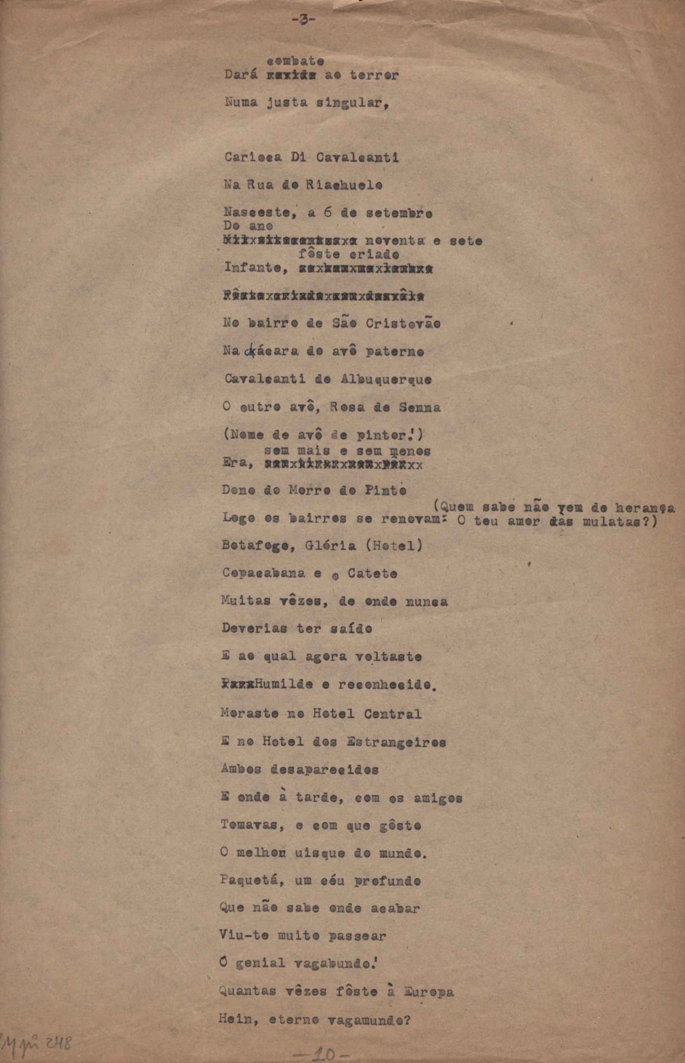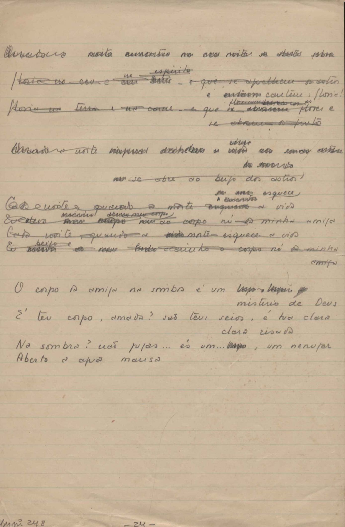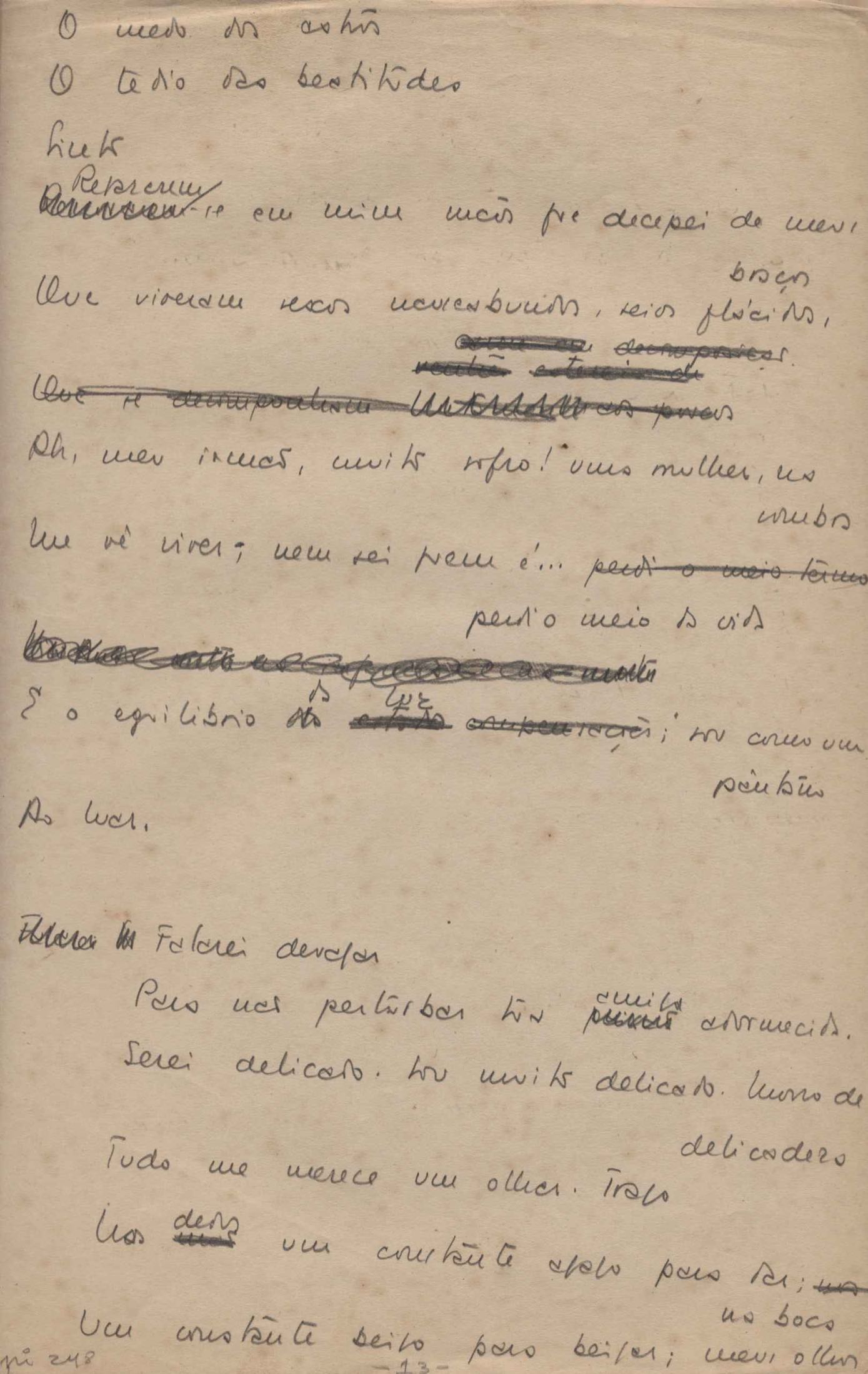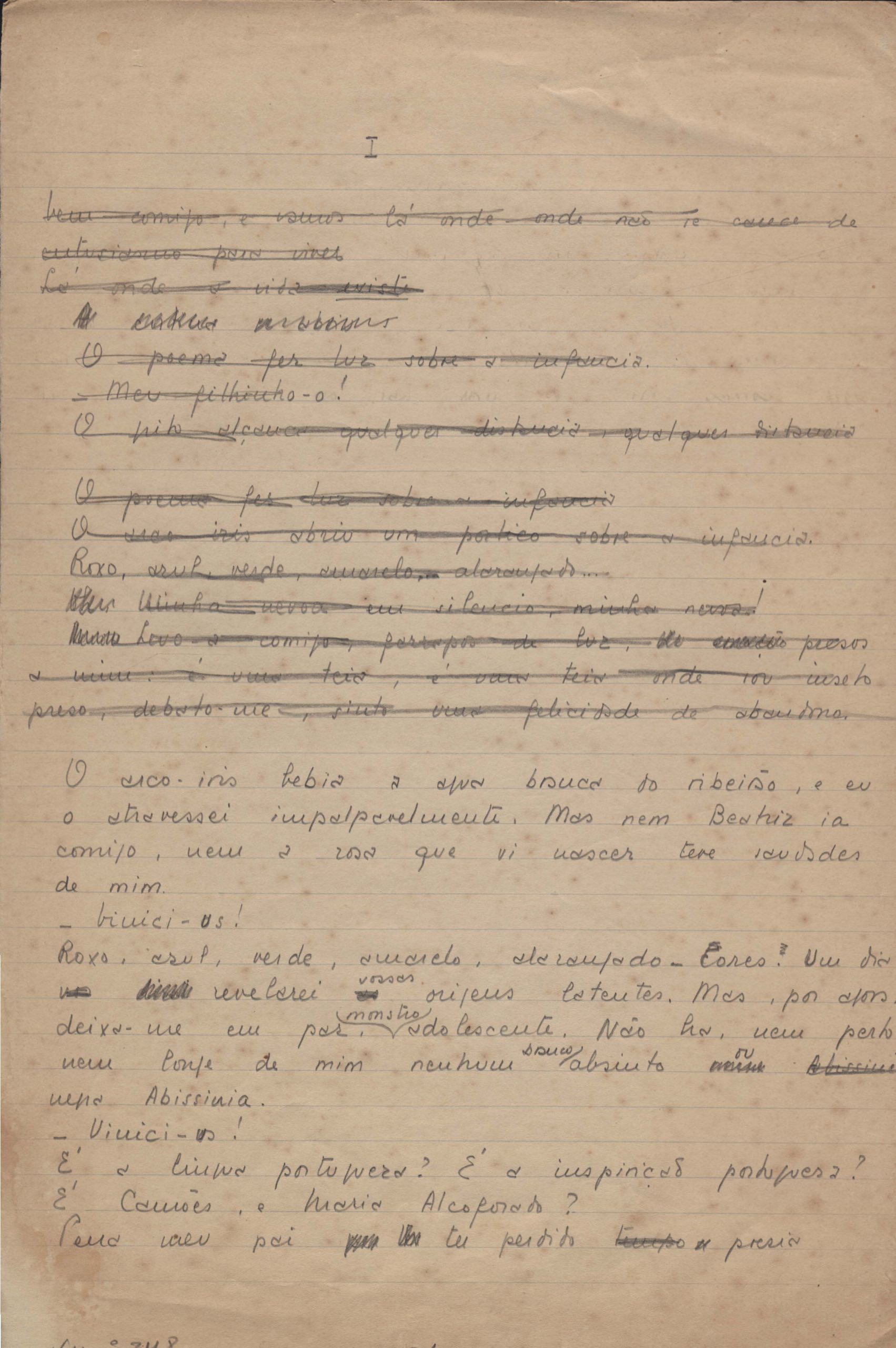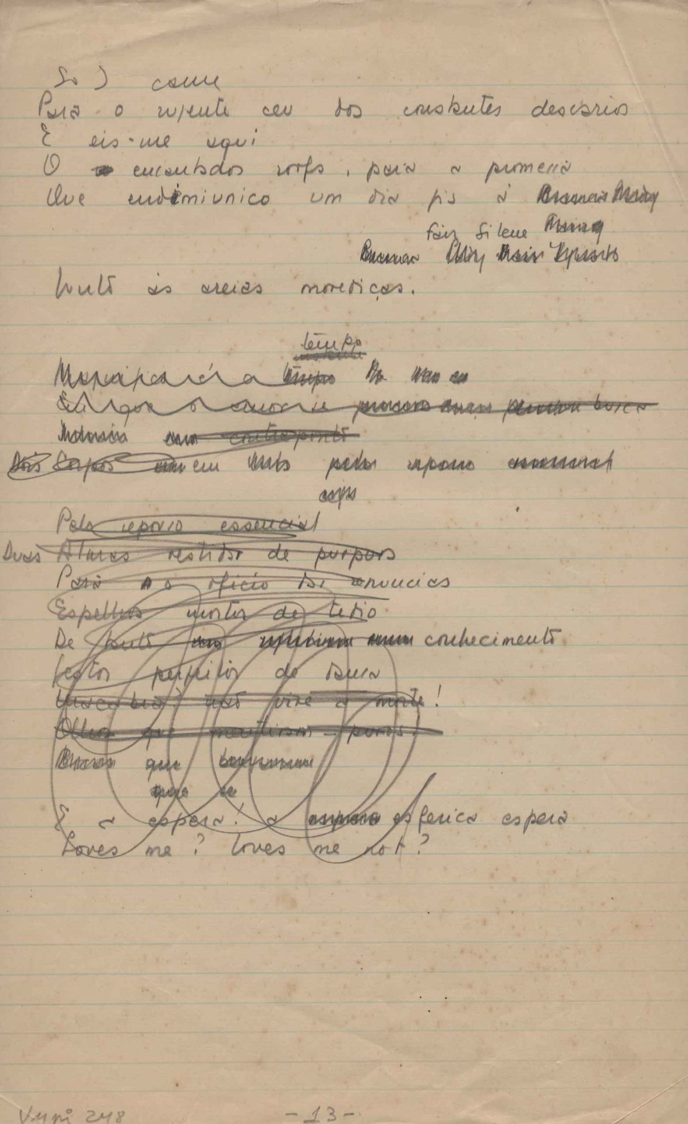Este documento faz parte do dossiê VMPI248, "Poemas esparsos", que contempla poemas datados entre 21 ago. 1927 e 8 dez. 1971. Destes poemas, 401 são esboços e não possuem título (cf. registro VM0PI248_1_232). Estes originais não podem ser tomados como obra inédita. Ideias, tentativas, escritos inacabados, abandonados ou aproveitados posteriormente com outra forma compõem o dossiê.