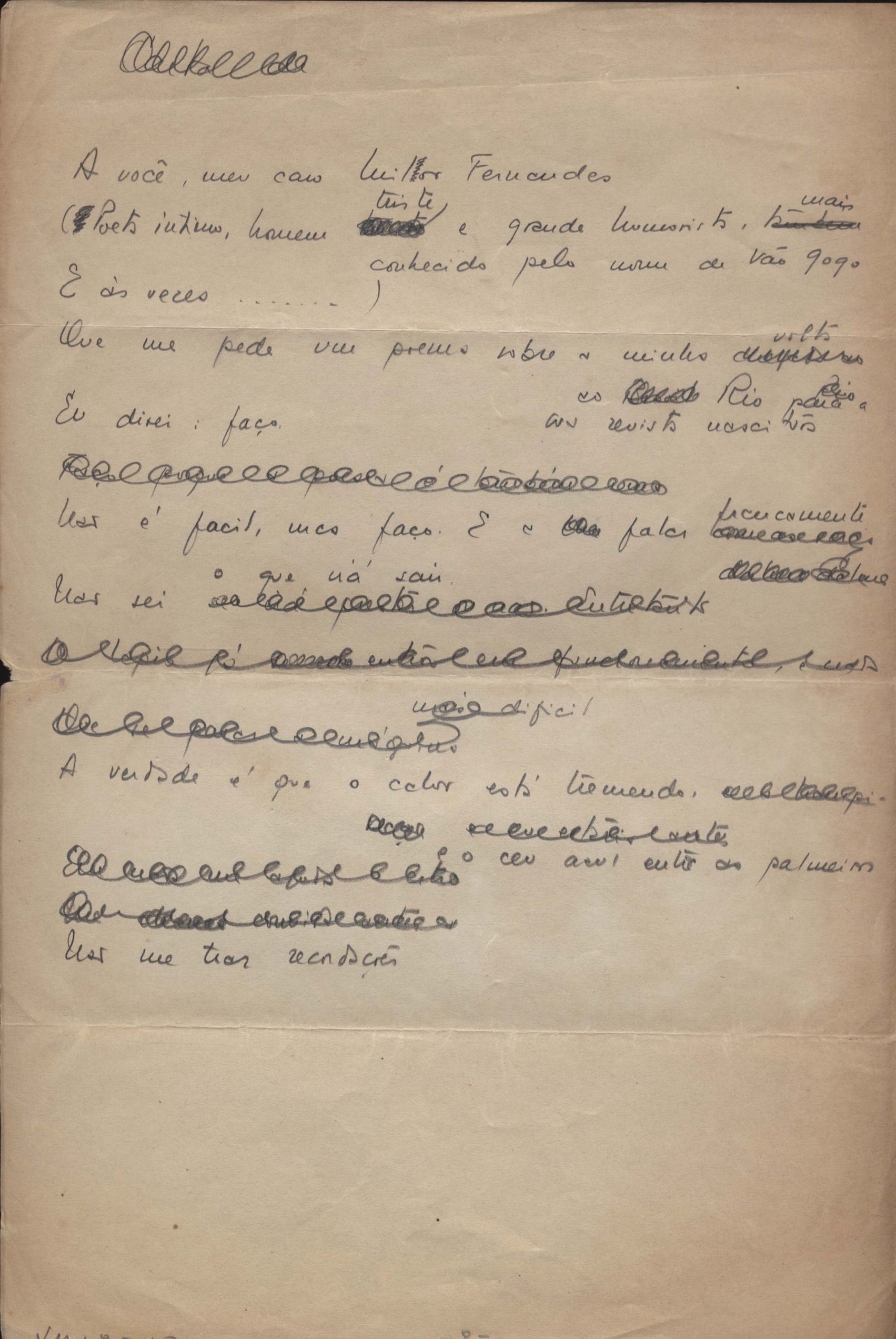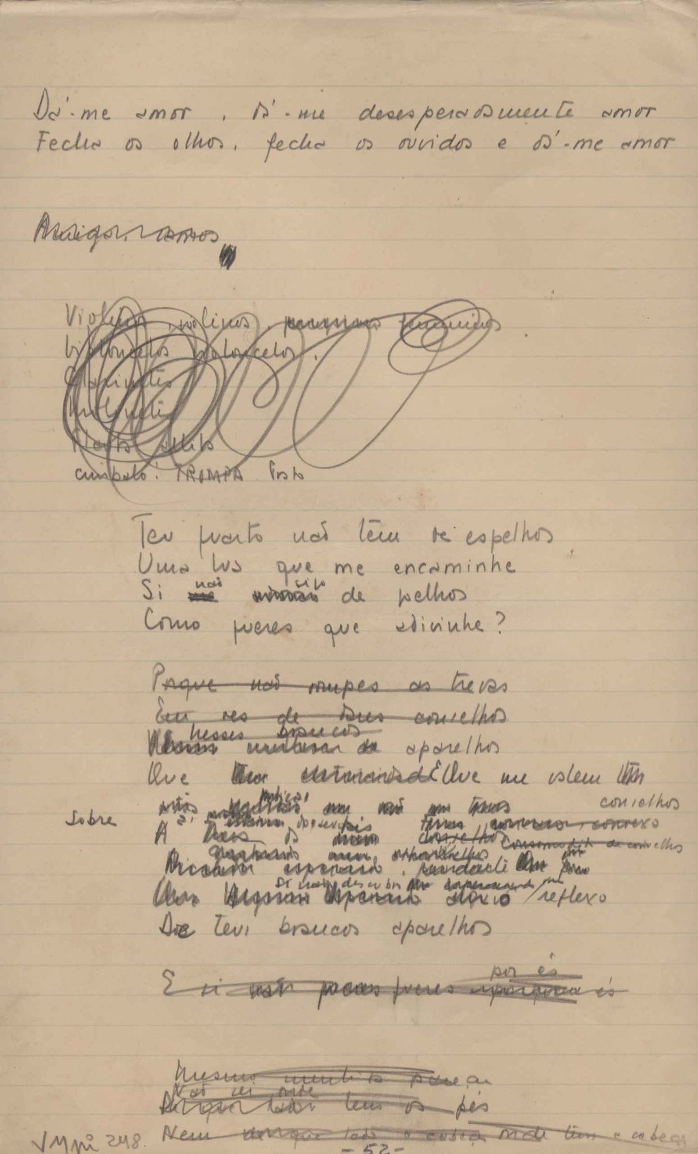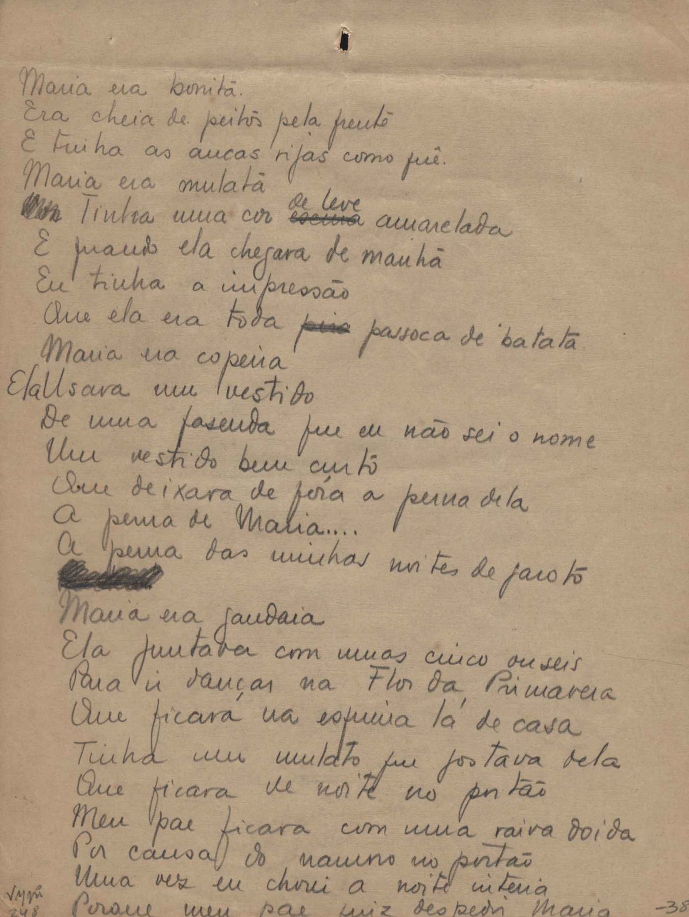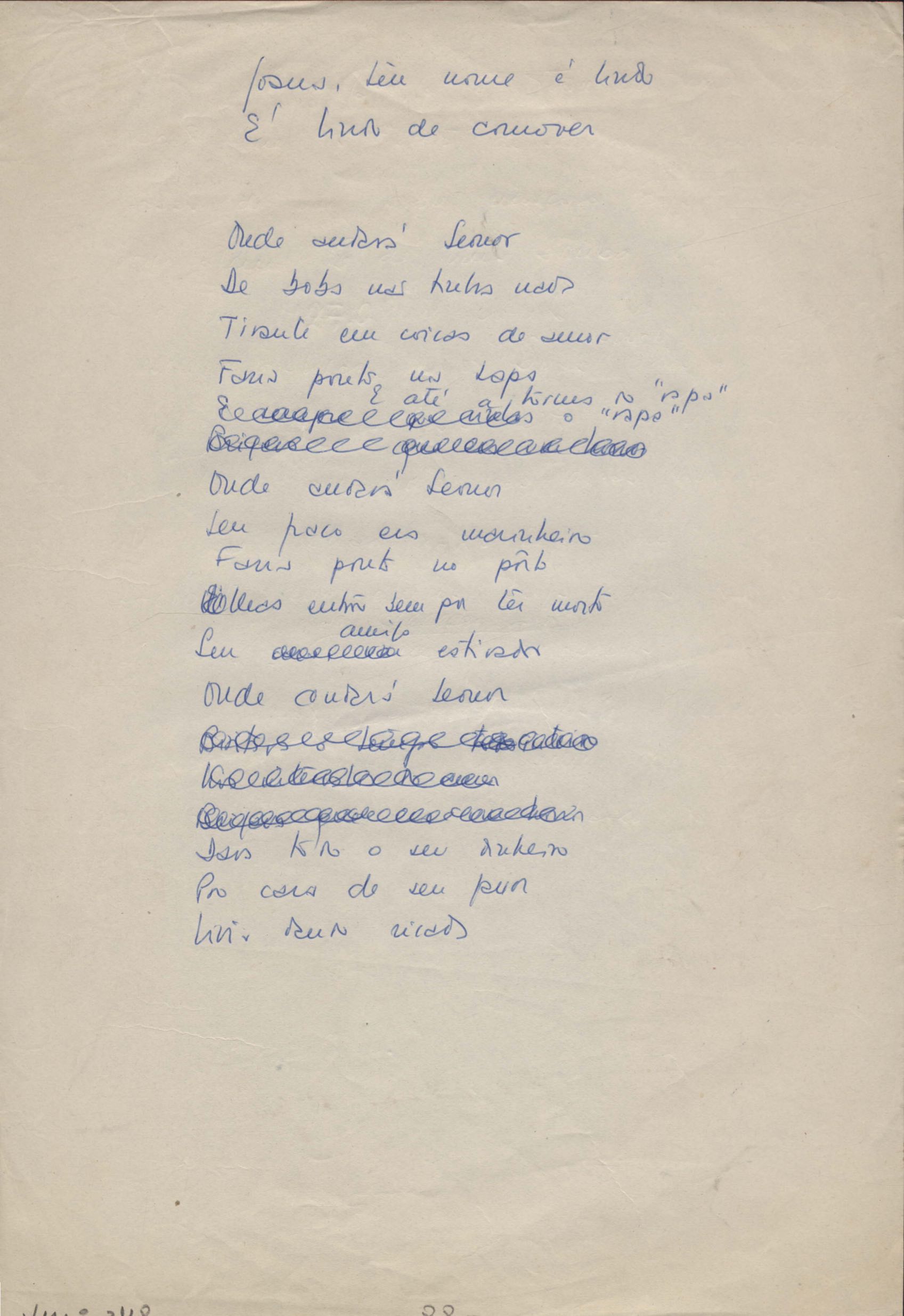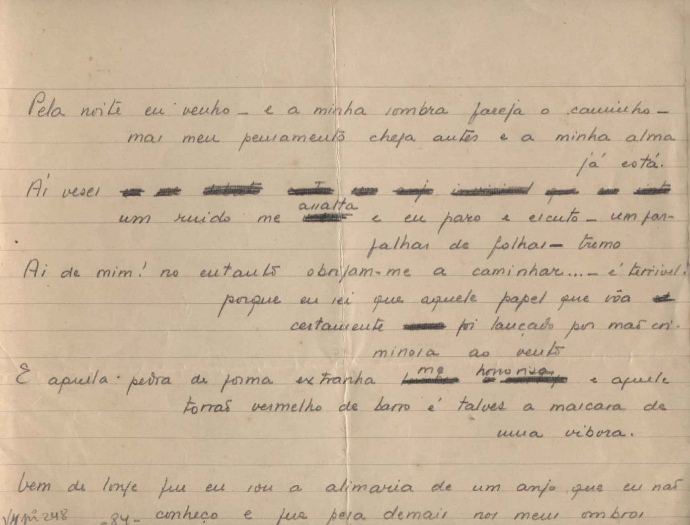 Este documento faz parte do dossiê VMPI248, "Poemas esparsos", que contempla poemas datados entre 21 ago. 1927 e 8 dez. 1971. Destes poemas, 401 são esboços e não possuem título (cf. registro VM0PI248_1_232). Estes originais não podem ser tomados como obra inédita. Ideias, tentativas, escritos inacabados, abandonados ou aproveitados posteriormente com outra forma compõem o dossiê.