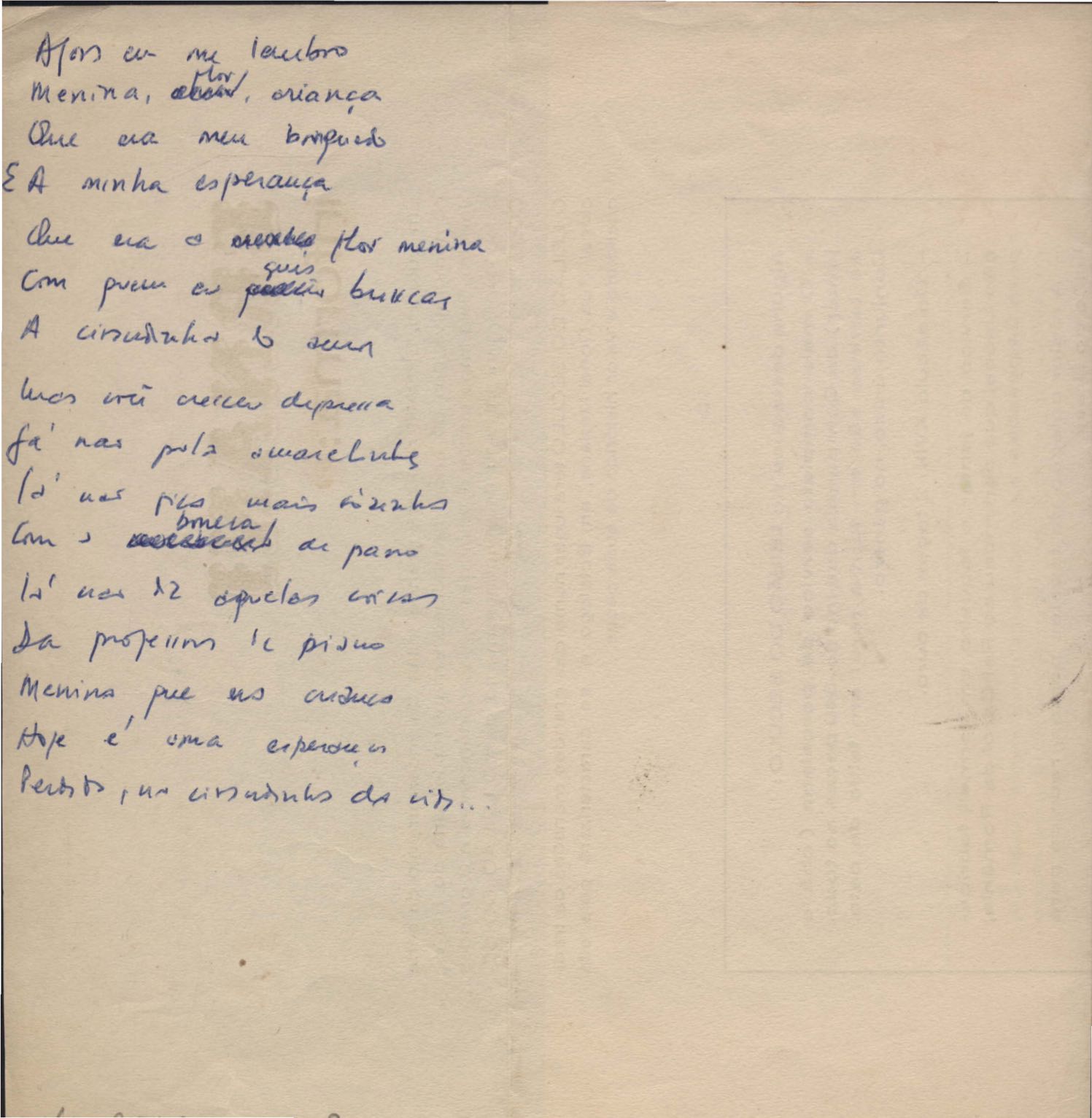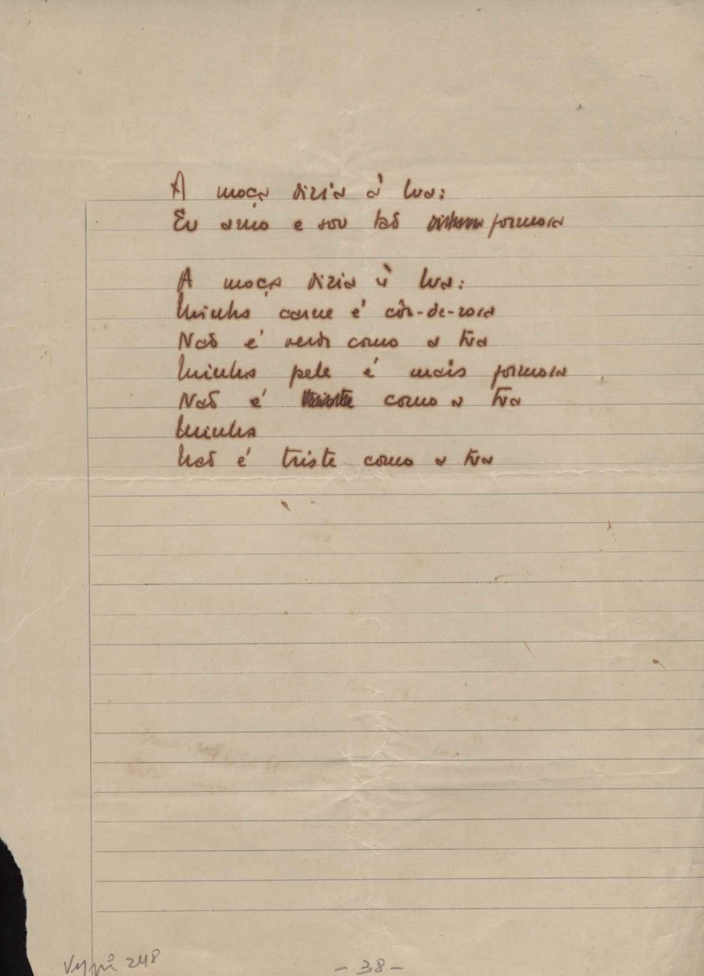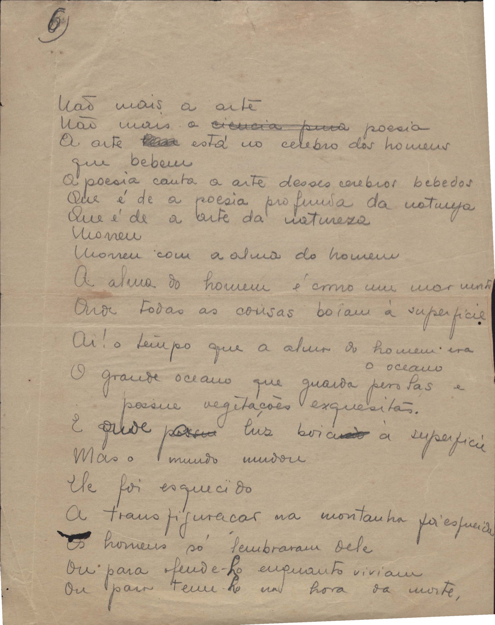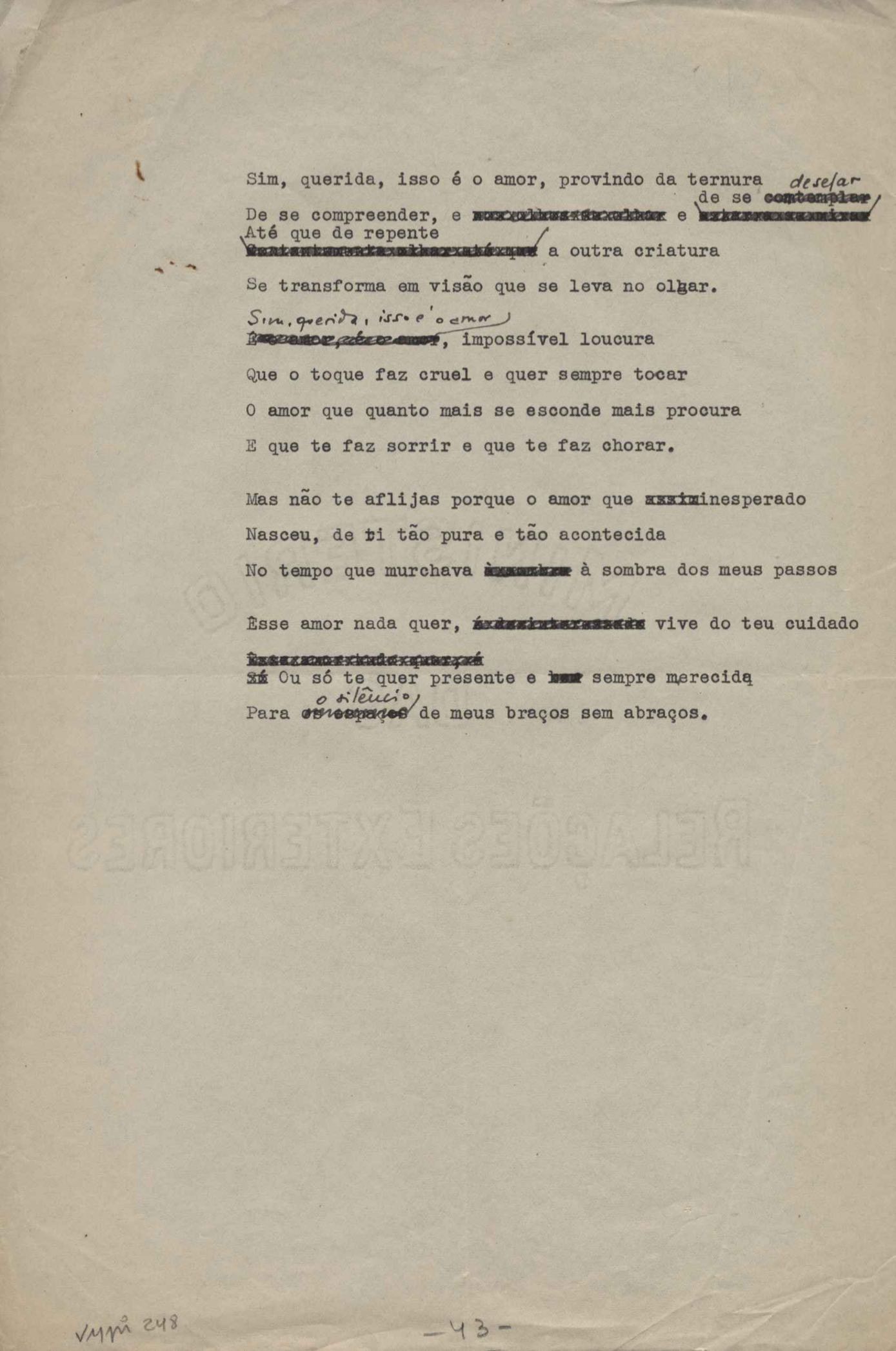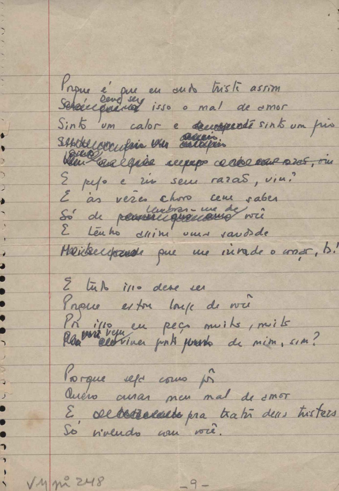 Este documento faz parte do dossiê VMPI248, "Poemas esparsos", que contempla poemas datados entre 21 ago. 1927 e 8 dez. 1971. Destes poemas, 401 são esboços e não possuem título (cf. registro VM0PI248_1_232). Estes originais não podem ser tomados como obra inédita. Ideias, tentativas, escritos inacabados, abandonados ou aproveitados posteriormente com outra forma compõem o dossiê.