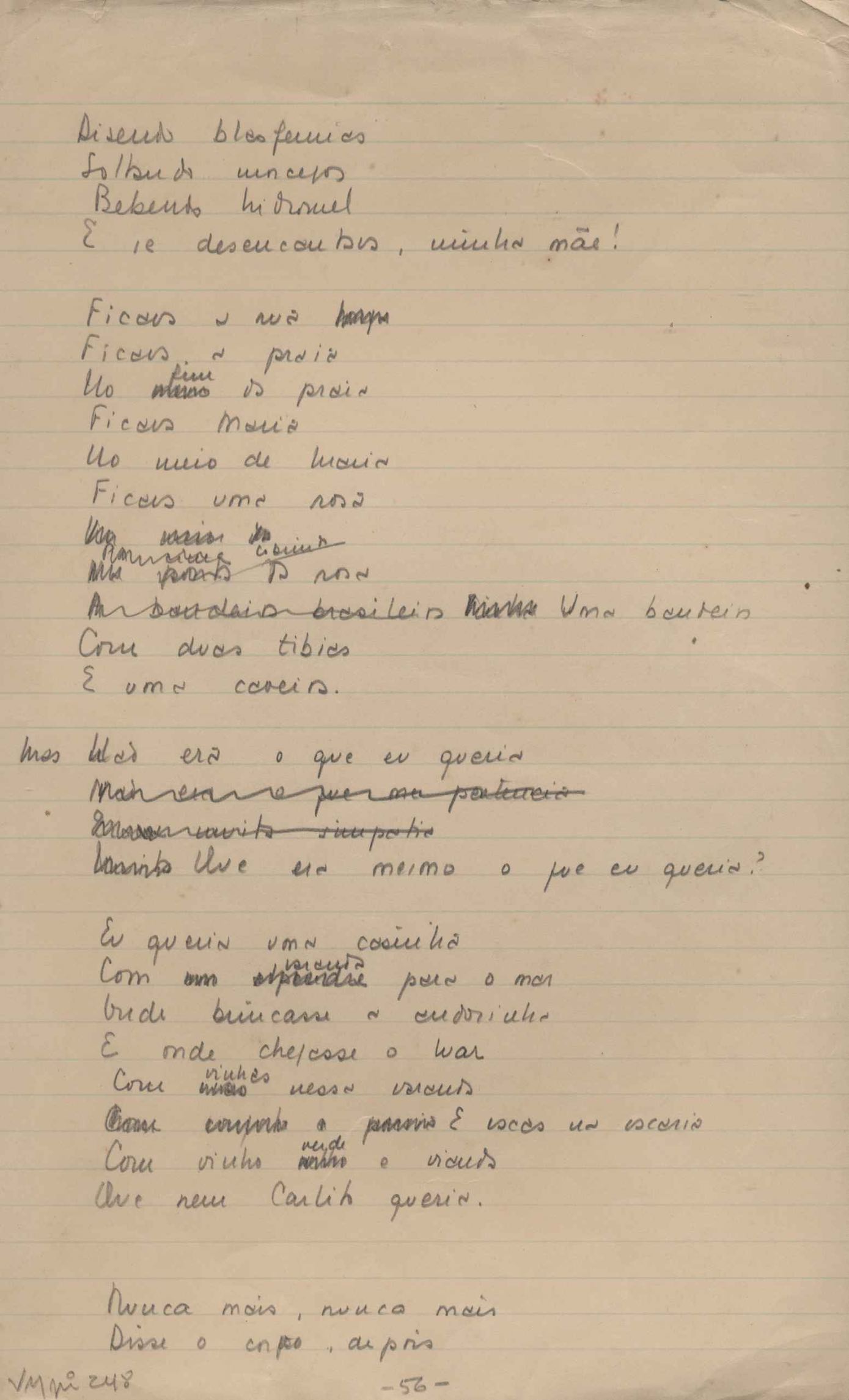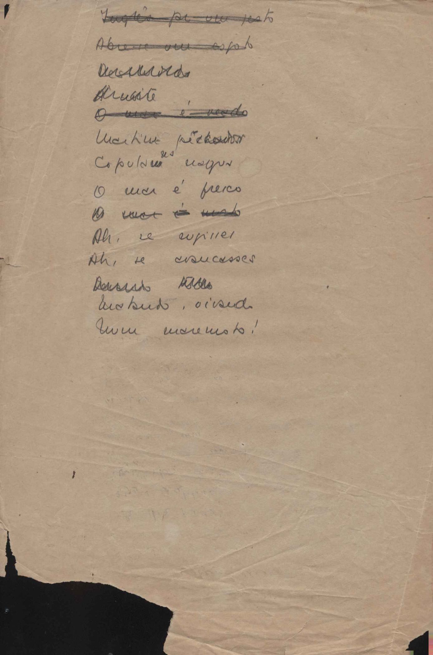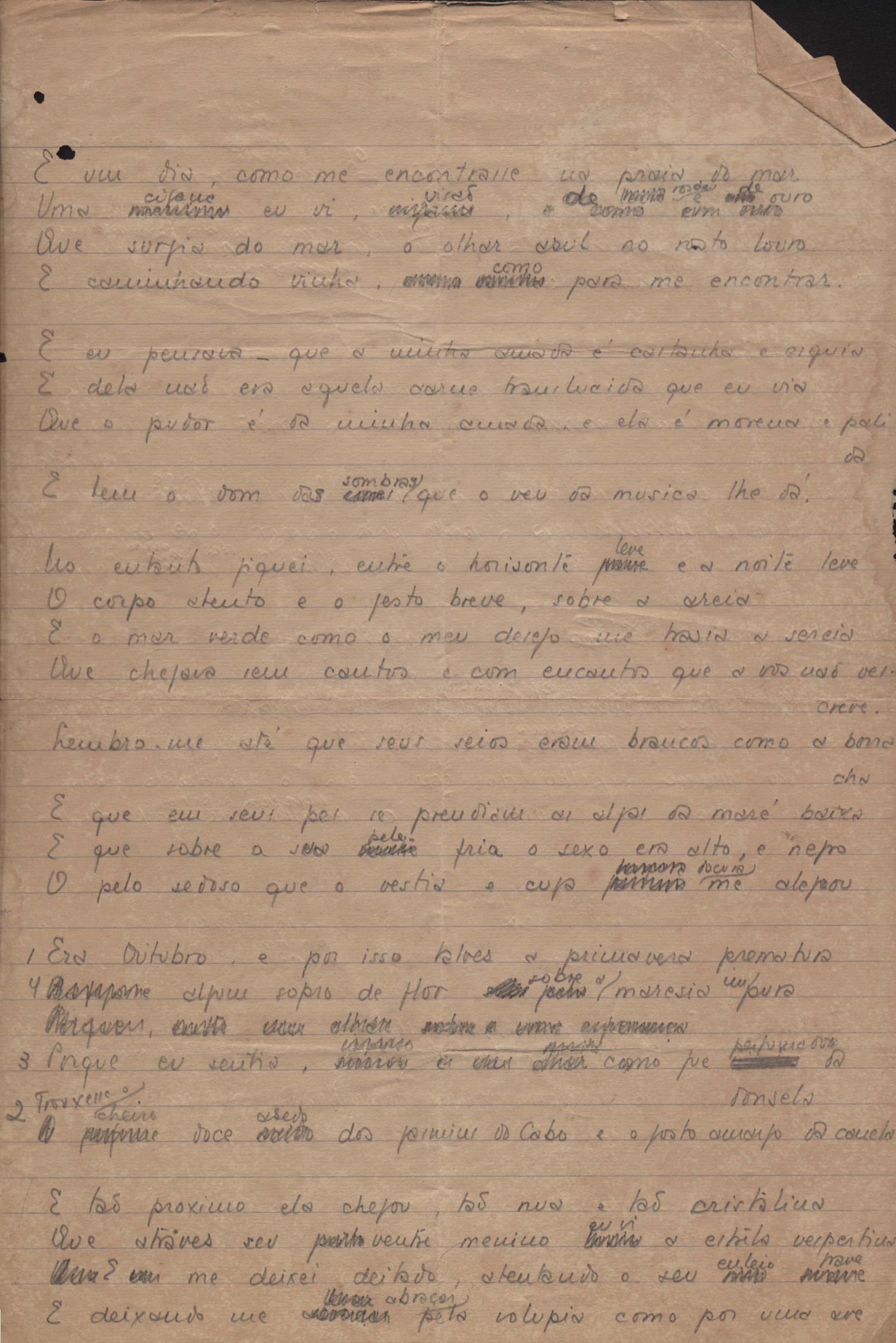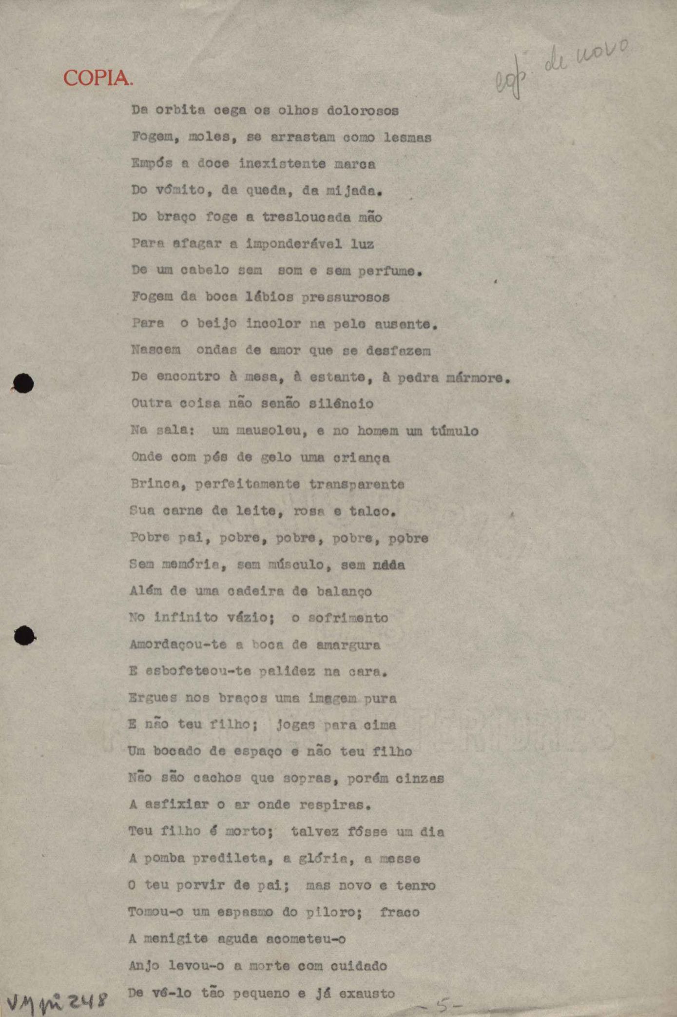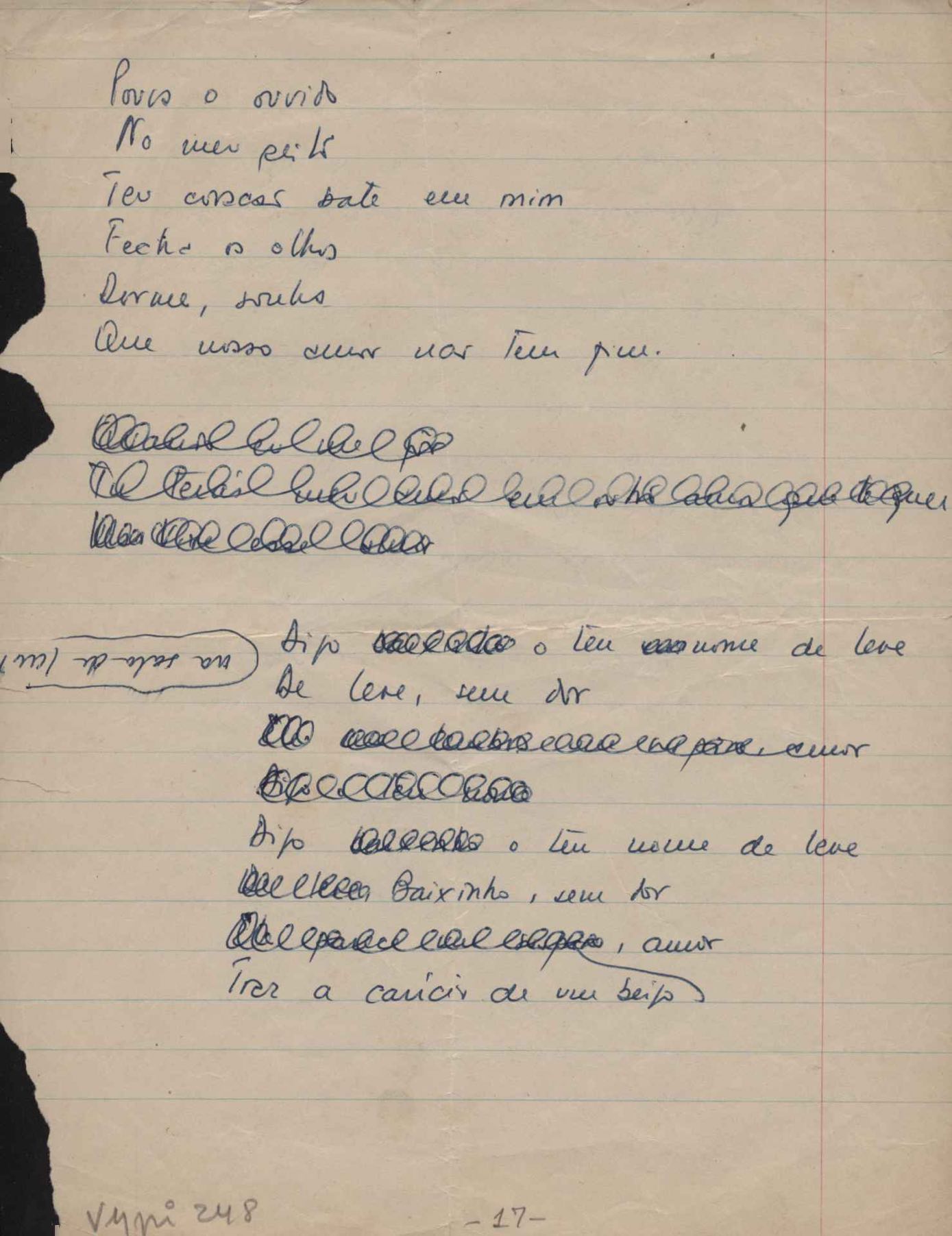 Este documento faz parte do dossiê VMPI248, "Poemas esparsos", que contempla poemas datados entre 21 ago. 1927 e 8 dez. 1971. Destes poemas, 401 são esboços e não possuem título (cf. registro VM0PI248_1_232). Estes originais não podem ser tomados como obra inédita. Ideias, tentativas, escritos inacabados, abandonados ou aproveitados posteriormente com outra forma compõem o dossiê.
