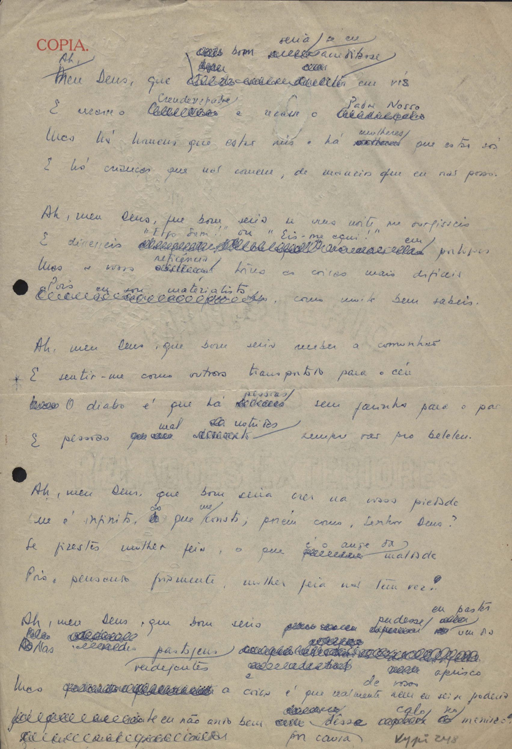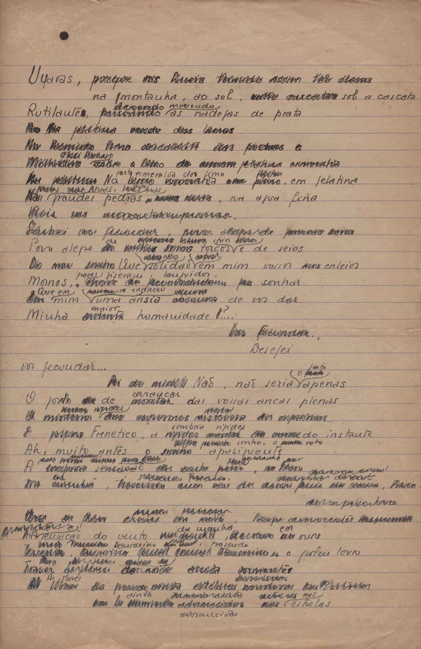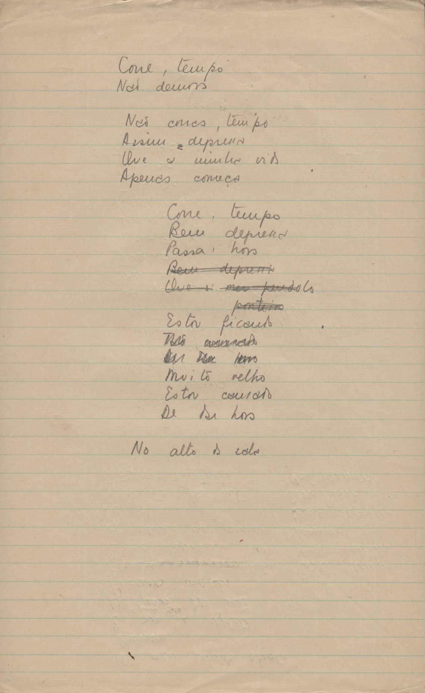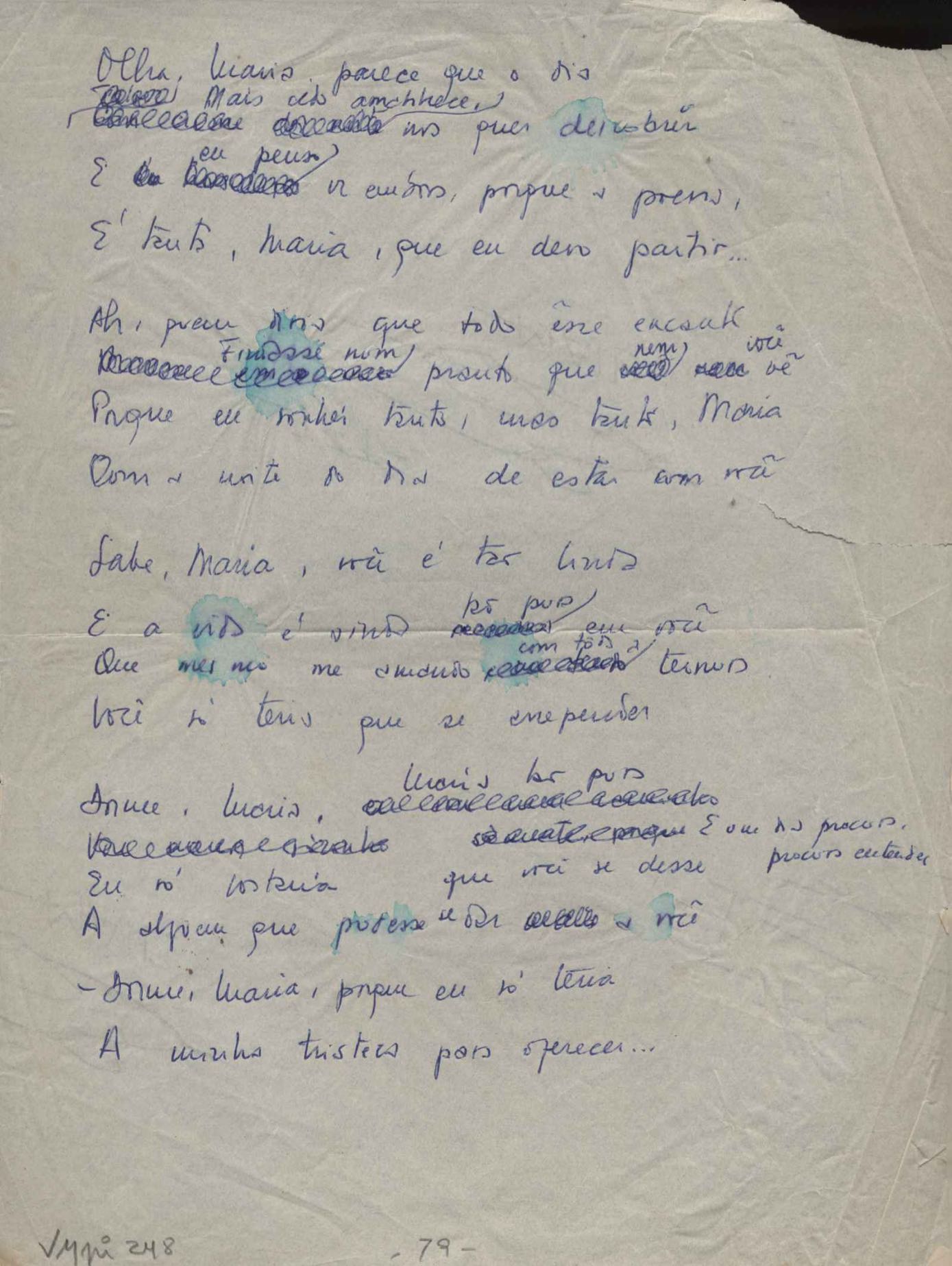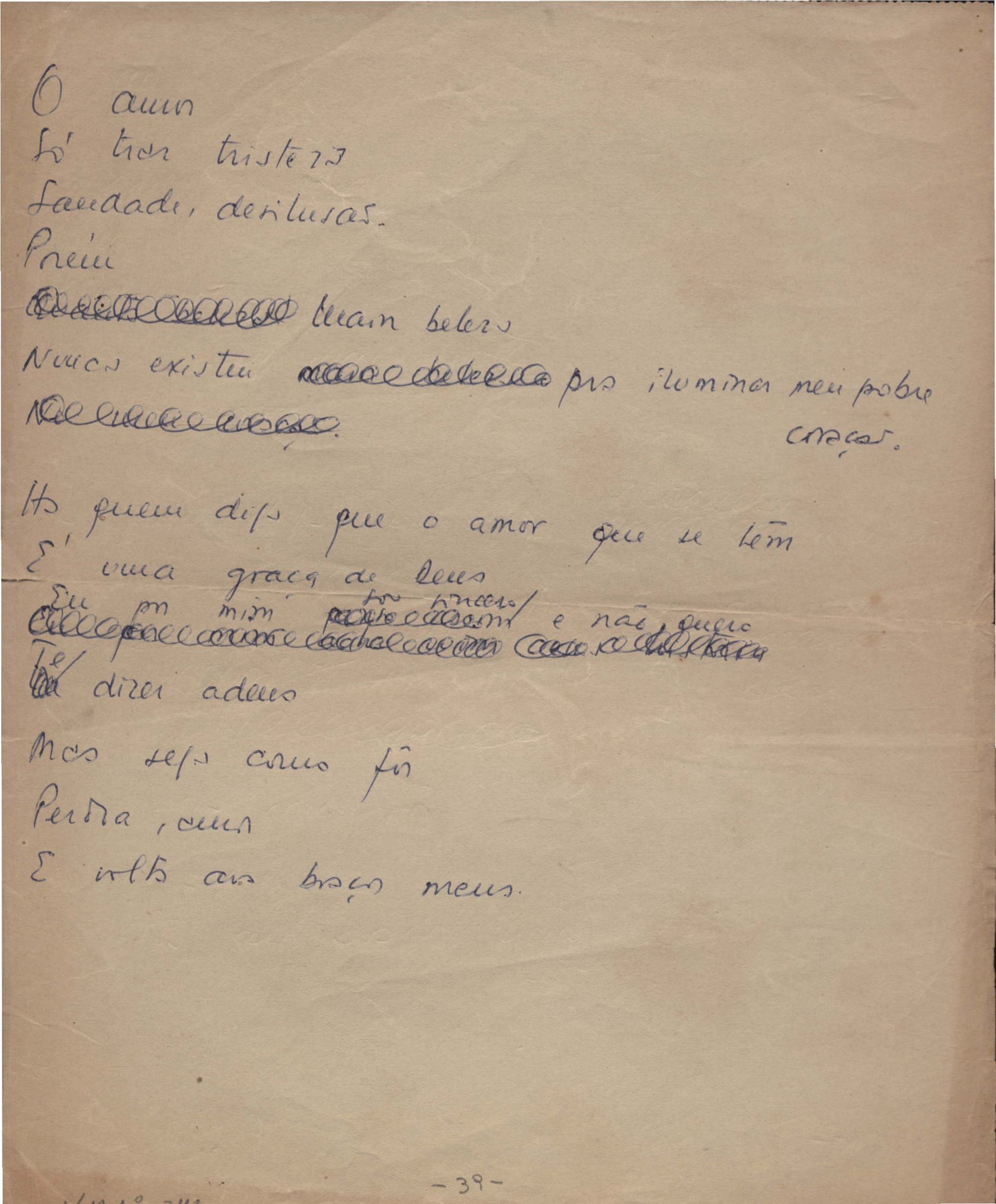 Este documento faz parte do dossiê VMPI248, "Poemas esparsos", que contempla poemas datados entre 21 ago. 1927 e 8 dez. 1971. Destes poemas, 401 são esboços e não possuem título (cf. registro VM0PI248_1_232). Estes originais não podem ser tomados como obra inédita. Ideias, tentativas, escritos inacabados, abandonados ou aproveitados posteriormente com outra forma compõem o dossiê.