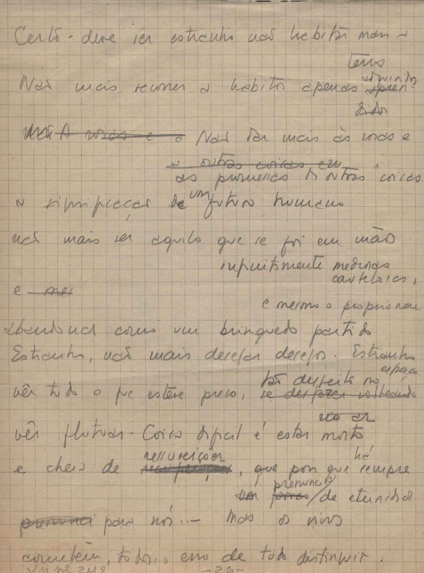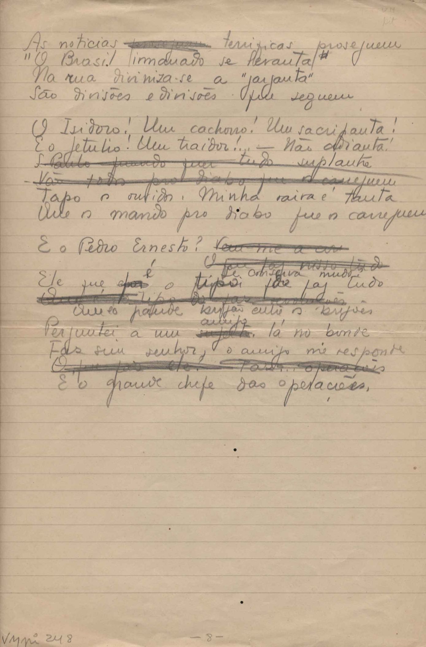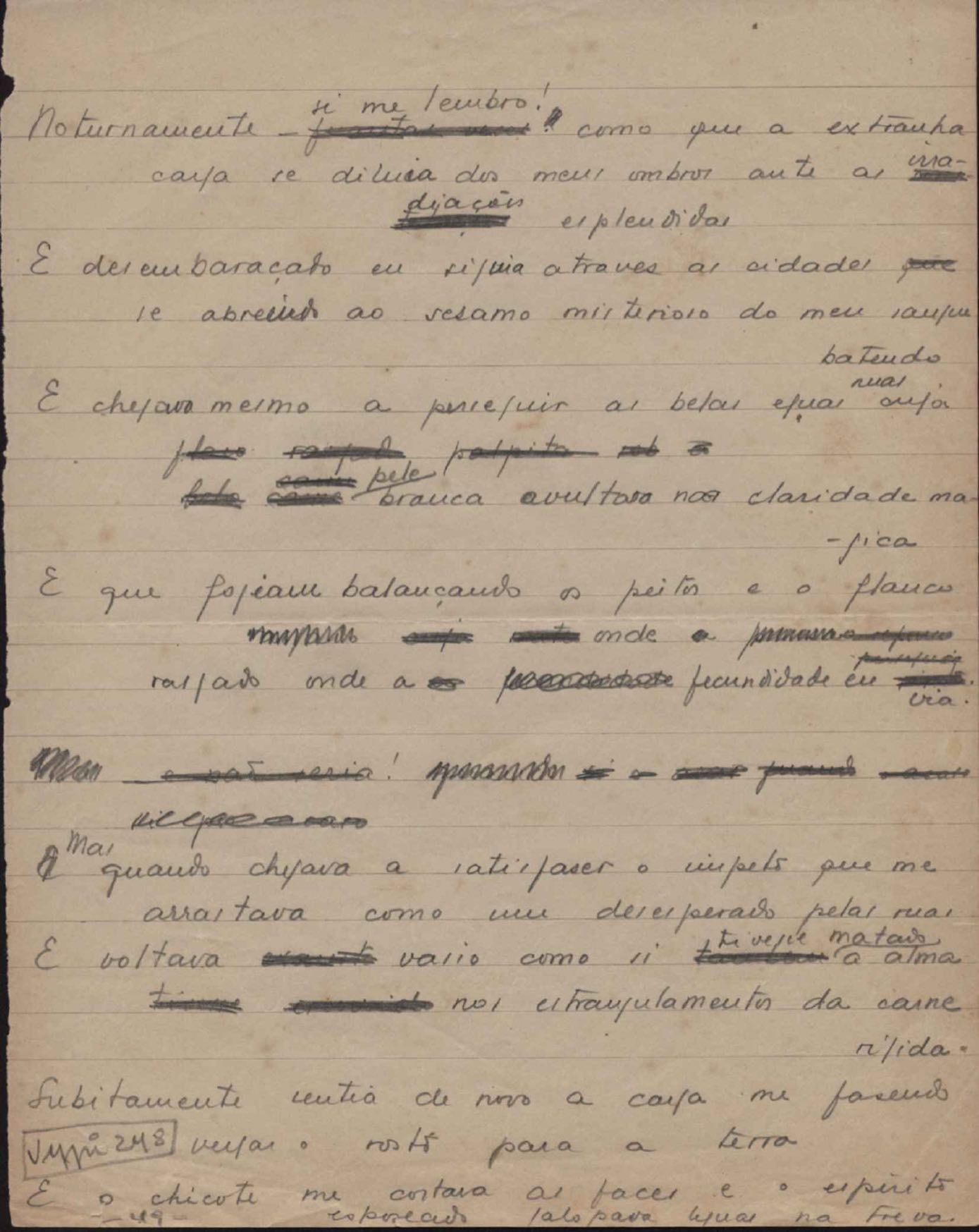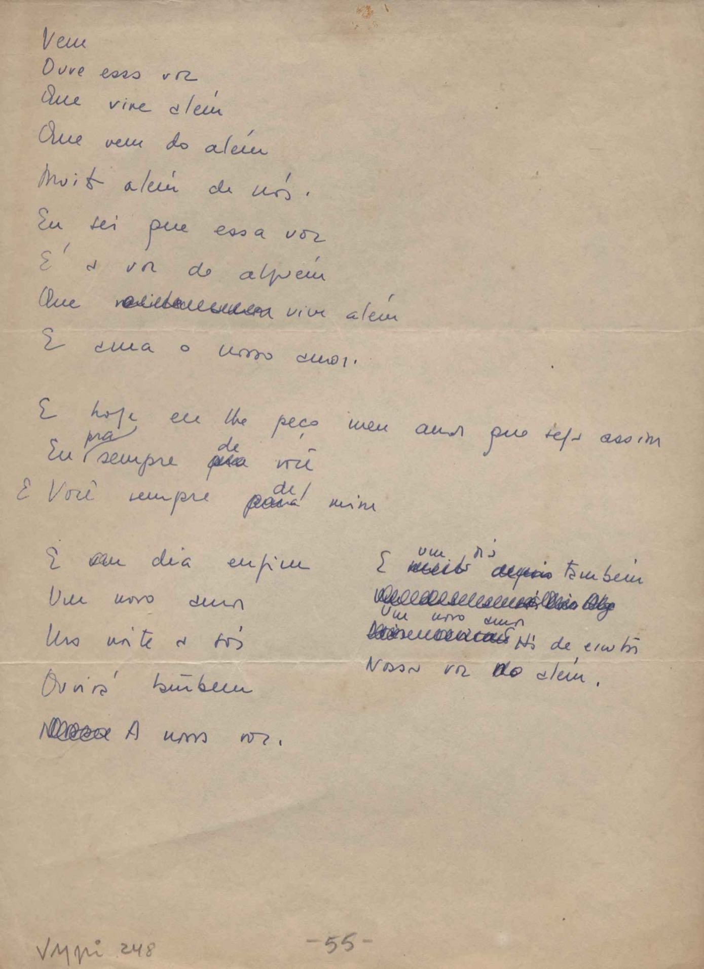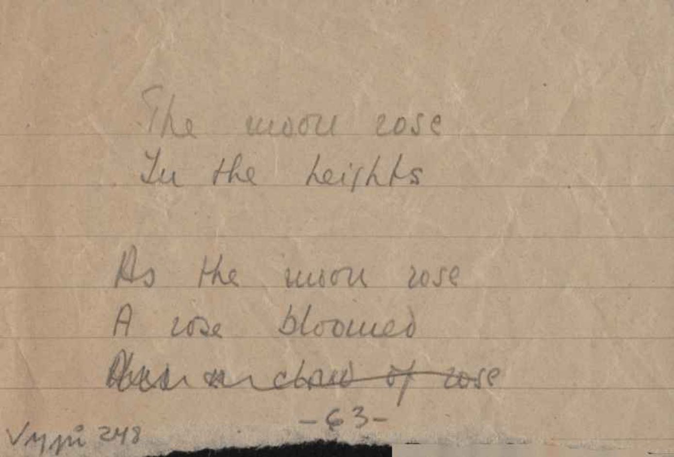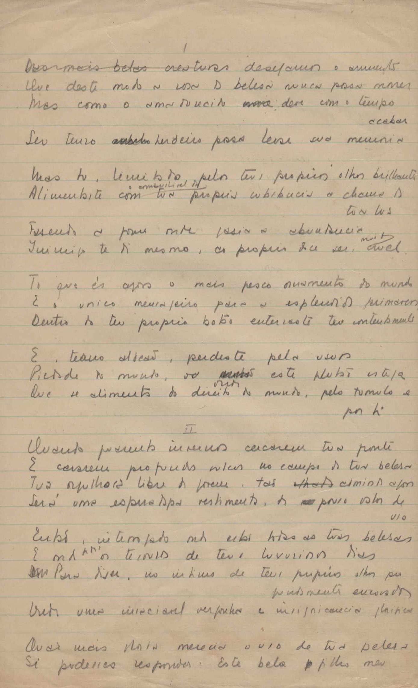 Este documento faz parte do dossiê VMPI248, "Poemas esparsos", que contempla poemas datados entre 21 ago. 1927 e 8 dez. 1971. Destes poemas, 401 são esboços e não possuem título (cf. registro VM0PI248_1_232). Estes originais não podem ser tomados como obra inédita. Ideias, tentativas, escritos inacabados, abandonados ou aproveitados posteriormente com outra forma compõem o dossiê.