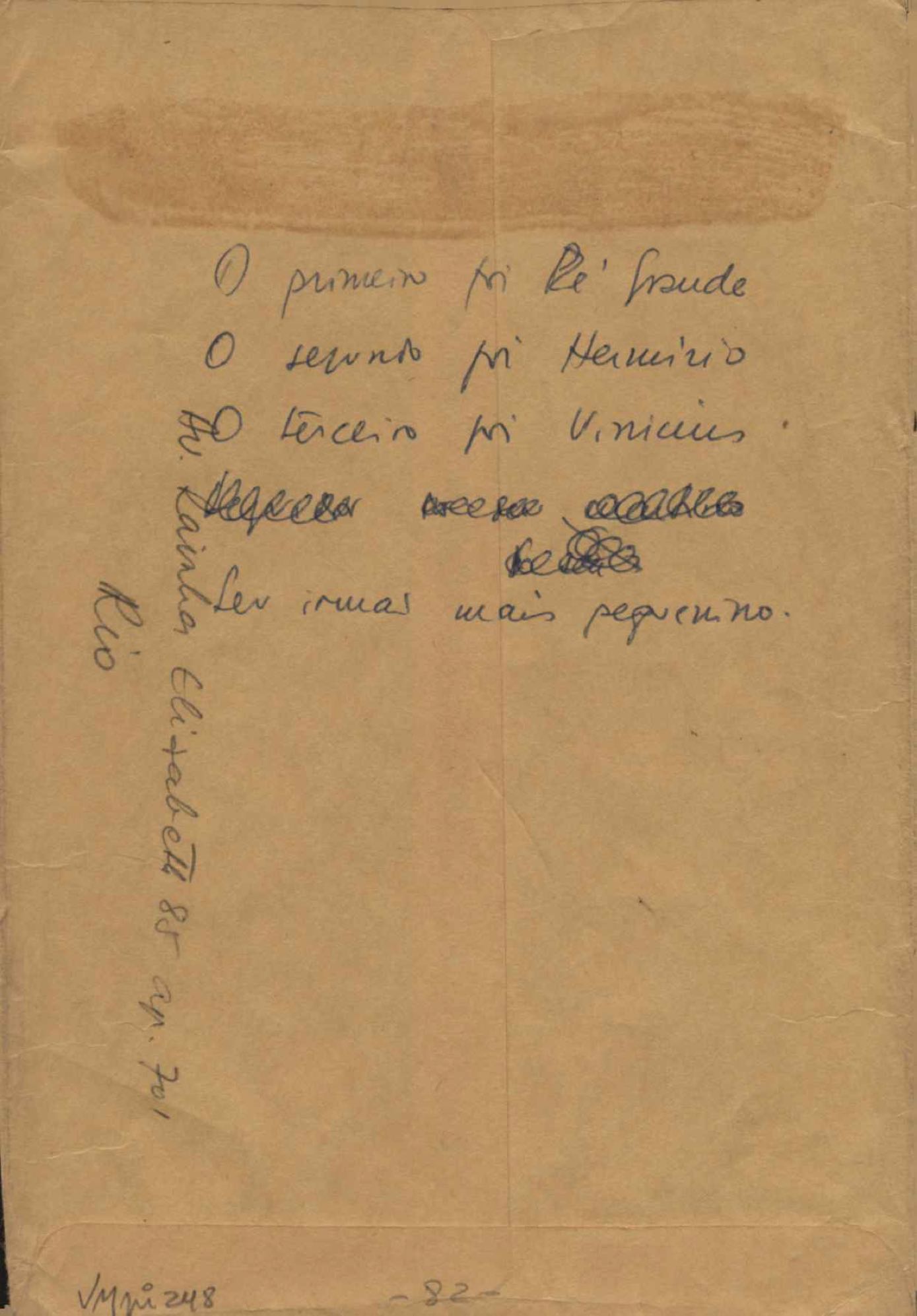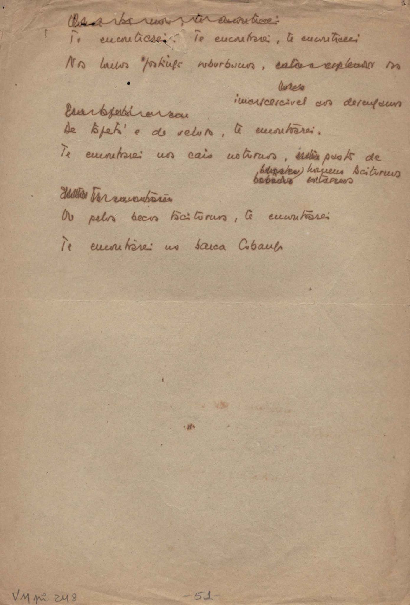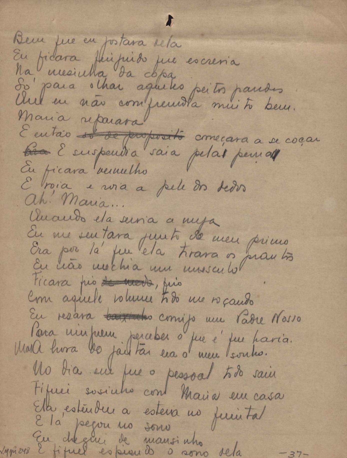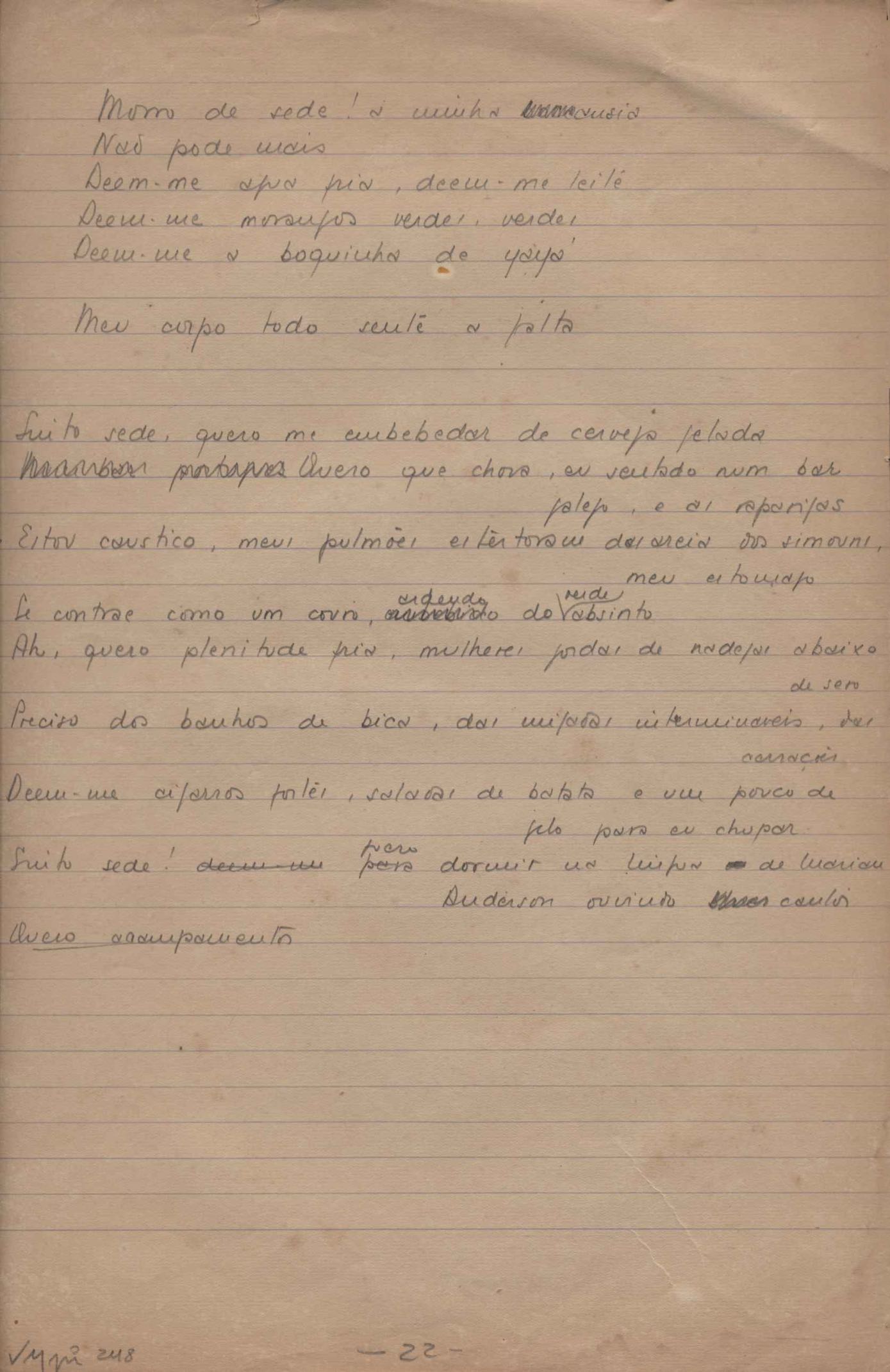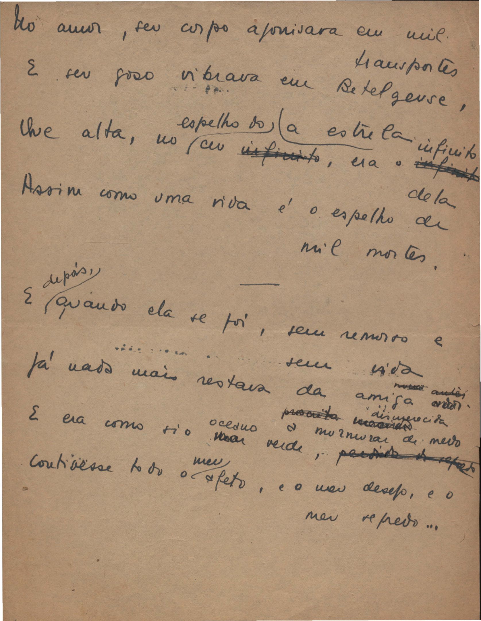 Este documento faz parte do dossiê VMPI248, "Poemas esparsos", que contempla poemas datados entre 21 ago. 1927 e 8 dez. 1971. Destes poemas, 401 são esboços e não possuem título (cf. registro VM0PI248_1_232). Estes originais não podem ser tomados como obra inédita. Ideias, tentativas, escritos inacabados, abandonados ou aproveitados posteriormente com outra forma compõem o dossiê.