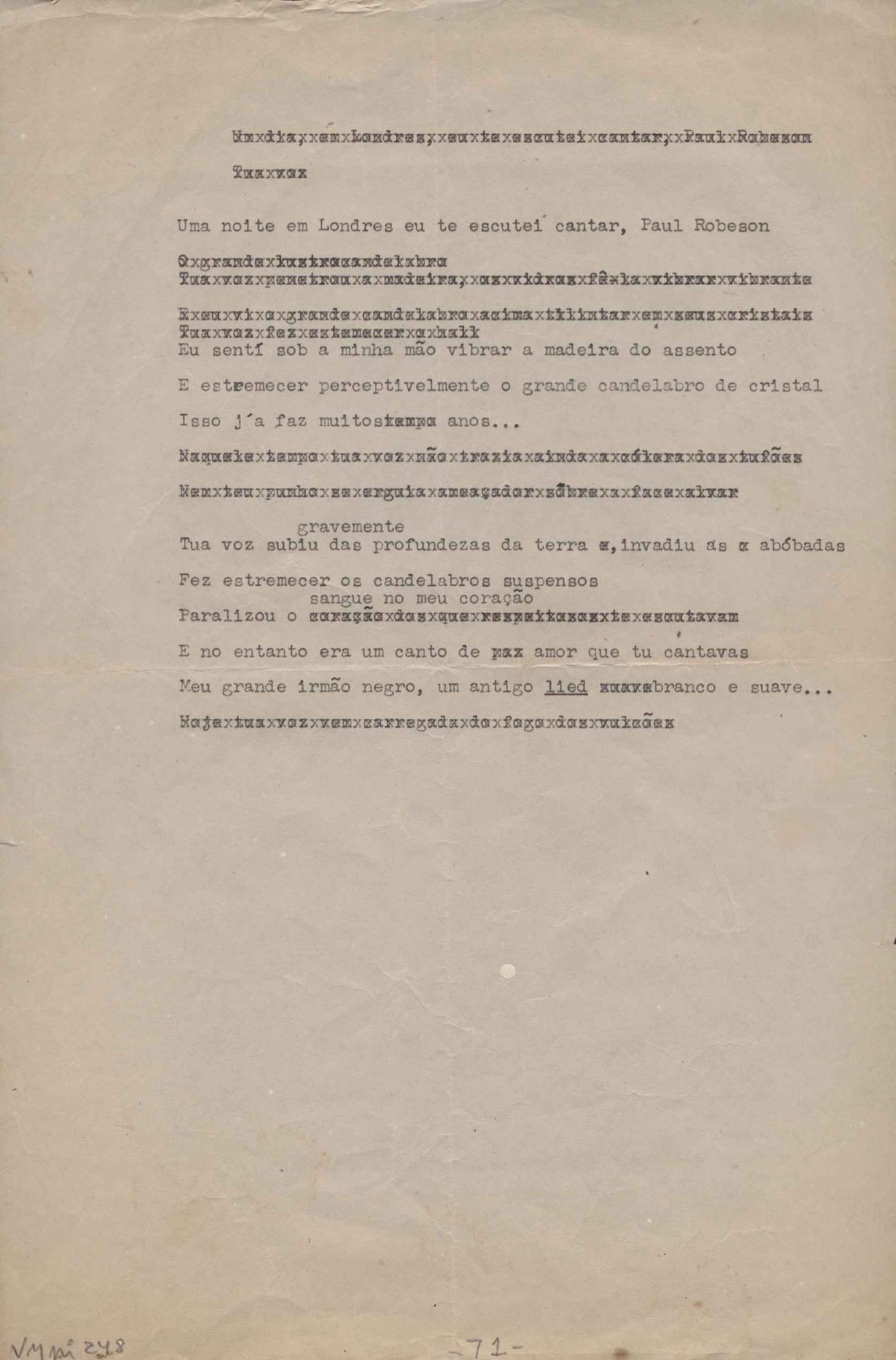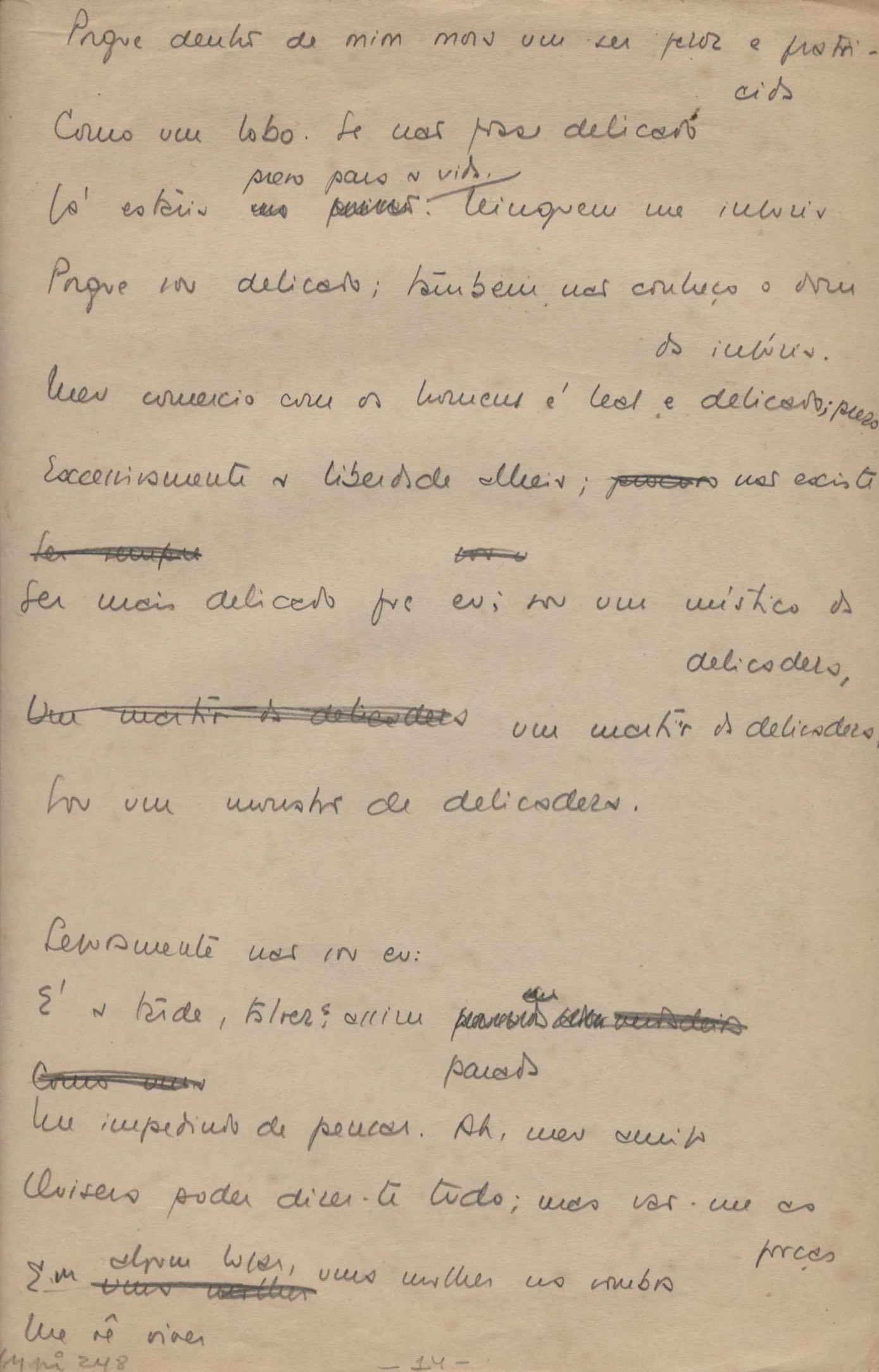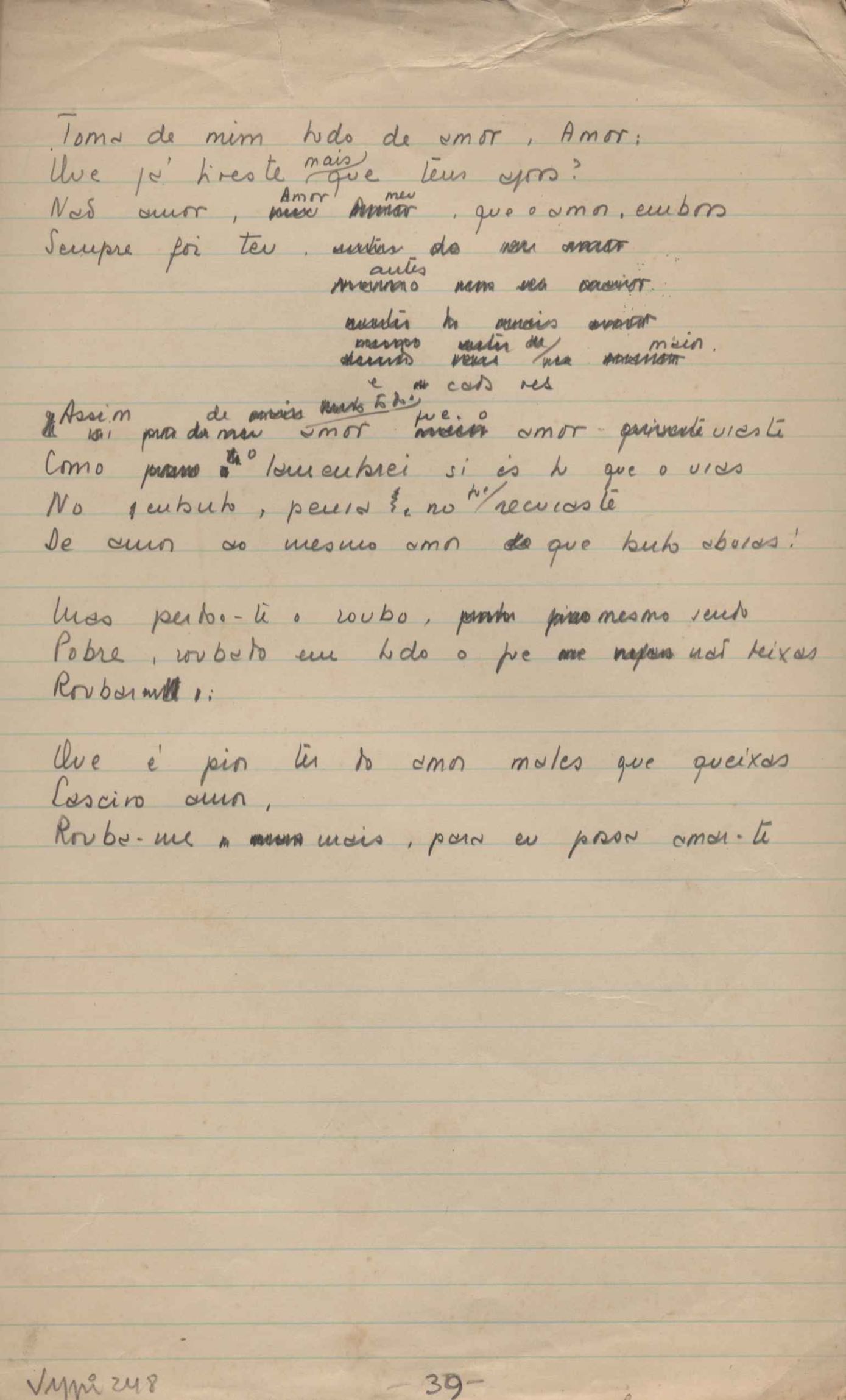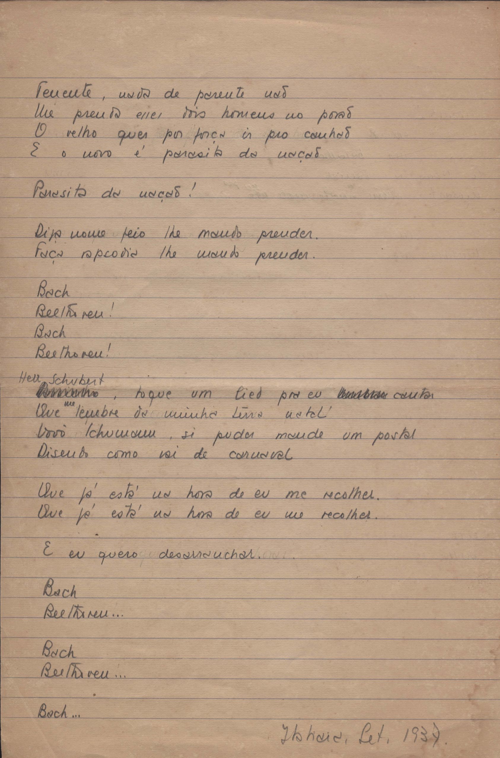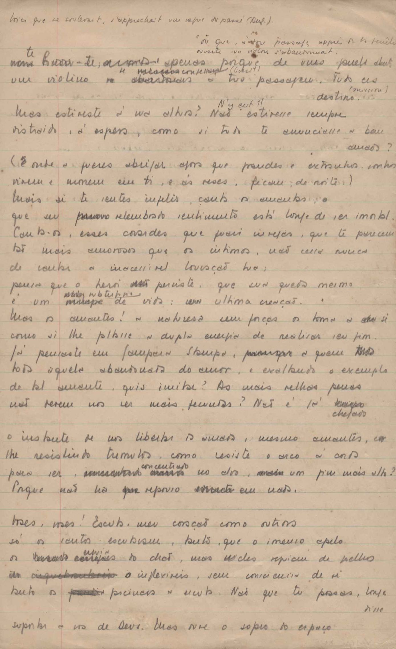 Este documento faz parte do dossiê VMPI248, "Poemas esparsos", que contempla poemas datados entre 21 ago. 1927 e 8 dez. 1971. Destes poemas, 401 são esboços e não possuem título (cf. registro VM0PI248_1_232). Estes originais não podem ser tomados como obra inédita. Ideias, tentativas, escritos inacabados, abandonados ou aproveitados posteriormente com outra forma compõem o dossiê.