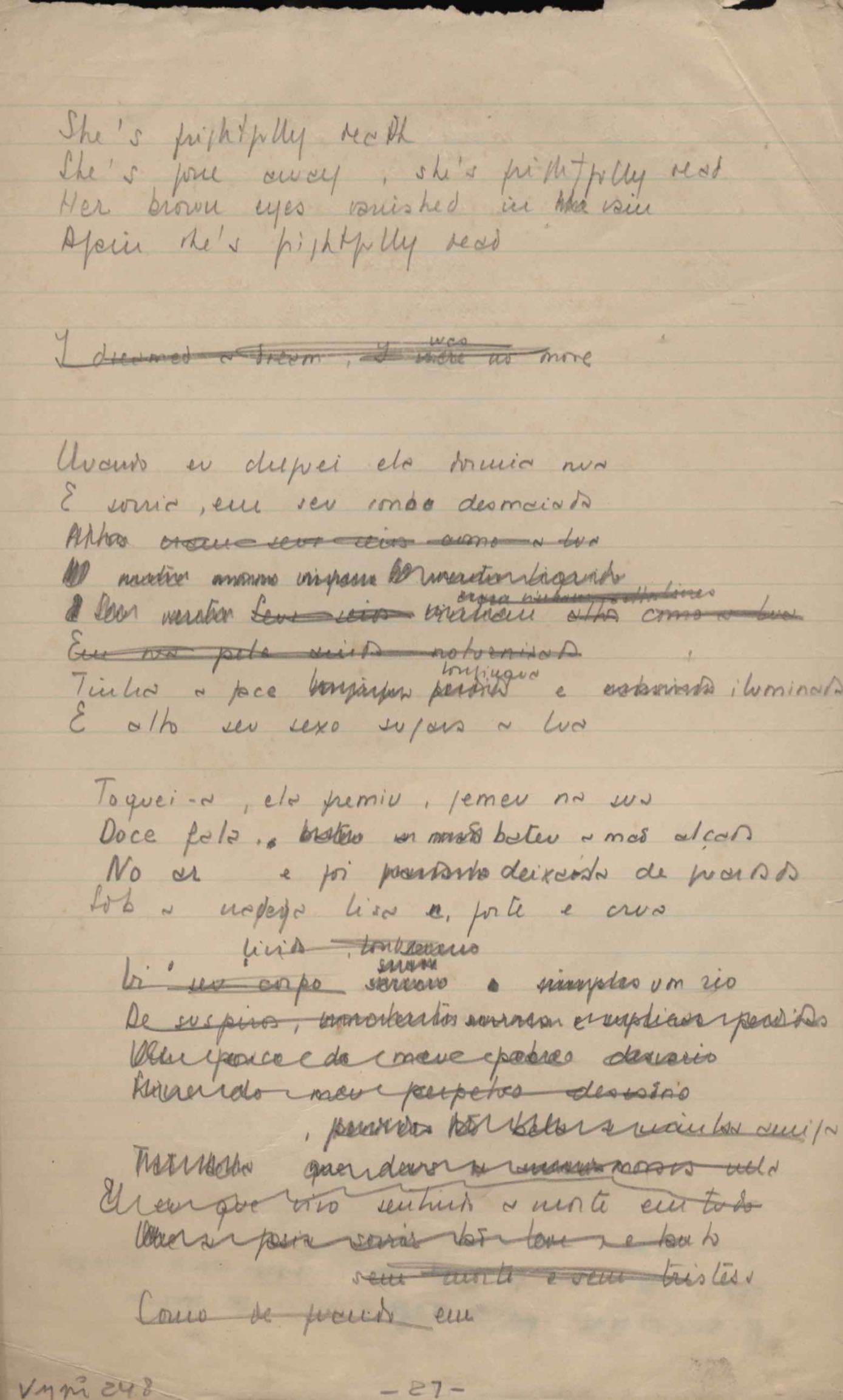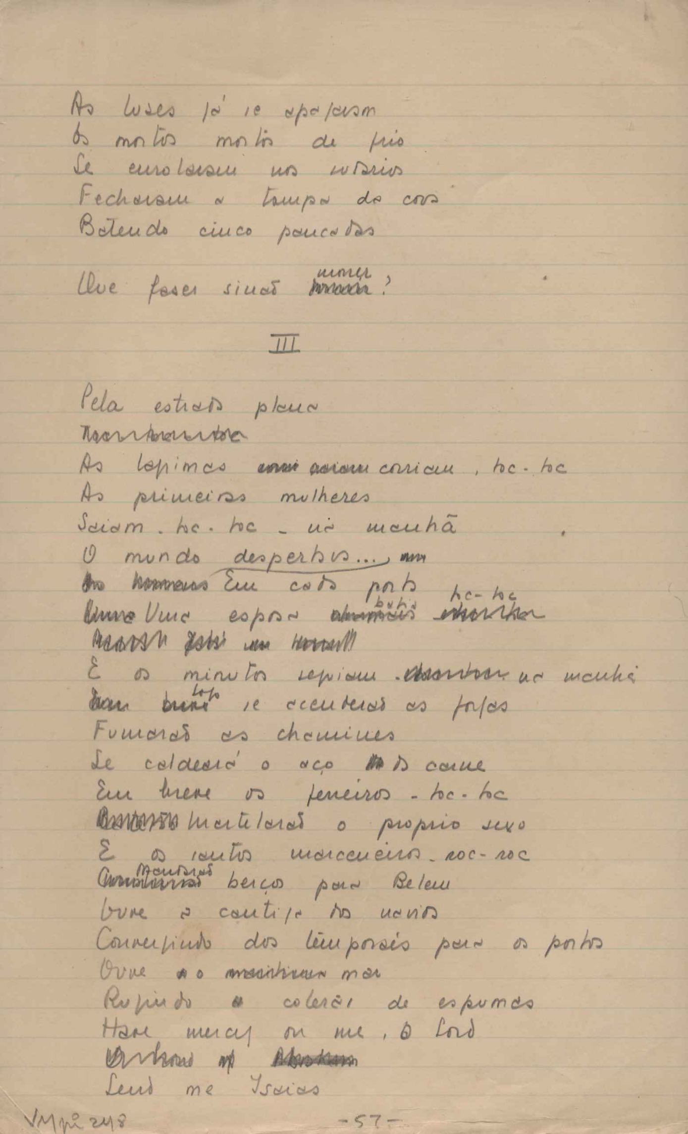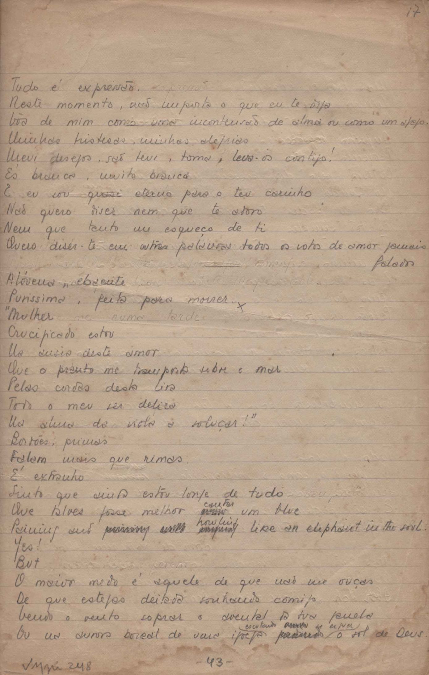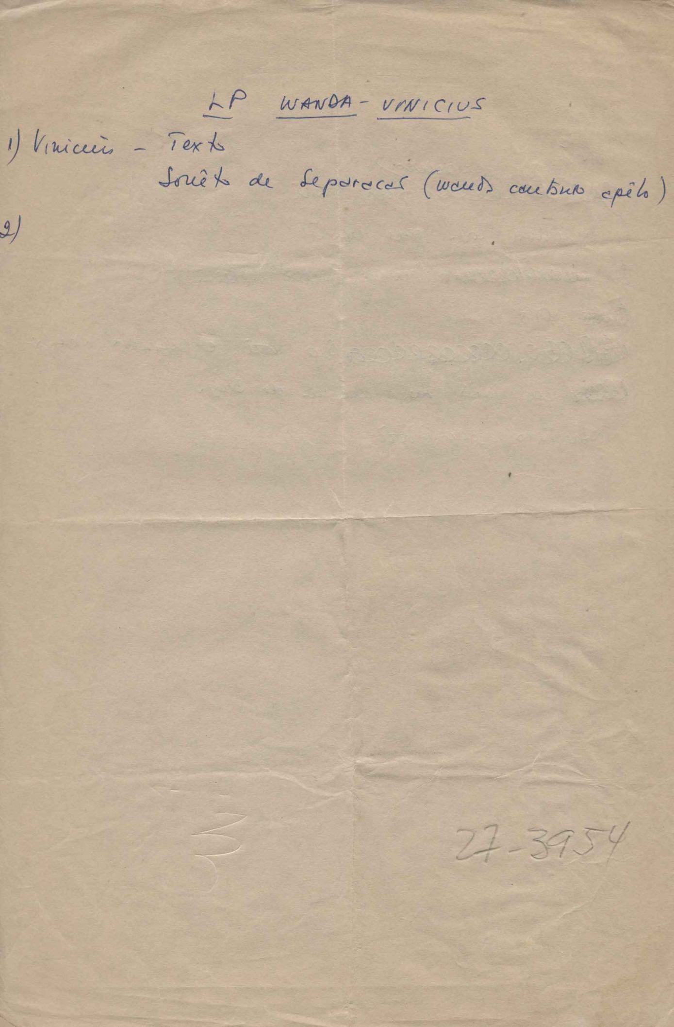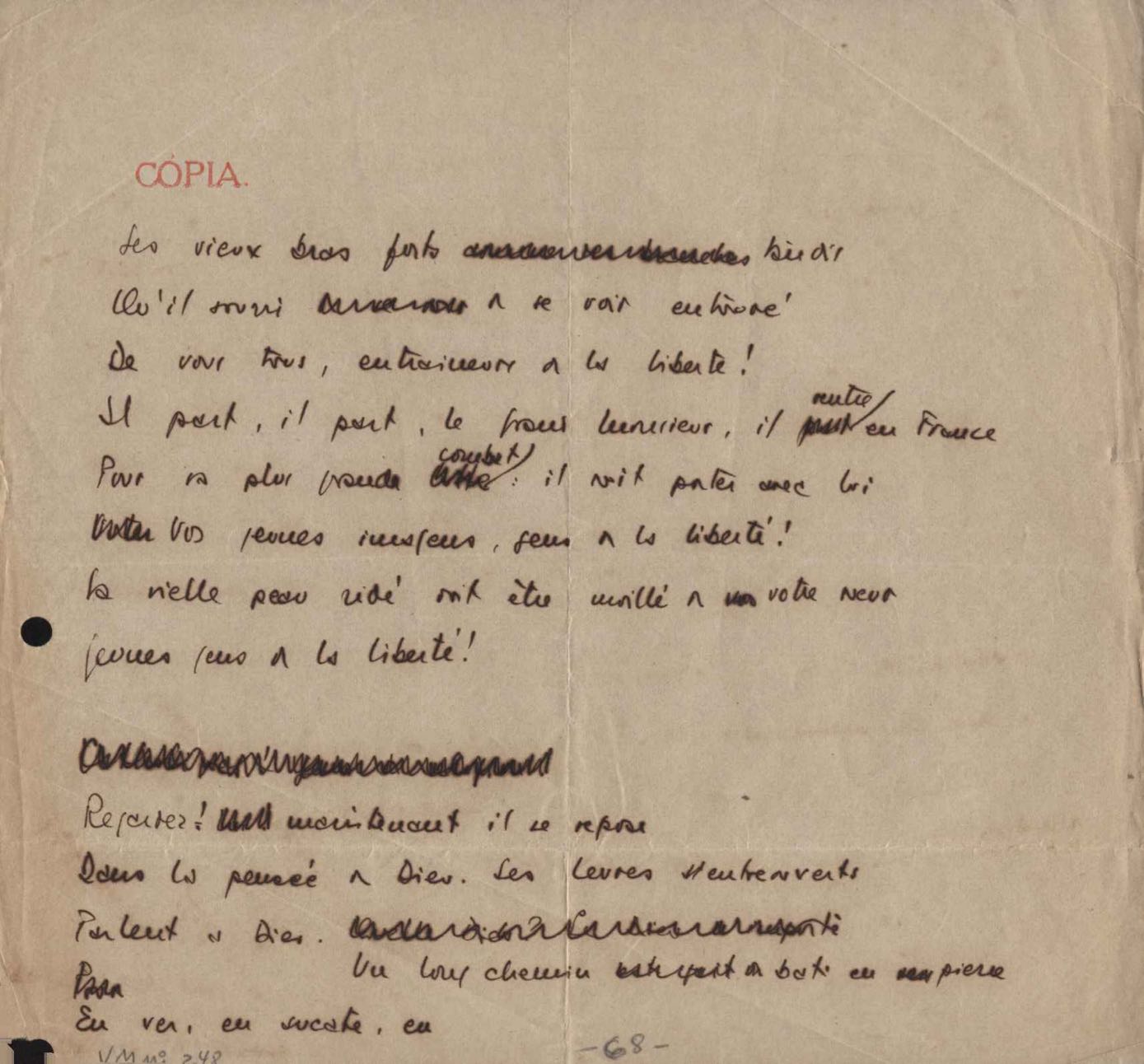 Este documento faz parte do dossiê VMPI248, "Poemas esparsos", que contempla poemas datados entre 21 ago. 1927 e 8 dez. 1971. Destes poemas, 401 são esboços e não possuem título (cf. registro VM0PI248_1_232). Estes originais não podem ser tomados como obra inédita. Ideias, tentativas, escritos inacabados, abandonados ou aproveitados posteriormente com outra forma compõem o dossiê.