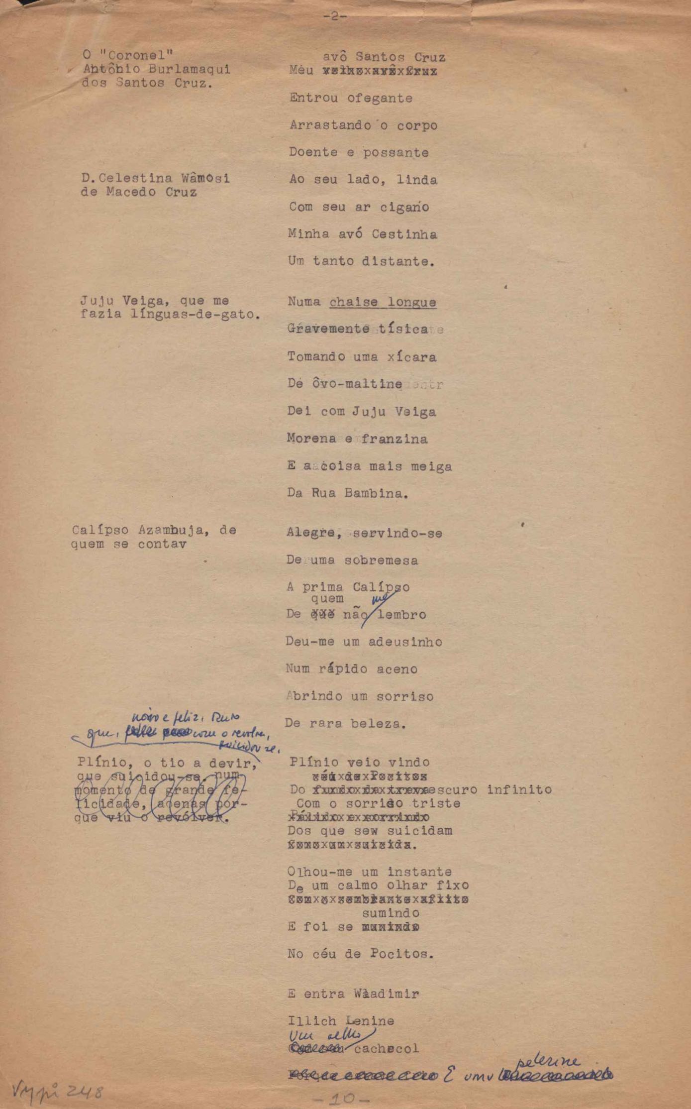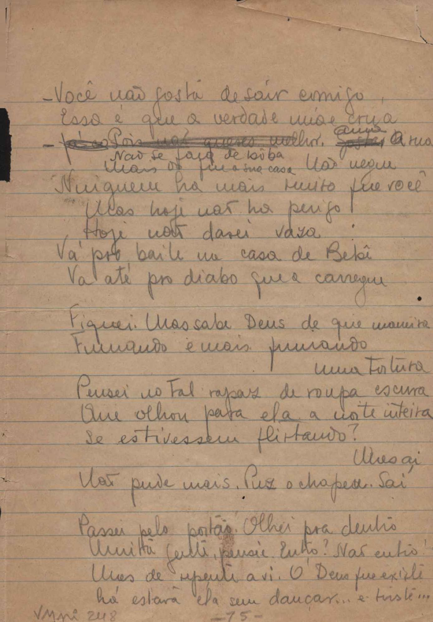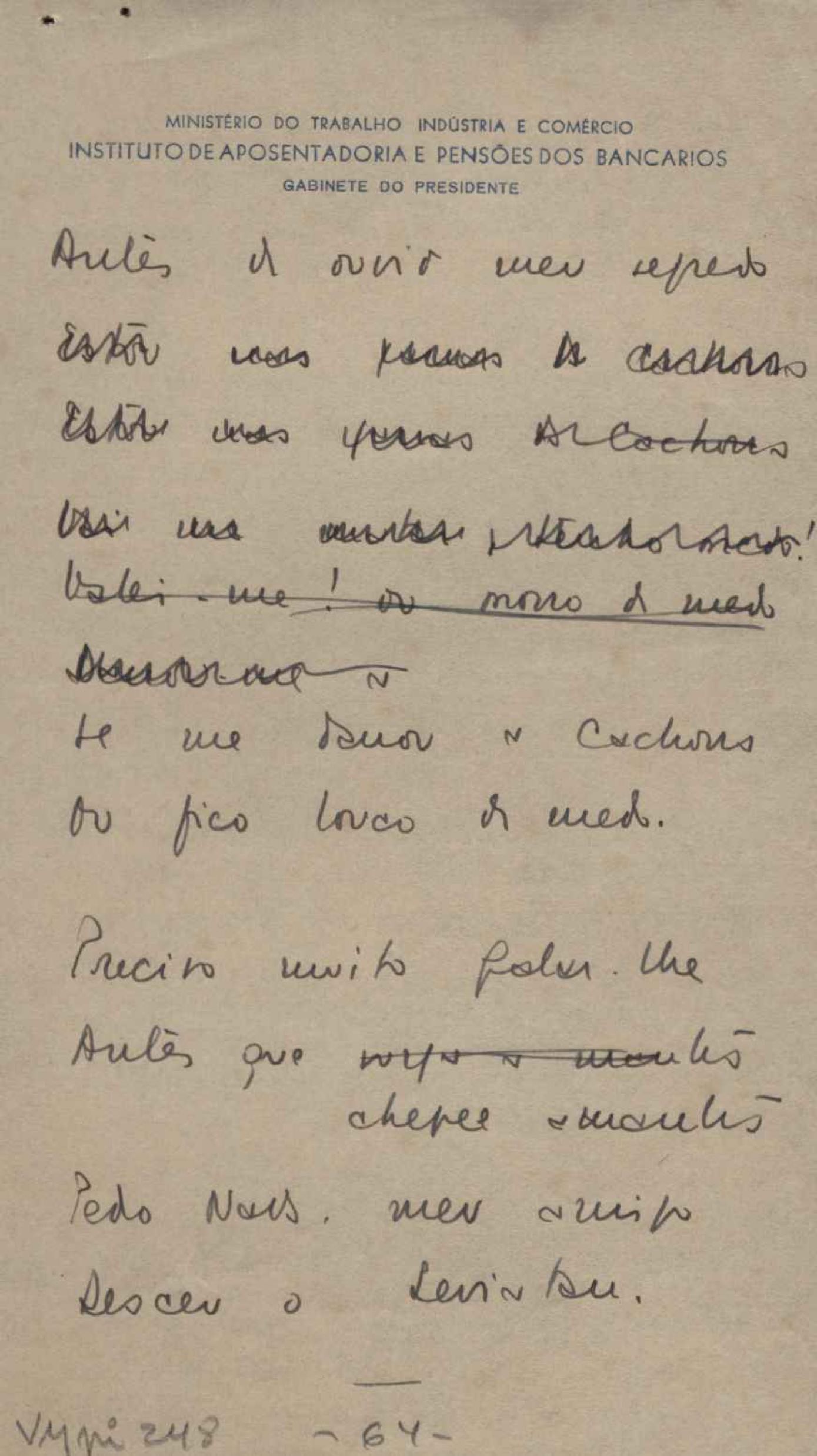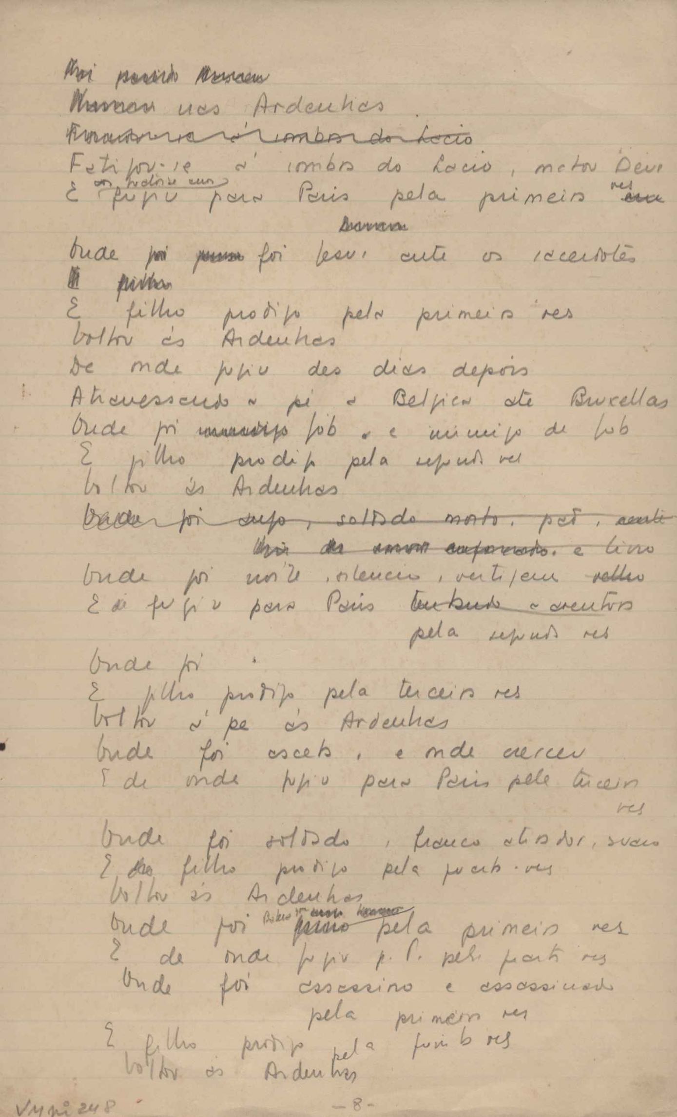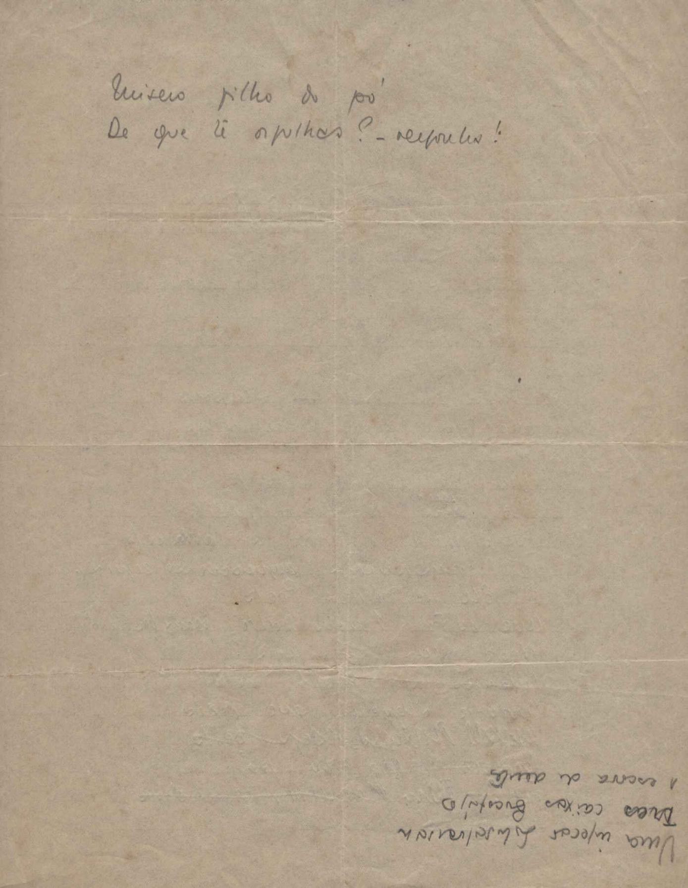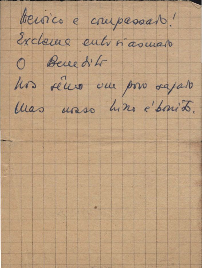 Este documento faz parte do dossiê VMPI248, "Poemas esparsos", que contempla poemas datados entre 21 ago. 1927 e 8 dez. 1971. Destes poemas, 401 são esboços e não possuem título (cf. registro VM0PI248_1_232). Estes originais não podem ser tomados como obra inédita. Ideias, tentativas, escritos inacabados, abandonados ou aproveitados posteriormente com outra forma compõem o dossiê.