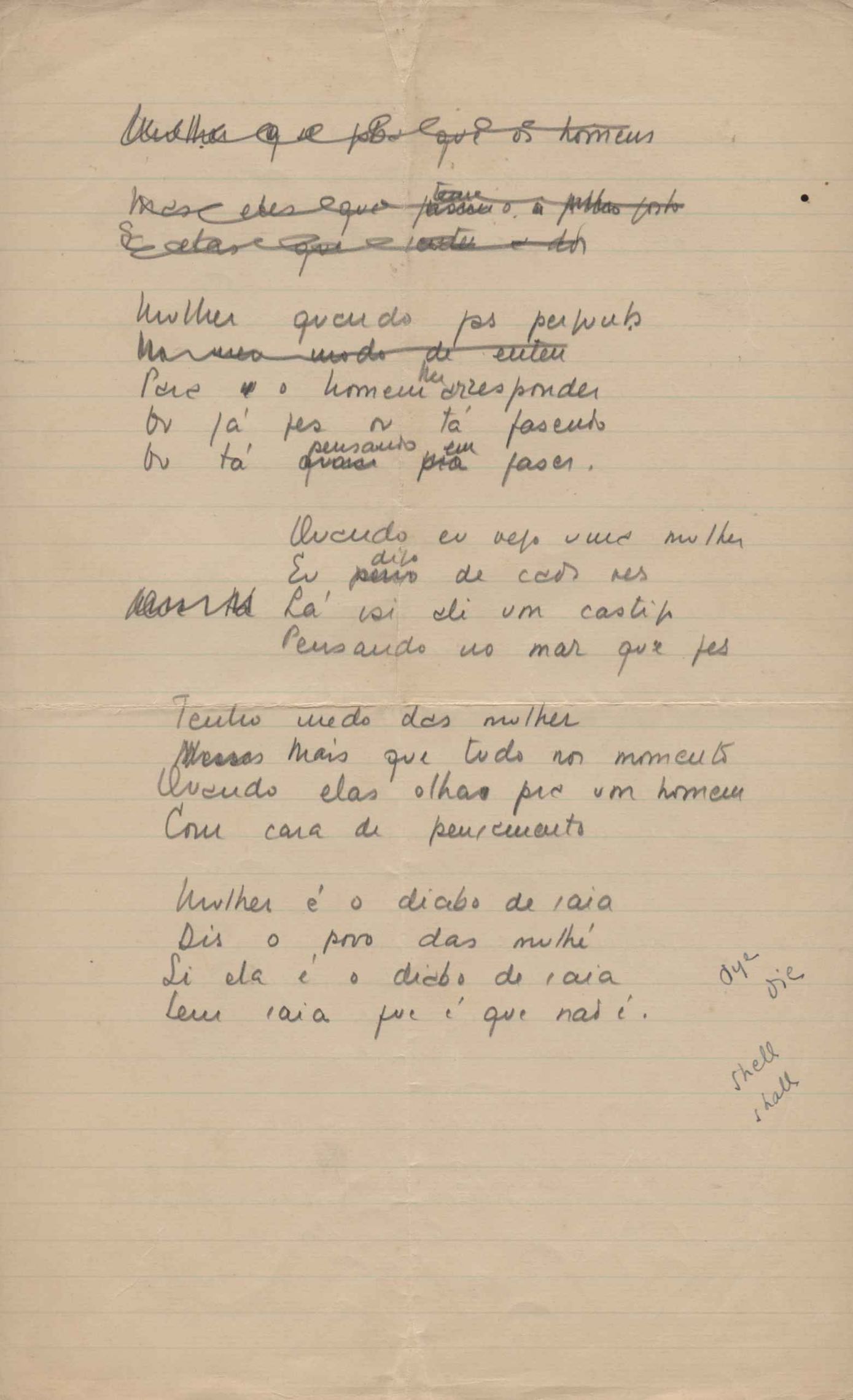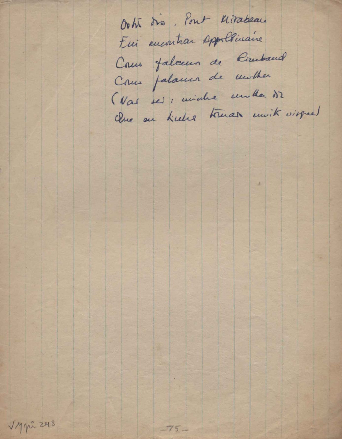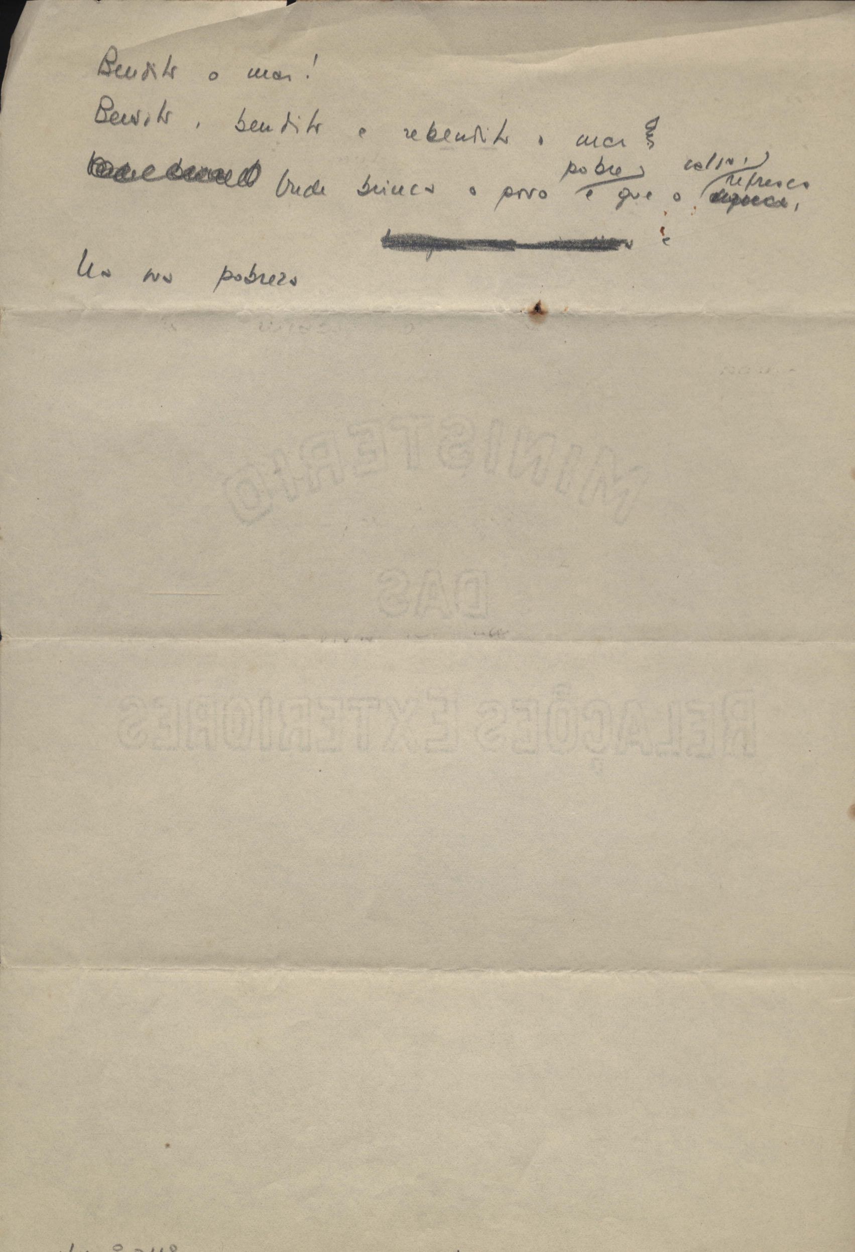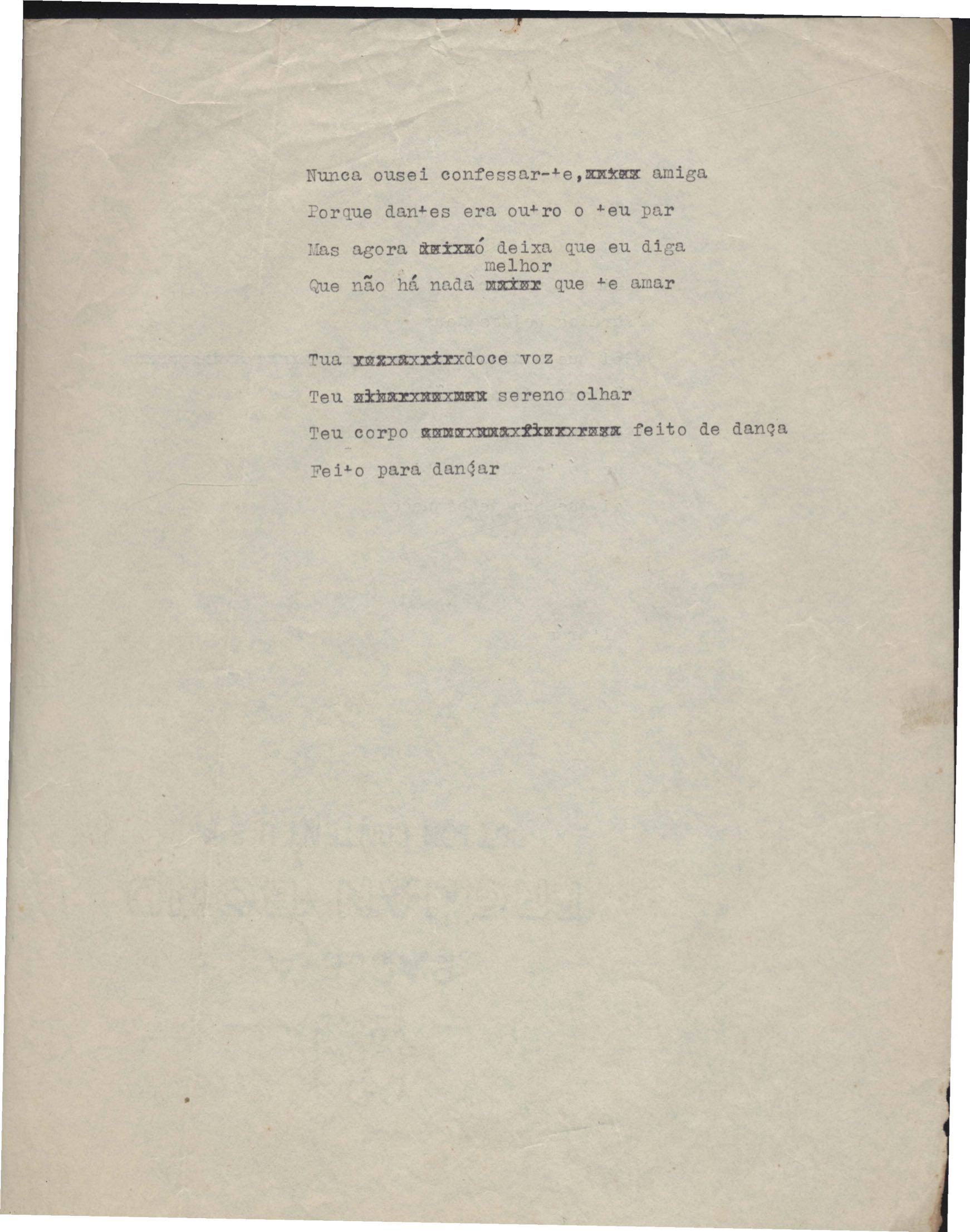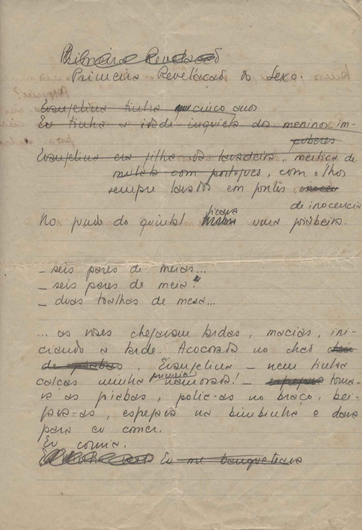 Este documento faz parte do dossiê VMPI248, "Poemas esparsos", que contempla poemas datados entre 21 ago. 1927 e 8 dez. 1971. Destes poemas, 401 são esboços e não possuem título (cf. registro VM0PI248_1_232). Estes originais não podem ser tomados como obra inédita. Ideias, tentativas, escritos inacabados, abandonados ou aproveitados posteriormente com outra forma compõem o dossiê.