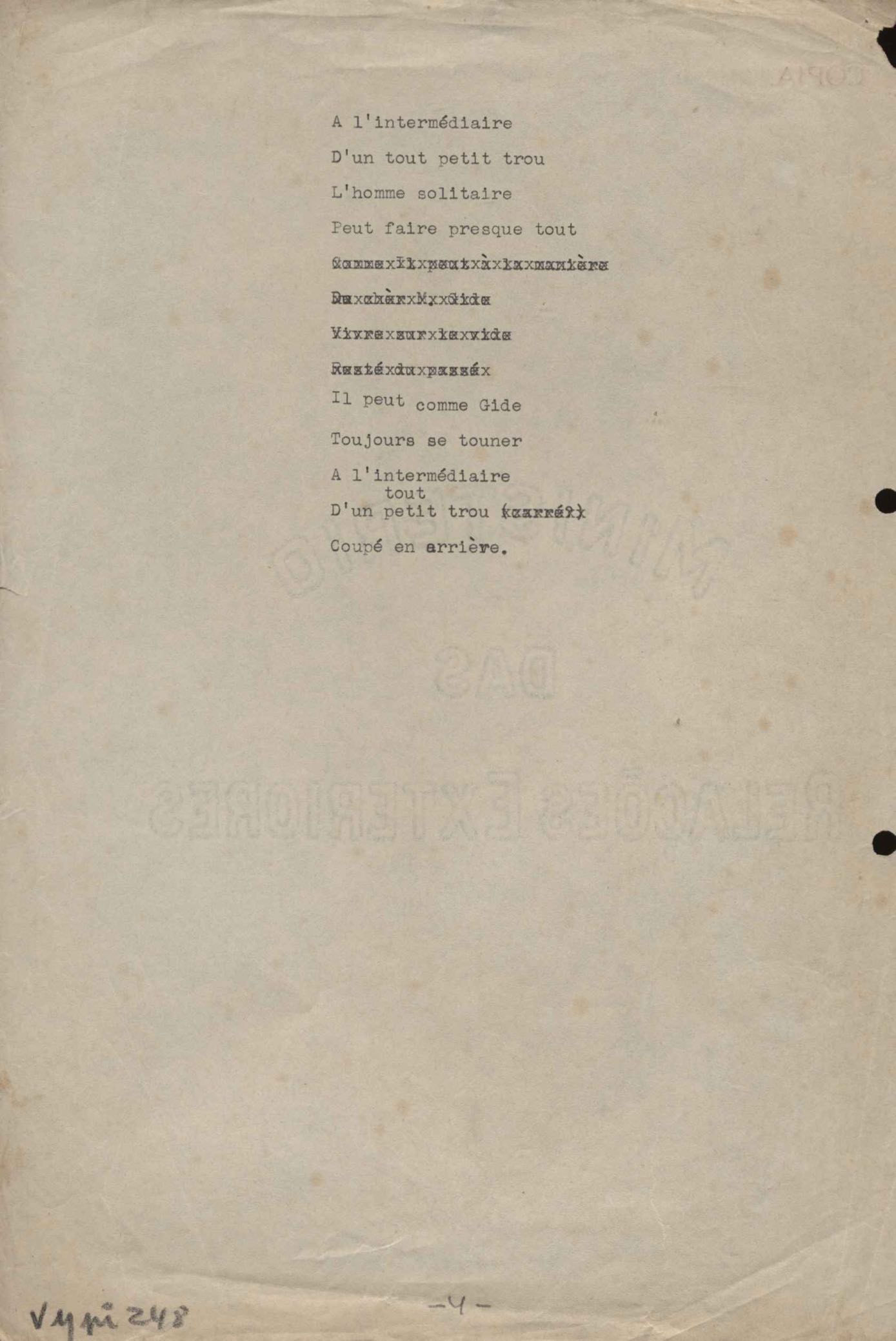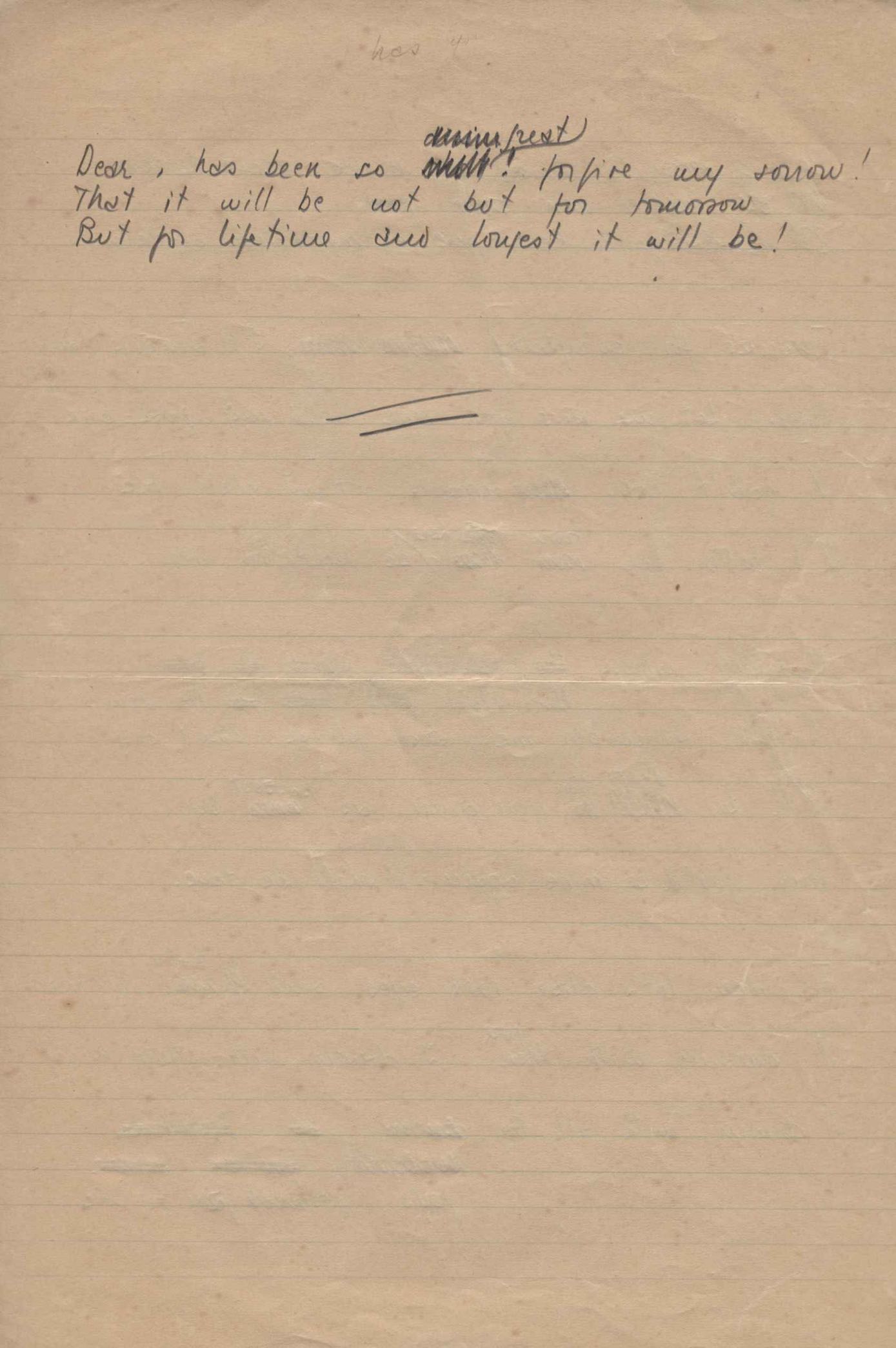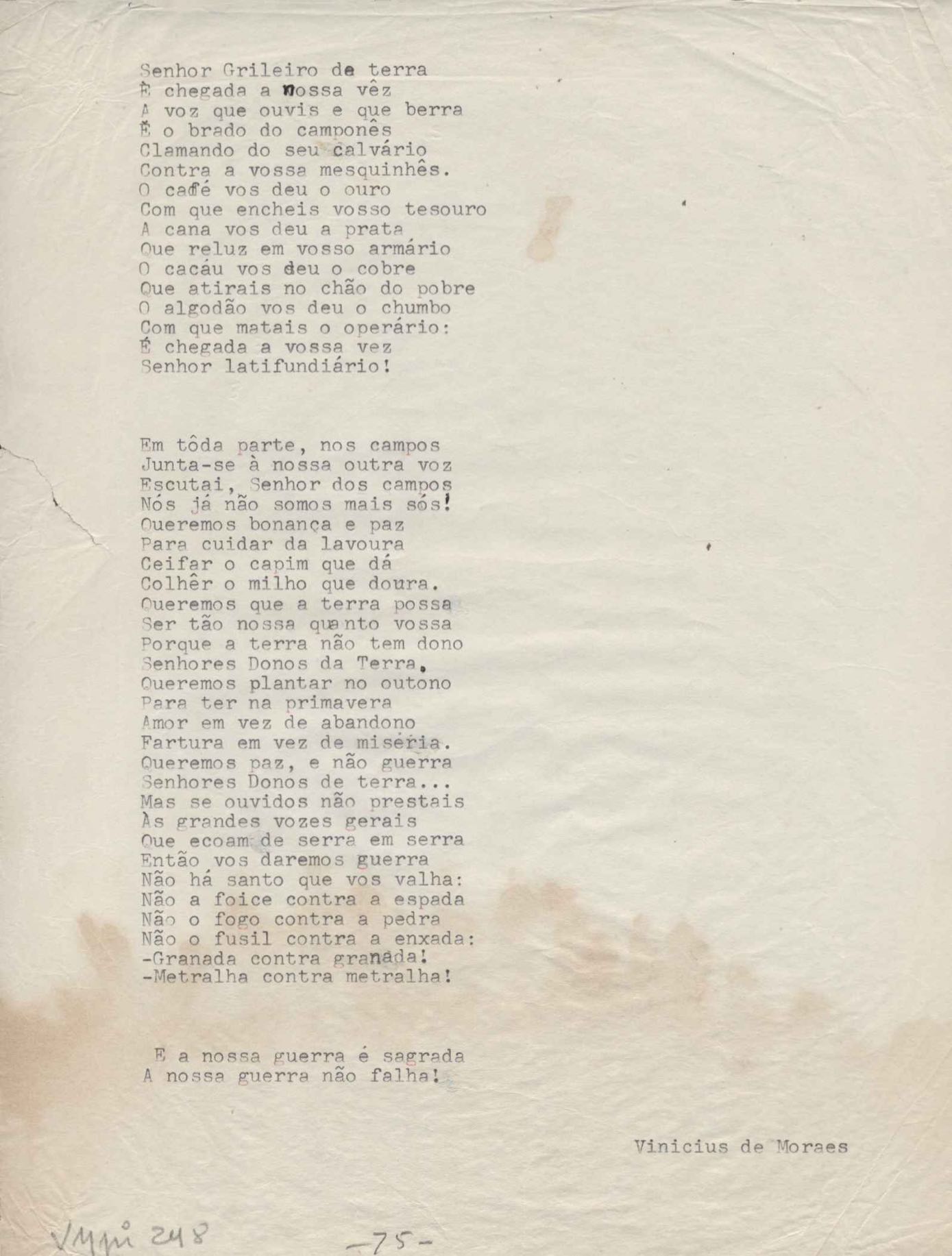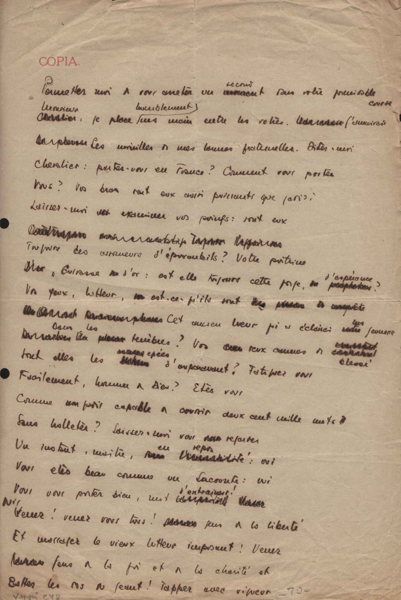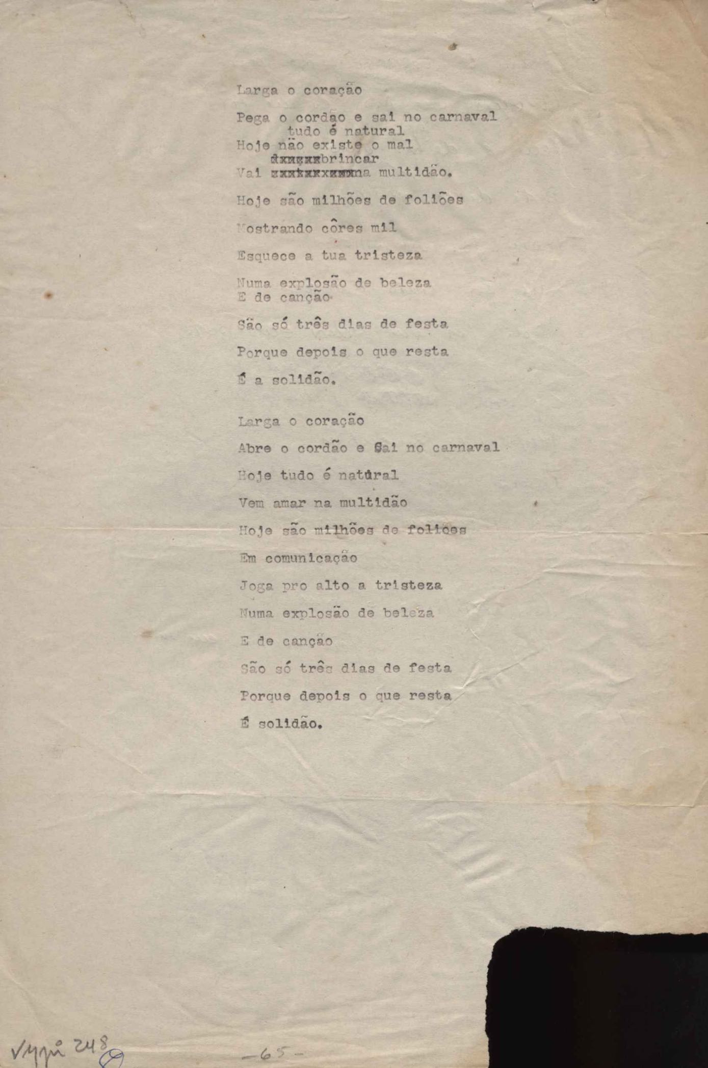 Este documento faz parte do dossiê VMPI248, "Poemas esparsos", que contempla poemas datados entre 21 ago. 1927 e 8 dez. 1971. Destes poemas, 401 são esboços e não possuem título (cf. registro VM0PI248_1_232). Estes originais não podem ser tomados como obra inédita. Ideias, tentativas, escritos inacabados, abandonados ou aproveitados posteriormente com outra forma compõem o dossiê.