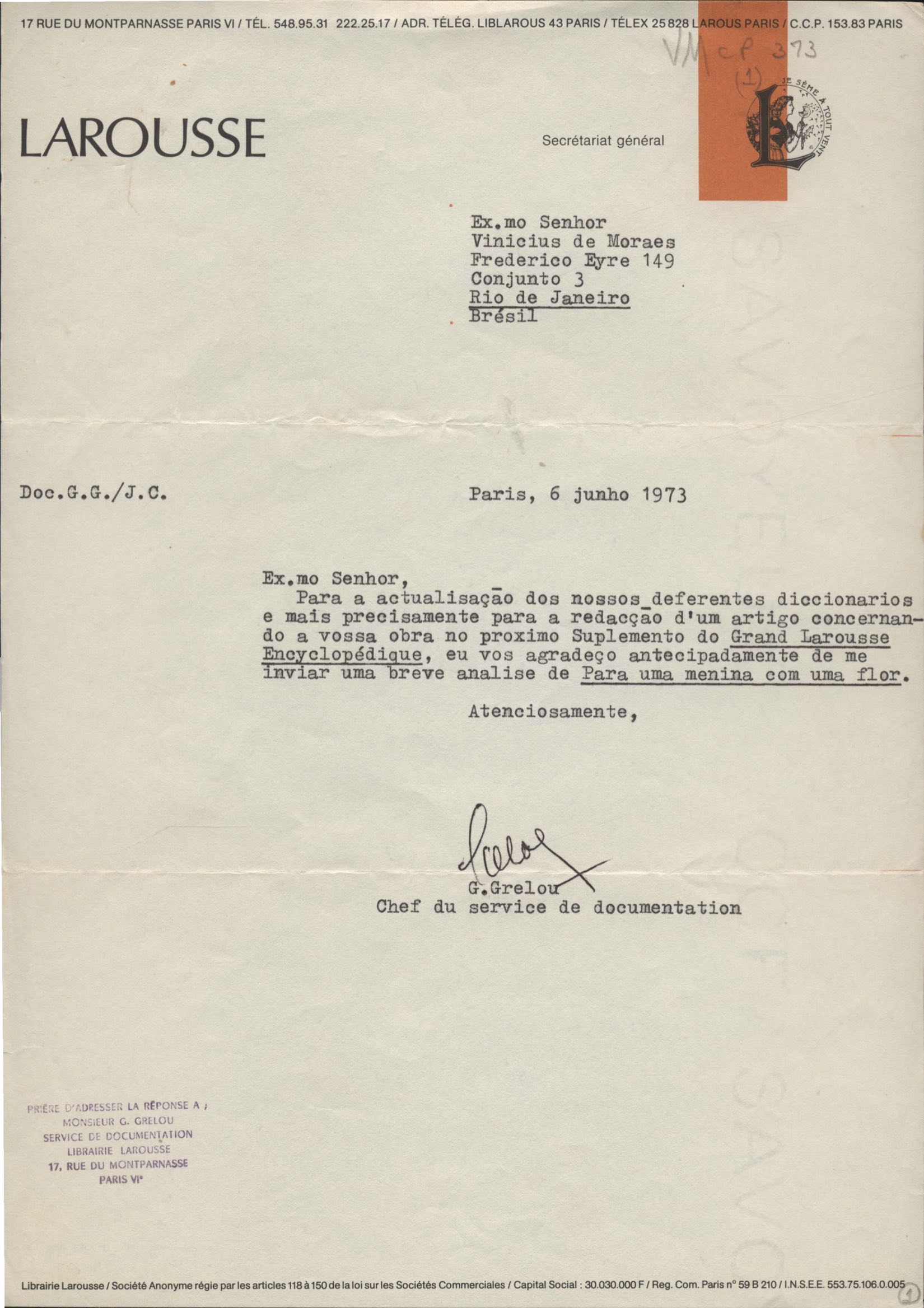 Pedido de breve análise de Para uma menina com uma flor, a fim de ser incluído na Grand Larousse encyclopédique.