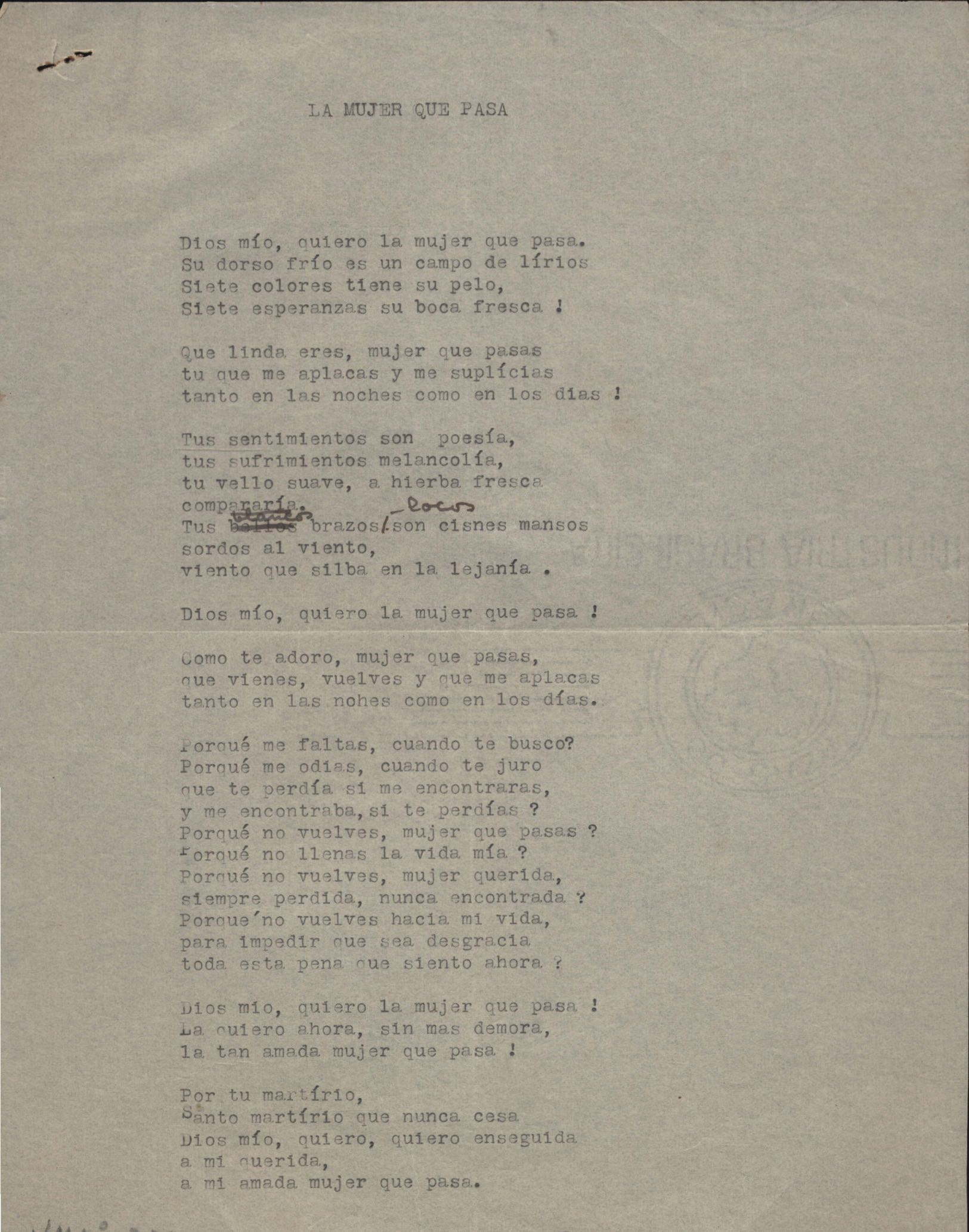 Este documento faz parte do dossiê VMPI324, que contempla poemas/letras de música traduzidos, não datados. Optou-se por colocar nesta subsérie as traduções de poemas de VM cujos tradutores não foram identificados. Usualmente, são inseridos na série Produção Intelectual de Terceiros, no entanto, lá ficariam sob a rubrica Não Identificados.