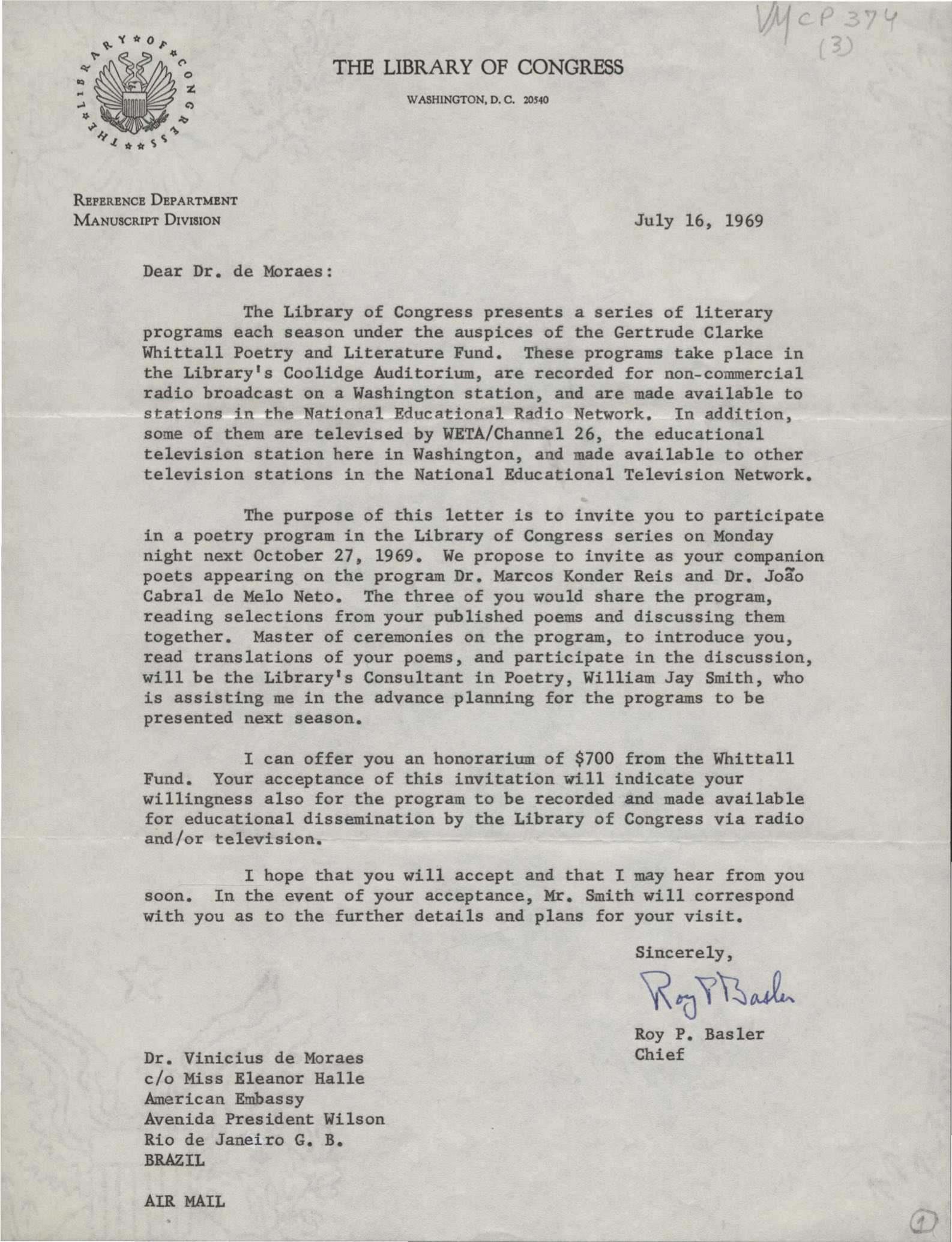Convite para VM participar de um programa de poesia da Library of Congress. Gravação de poemas de VM.