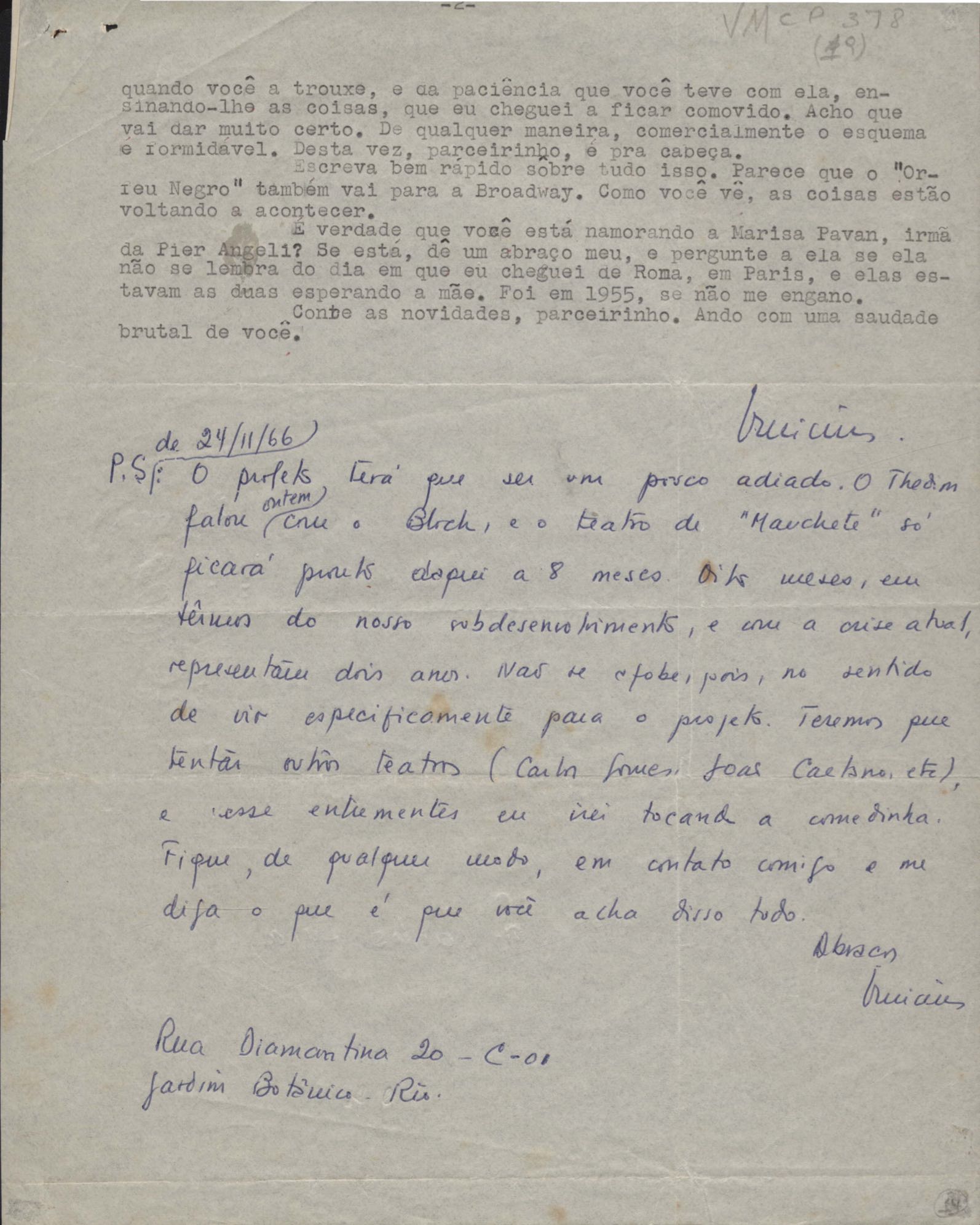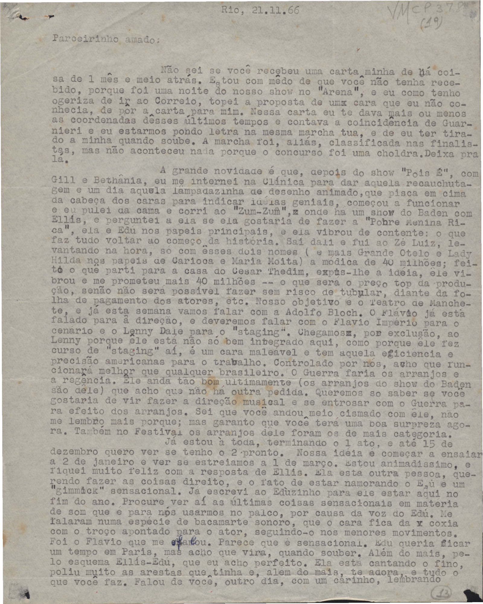 Comentários sobre a divulgação da música popular brasileira nos EUA. Informações sobre músicas que está compondo e sobre shows que está produzindo.