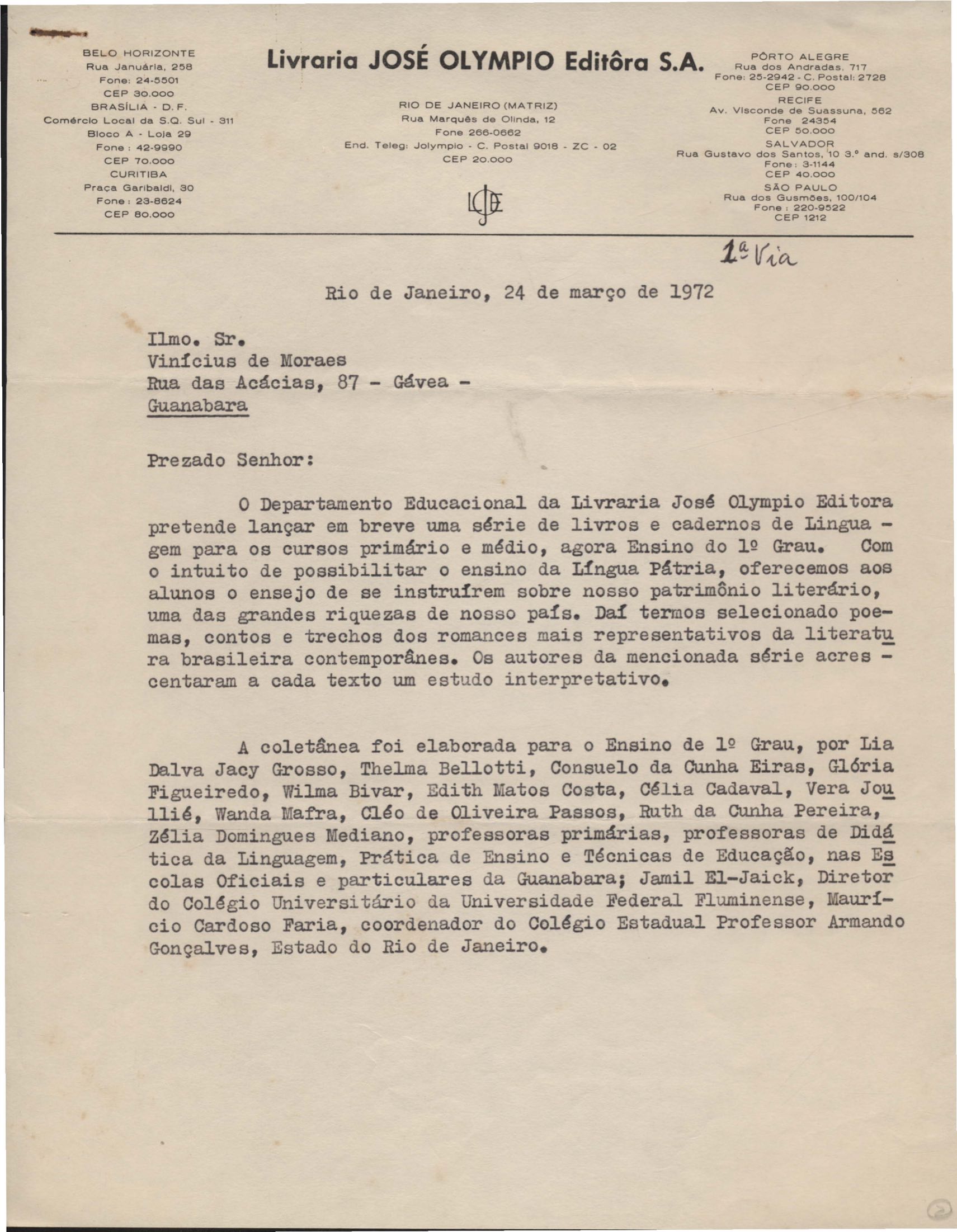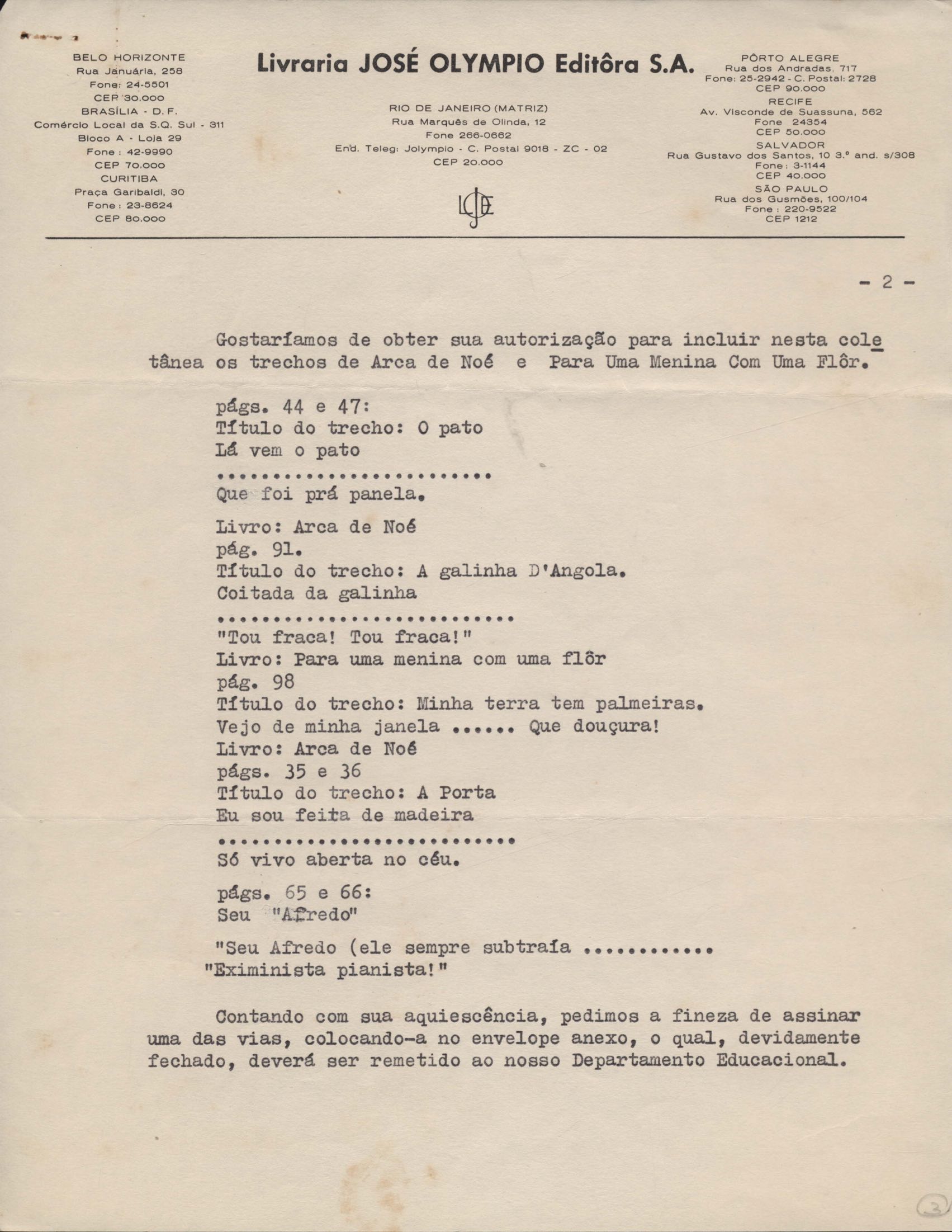Pedido de autorização para reproduzir "O gato" na revista Bem-me-quer e trechos de A arca de Noé e Para uma menina com uma flor em coletânea para o ensino do 1º grau. Divulgação do poema "A rosa de Hiroshima". Comentários de José Olímpio sobre entrevista de VM. Informações sobre a publicação da Seleta em prosa e verso, de VM. Anexo: 1. Carta do Centro do Livro Brasileiro (Angola) à Editora Sabiá; 2. Informações sobre publicação de uma Seleta em prosa e verso, de VM; 3. Questionário para coleta de dados biobliográficos.