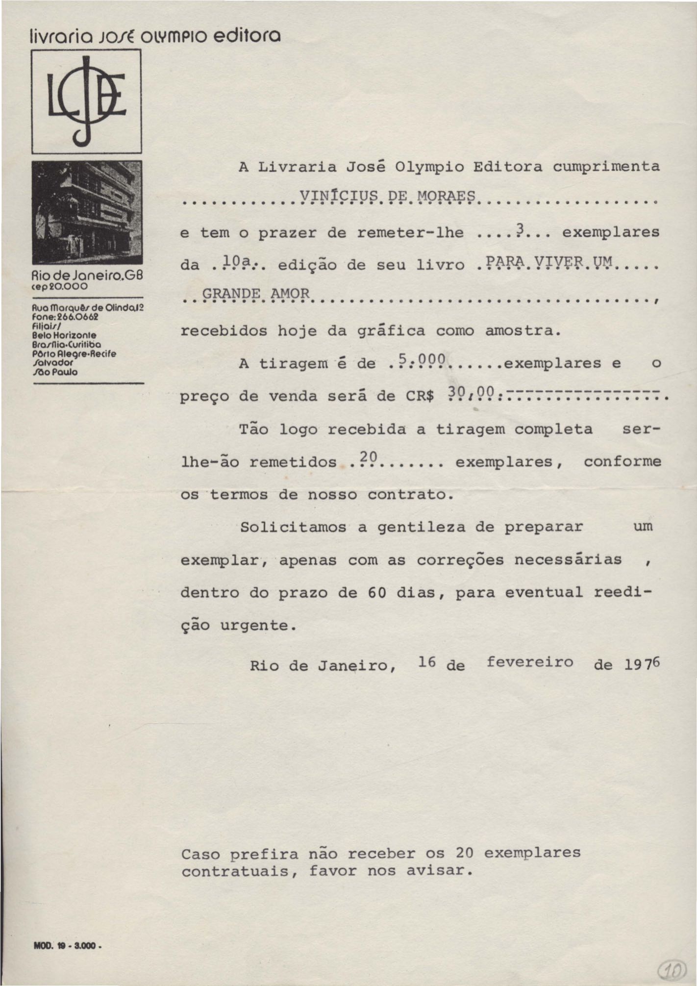 Pedido de autorização para reproduzir "O gato" na revista Bem-me-quer e trechos de A arca de Noé e Para uma menina com uma flor em coletânea para o ensino do 1º grau. Divulgação do poema "A rosa de Hiroshima". Comentários de José Olímpio sobre entrevista de VM. Informações sobre a publicação da Seleta em prosa e verso, de VM. Anexo: 1. Carta do Centro do Livro Brasileiro (Angola) à Editora Sabiá; 2. Informações sobre publicação de uma Seleta em prosa e verso, de VM; 3. Questionário para coleta de dados biobliográficos.