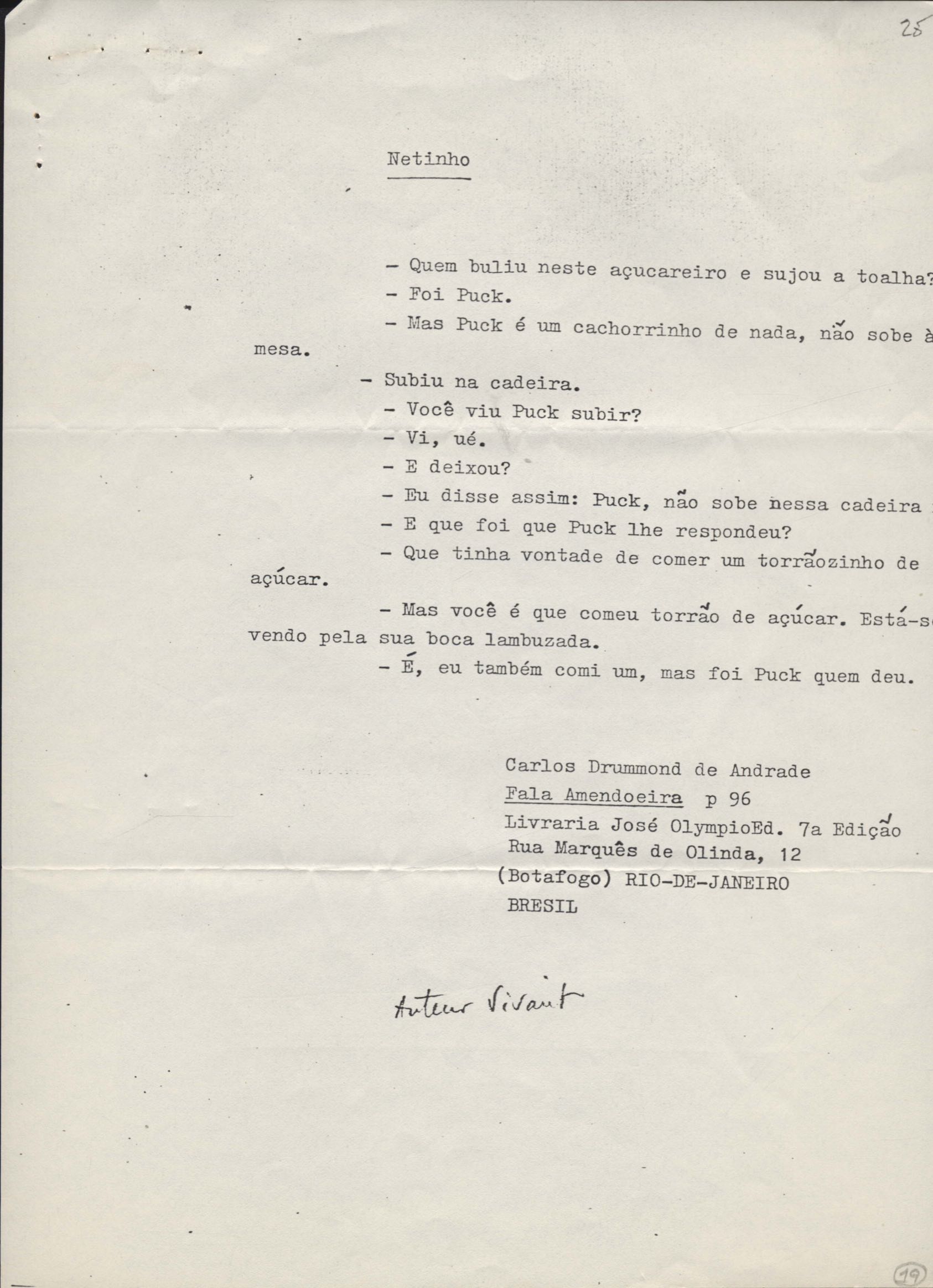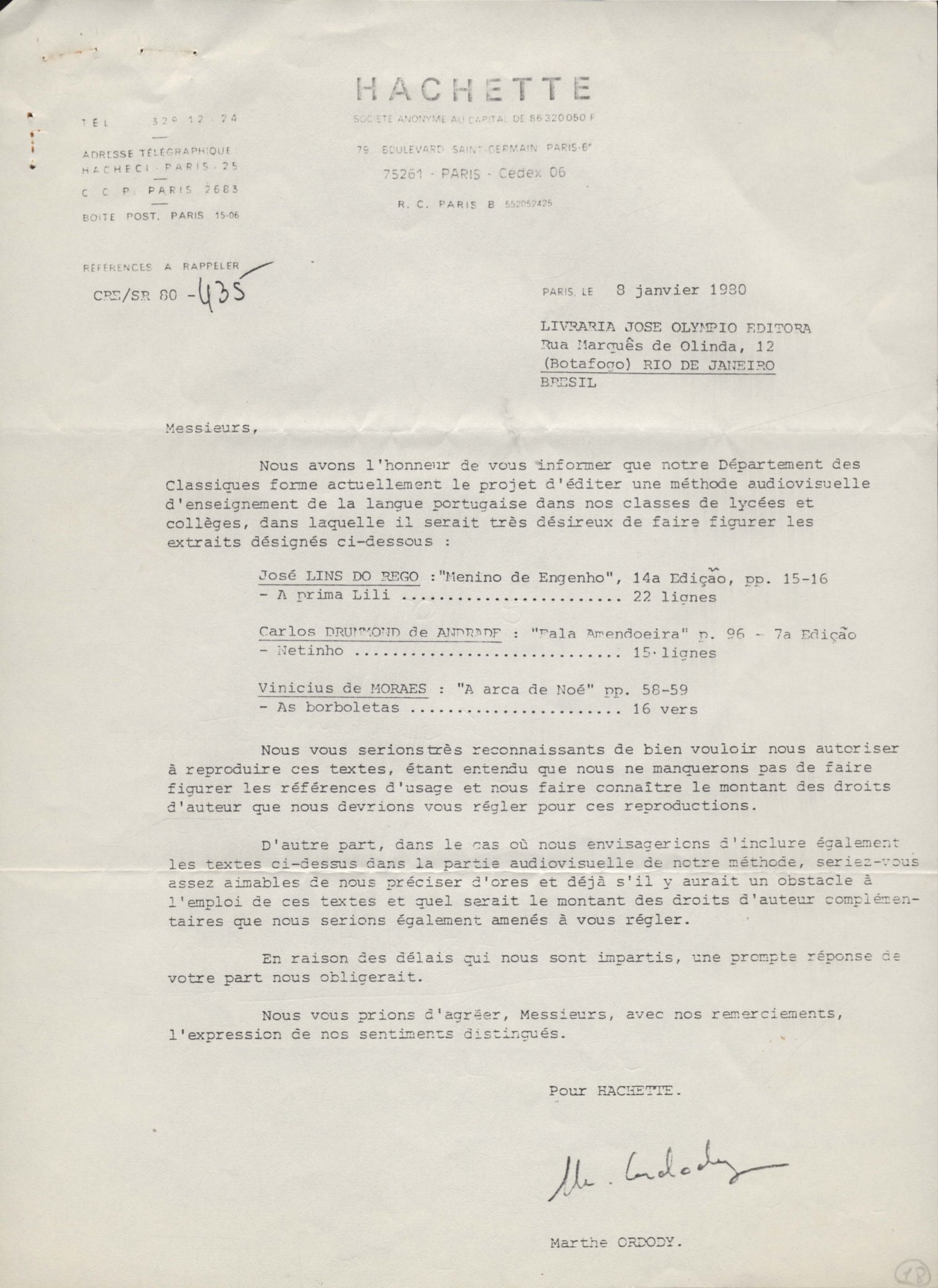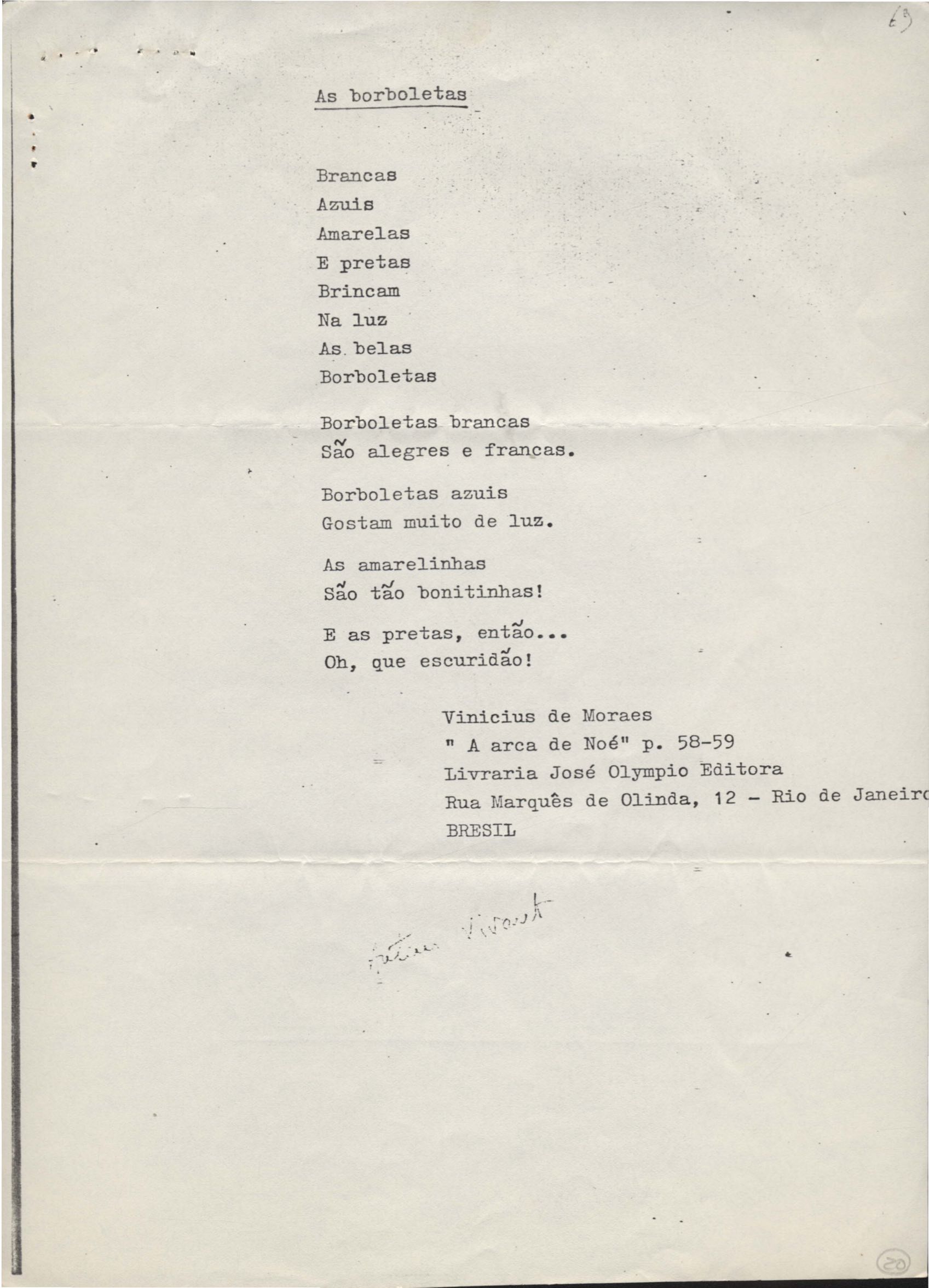 Pedido de autorização para reproduzir "O gato" na revista Bem-me-quer e trechos de A arca de Noé e Para uma menina com uma flor em coletânea para o ensino do 1º grau. Divulgação do poema "A rosa de Hiroshima". Comentários de José Olímpio sobre entrevista de VM. Informações sobre a publicação da Seleta em prosa e verso, de VM. Anexo: 1. Carta do Centro do Livro Brasileiro (Angola) à Editora Sabiá; 2. Informações sobre publicação de uma Seleta em prosa e verso, de VM; 3. Questionário para coleta de dados biobliográficos.