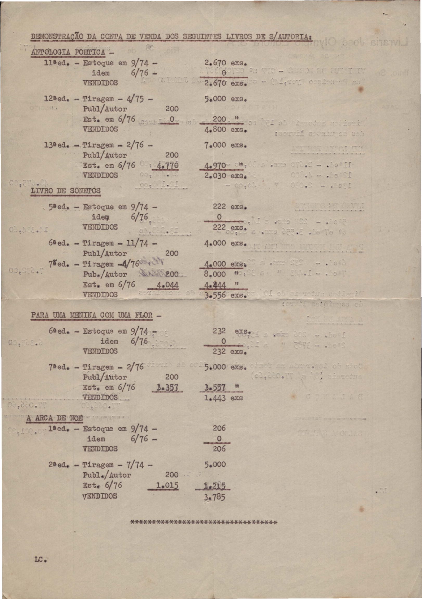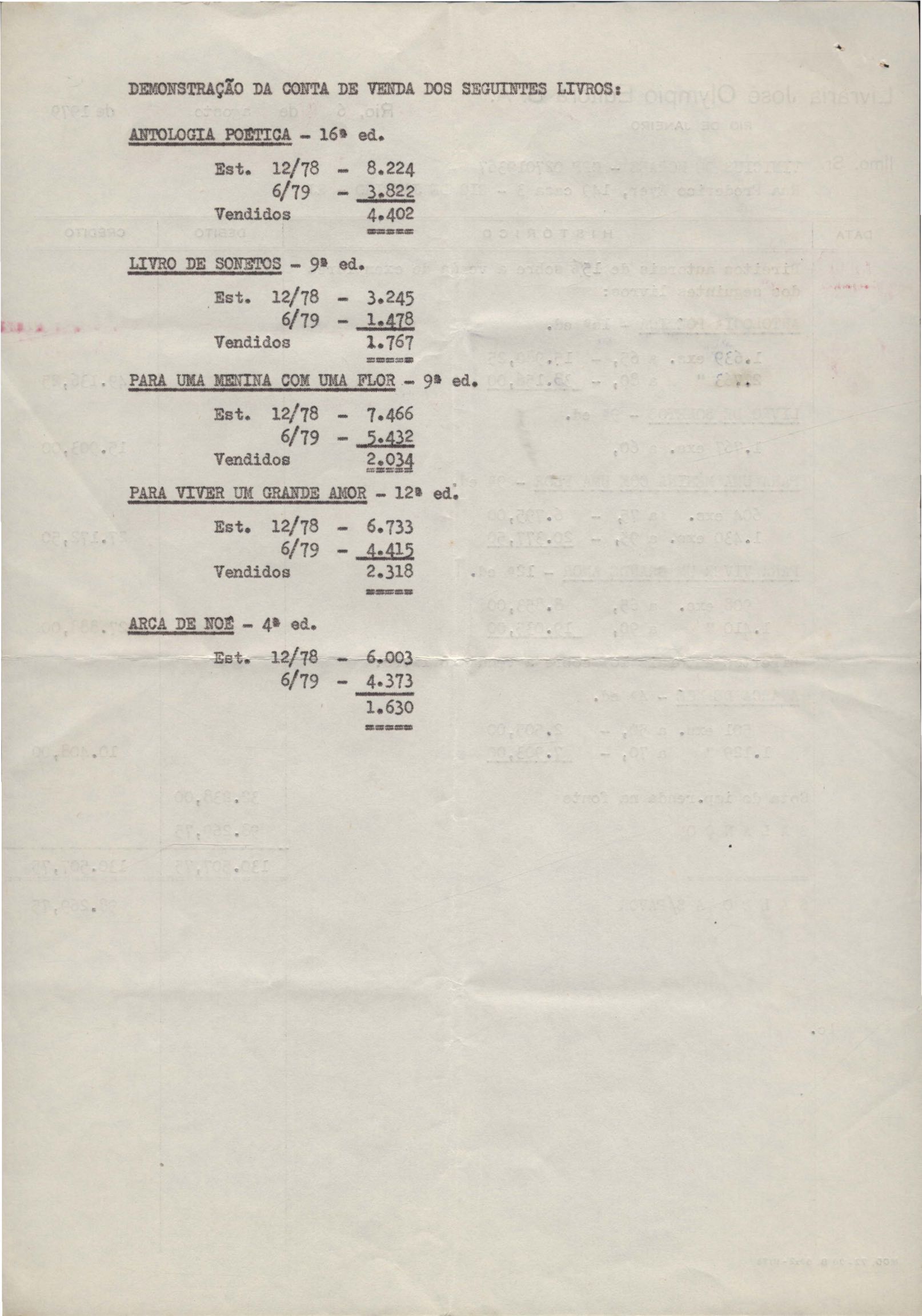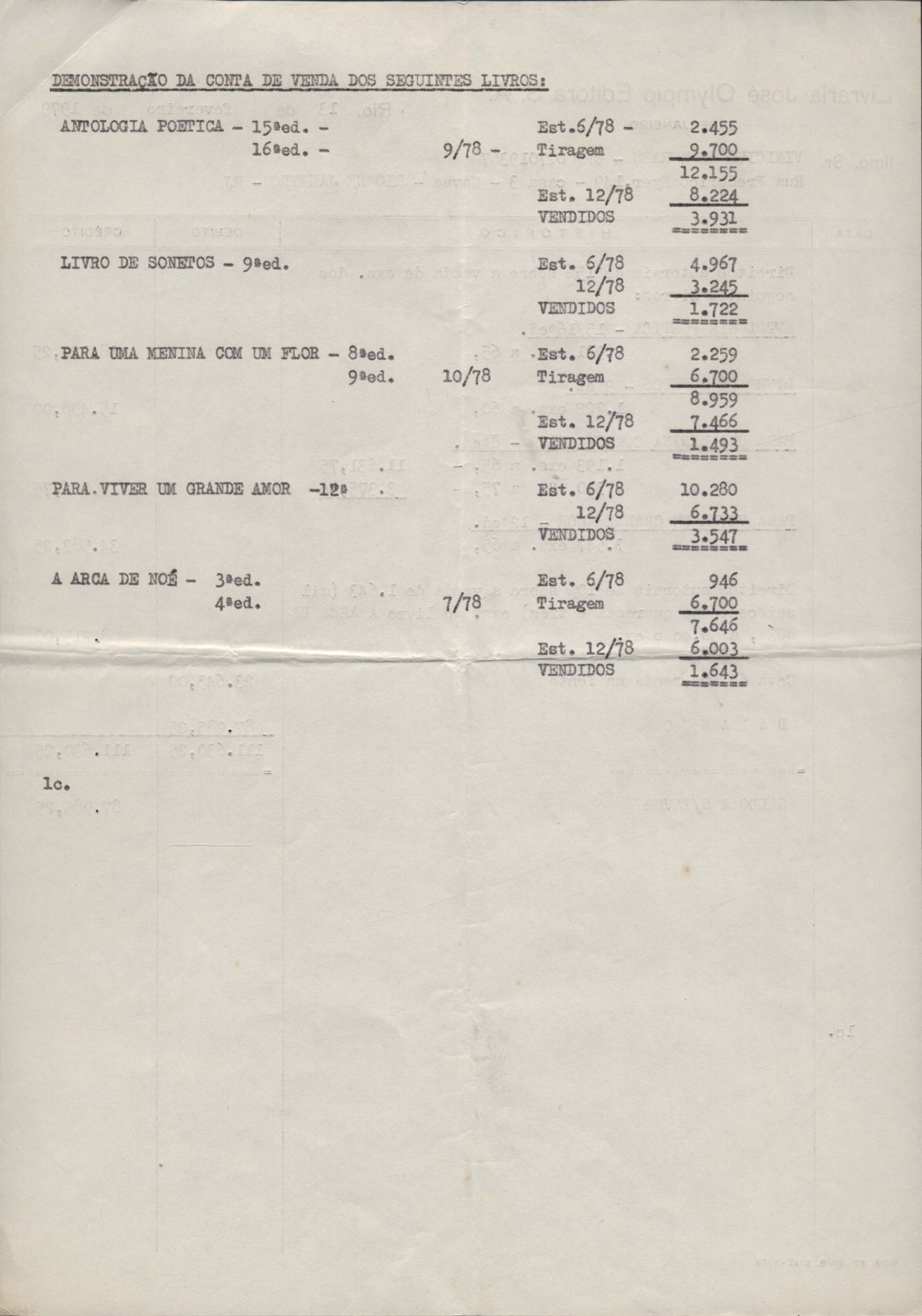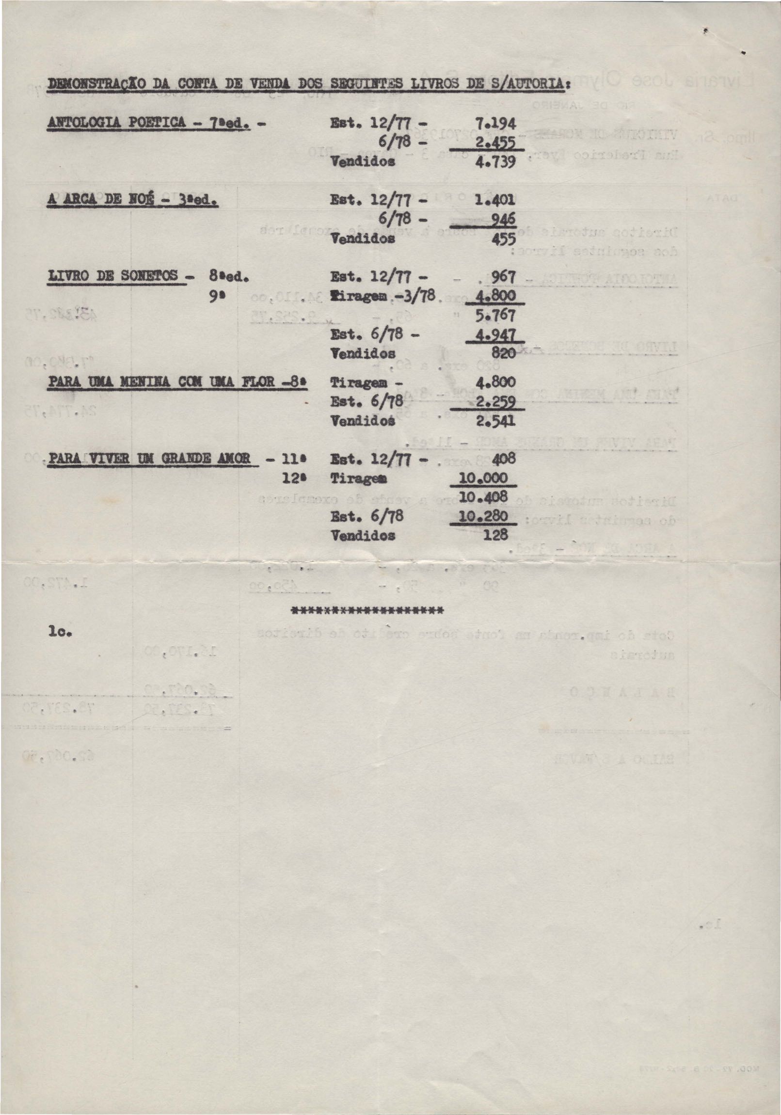 Pedido de autorização para reproduzir "O gato" na revista Bem-me-quer e trechos de A arca de Noé e Para uma menina com uma flor em coletânea para o ensino do 1º grau. Divulgação do poema "A rosa de Hiroshima". Comentários de José Olímpio sobre entrevista de VM. Informações sobre a publicação da Seleta em prosa e verso, de VM. Anexo: 1. Carta do Centro do Livro Brasileiro (Angola) à Editora Sabiá; 2. Informações sobre publicação de uma Seleta em prosa e verso, de VM; 3. Questionário para coleta de dados biobliográficos.