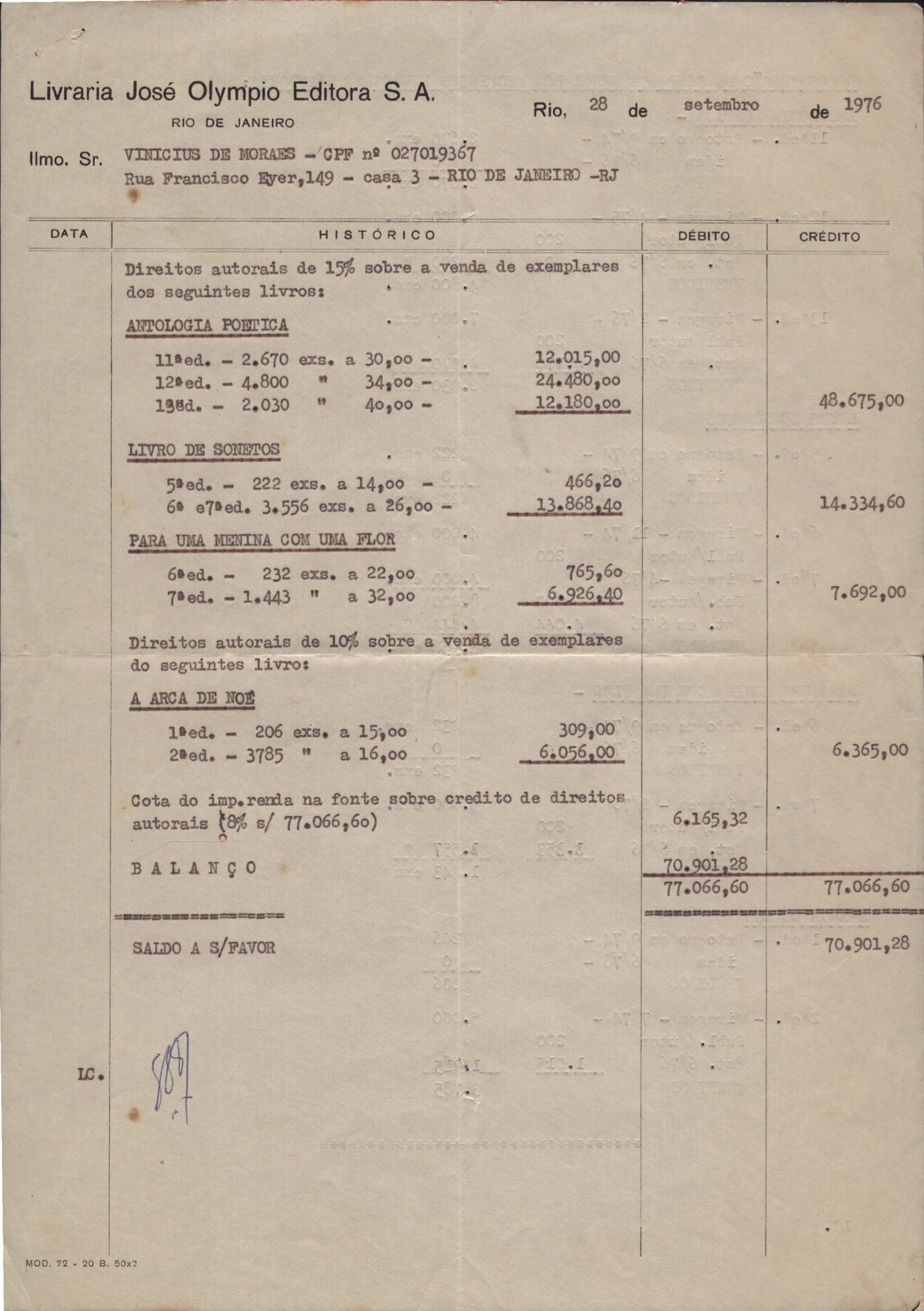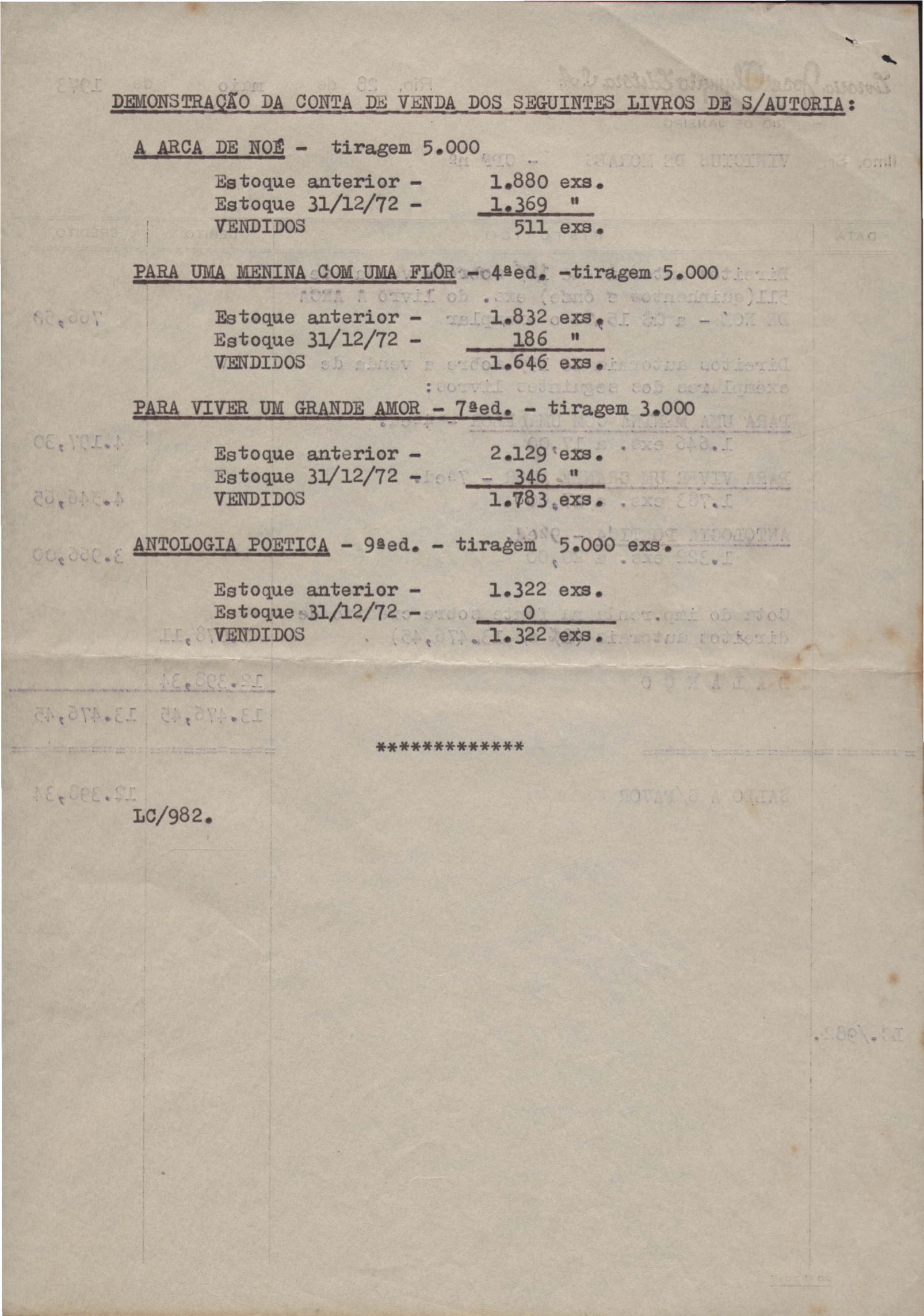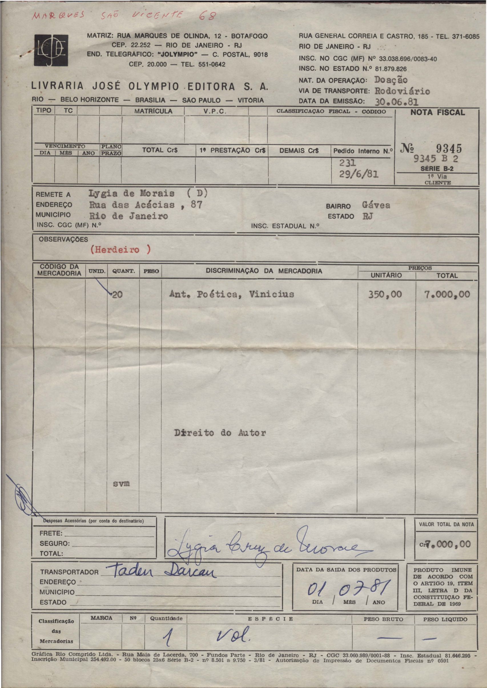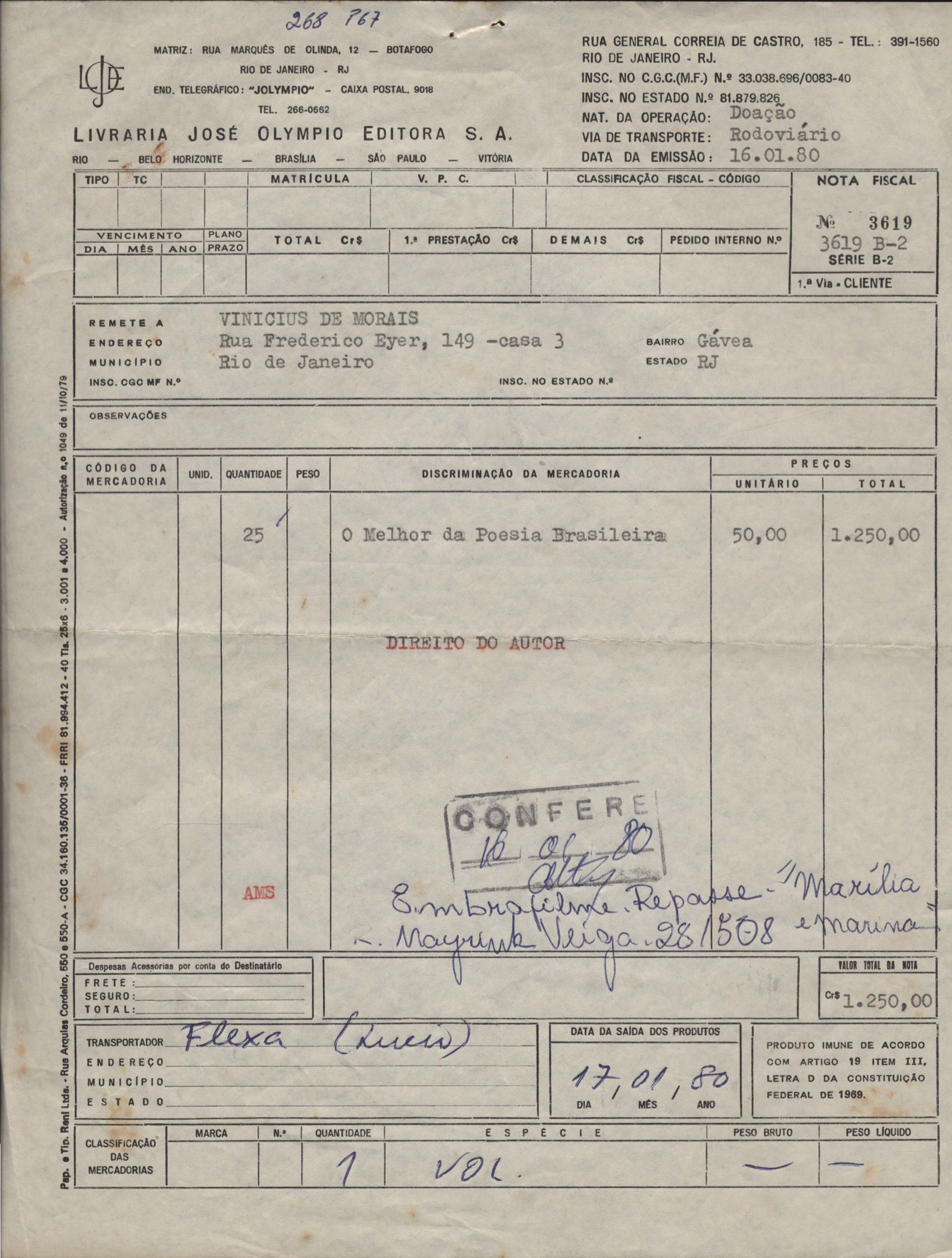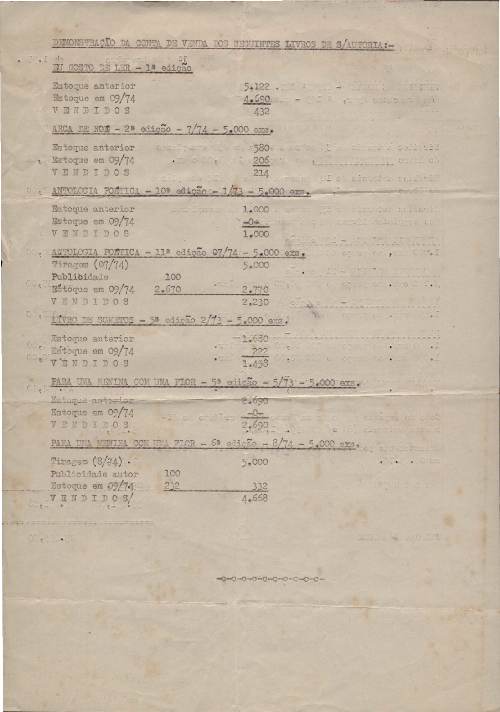 Pedido de autorização para reproduzir "O gato" na revista Bem-me-quer e trechos de A arca de Noé e Para uma menina com uma flor em coletânea para o ensino do 1º grau. Divulgação do poema "A rosa de Hiroshima". Comentários de José Olímpio sobre entrevista de VM. Informações sobre a publicação da Seleta em prosa e verso, de VM. Anexo: 1. Carta do Centro do Livro Brasileiro (Angola) à Editora Sabiá; 2. Informações sobre publicação de uma Seleta em prosa e verso, de VM; 3. Questionário para coleta de dados biobliográficos.
