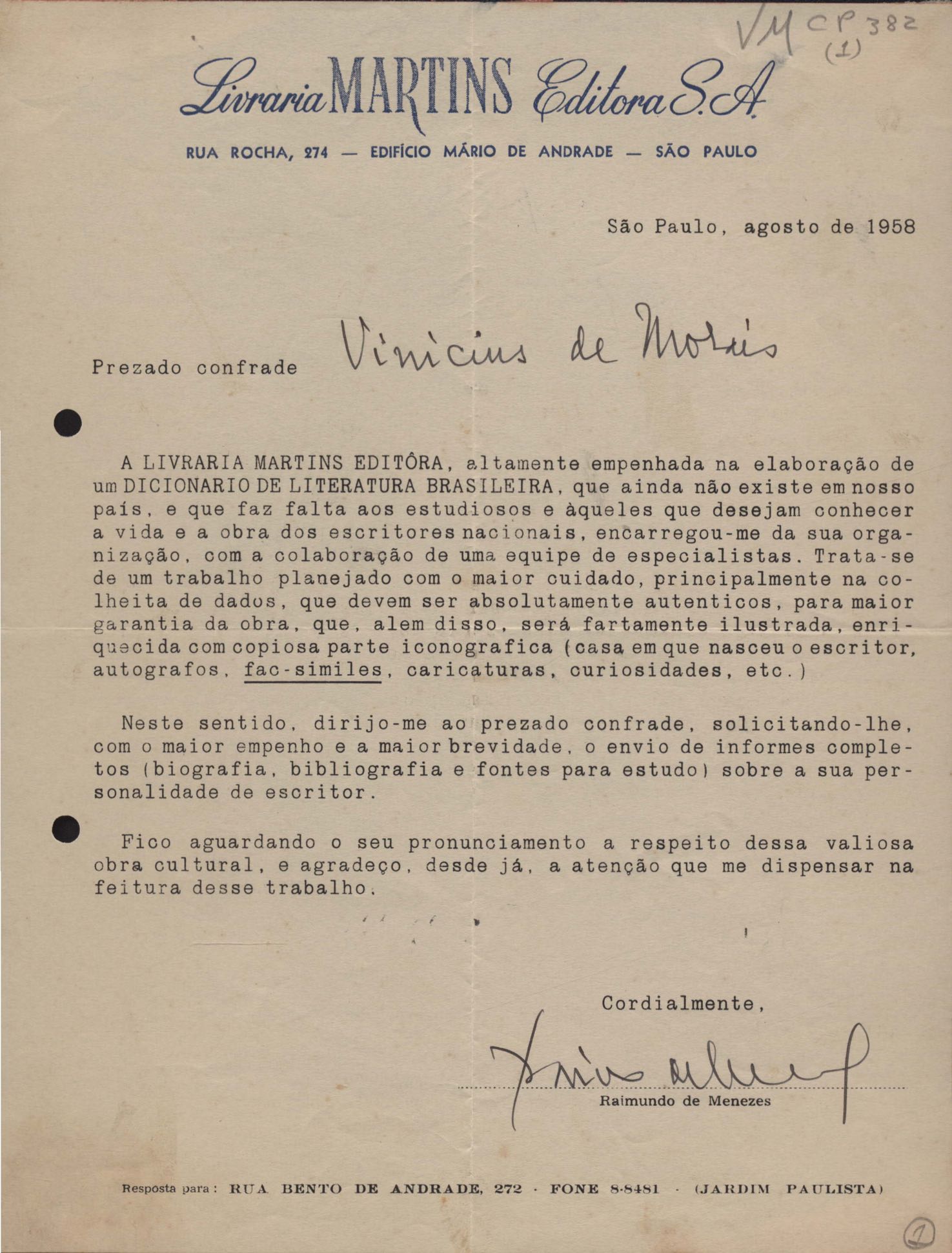 Pedido de dados biobliográficos de VM para o Dicionário de literatura brasileira.