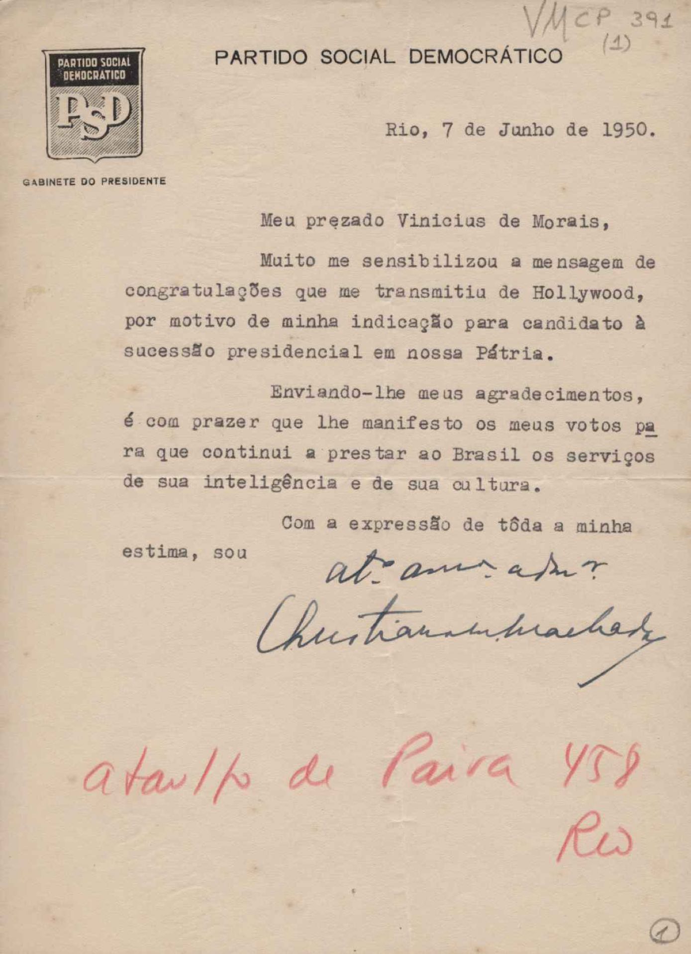 Agradecimento a VM pelas congratulações enviadas, quando da indicação do signatário para concorrer à Presidência da República pelo PSD.