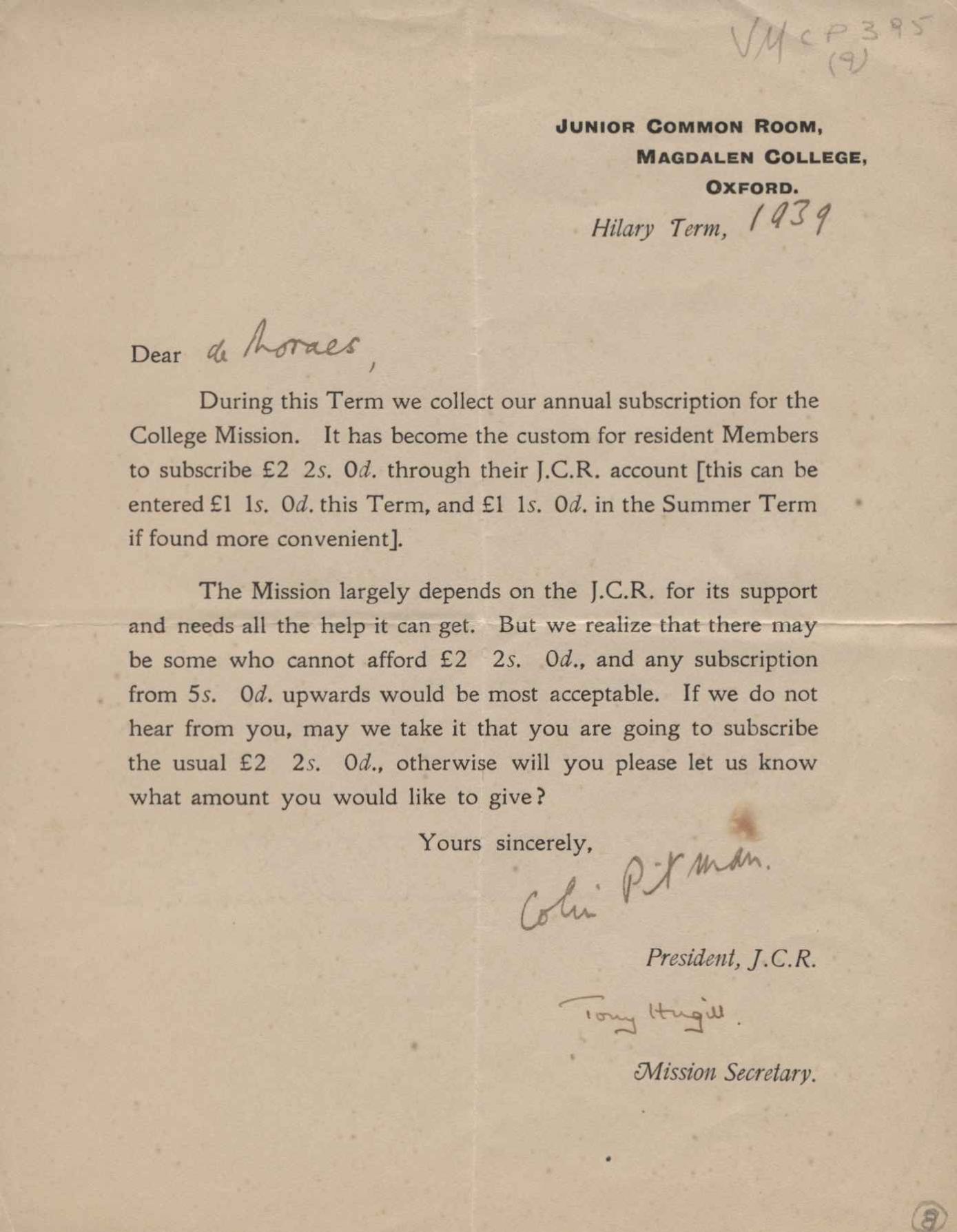 Solicitação de atestado médico para apresentação ao colégio. Pedido de subscrição para a College Mission. Convite para almoço. Anexo: Folheto com informações sobre o colégio.