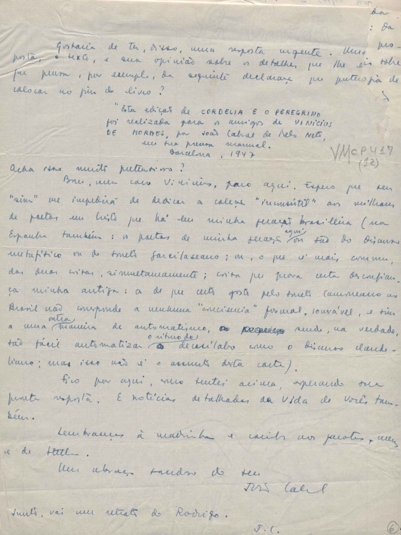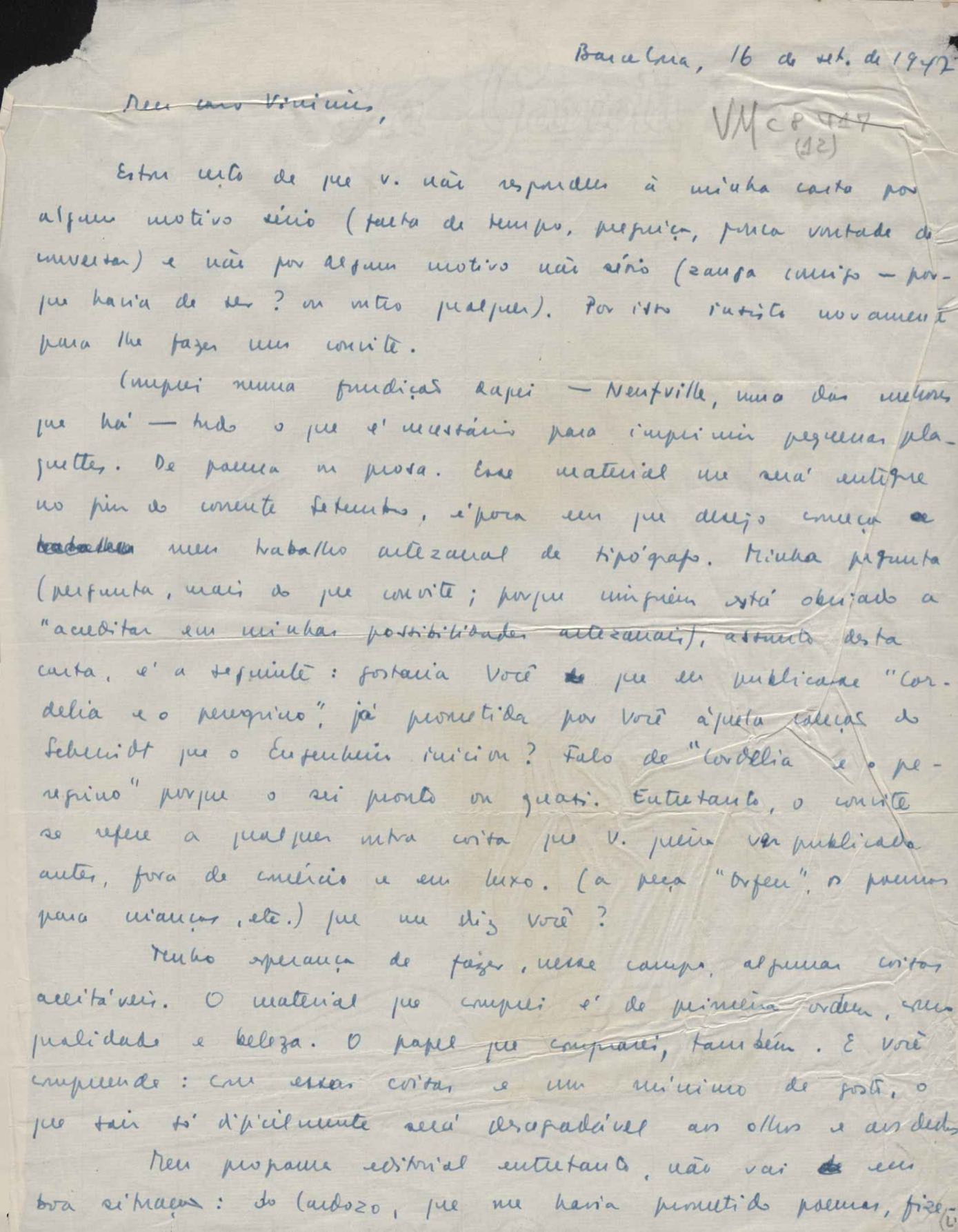 Comentários sobre seus trabalhos gráficos em Barcelona. Publicação de ensaio do signatário sobre Joan Miró. Considerações sobre a obra de VM. Publicação de Cordélia e o peregrino.