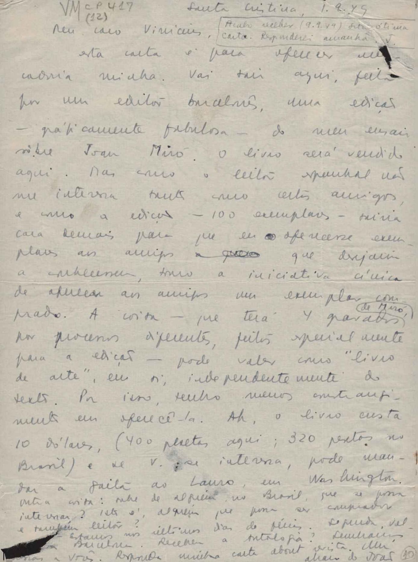 Comentários sobre seus trabalhos gráficos em Barcelona. Publicação de ensaio do signatário sobre Joan Miró. Considerações sobre a obra de VM. Publicação de Cordélia e o peregrino.