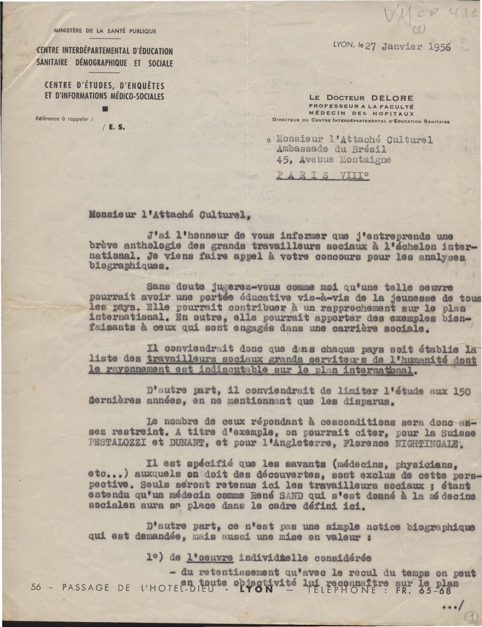 Solicitação ao Governo do Brasil de indicação de nomes de brasileiros atuantes na área de saúde pública, para integrarem livro a ser organizado pelo Ministério da Saúde Pública na França.