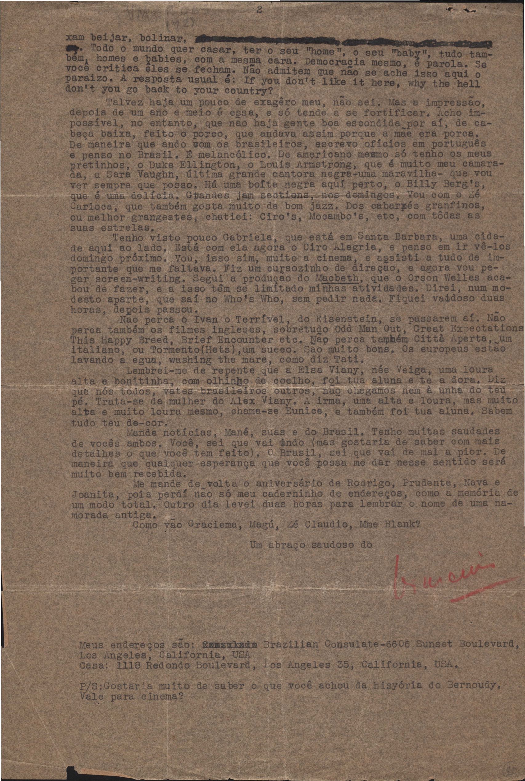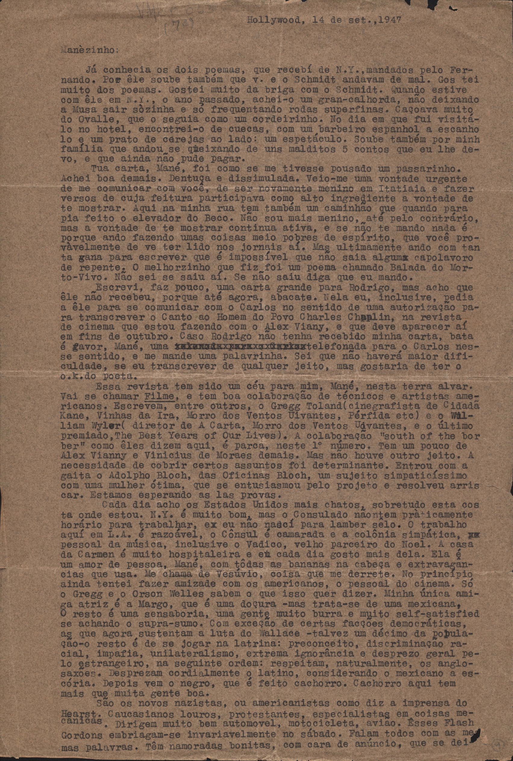 Breve comentário a livro [Rua do Siriri] de Amando Fontes. Notícias das atividades de VM em Londres e impressões da vida naquela cidade nos dias anteriores e imediatamente posteriores ao da assinatura do Pacto de Munique. Manuel Bandeira relata como recebeu a notícia da obtenção do prêmio da Sociedade Felipe de Oliveira. Comentários de VM sobre trabalhos seus. Publicação de "Canto ao homem do povo Charles Chaplin", de Carlos Drummond de Andrade, na revista Filme, a ser lançada com o apoio financeiro de Adolfo Bloch. Opinião de VM sobre a política americana. Pedido para Bandeira encarregar-se da publicação de antologia de poesias de VM. Menção a possíveis complicações políticas resultantes de versos do poema "Pátria minha", de VM. Solicitação para Manuel Bandeira fazer algumas correções no poema sobre García Lorca. Comentário sobre a elaboração de Orfeu negro, do qual remete parte do primeiro ato, bem como sobre a elaboração do Roteiro lírico e sentimental da cidade do Rio de Janeiro. Publicação, por João Cabral de Melo Neto, de Cordélia e o peregrino. Eleição para a diretoria da Associação Brasileira de Instituições Financeiras de Desenvolvimento (ABDE) em 1949. Comentários sobre a revista Orfeu e seus integrantes e sobre viagem ao México. Breves considerações sobre jazz e música brasileira. Remessa a Manuel Bandeira dos originais da Antologia poética, com instruções para publicação e pedido para que faça uma boa leitura crítica. Sugestões de Manuel Bandeira para modificações em alguns poemas de VM.