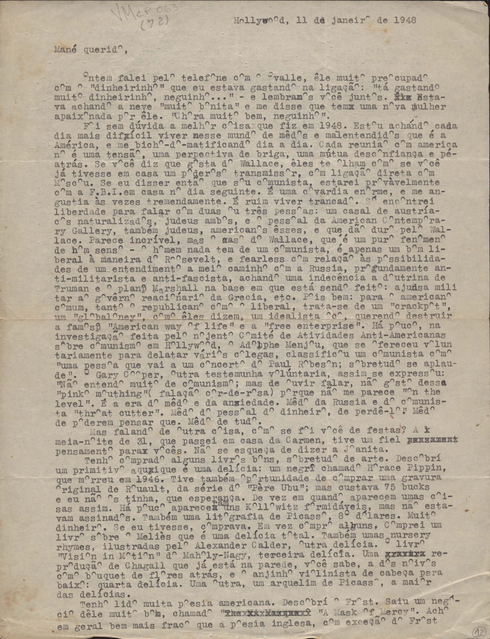 Breve comentário a livro [Rua do Siriri] de Amando Fontes. Notícias das atividades de VM em Londres e impressões da vida naquela cidade nos dias anteriores e imediatamente posteriores ao da assinatura do Pacto de Munique. Manuel Bandeira relata como recebeu a notícia da obtenção do prêmio da Sociedade Felipe de Oliveira. Comentários de VM sobre trabalhos seus. Publicação de "Canto ao homem do povo Charles Chaplin", de Carlos Drummond de Andrade, na revista Filme, a ser lançada com o apoio financeiro de Adolfo Bloch. Opinião de VM sobre a política americana. Pedido para Bandeira encarregar-se da publicação de antologia de poesias de VM. Menção a possíveis complicações políticas resultantes de versos do poema "Pátria minha", de VM. Solicitação para Manuel Bandeira fazer algumas correções no poema sobre García Lorca. Comentário sobre a elaboração de Orfeu negro, do qual remete parte do primeiro ato, bem como sobre a elaboração do Roteiro lírico e sentimental da cidade do Rio de Janeiro. Publicação, por João Cabral de Melo Neto, de Cordélia e o peregrino. Eleição para a diretoria da Associação Brasileira de Instituições Financeiras de Desenvolvimento (ABDE) em 1949. Comentários sobre a revista Orfeu e seus integrantes e sobre viagem ao México. Breves considerações sobre jazz e música brasileira. Remessa a Manuel Bandeira dos originais da Antologia poética, com instruções para publicação e pedido para que faça uma boa leitura crítica. Sugestões de Manuel Bandeira para modificações em alguns poemas de VM.