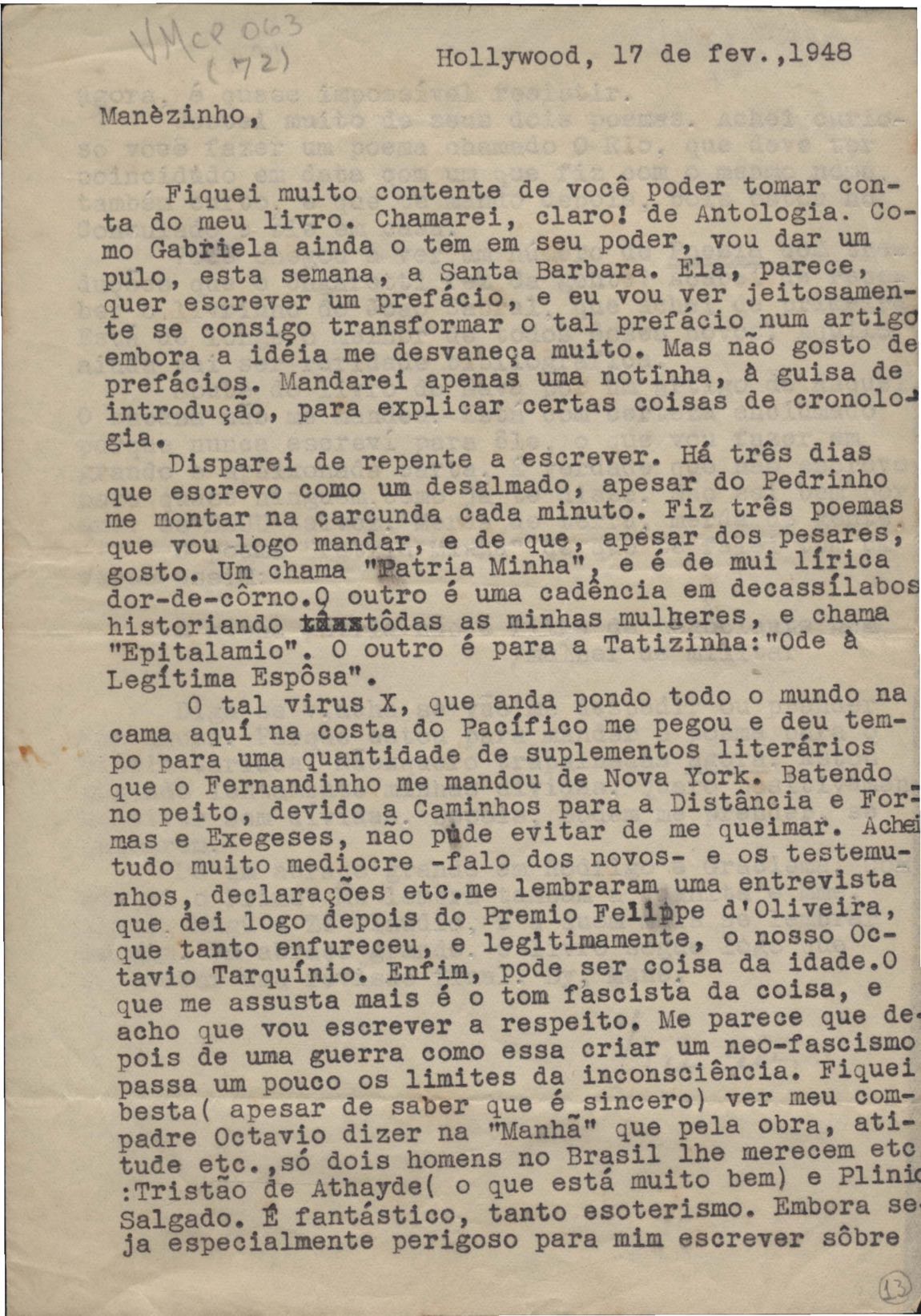 Breve comentário a livro [Rua do Siriri] de Amando Fontes. Notícias das atividades de VM em Londres e impressões da vida naquela cidade nos dias anteriores e imediatamente posteriores ao da assinatura do Pacto de Munique. Manuel Bandeira relata como recebeu a notícia da obtenção do prêmio da Sociedade Felipe de Oliveira. Comentários de VM sobre trabalhos seus. Publicação de "Canto ao homem do povo Charles Chaplin", de Carlos Drummond de Andrade, na revista Filme, a ser lançada com o apoio financeiro de Adolfo Bloch. Opinião de VM sobre a política americana. Pedido para Bandeira encarregar-se da publicação de antologia de poesias de VM. Menção a possíveis complicações políticas resultantes de versos do poema "Pátria minha", de VM. Solicitação para Manuel Bandeira fazer algumas correções no poema sobre García Lorca. Comentário sobre a elaboração de Orfeu negro, do qual remete parte do primeiro ato, bem como sobre a elaboração do Roteiro lírico e sentimental da cidade do Rio de Janeiro. Publicação, por João Cabral de Melo Neto, de Cordélia e o peregrino. Eleição para a diretoria da Associação Brasileira de Instituições Financeiras de Desenvolvimento (ABDE) em 1949. Comentários sobre a revista Orfeu e seus integrantes e sobre viagem ao México. Breves considerações sobre jazz e música brasileira. Remessa a Manuel Bandeira dos originais da Antologia poética, com instruções para publicação e pedido para que faça uma boa leitura crítica. Sugestões de Manuel Bandeira para modificações em alguns poemas de VM.