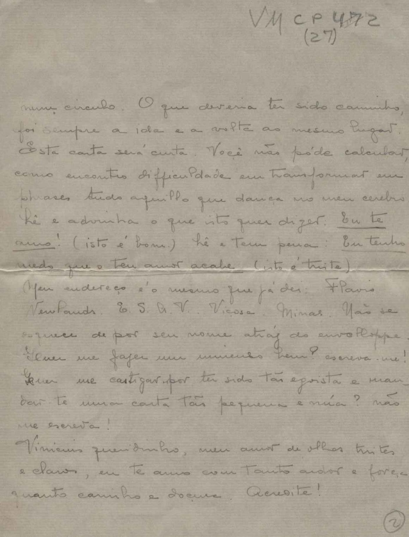 Relato da viagem de trem, do Rio para Viçosa, realizada pela signatária. Comentários sobre a cidade de Viçosa. Declaração de amor a VM e demonstração dos temores de perdê-lo. Manifestação de opinião sobre a postura dos amigos de VM quanto ao romance dos dois.